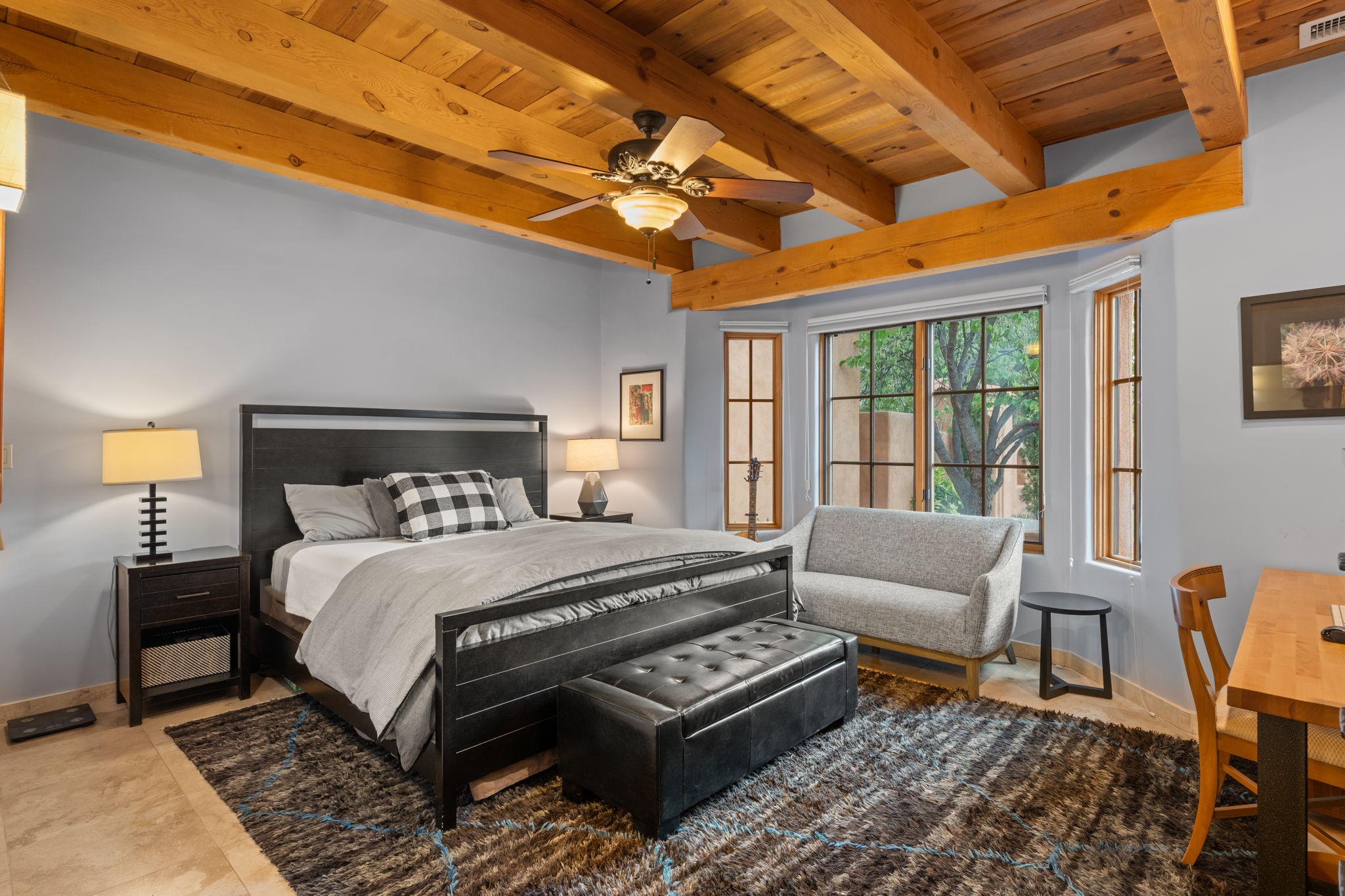 Gorgeous, peaceful, remarkable. A beautiful mediterranean adobe villa by John Calvin. Set in a lush and well-manicured setting on a very special street in the Village of Los Ranchos. Walk or ride your bike to Los Poblanos Historic Inn, Campo, Los Ranchos Growers Market, and much more. The home features a chef's kitchen, spacious en-suite bedrooms, stunning garden views from every window, and a large koi pond and a private irrigation well. Radiant heat, central AC, Wolf range, 5 fireplaces including an outdoor kiva, travertine floors, 3 Car garage. Separated & Quiet Master Suite. Kitchen features include Wolf range, subzero fridge, double-oven, wine cooler, & oversized island. Enjoy views of the gardens and landscaping from every room, with a walled backyard.