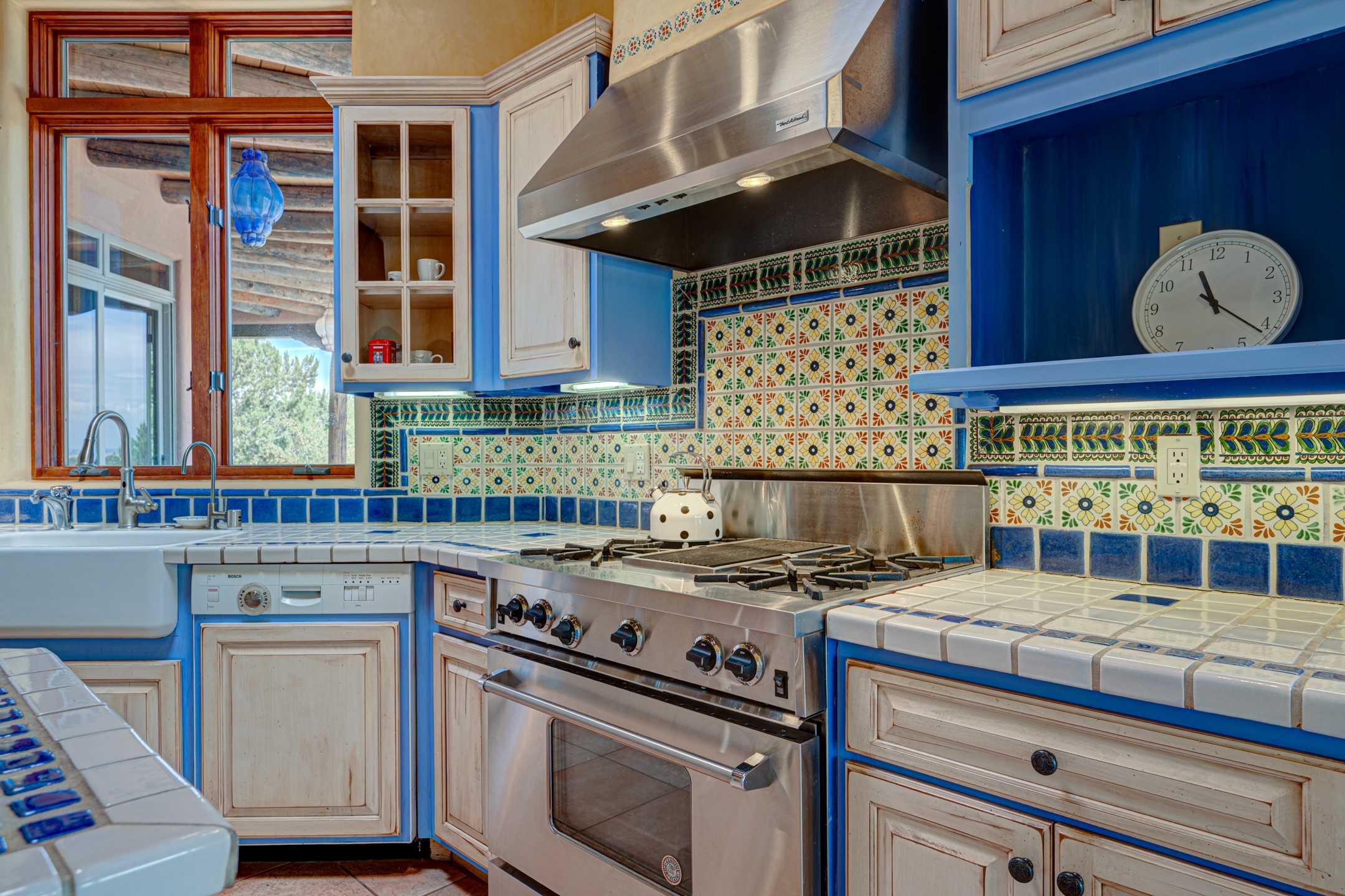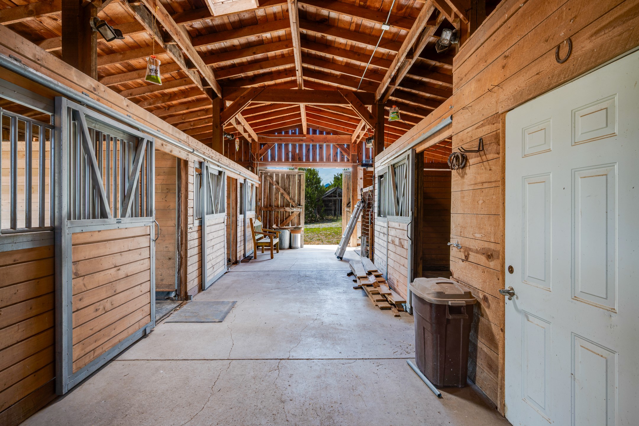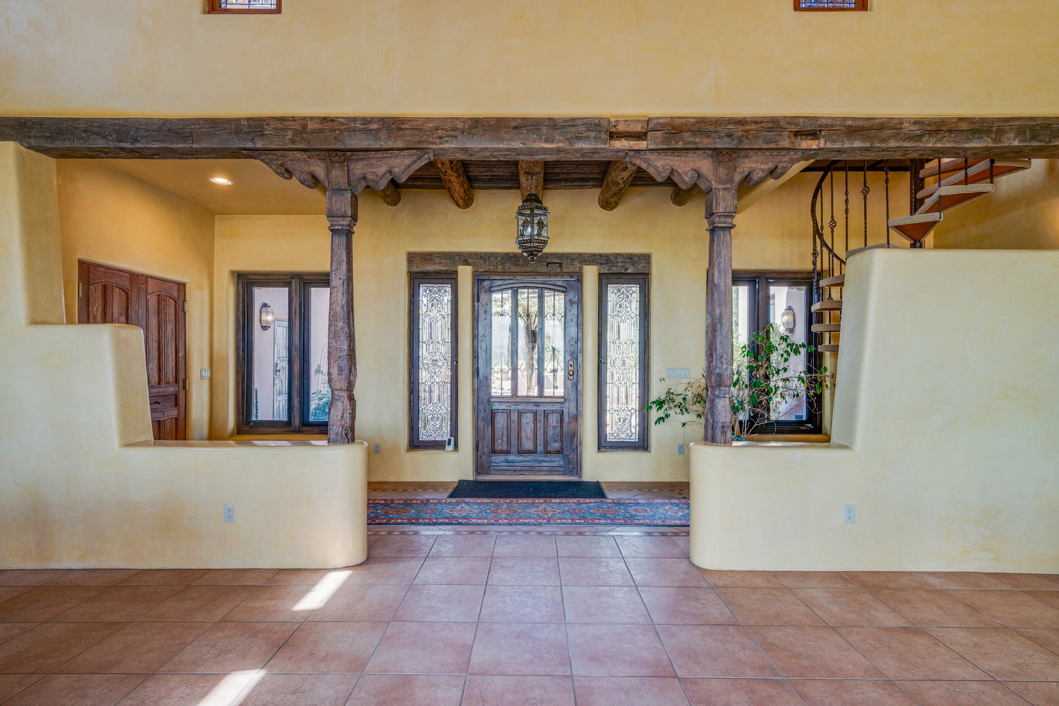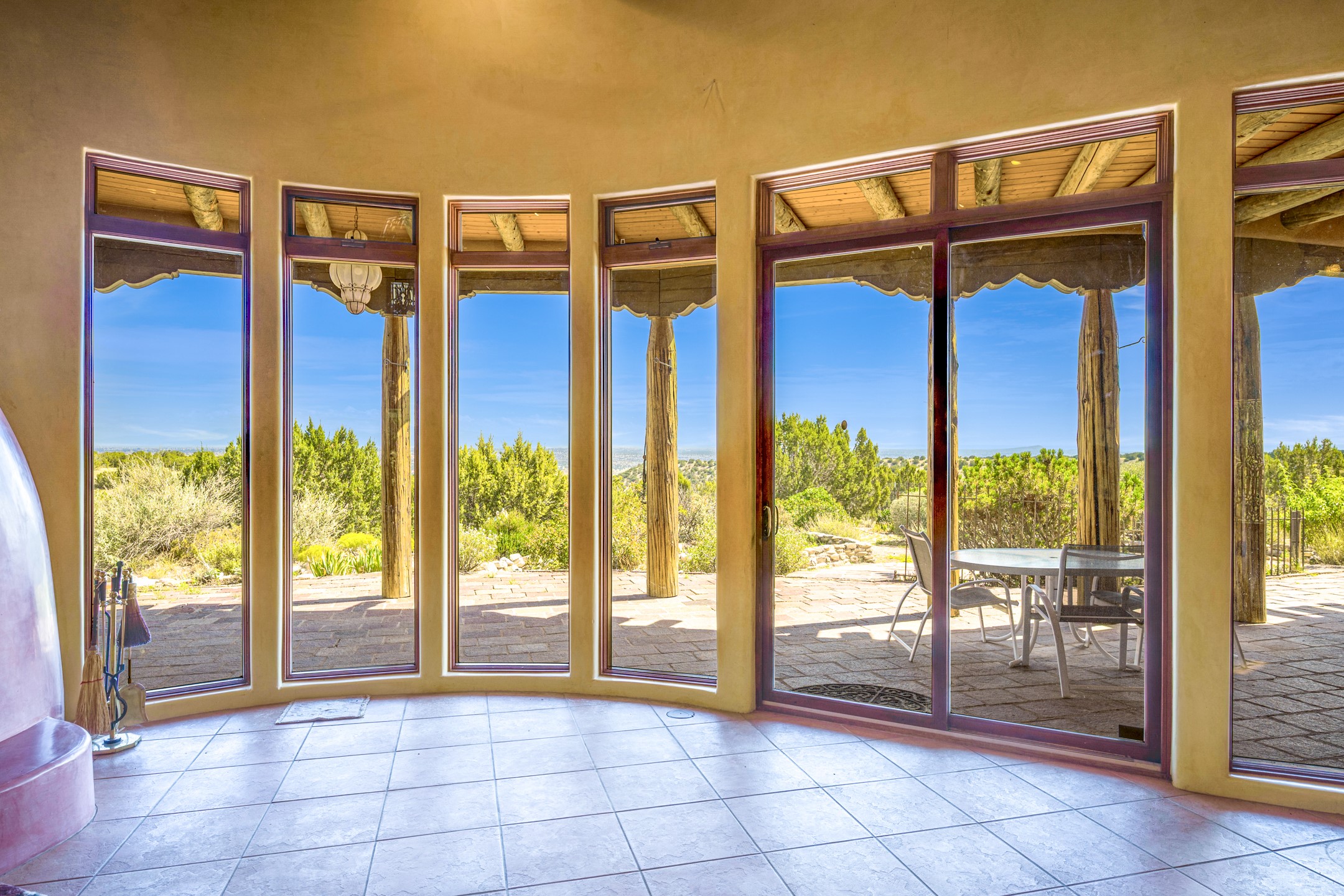 Oro Viejo Ranch is a timeless sanctuary on 106 acres. A harmonious blend of natural splendor, meticulous craftsmanship, and modern convenience. There are breathtaking panoramic views of the Sangre de Cristo, Ortiz Mountains, Cerrillos Hills, and the iconic Lone Butte. The main residence showcases authentic Southwest style, adobe and rastra construction. It features intricate plasterwork, recycled wood vigas, and a heated indoor pool, the rooftop deck offers truly unobstructed views. The solid oak cabin adds rustic charm, originally owned by the Hoover family, and rebuilt on-site. Horse enthusiasts will appreciate the six-stall, barn, tack room, workshop, covered hay storage, electric, and hot water, and protected outdoor runs. An insulated chicken coop provides the perfect setup for fresh eggs, while a private well with a large storage tank ensures a reliable water source.A convenient RV hookup is also available on the property.