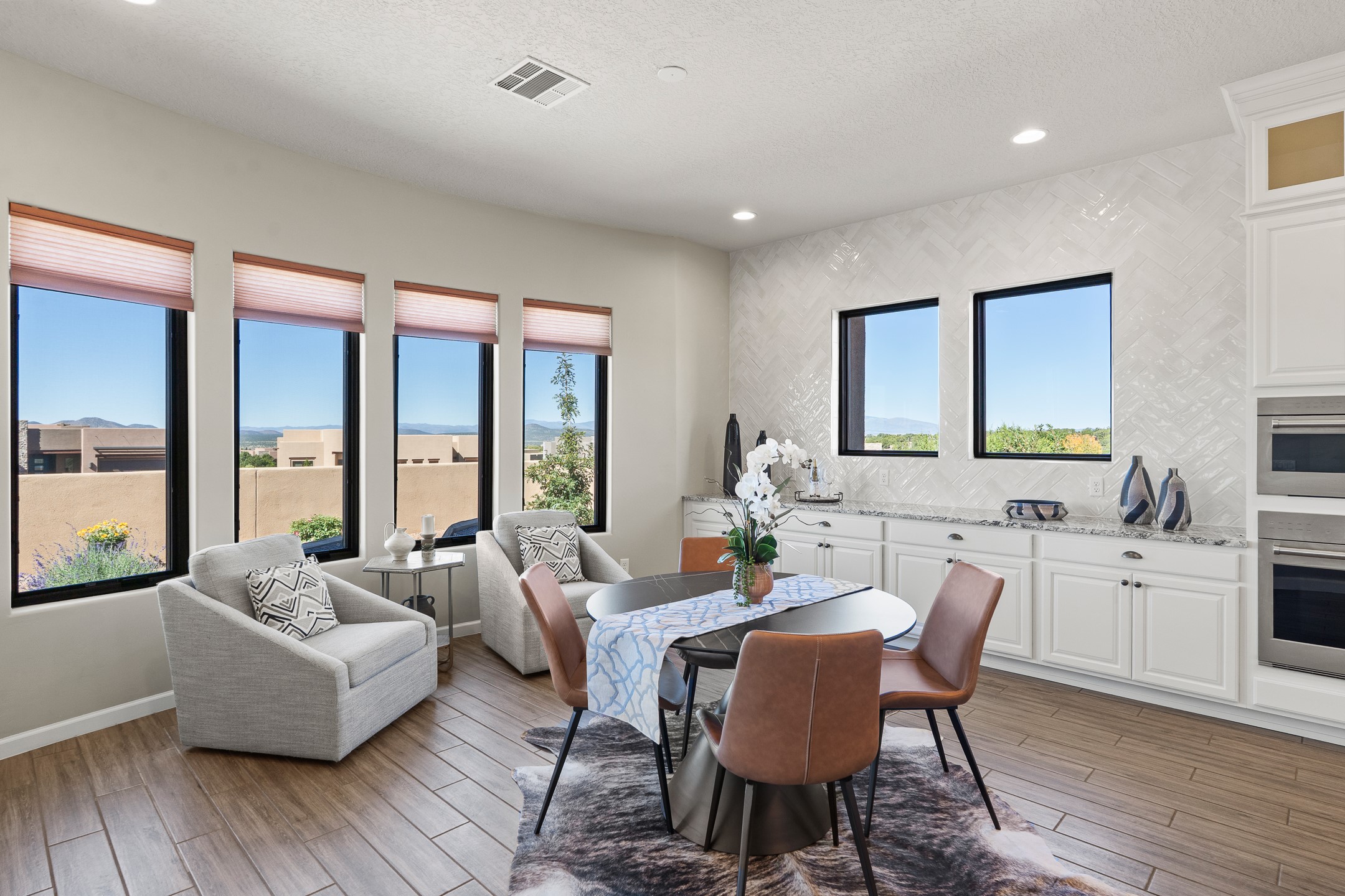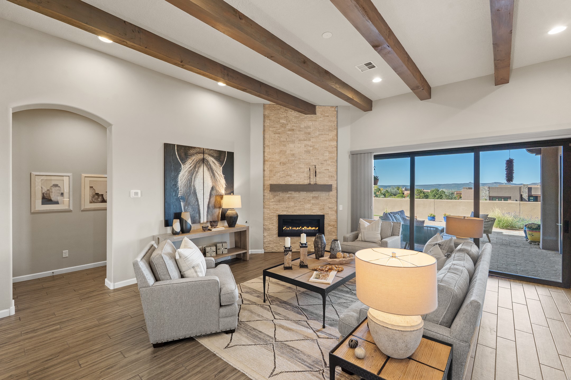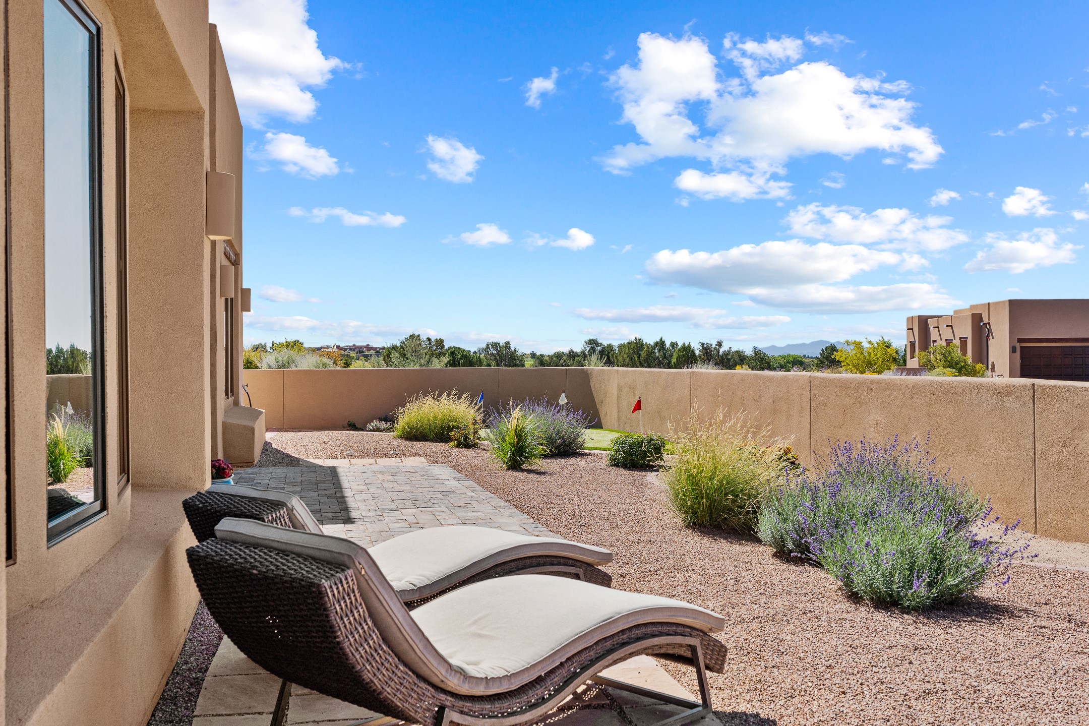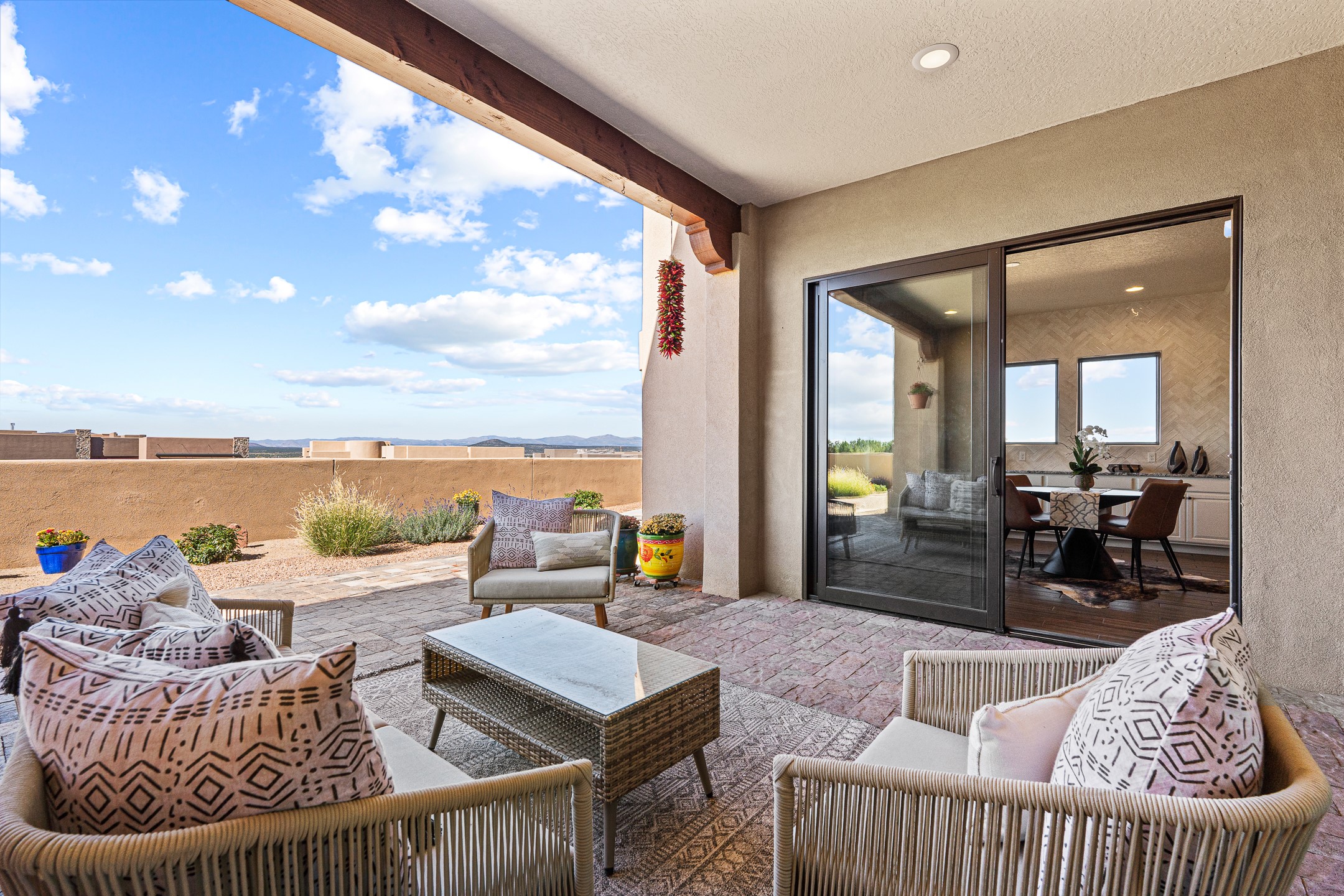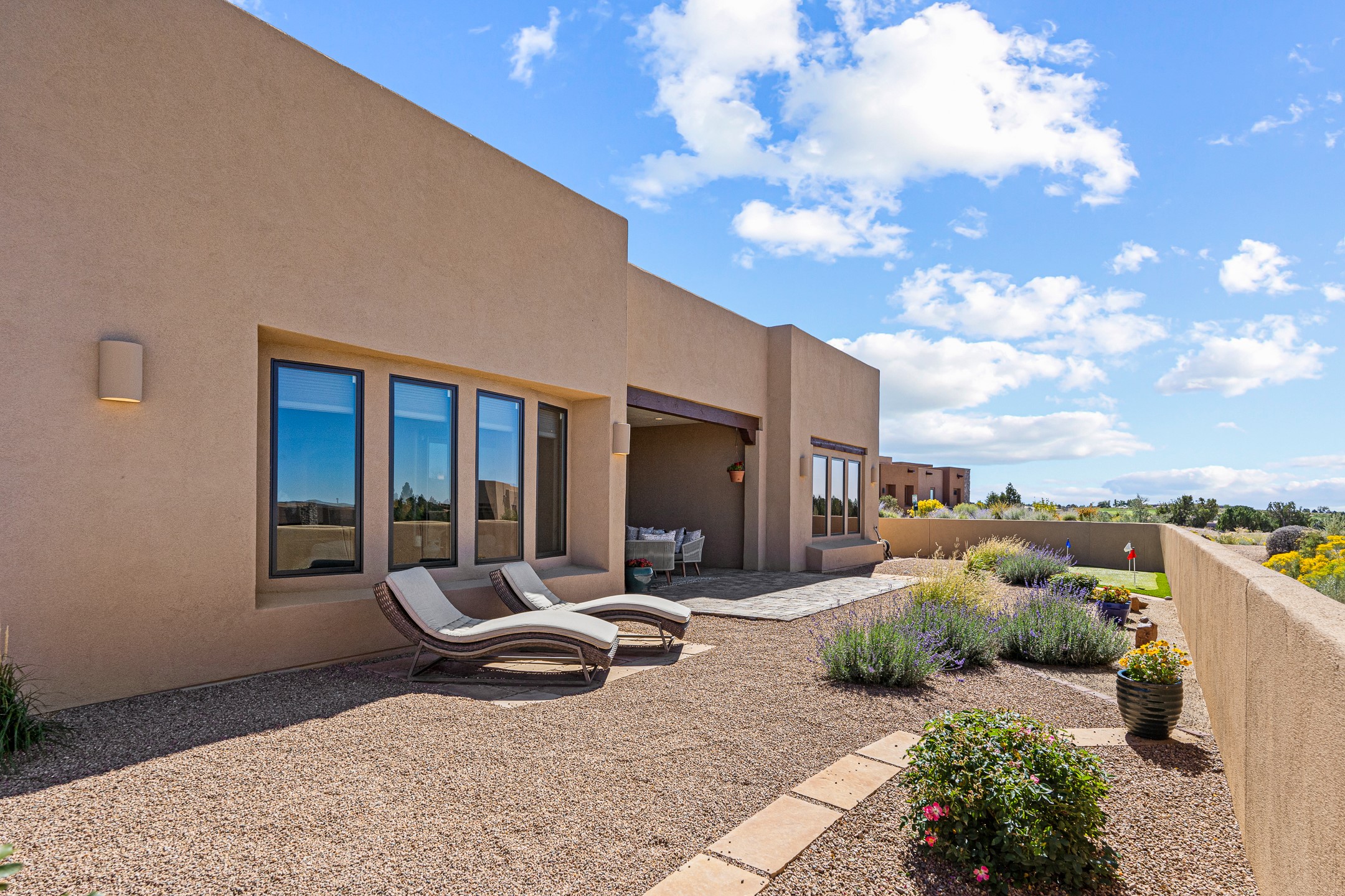 Exceptional value on this move in ready Las Campanas Contemporary Pueblo RetreatWhere contemporary design meets timeless Santa Fe elegance, this 3,715-square-foot single-level residence offers the perfect balance of sophistication, privacy, and sweeping mountain views. Completed in 2023, this home features upgraded modern finishes and is nicely sited on a corner lot -- backing to open space to the west.Light-filled and beautifully proportioned, the open-concept layout flows effortlessly between the living, dining, and outdoor spaces. The great room features beamed ceilings, a sleek gas fireplace, and panoramic views of the Jemez Mountains--capturing Santa Fe's legendary sunsets in every season.At the heart of the home, the chef's kitchen is both striking and functional, equipped with upgraded Wolf, Sub-Zero, and Asko appliances - including a six-burner double oven range, built-in convection oven and microwave, and dual dishwashers. Granite countertops, crisp white cabinetry, and a generous island create a gathering space as stylish as it is practical.The primary suite is a private sanctuary with breathtaking mountain views and a spa-like bath featuring dual vanities, a dedicated makeup area, and luxurious finishes. A separate guest suite with its own living area offers comfort and independence for visitors, while a dedicated office adds flexibility for work or creative pursuits.Outdoors, beautifully landscaped patios extend the living space--perfect for dining al fresco, entertaining, or simply enjoying the quiet beauty of the high desert. An oversized two-car garage offers abundant space for vehicles and storage.Located just minutes from The Club at Las Campanas, where fine dining, golf, fitness, and spa amenities await (membership optional), this residence embodies modern Santa Fe luxury--panoramic views, refined design, and tranquil living in one of the city's most prestigious communities.