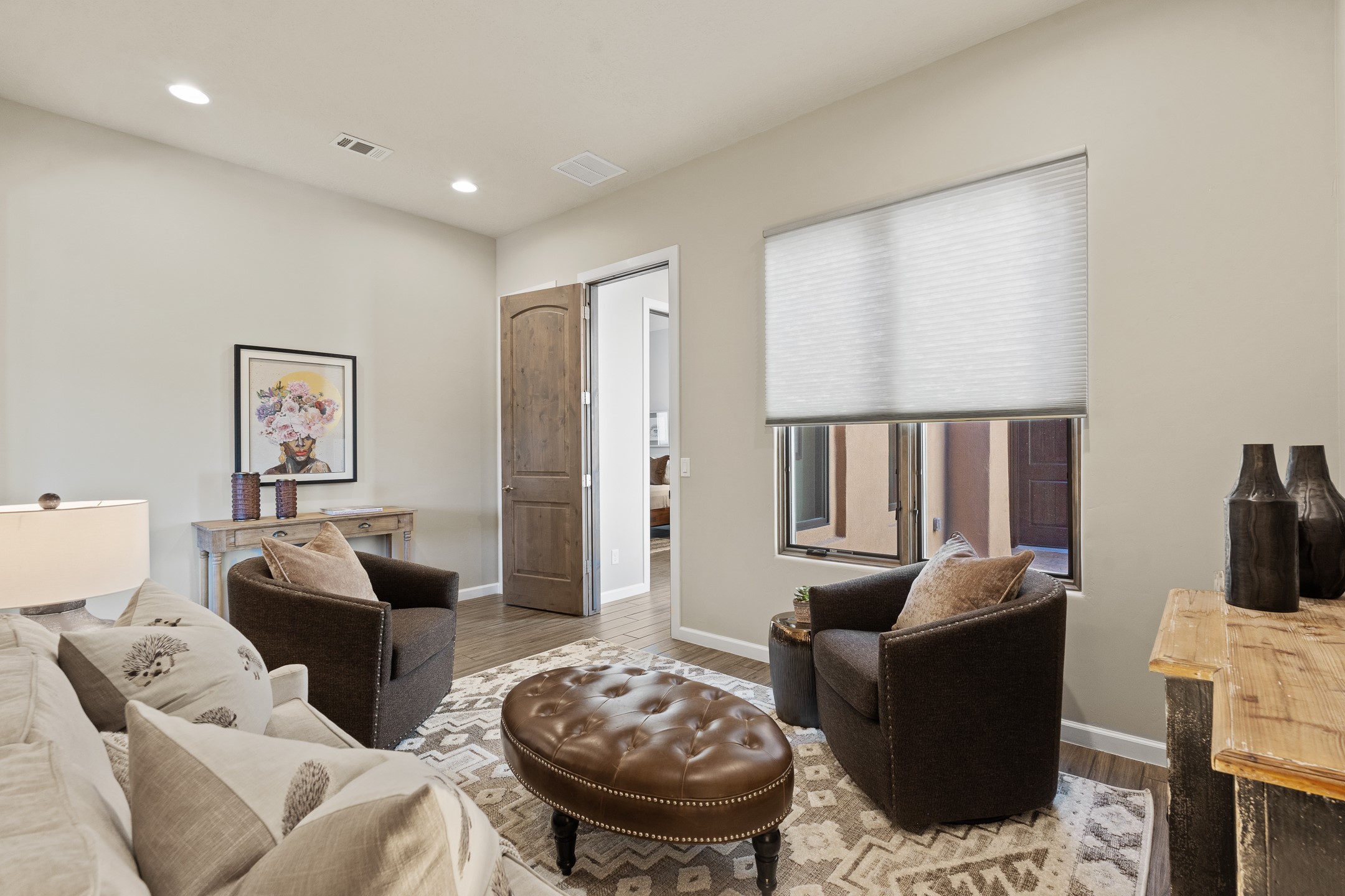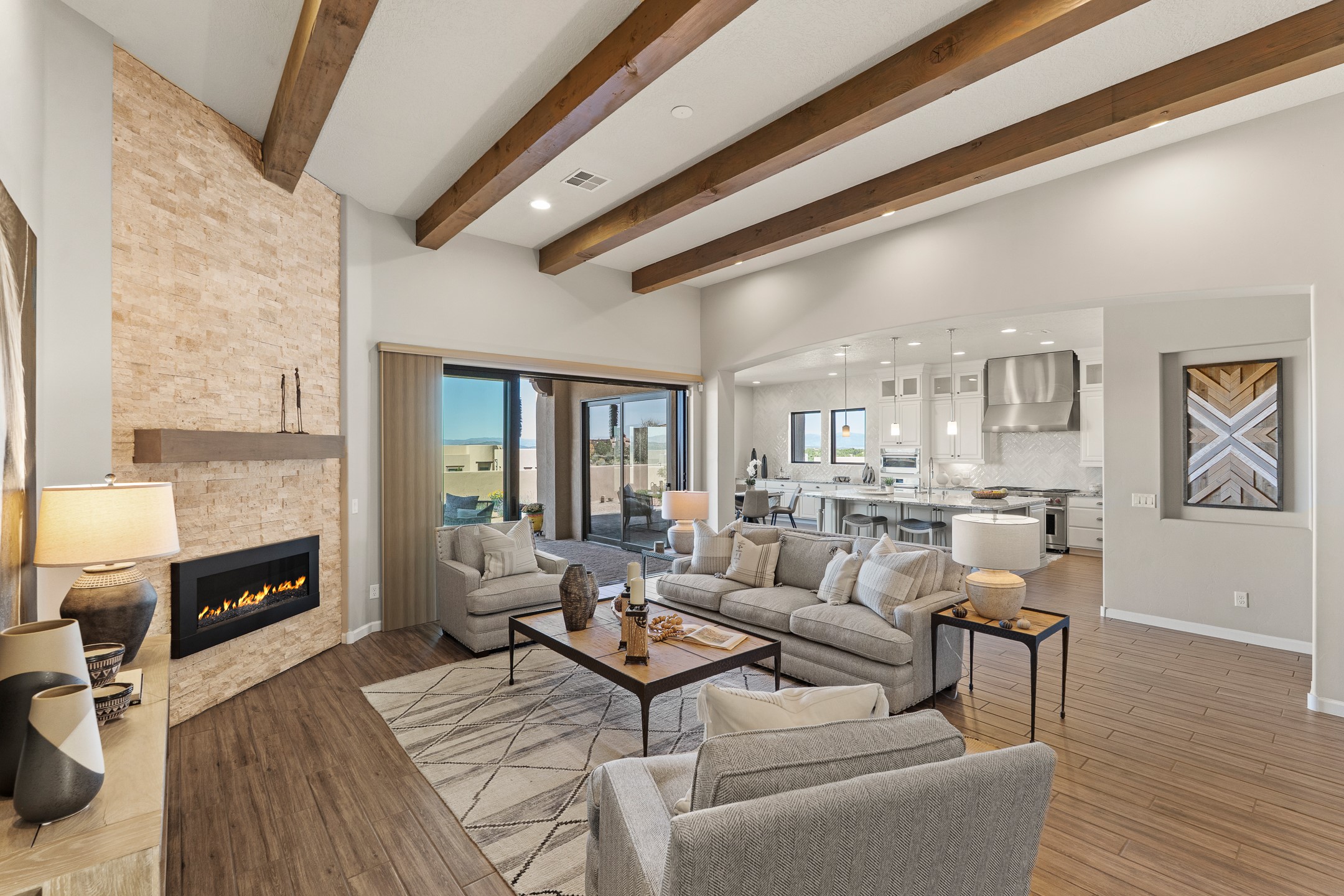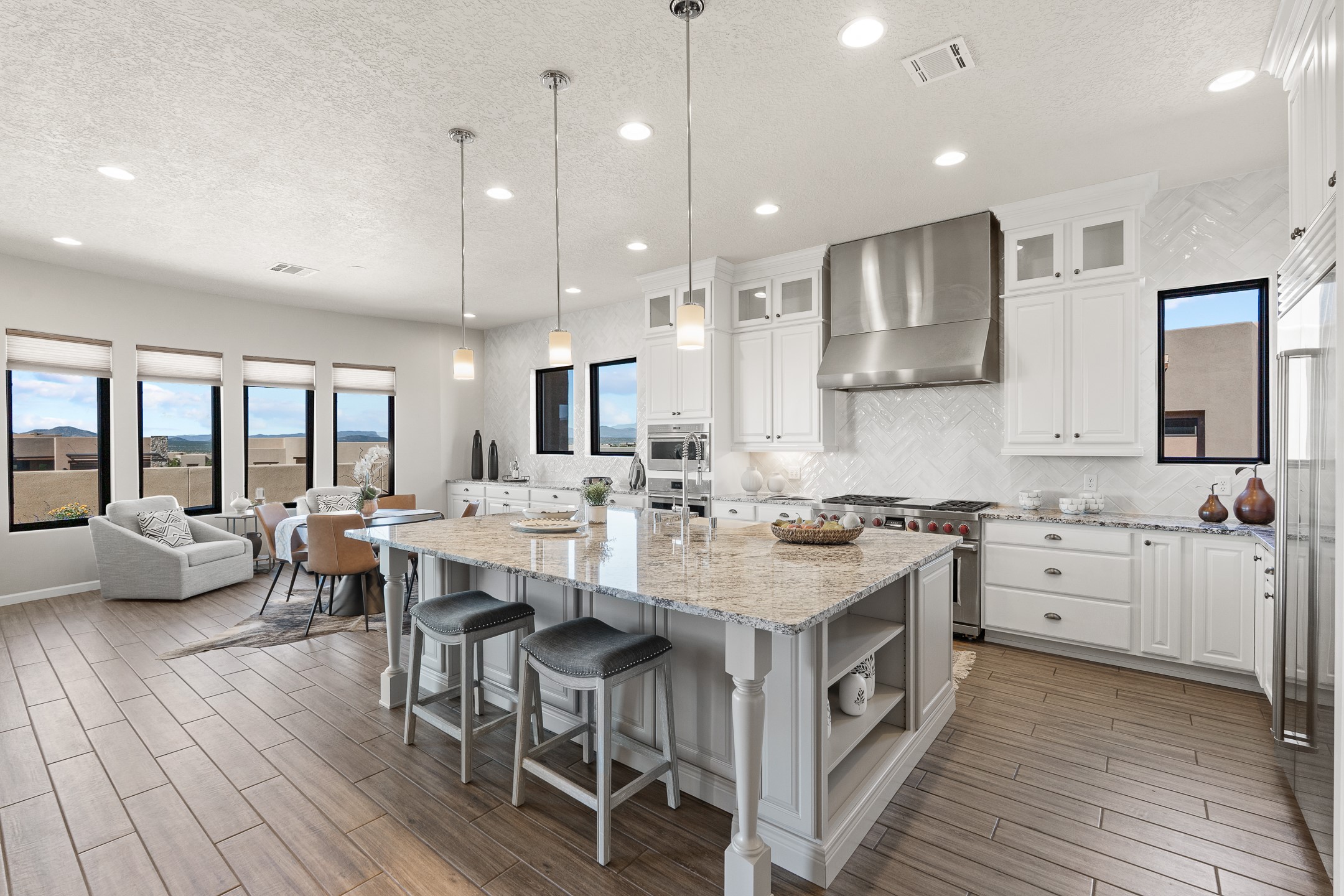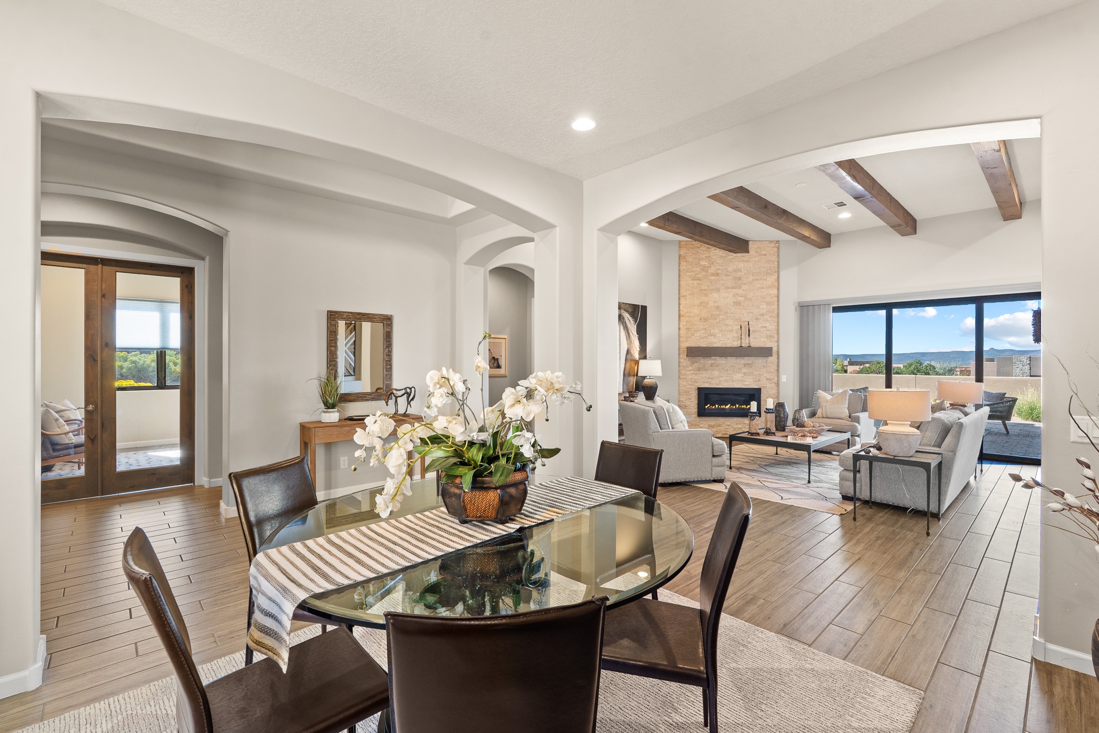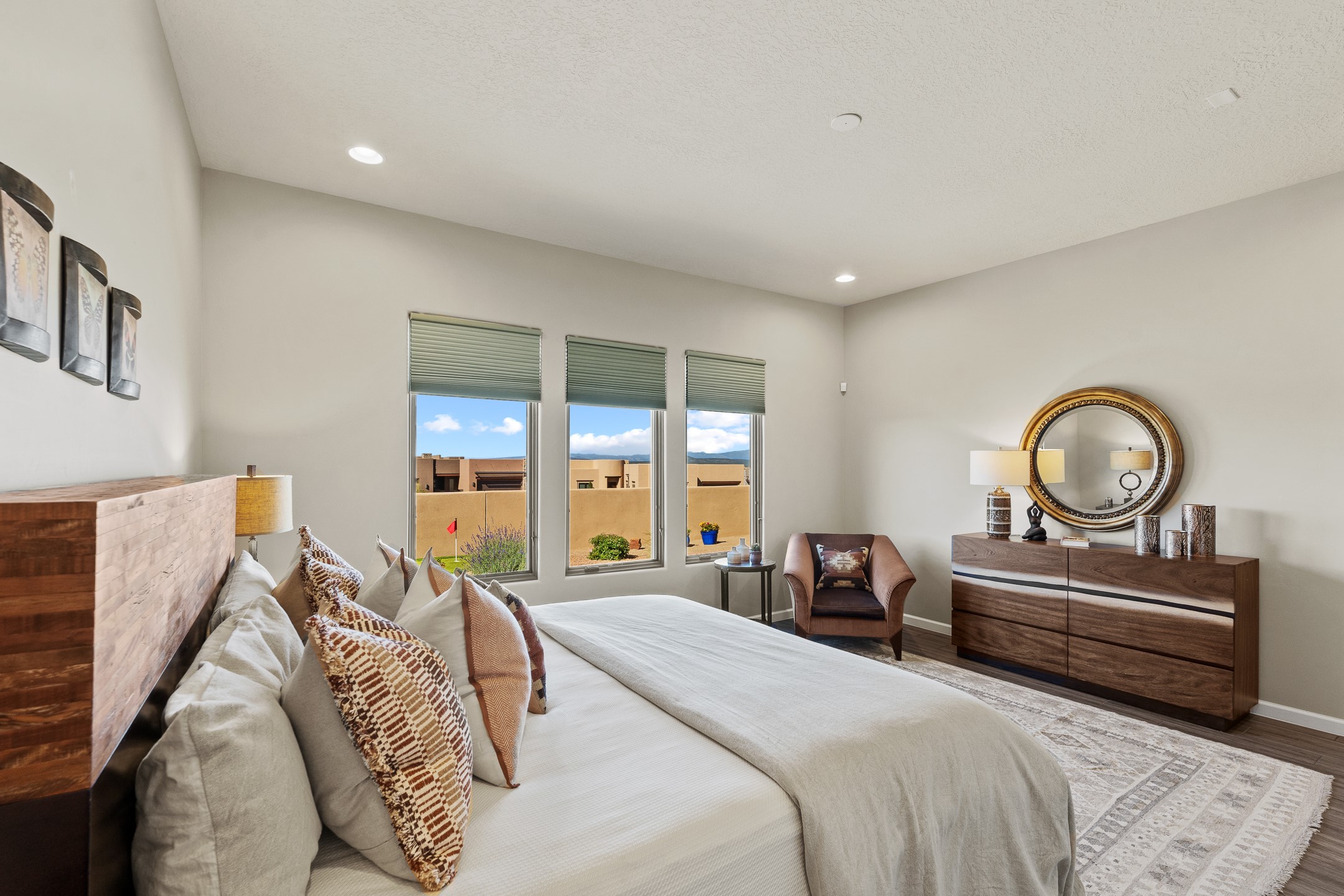 Exceptional value on this move in ready Las Campanas Contemporary Pueblo RetreatWhere contemporary design meets timeless Santa Fe elegance, this 3,715-square-foot single-level residence offers the perfect balance of sophistication, privacy, and sweeping mountain views. Completed in 2023, this home features upgraded modern finishes and is nicely sited on a corner lot -- backing to open space to the west.Light-filled and beautifully proportioned, the open-concept layout flows effortlessly between the living, dining, and outdoor spaces. The great room features beamed ceilings, a sleek gas fireplace, and panoramic views of the Jemez Mountains--capturing Santa Fe's legendary sunsets in every season.At the heart of the home, the chef's kitchen is both striking and functional, equipped with upgraded Wolf, Sub-Zero, and Asko appliances - including a six-burner double oven range, built-in convection oven and microwave, and dual dishwashers. Granite countertops, crisp white cabinetry, and a generous island create a gathering space as stylish as it is practical.The primary suite is a private sanctuary with breathtaking mountain views and a spa-like bath featuring dual vanities, a dedicated makeup area, and luxurious finishes. A separate guest suite with its own living area offers comfort and independence for visitors, while a dedicated office adds flexibility for work or creative pursuits.Outdoors, beautifully landscaped patios extend the living space--perfect for dining al fresco, entertaining, or simply enjoying the quiet beauty of the high desert. An oversized two-car garage offers abundant space for vehicles and storage.Located just minutes from The Club at Las Campanas, where fine dining, golf, fitness, and spa amenities await (membership optional), this residence embodies modern Santa Fe luxury--panoramic views, refined design, and tranquil living in one of the city's most prestigious communities.