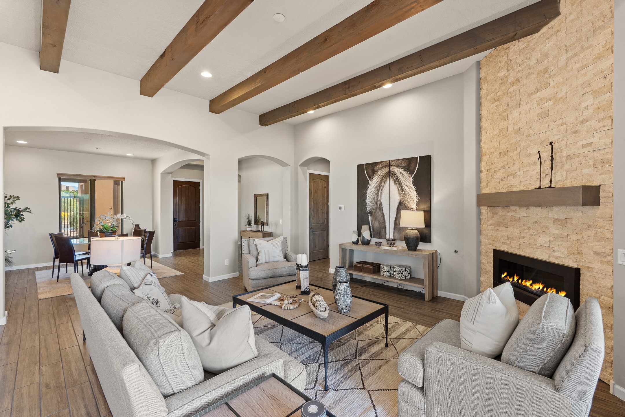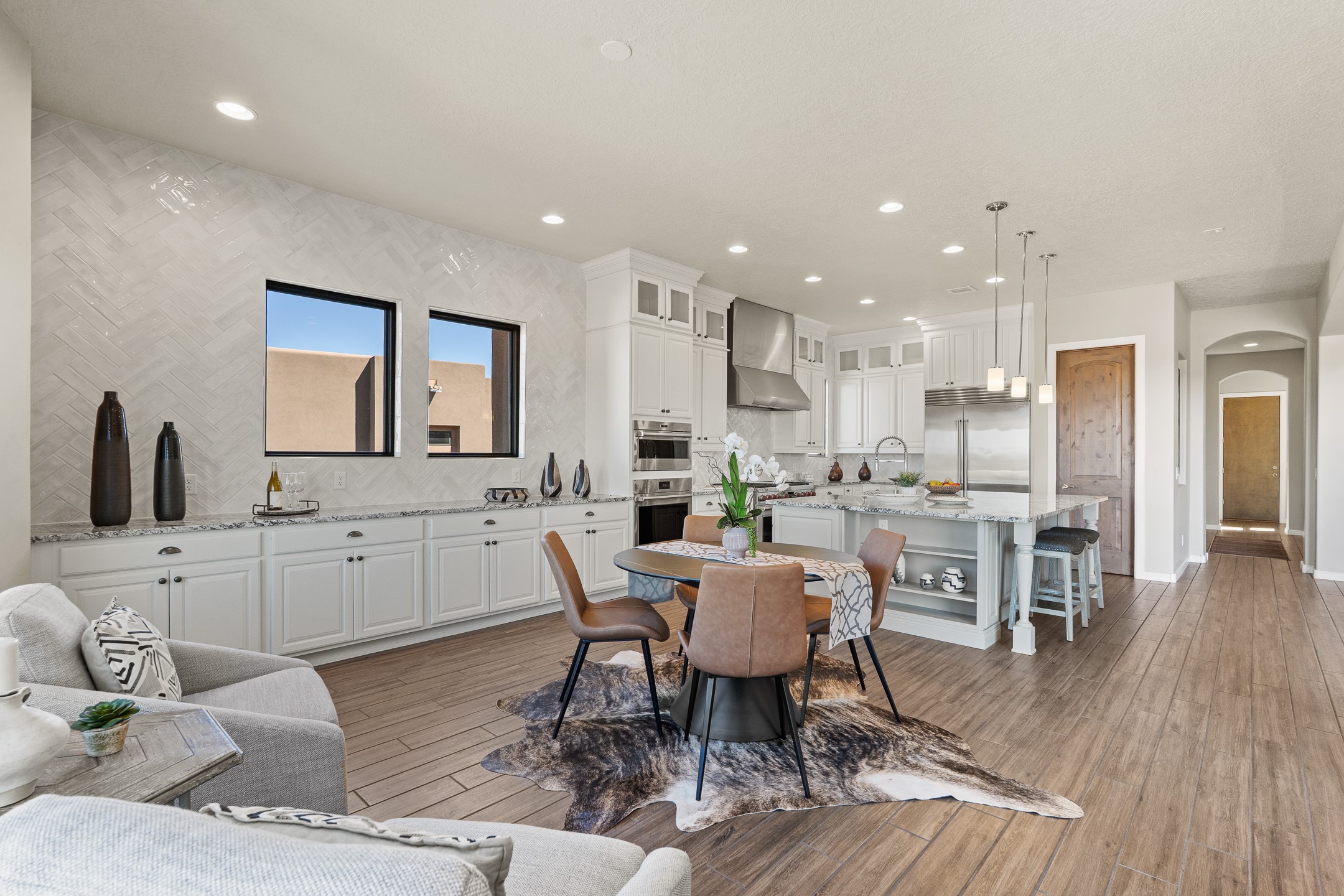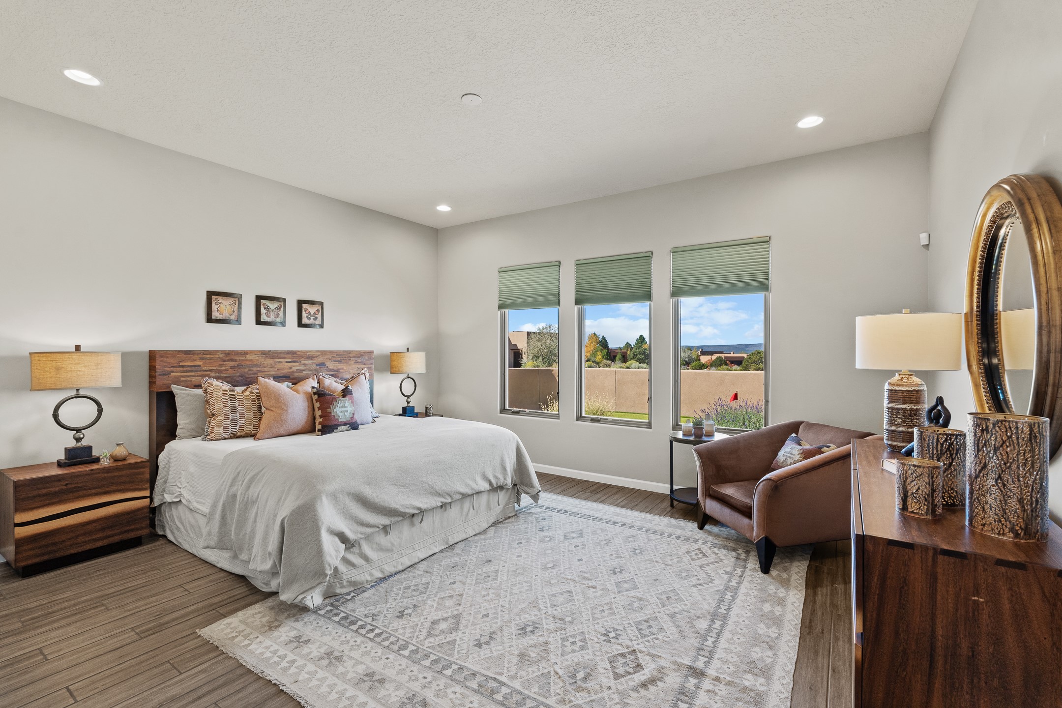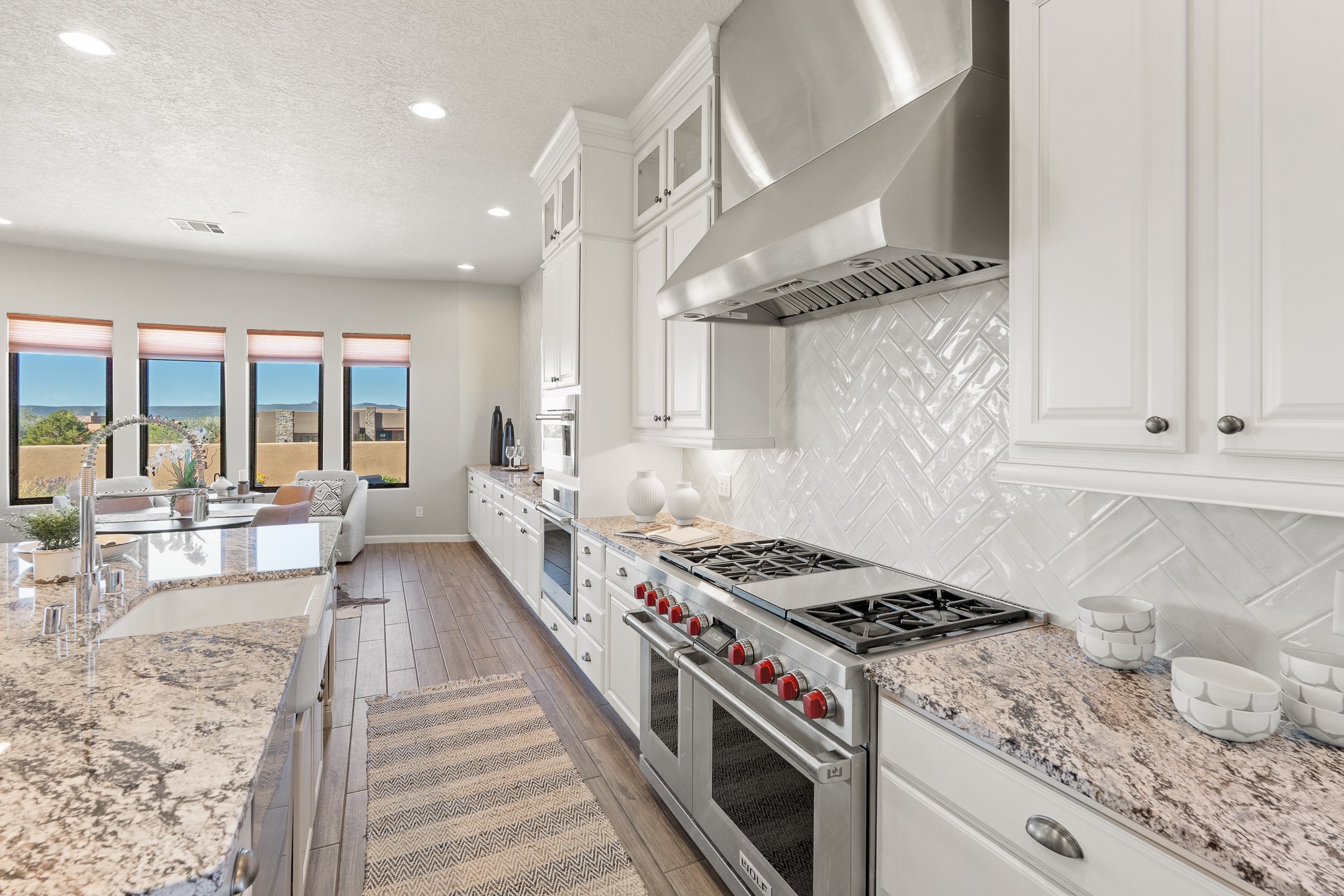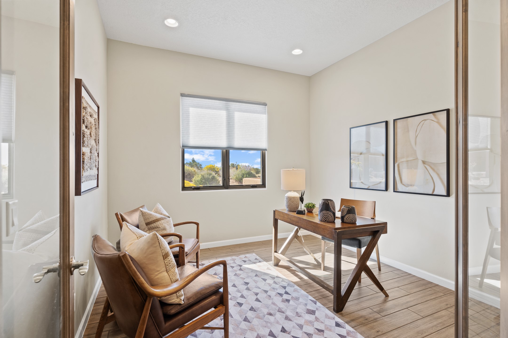Exceptional value on this move in ready Las Campanas Contemporary Pueblo RetreatWhere contemporary design meets timeless Santa Fe elegance, this 3,715-square-foot single-level residence offers the perfect balance of sophistication, privacy, and sweeping mountain views. Completed in 2023, this home features upgraded modern finishes and is nicely sited on a corner lot -- backing to open space to the west.Light-filled and beautifully proportioned, the open-concept layout flows effortlessly between the living, dining, and outdoor spaces. The great room features beamed ceilings, a sleek gas fireplace, and panoramic views of the Jemez Mountains--capturing Santa Fe's legendary sunsets in every season.At the heart of the home, the chef's kitchen is both striking and functional, equipped with upgraded Wolf, Sub-Zero, and Asko appliances - including a six-burner double oven range, built-in convection oven and microwave, and dual dishwashers. Granite countertops, crisp white cabinetry, and a generous island create a gathering space as stylish as it is practical.The primary suite is a private sanctuary with breathtaking mountain views and a spa-like bath featuring dual vanities, a dedicated makeup area, and luxurious finishes. A separate guest suite with its own living area offers comfort and independence for visitors, while a dedicated office adds flexibility for work or creative pursuits.Outdoors, beautifully landscaped patios extend the living space--perfect for dining al fresco, entertaining, or simply enjoying the quiet beauty of the high desert. An oversized two-car garage offers abundant space for vehicles and storage.Located just minutes from The Club at Las Campanas, where fine dining, golf, fitness, and spa amenities await (membership optional), this residence embodies modern Santa Fe luxury--panoramic views, refined design, and tranquil living in one of the city's most prestigious communities.