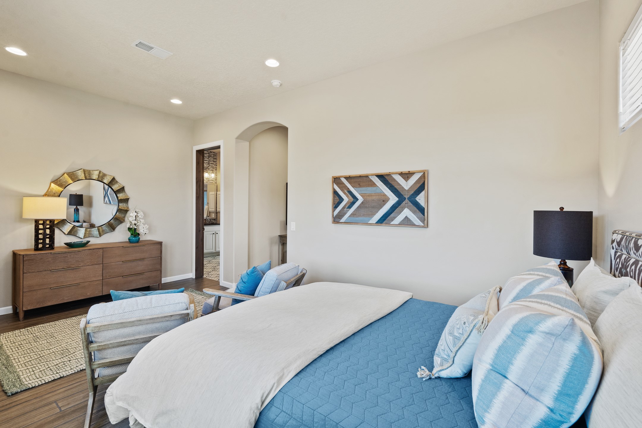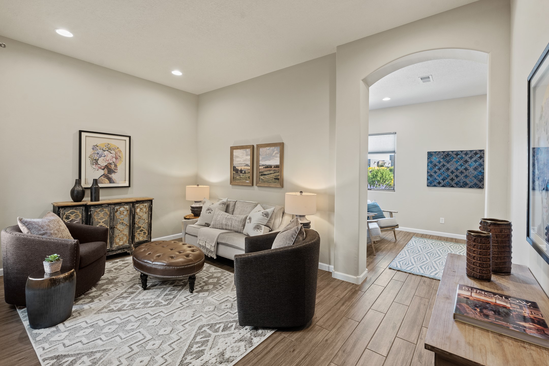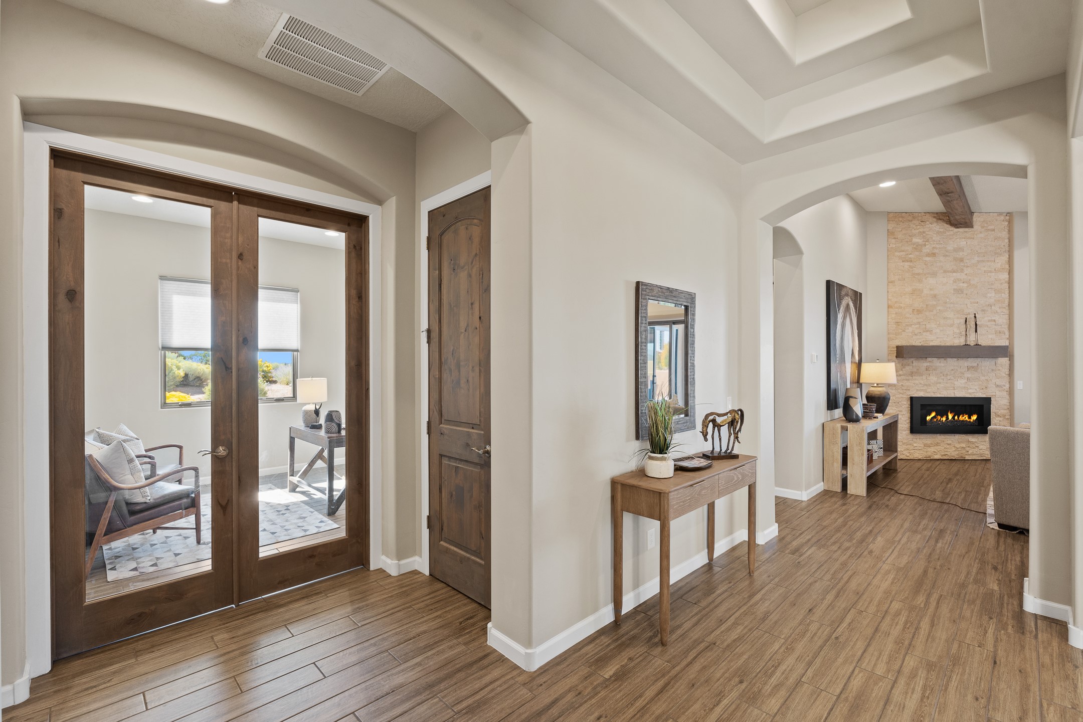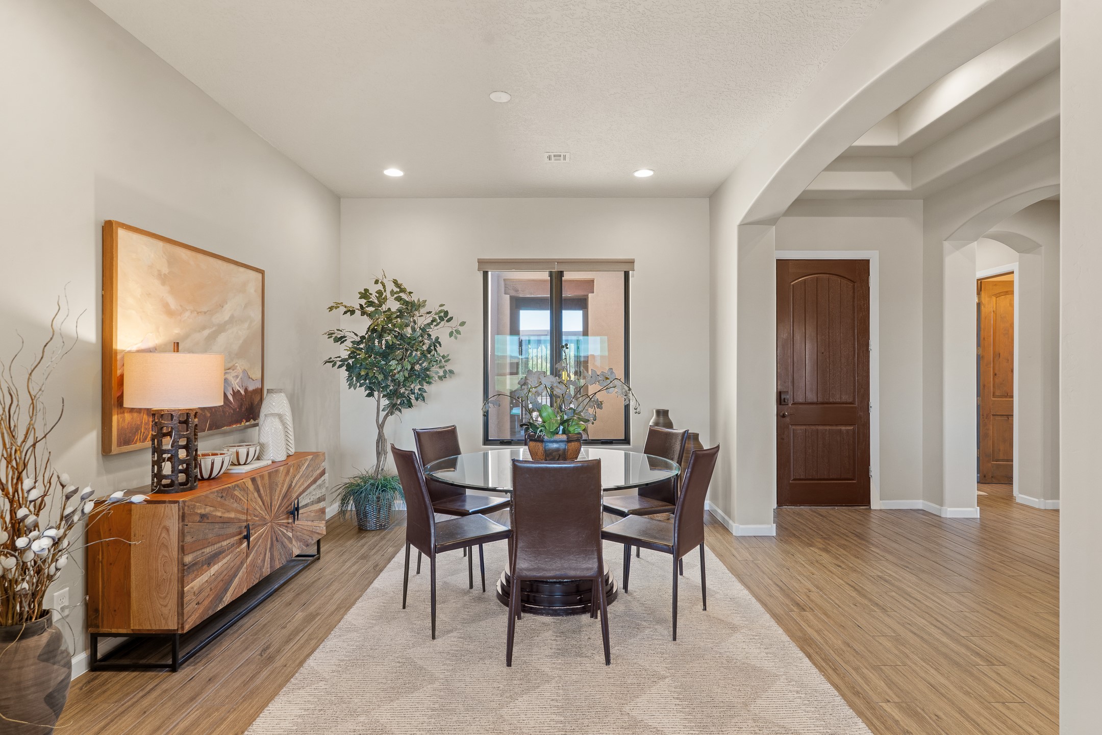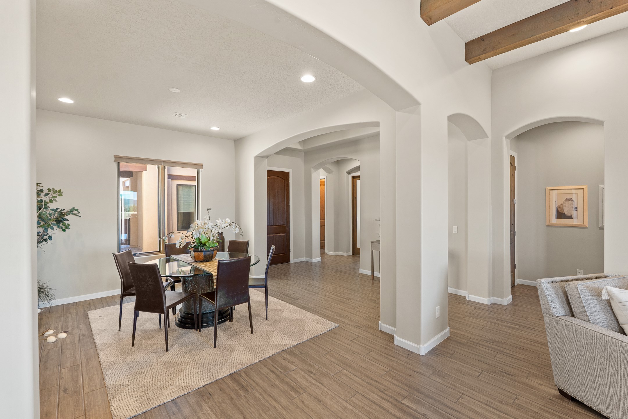 Exceptional value on this move in ready Las Campanas Contemporary Pueblo RetreatWhere contemporary design meets timeless Santa Fe elegance, this 3,715-square-foot single-level residence offers the perfect balance of sophistication, privacy, and sweeping mountain views. Completed in 2023, this home features upgraded modern finishes and is nicely sited on a corner lot -- backing to open space to the west.Light-filled and beautifully proportioned, the open-concept layout flows effortlessly between the living, dining, and outdoor spaces. The great room features beamed ceilings, a sleek gas fireplace, and panoramic views of the Jemez Mountains--capturing Santa Fe's legendary sunsets in every season.At the heart of the home, the chef's kitchen is both striking and functional, equipped with upgraded Wolf, Sub-Zero, and Asko appliances - including a six-burner double oven range, built-in convection oven and microwave, and dual dishwashers. Granite countertops, crisp white cabinetry, and a generous island create a gathering space as stylish as it is practical.The primary suite is a private sanctuary with breathtaking mountain views and a spa-like bath featuring dual vanities, a dedicated makeup area, and luxurious finishes. A separate guest suite with its own living area offers comfort and independence for visitors, while a dedicated office adds flexibility for work or creative pursuits.Outdoors, beautifully landscaped patios extend the living space--perfect for dining al fresco, entertaining, or simply enjoying the quiet beauty of the high desert. An oversized two-car garage offers abundant space for vehicles and storage.Located just minutes from The Club at Las Campanas, where fine dining, golf, fitness, and spa amenities await (membership optional), this residence embodies modern Santa Fe luxury--panoramic views, refined design, and tranquil living in one of the city's most prestigious communities.