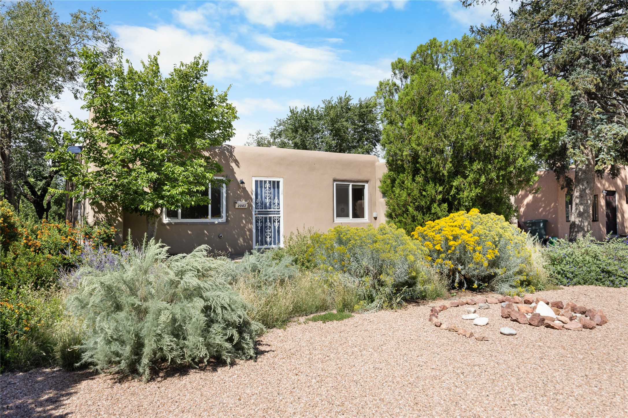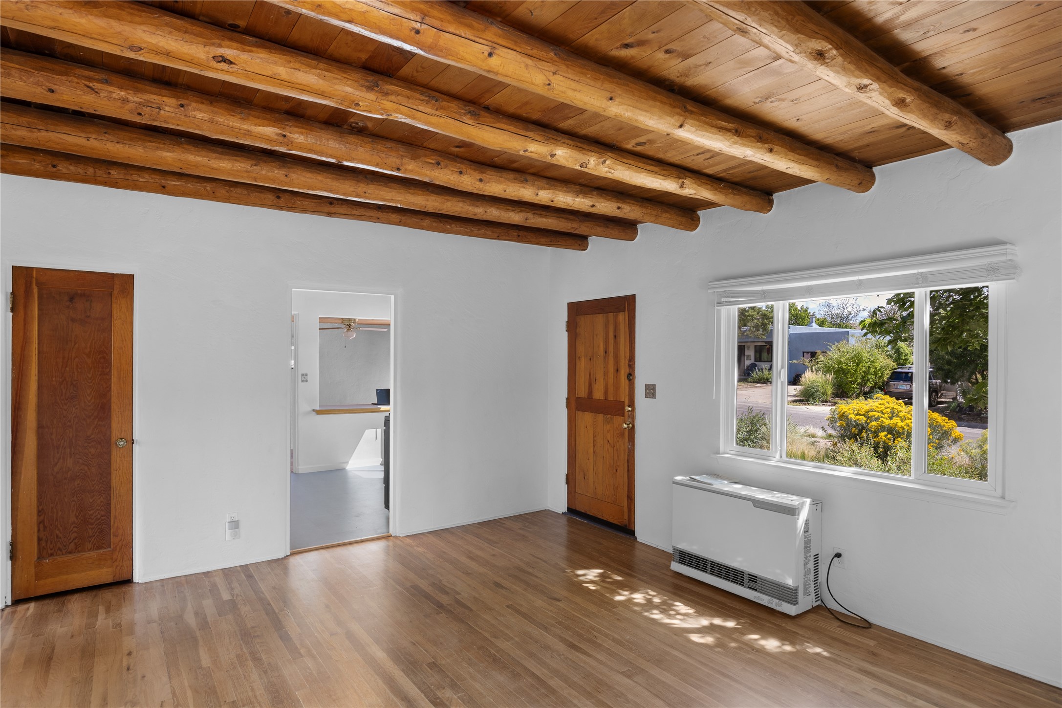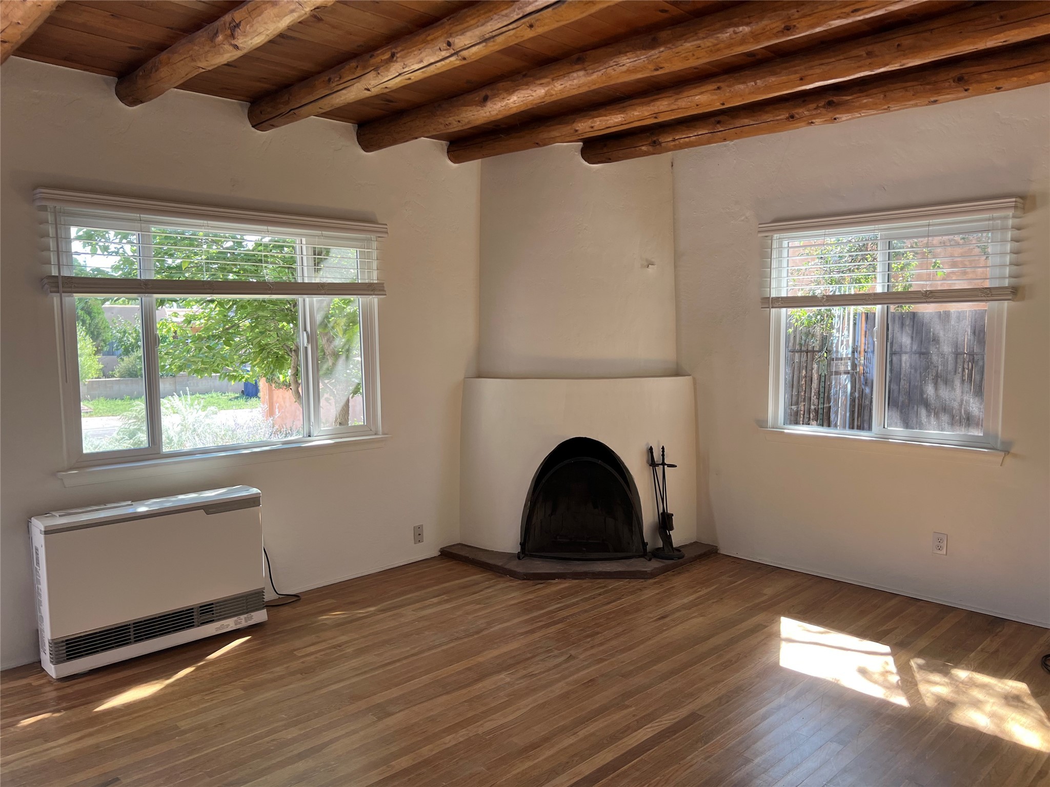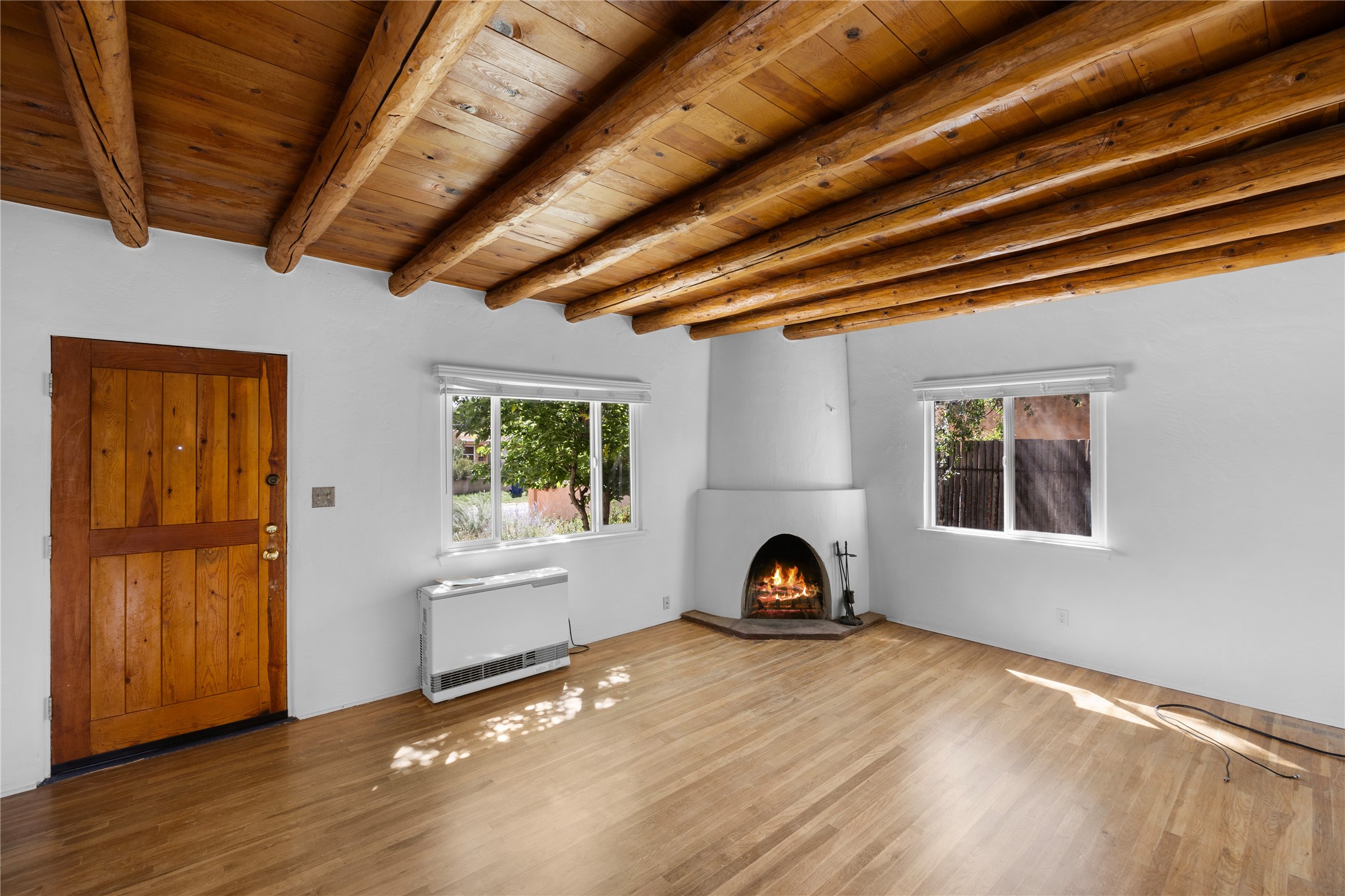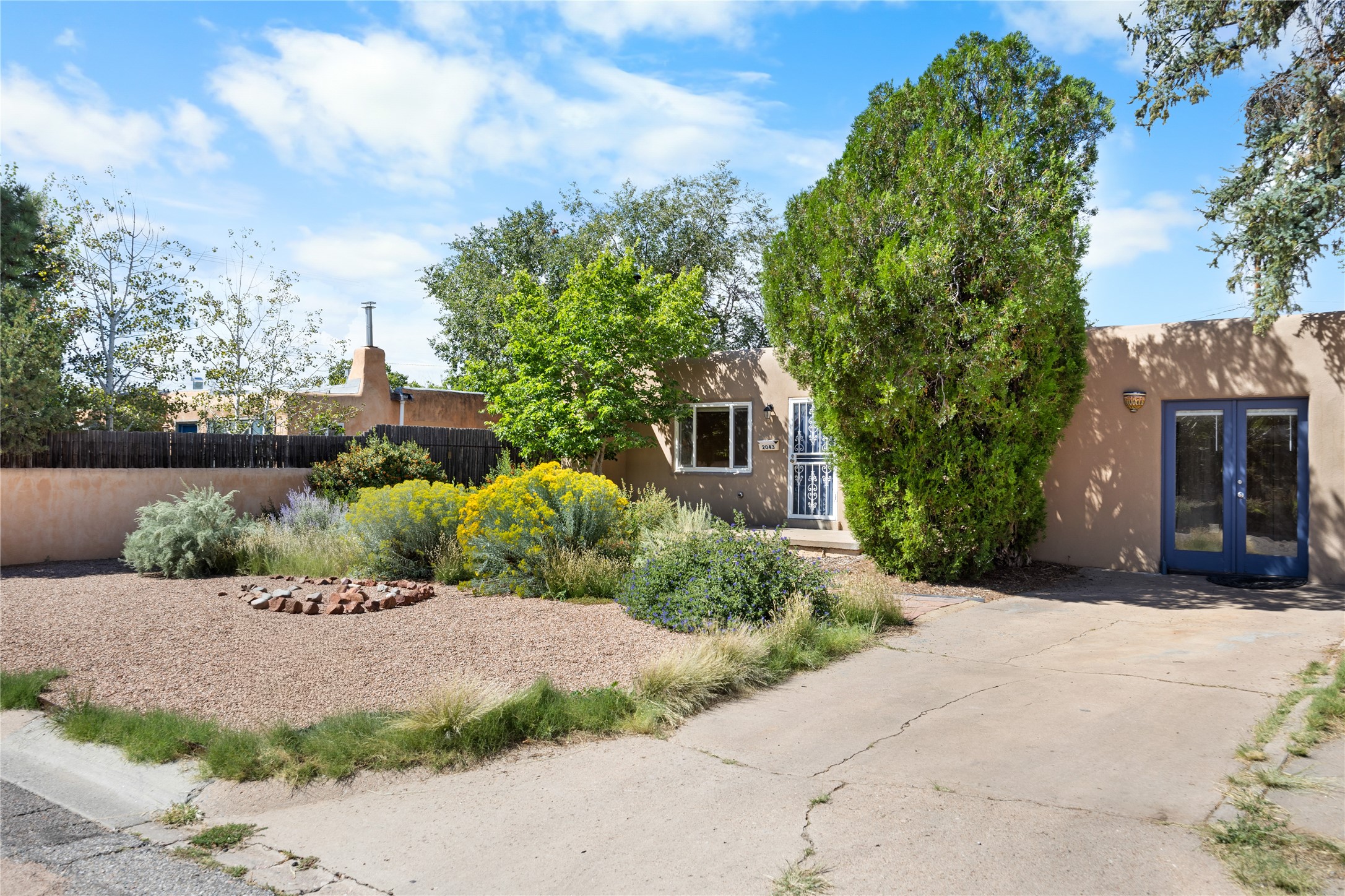 Quintessential well-built Allen Stamm home, beautifully sited in coveted Casa Alegre. Be entranced by its lovely front yard's landscaping, with a sweet flagstone path leading to the classic Stamm front door. The interior won't disappoint, with its solid design including vigas, hardwood floors and a corner kiva fireplace. Its converted garage features a French door entryway, and exudes warmth and comfort with its Saltillo tile flooring, woodburning stove and built in wooden shelving. The home has been consistently upgraded & includes a newer roof, stucco, plumbing, electrical, windows & blinds. Its original floor furnace has been replaced by more efficient heating options. A spacious portal graces the large meadowy back yard which includes a clothes line (!!), & offers space for additional structures. Easy access to Frenchy's, Ashbaugh frisbee & dog park, & the Acequia biking/walking path to the Railyard & Santa Fe River Trail to downtown & the Plaza, plus restaurants & shopping. Come see this move-in-ready special gem ASAP!!