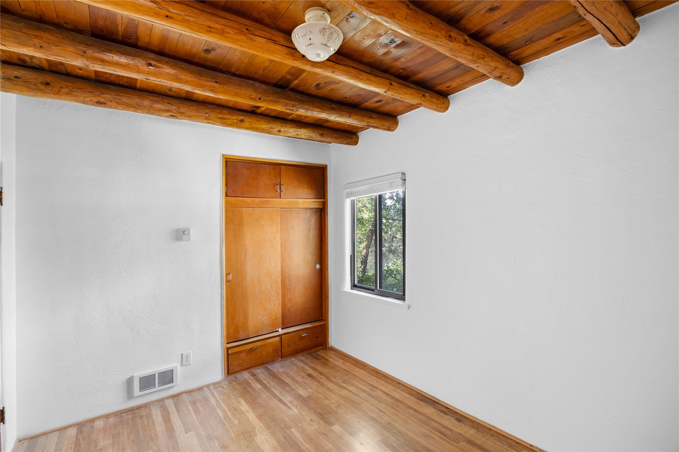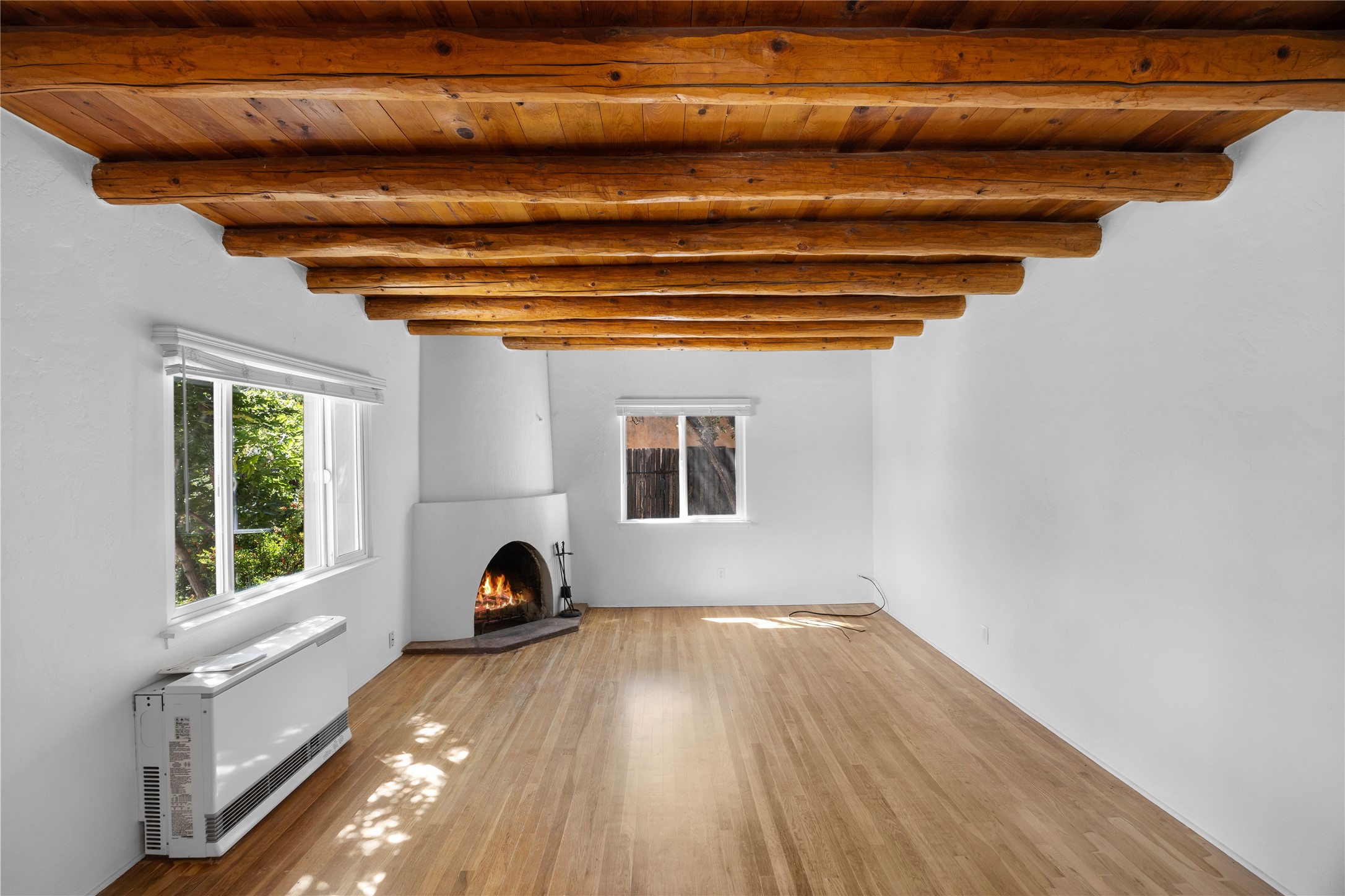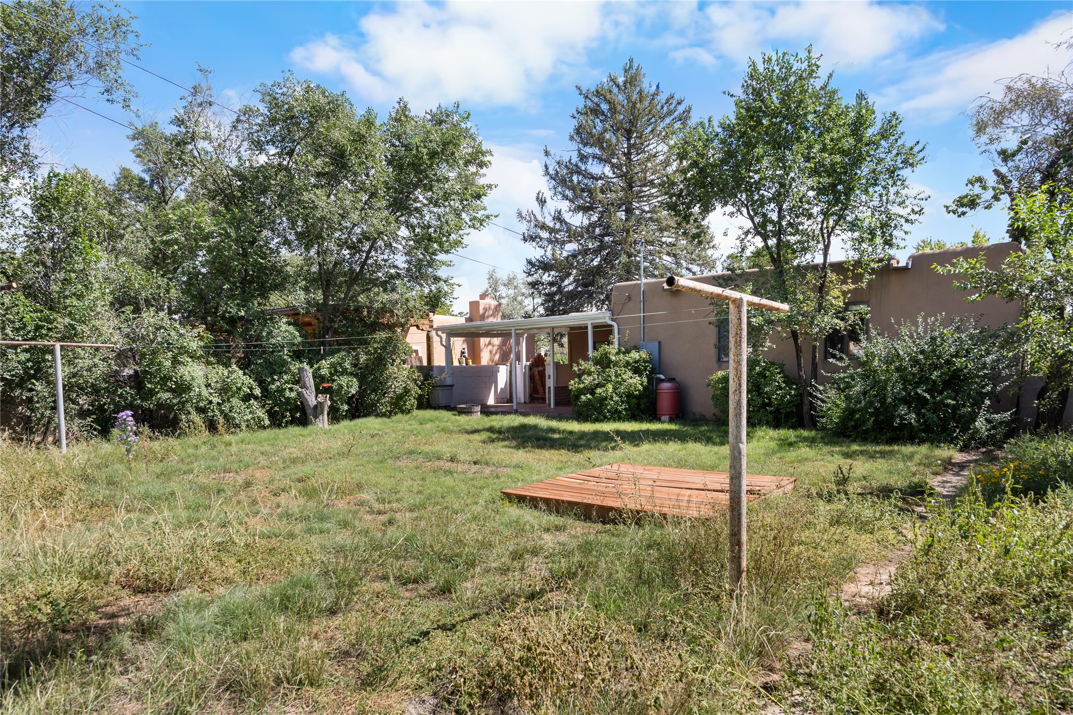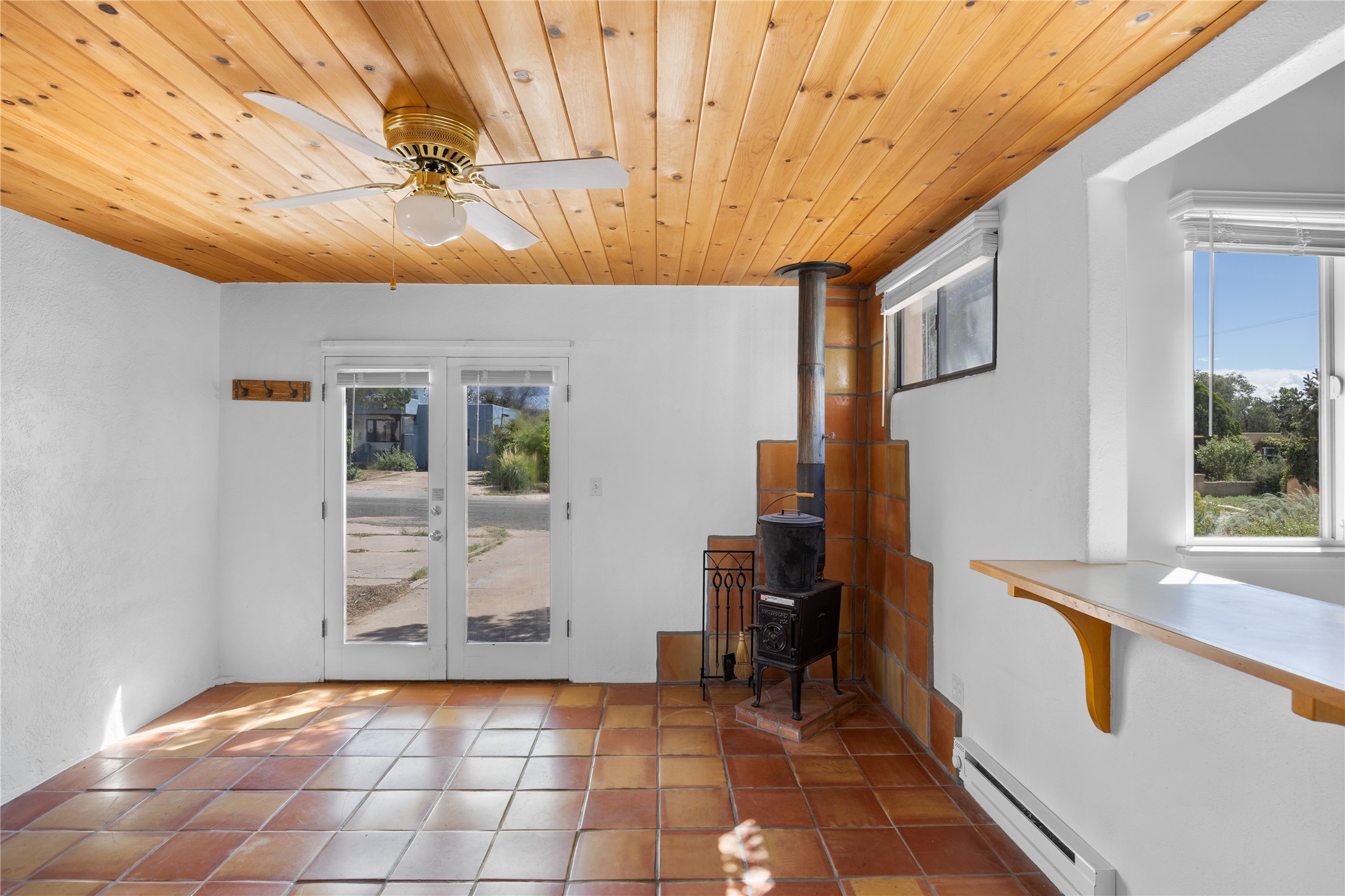 Quintessential well-built Allen Stamm home, beautifully sited in coveted Casa Alegre. Be entranced by its lovely front yard's landscaping, with a sweet flagstone path leading to the classic Stamm front door. The interior won't disappoint, with its solid design including vigas, hardwood floors and a corner kiva fireplace. Its converted garage features a French door entryway, and exudes warmth and comfort with its Saltillo tile flooring, woodburning stove and built in wooden shelving. The home has been consistently upgraded & includes a newer roof, stucco, plumbing, electrical, windows & blinds. Its original floor furnace has been replaced by more efficient heating options. A spacious portal graces the large meadowy back yard which includes a clothes line (!!), & offers space for additional structures. Easy access to Frenchy's, Ashbaugh frisbee & dog park, & the Acequia biking/walking path to the Railyard & Santa Fe River Trail to downtown & the Plaza, plus restaurants & shopping. Come see this move-in-ready special gem ASAP!!