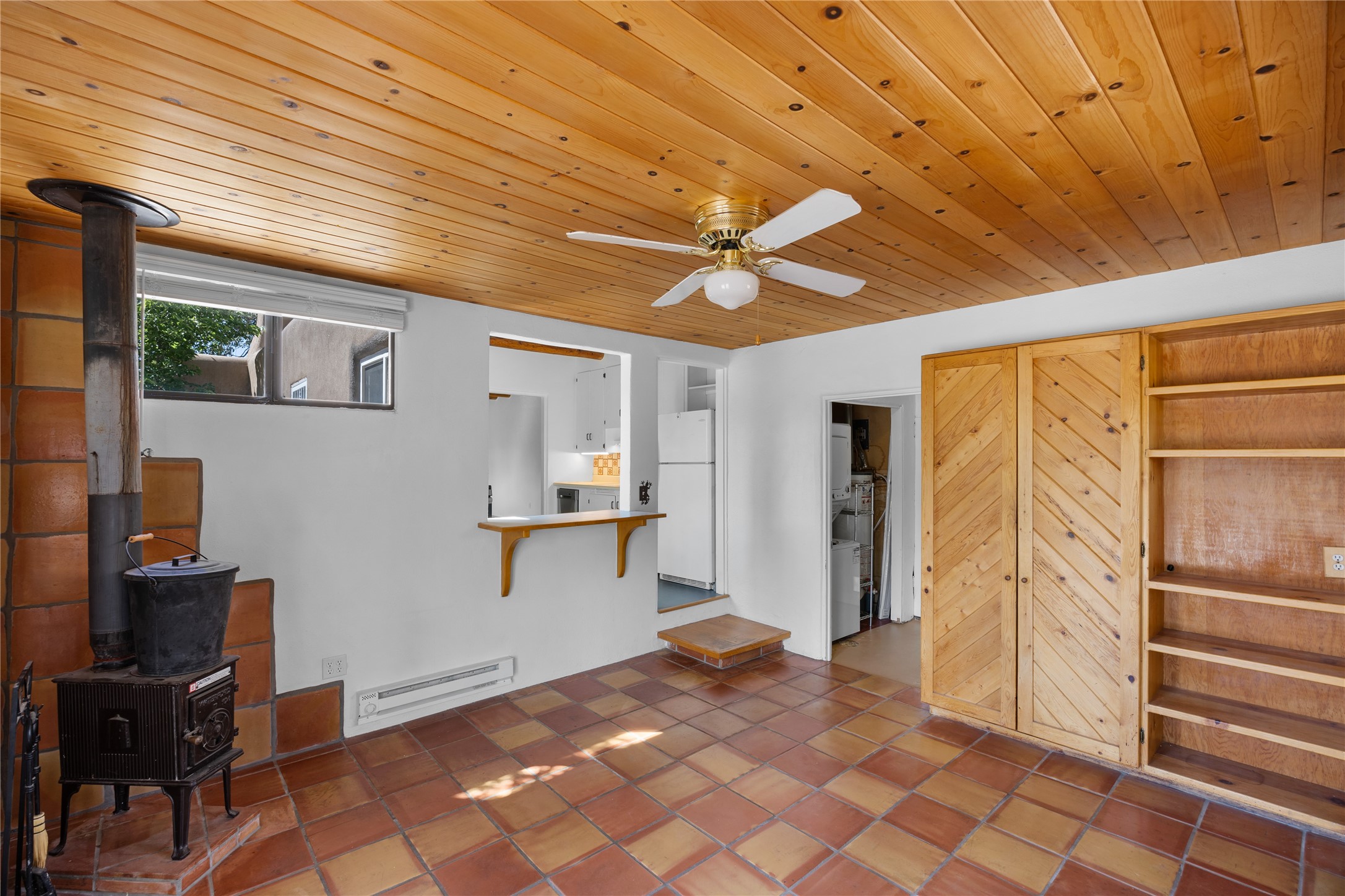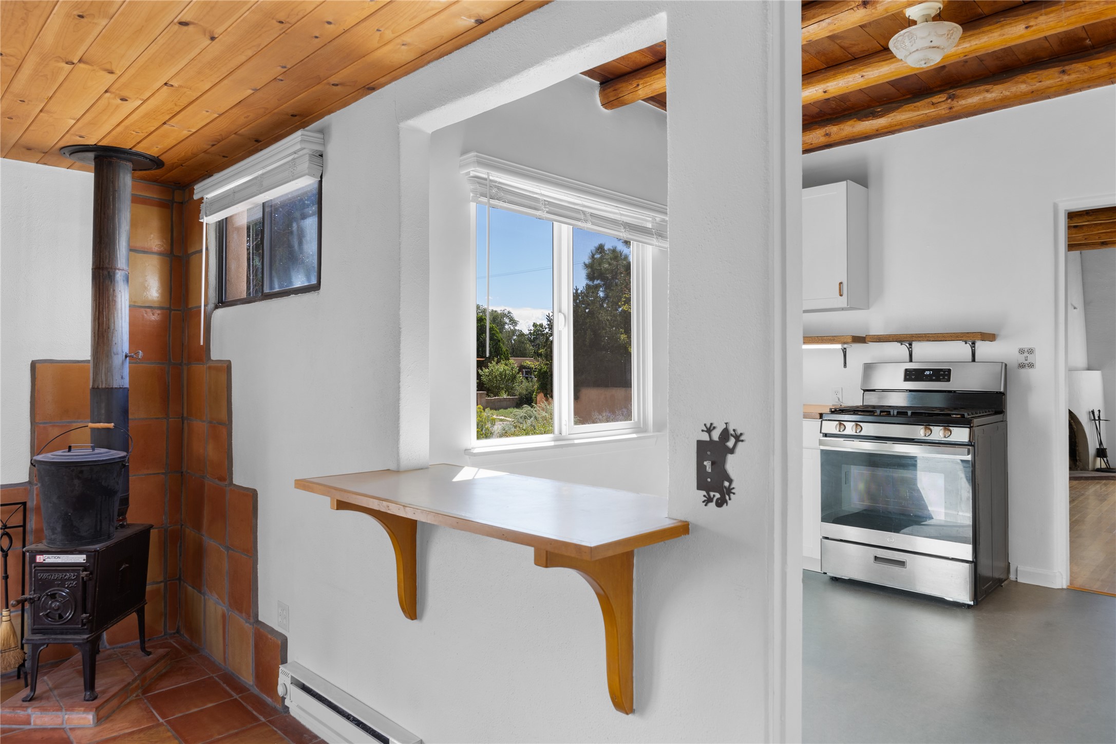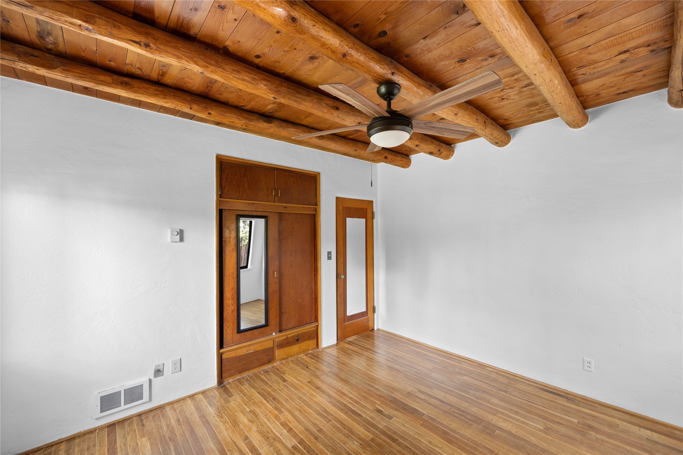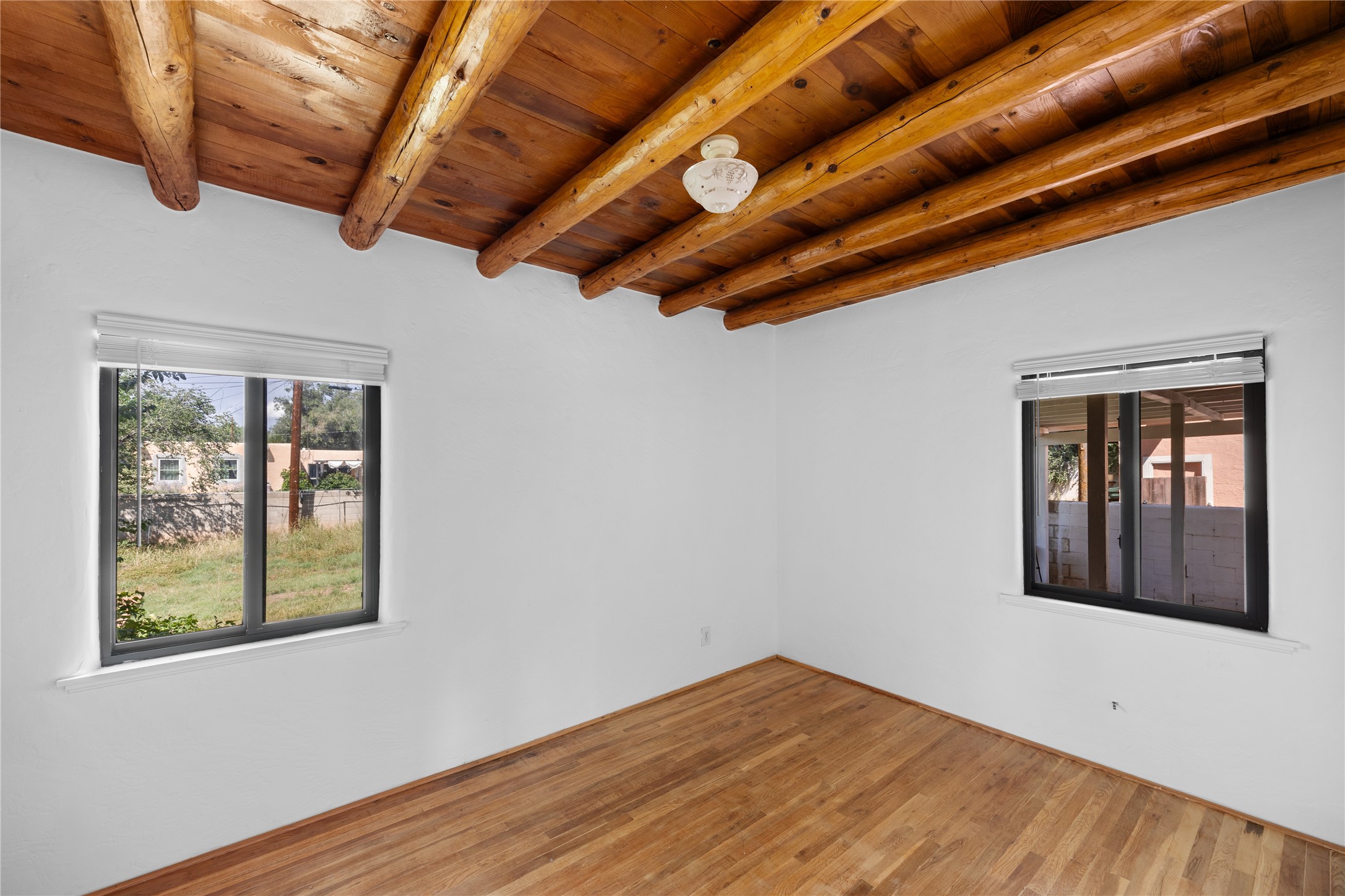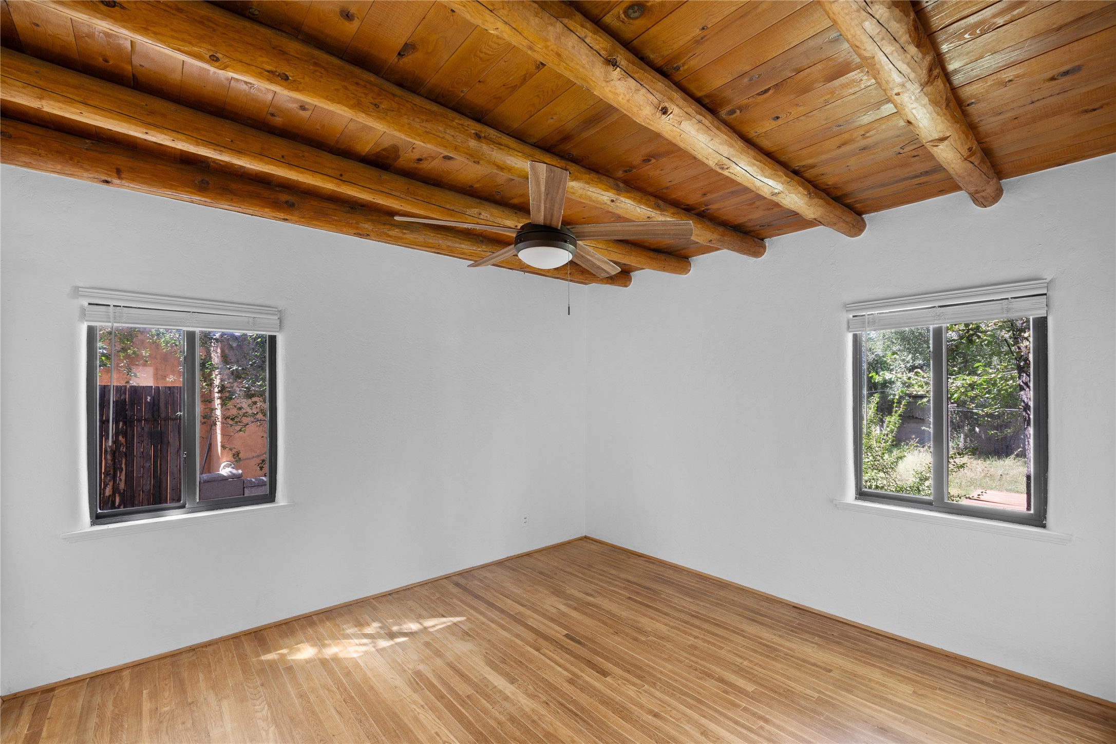 Quintessential well-built Allen Stamm home, beautifully sited in coveted Casa Alegre. Be entranced by its lovely front yard's landscaping, with a sweet flagstone path leading to the classic Stamm front door. The interior won't disappoint, with its solid design including vigas, hardwood floors and a corner kiva fireplace. Its converted garage features a French door entryway, and exudes warmth and comfort with its Saltillo tile flooring, woodburning stove and built in wooden shelving. The home has been consistently upgraded & includes a newer roof, stucco, plumbing, electrical, windows & blinds. Its original floor furnace has been replaced by more efficient heating options. A spacious portal graces the large meadowy back yard which includes a clothes line (!!), & offers space for additional structures. Easy access to Frenchy's, Ashbaugh frisbee & dog park, & the Acequia biking/walking path to the Railyard & Santa Fe River Trail to downtown & the Plaza, plus restaurants & shopping. Come see this move-in-ready special gem ASAP!!