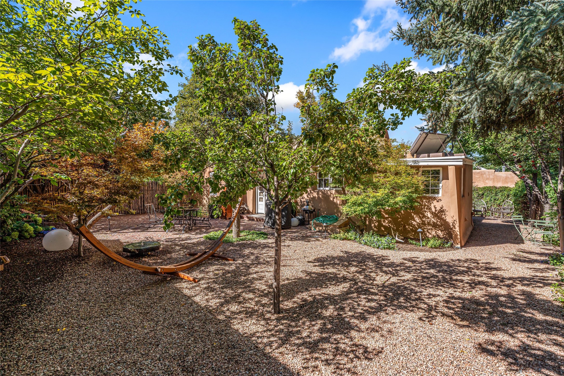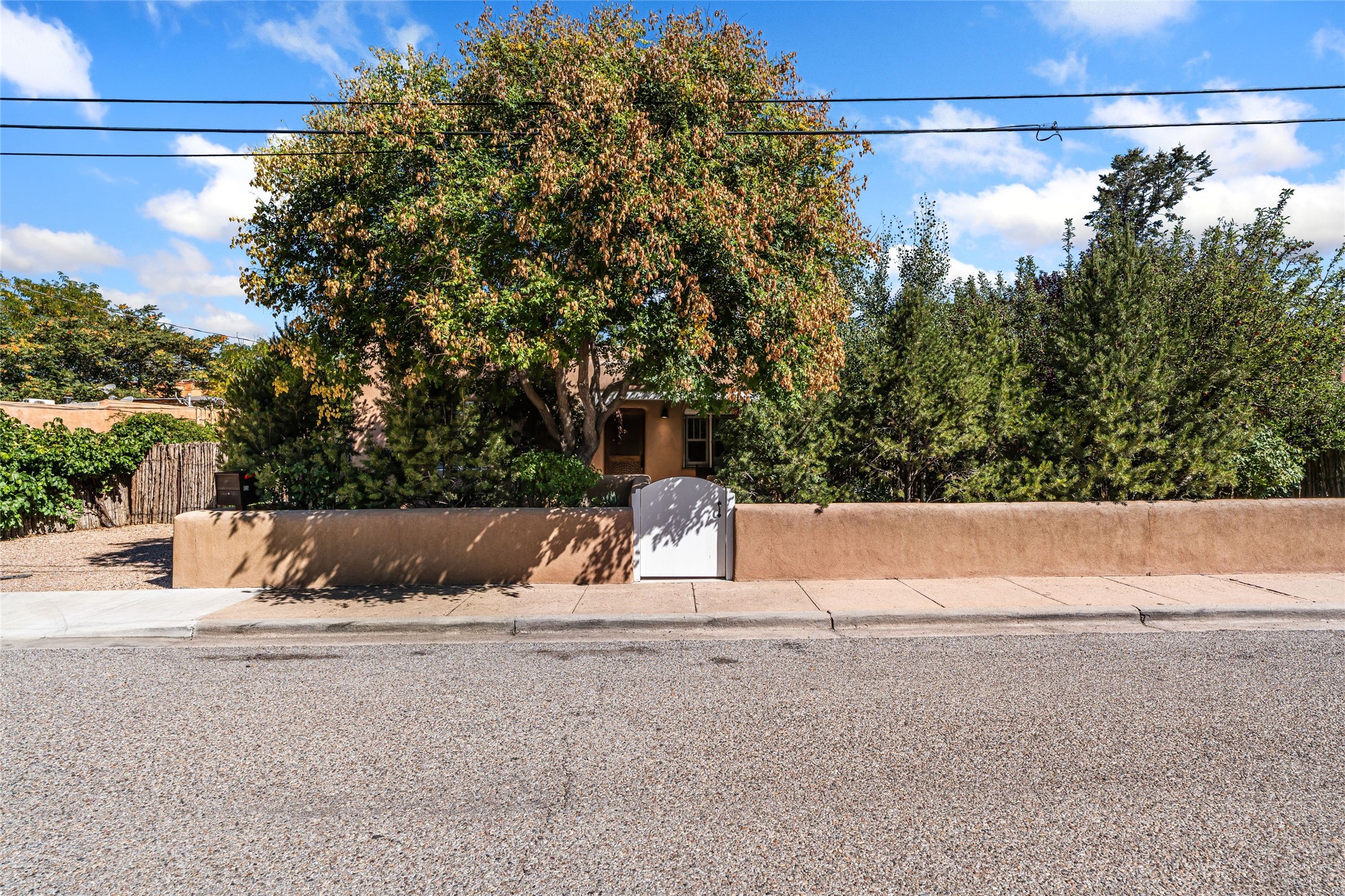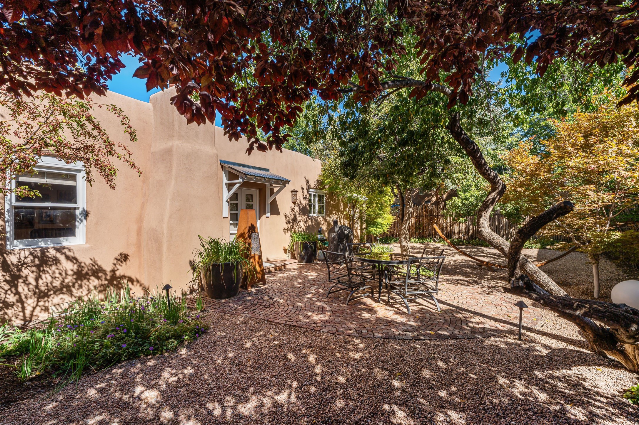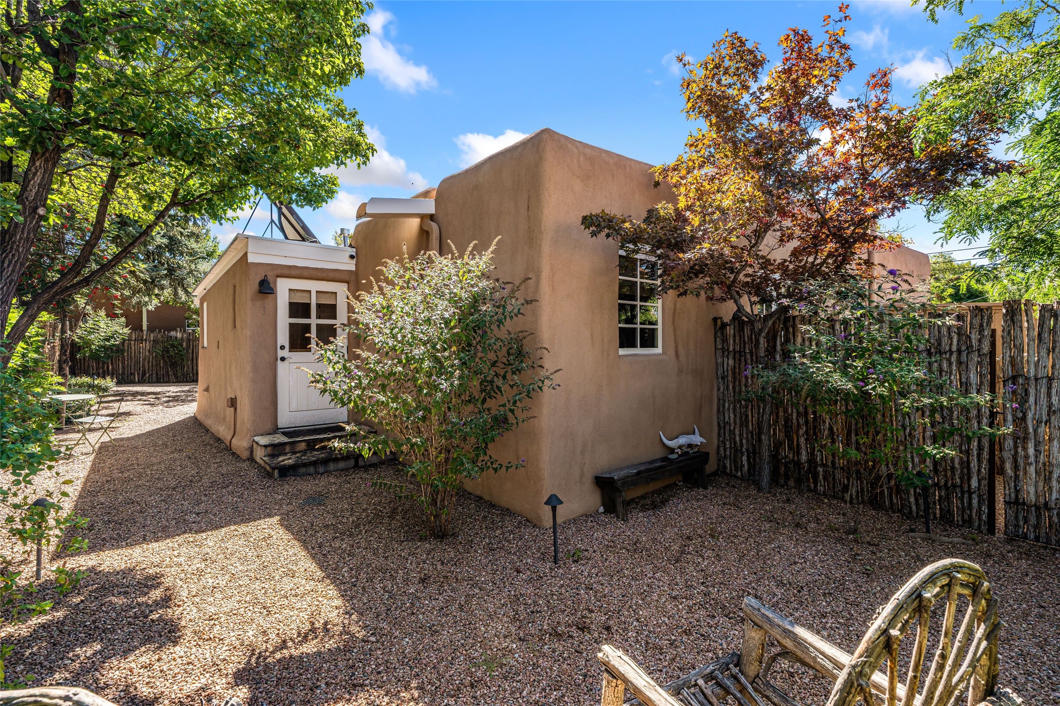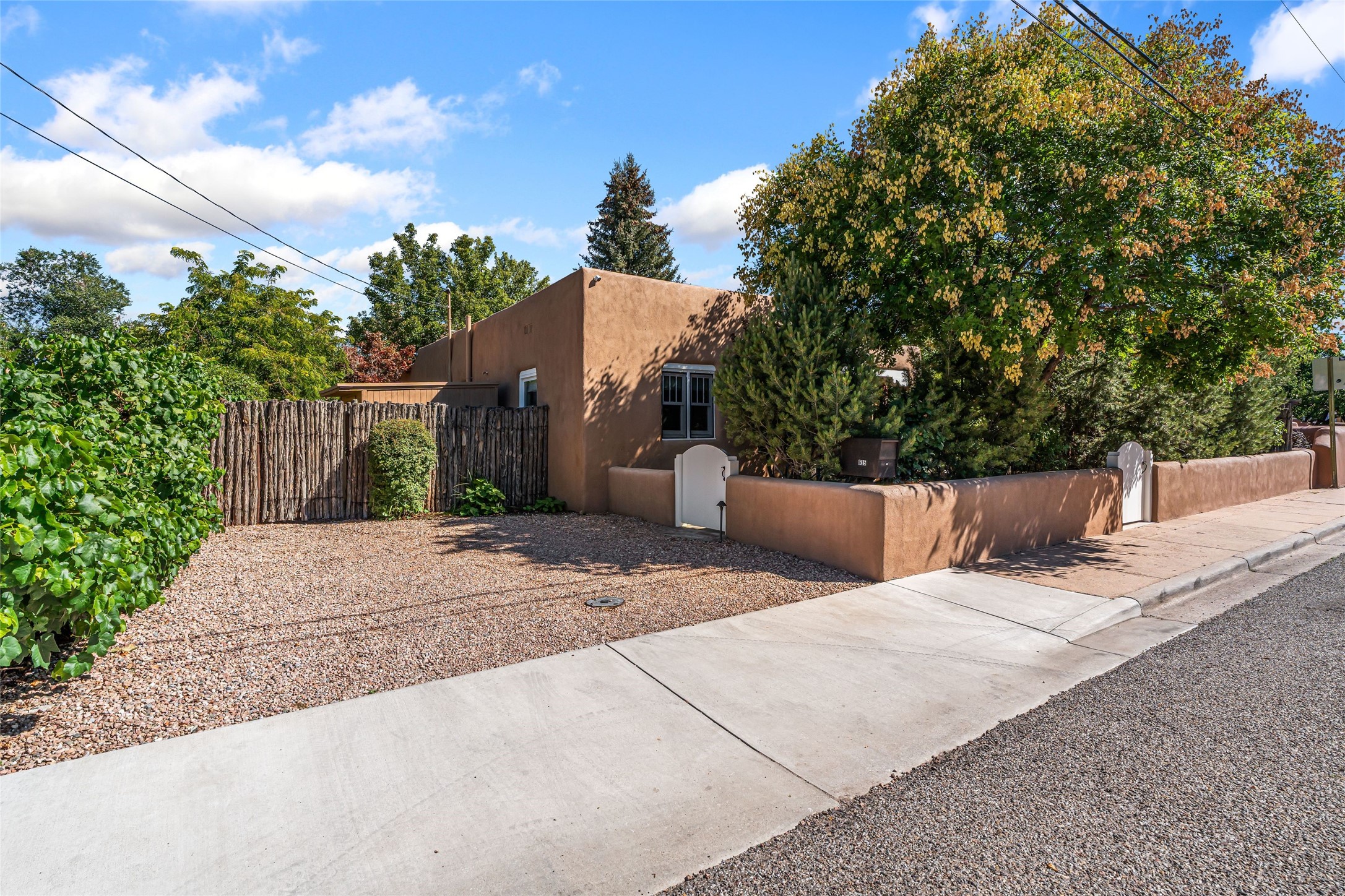 A rare Santa Fe gem - this adobe sanctuary on an oversized lot offers seamless indoor-outdoor living with a fully fenced wraparound yard. Stacked stone walls, wooden gates, a grapevine-covered arbor, and fragrant landscaped gardens create a serene setting where every window frames natural beauty. Inside, renovations preserve authentic adobe character while introducing a fresh, contemporary feel. Skylights brighten the kitchen, and the spacious great room with French doors to the courtyard is ideal for entertaining. The floor plan includes two bedrooms, a full bath, powder room, large laundry room, and a flexible study or dressing room off the primary suite. A private downstairs space provides additional storage or the opportunity for a refinished retreat. Nestled at the heart of the Railyard District, just blocks from Joseph's Pub, Mille, Dolina, Paloma, and minutes to the Plaza, this calming home combines timeless Santa Fe charm with modern updates and unbeatable location.