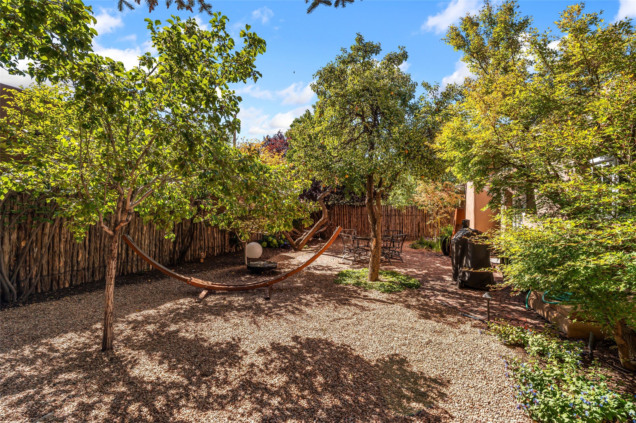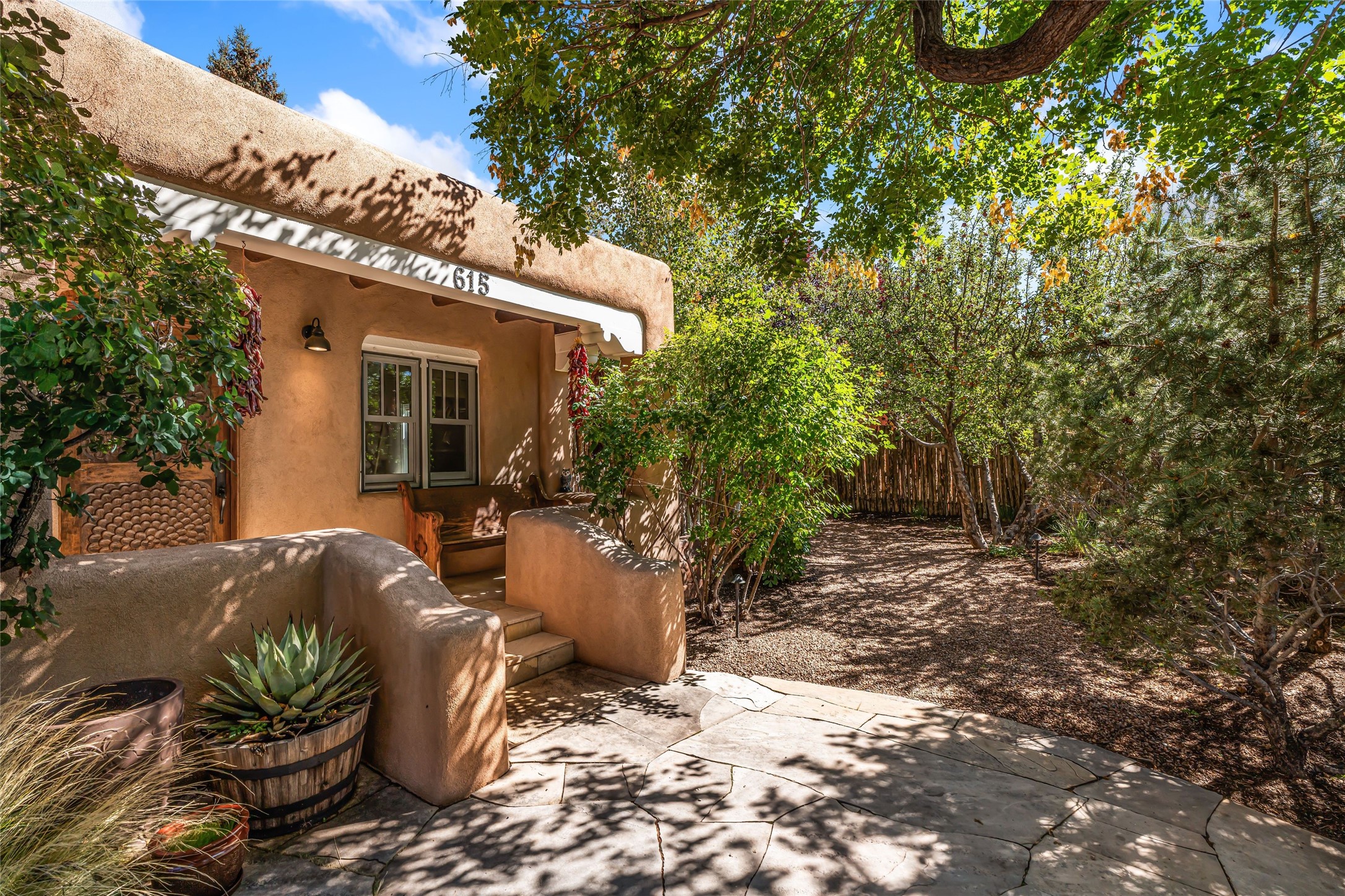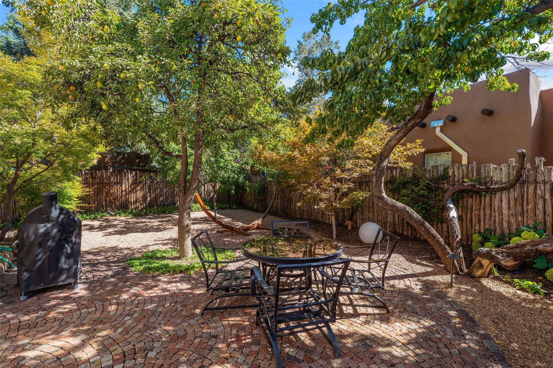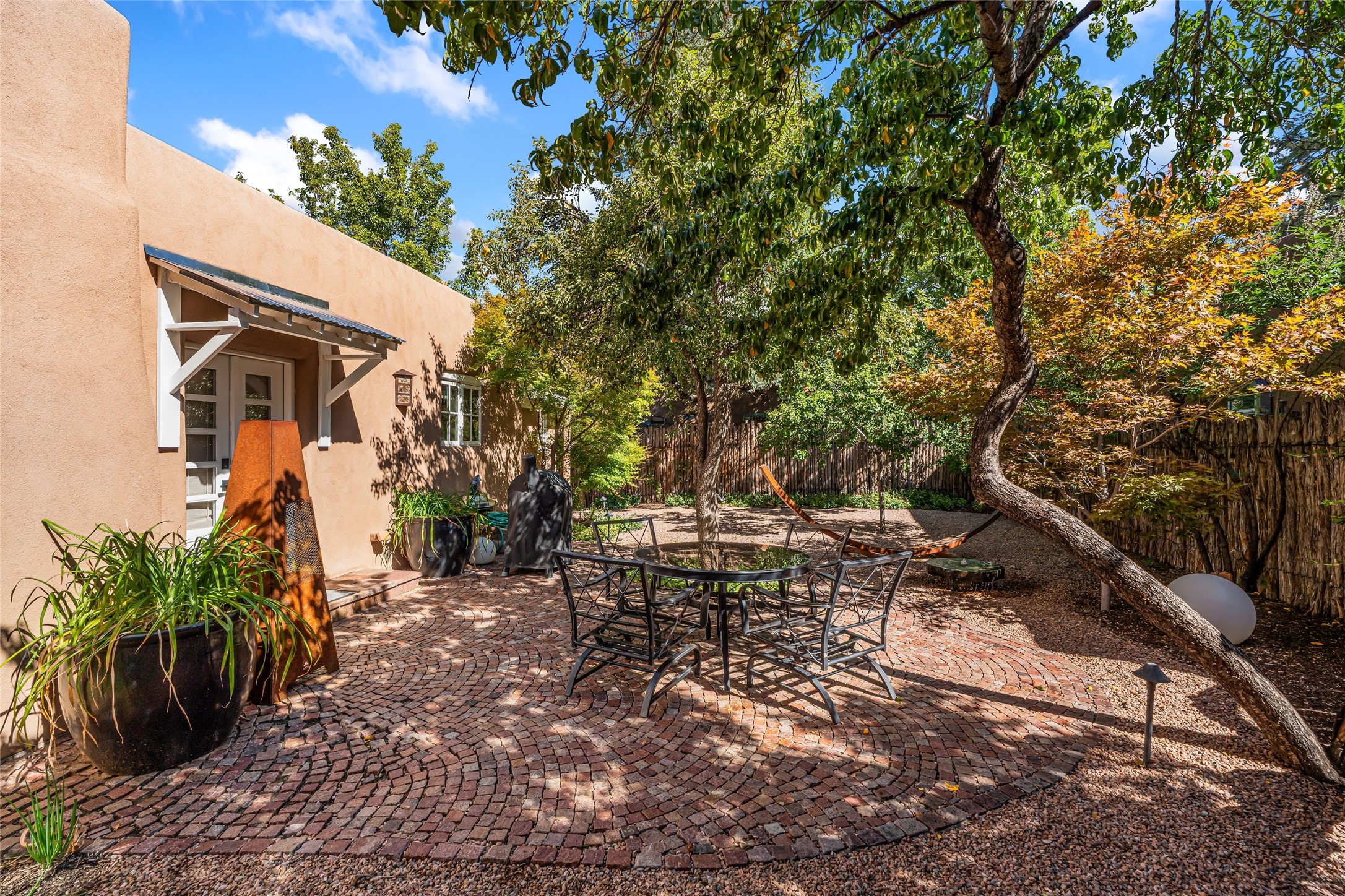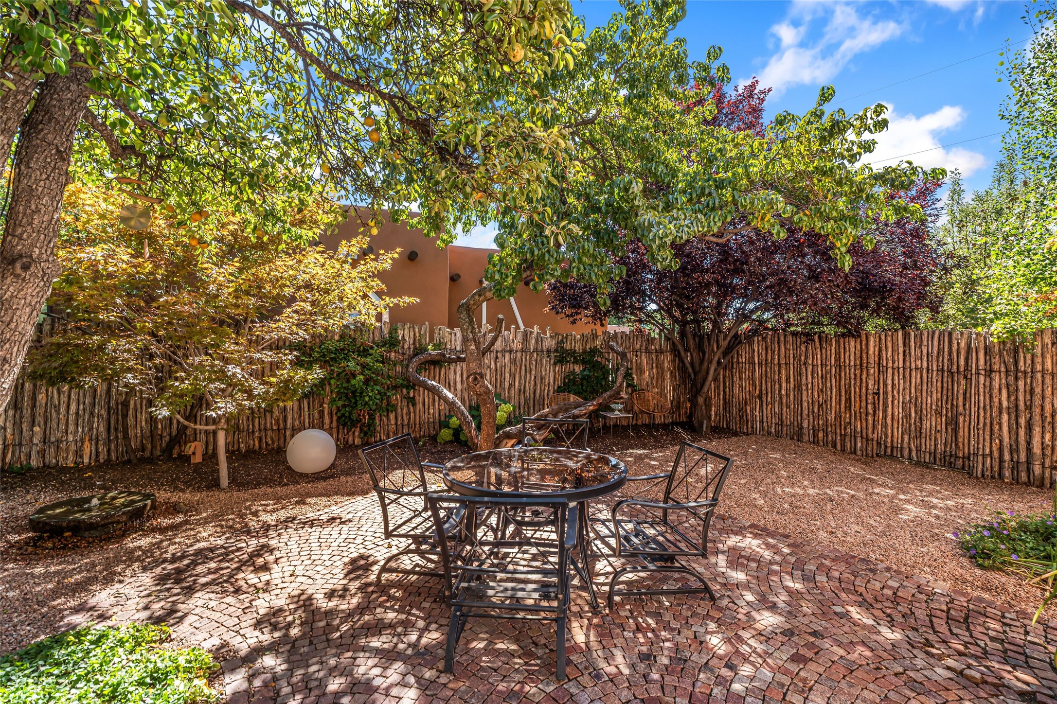 A rare Santa Fe gem - this adobe sanctuary on an oversized lot offers seamless indoor-outdoor living with a fully fenced wraparound yard. Stacked stone walls, wooden gates, a grapevine-covered arbor, and fragrant landscaped gardens create a serene setting where every window frames natural beauty. Inside, renovations preserve authentic adobe character while introducing a fresh, contemporary feel. Skylights brighten the kitchen, and the spacious great room with French doors to the courtyard is ideal for entertaining. The floor plan includes two bedrooms, a full bath, powder room, large laundry room, and a flexible study or dressing room off the primary suite. A private downstairs space provides additional storage or the opportunity for a refinished retreat. Nestled at the heart of the Railyard District, just blocks from Joseph's Pub, Mille, Dolina, Paloma, and minutes to the Plaza, this calming home combines timeless Santa Fe charm with modern updates and unbeatable location.