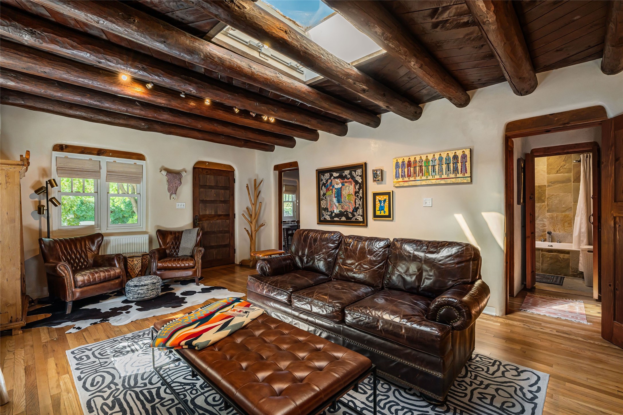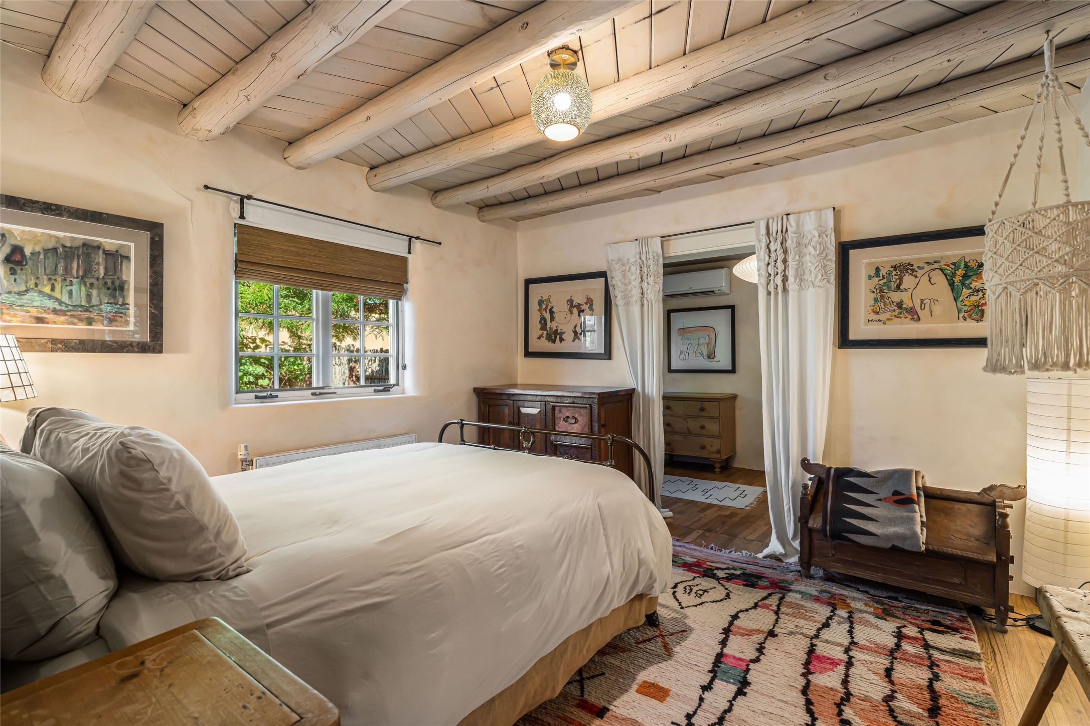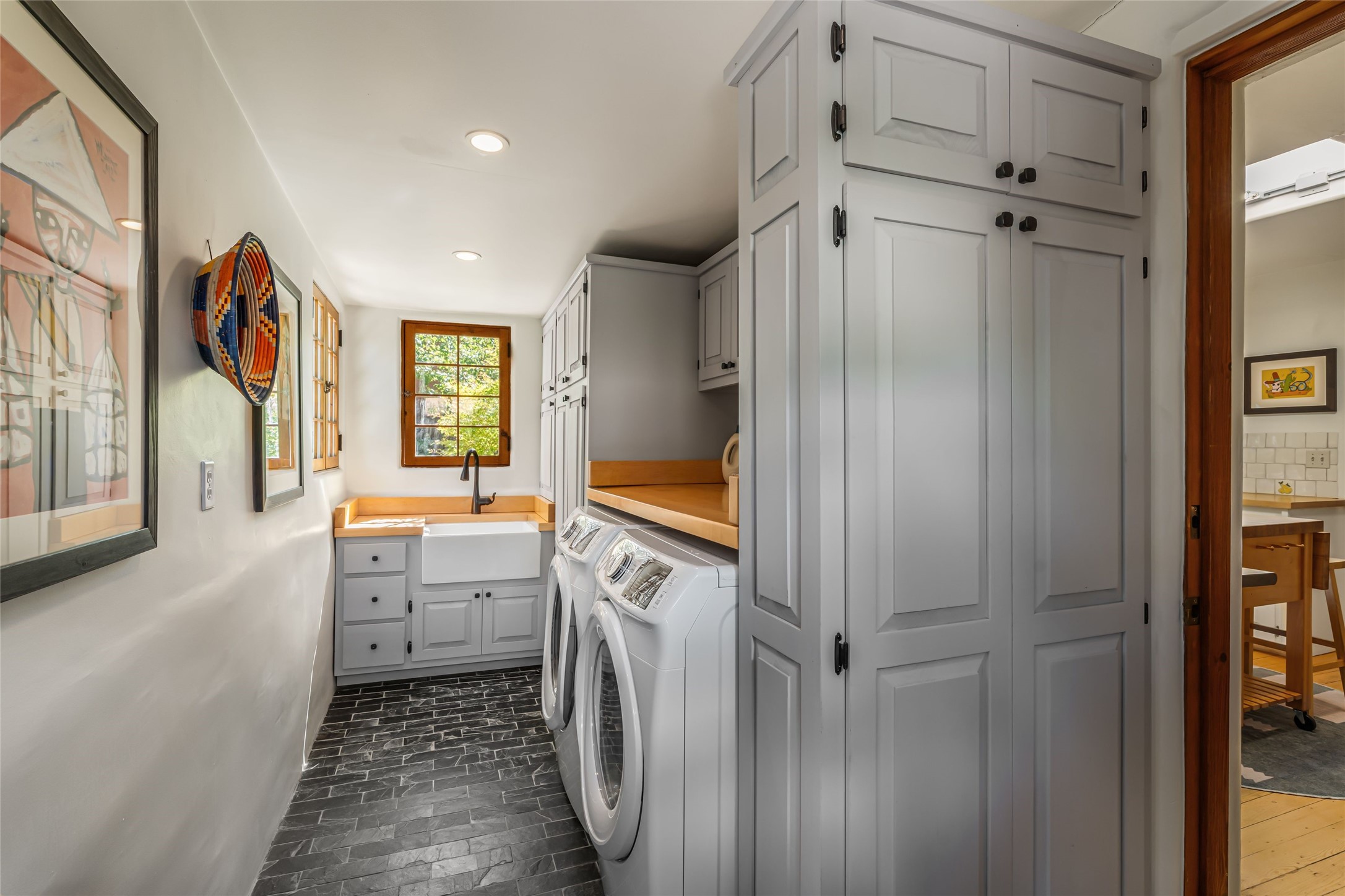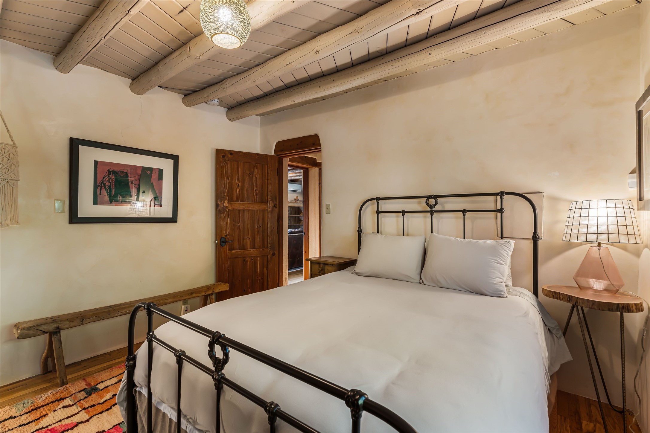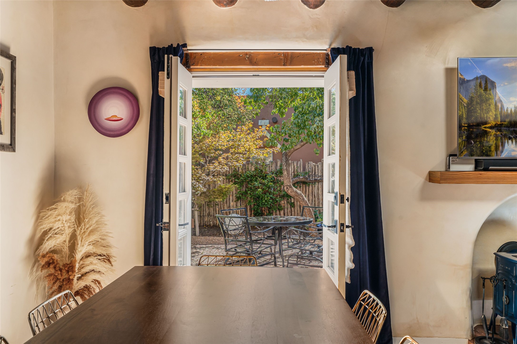 A rare Santa Fe gem - this adobe sanctuary on an oversized lot offers seamless indoor-outdoor living with a fully fenced wraparound yard. Stacked stone walls, wooden gates, a grapevine-covered arbor, and fragrant landscaped gardens create a serene setting where every window frames natural beauty. Inside, renovations preserve authentic adobe character while introducing a fresh, contemporary feel. Skylights brighten the kitchen, and the spacious great room with French doors to the courtyard is ideal for entertaining. The floor plan includes two bedrooms, a full bath, powder room, large laundry room, and a flexible study or dressing room off the primary suite. A private downstairs space provides additional storage or the opportunity for a refinished retreat. Nestled at the heart of the Railyard District, just blocks from Joseph's Pub, Mille, Dolina, Paloma, and minutes to the Plaza, this calming home combines timeless Santa Fe charm with modern updates and unbeatable location.