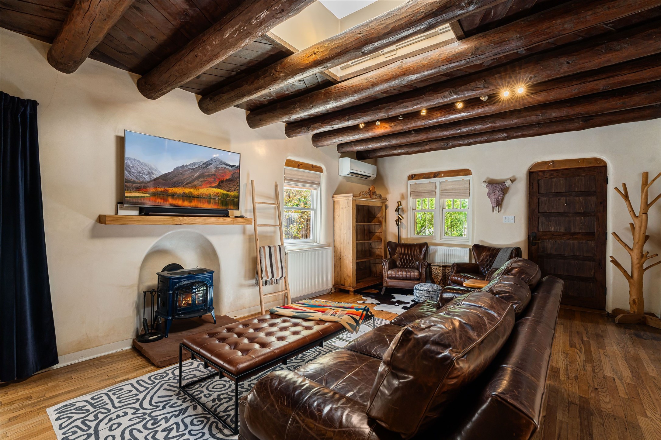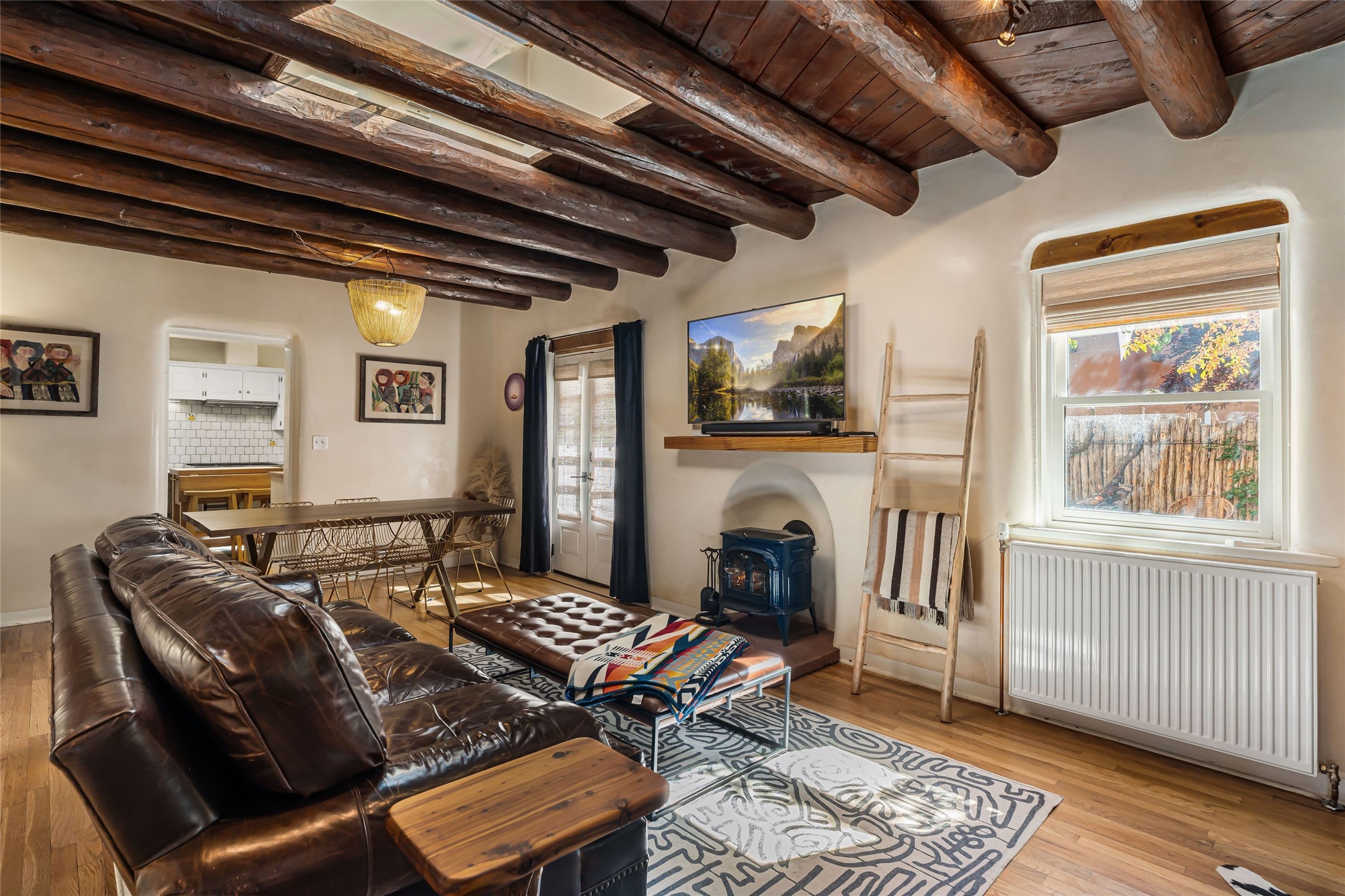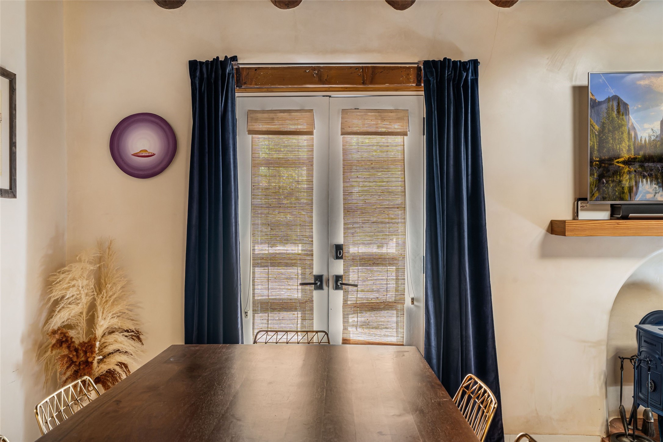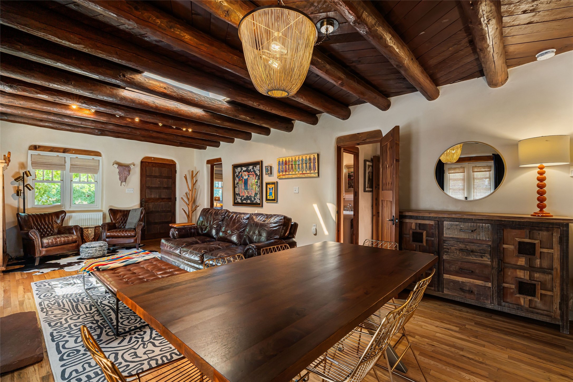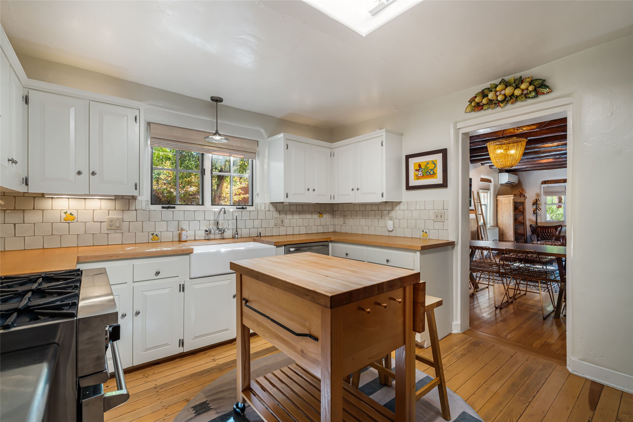 A rare Santa Fe gem - this adobe sanctuary on an oversized lot offers seamless indoor-outdoor living with a fully fenced wraparound yard. Stacked stone walls, wooden gates, a grapevine-covered arbor, and fragrant landscaped gardens create a serene setting where every window frames natural beauty. Inside, renovations preserve authentic adobe character while introducing a fresh, contemporary feel. Skylights brighten the kitchen, and the spacious great room with French doors to the courtyard is ideal for entertaining. The floor plan includes two bedrooms, a full bath, powder room, large laundry room, and a flexible study or dressing room off the primary suite. A private downstairs space provides additional storage or the opportunity for a refinished retreat. Nestled at the heart of the Railyard District, just blocks from Joseph's Pub, Mille, Dolina, Paloma, and minutes to the Plaza, this calming home combines timeless Santa Fe charm with modern updates and unbeatable location.