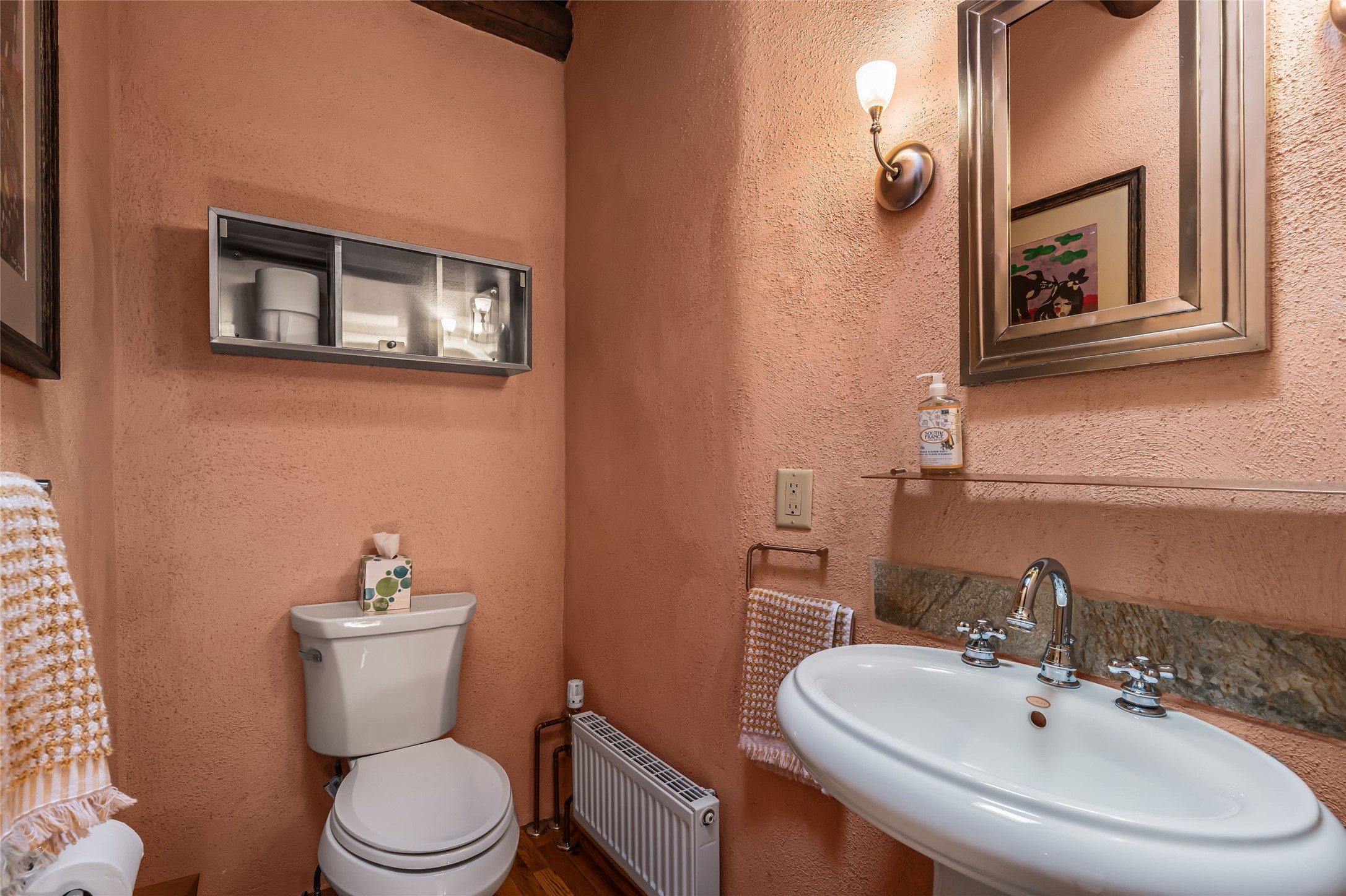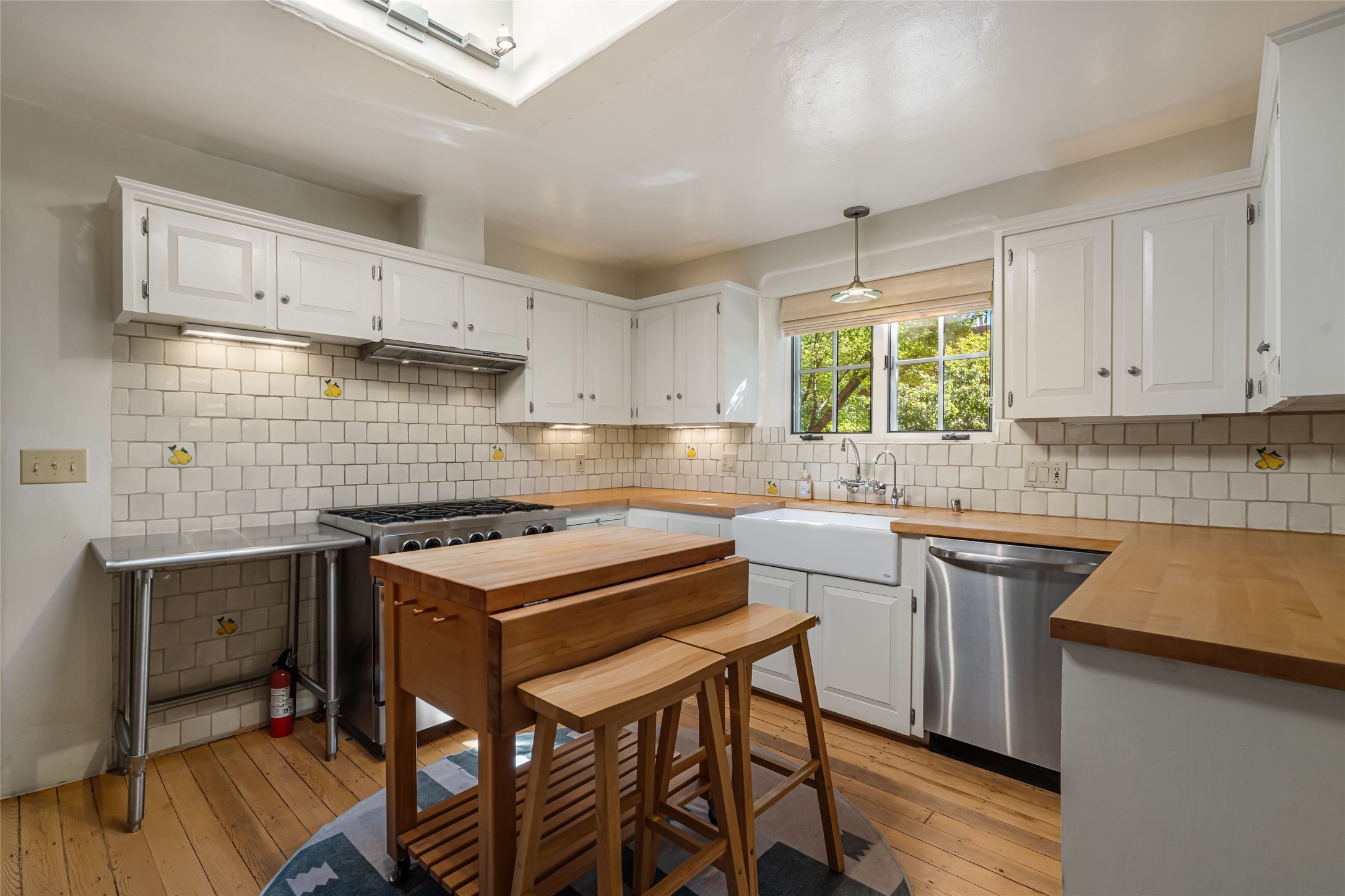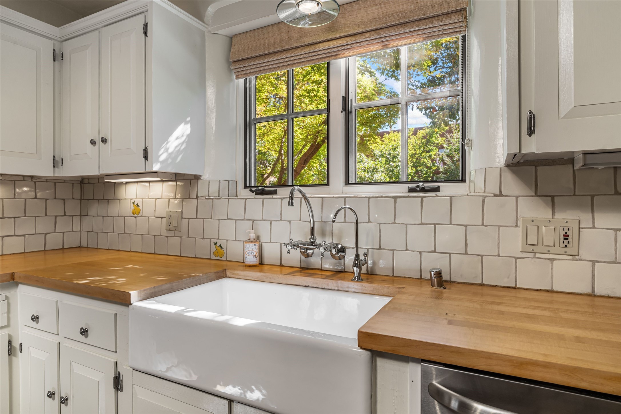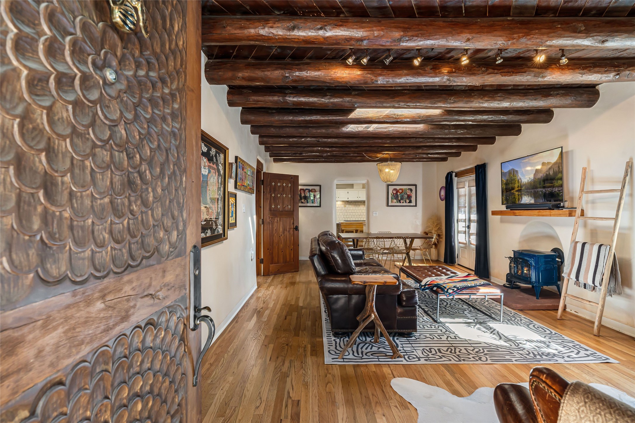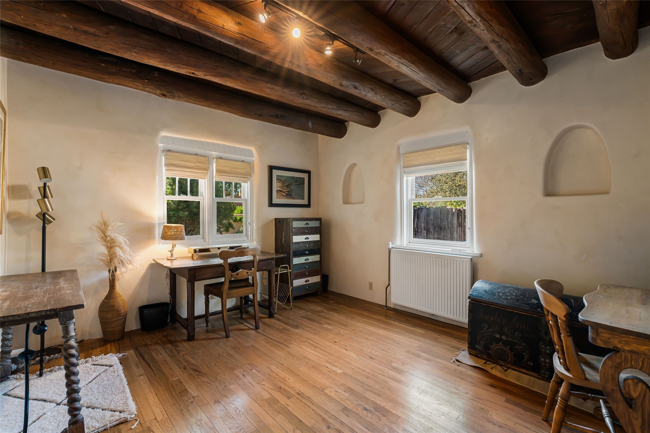 A rare Santa Fe gem - this adobe sanctuary on an oversized lot offers seamless indoor-outdoor living with a fully fenced wraparound yard. Stacked stone walls, wooden gates, a grapevine-covered arbor, and fragrant landscaped gardens create a serene setting where every window frames natural beauty. Inside, renovations preserve authentic adobe character while introducing a fresh, contemporary feel. Skylights brighten the kitchen, and the spacious great room with French doors to the courtyard is ideal for entertaining. The floor plan includes two bedrooms, a full bath, powder room, large laundry room, and a flexible study or dressing room off the primary suite. A private downstairs space provides additional storage or the opportunity for a refinished retreat. Nestled at the heart of the Railyard District, just blocks from Joseph's Pub, Mille, Dolina, Paloma, and minutes to the Plaza, this calming home combines timeless Santa Fe charm with modern updates and unbeatable location.