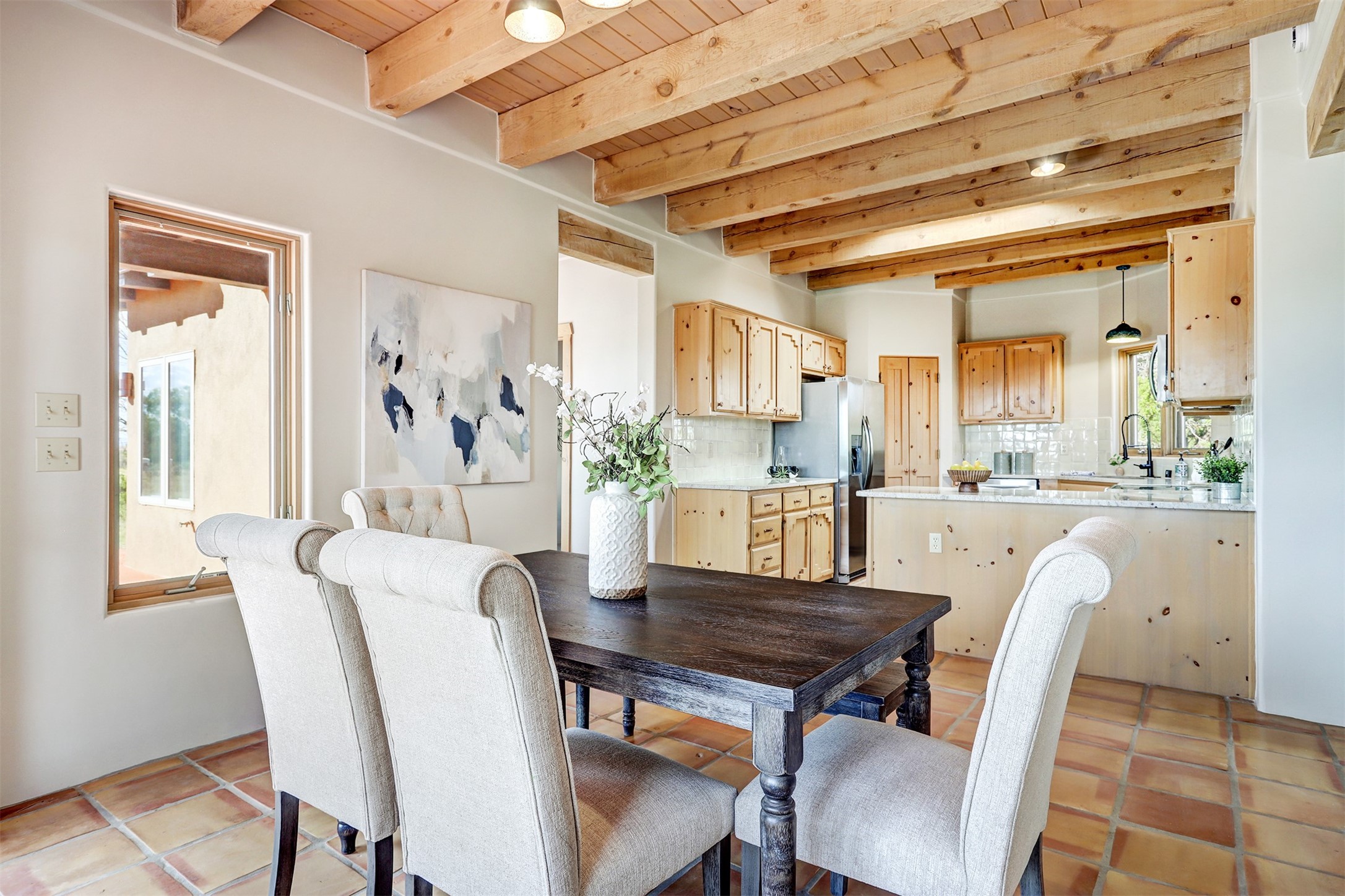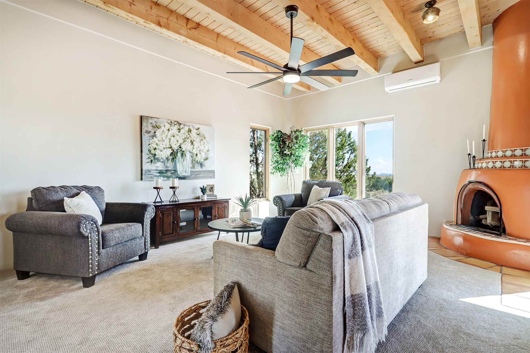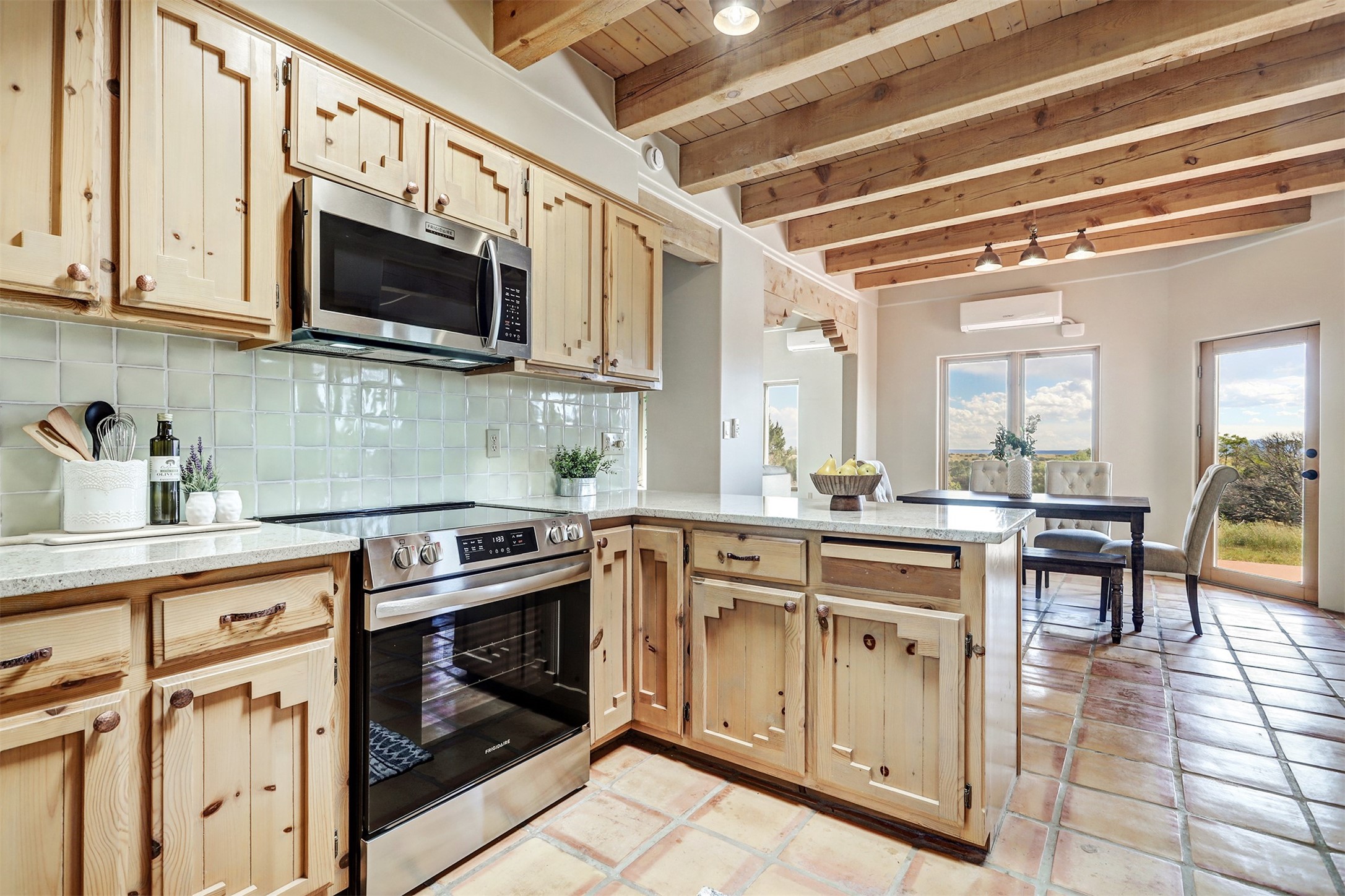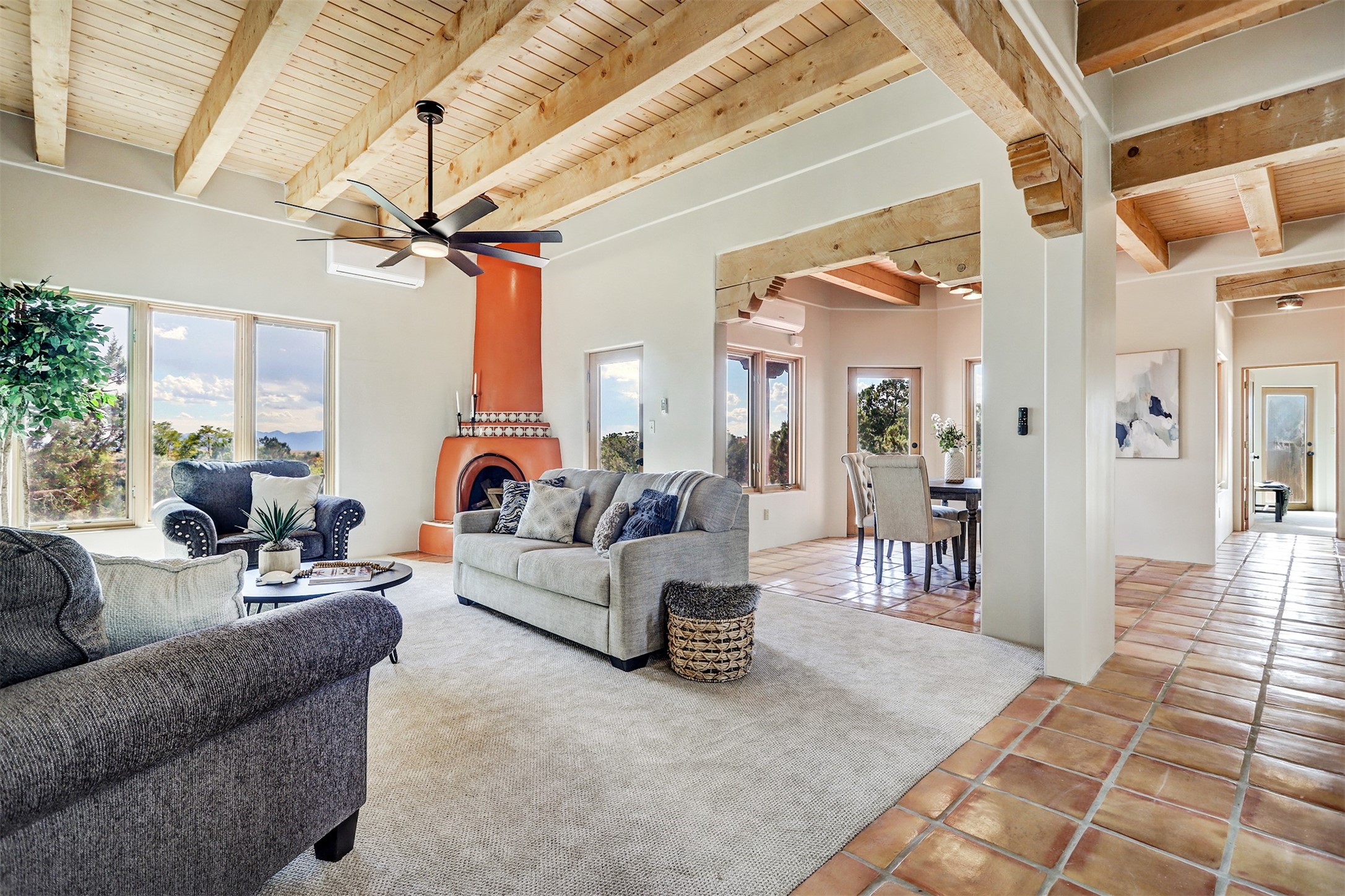 Step into this enchanting single-story home in Eldorado, where timeless Santa Fe character meets thoughtful modern upgrades. From the moment you enter, rich Saltillo tile and a stunning kiva fireplace set the tone, creating warmth and authenticity throughout. Vibrant colors, beautiful light fixtures, wood ceilings, beams, and corbels fill the home with unmistakable Santa Fe charm. The kitchen is truly the heart of the home -- beautifully refreshed with new countertops, a handmade backsplash, and new stainless steel appliances that make cooking a joy. The space itself glows with natural light and character. Additional upgrades include a new TPO roof, fresh stucco, new hot water heater, mini-split system, fresh interior and exterior paint, and plush carpeting in the bedrooms. Every update was made with care, ensuring you can move right in and enjoy. Beyond the home, Eldorado offers a vibrant lifestyle with a wealth of amenities. The Community Center features a swimming pool, tennis and pickleball courts, basketball courts, a playground, and a dog park. Residents enjoy access to hiking and biking paths, a disc golf course, and the Community Preserve. The area hosts a variety of events, including yoga, Tai Chi, and hiking groups, fostering a strong sense of community. Santa Fe's world-class dining, galleries, and festivals are just a short drive away. Beautifully updated and thoughtfully designed, this Eldorado gem is ready to welcome you home.