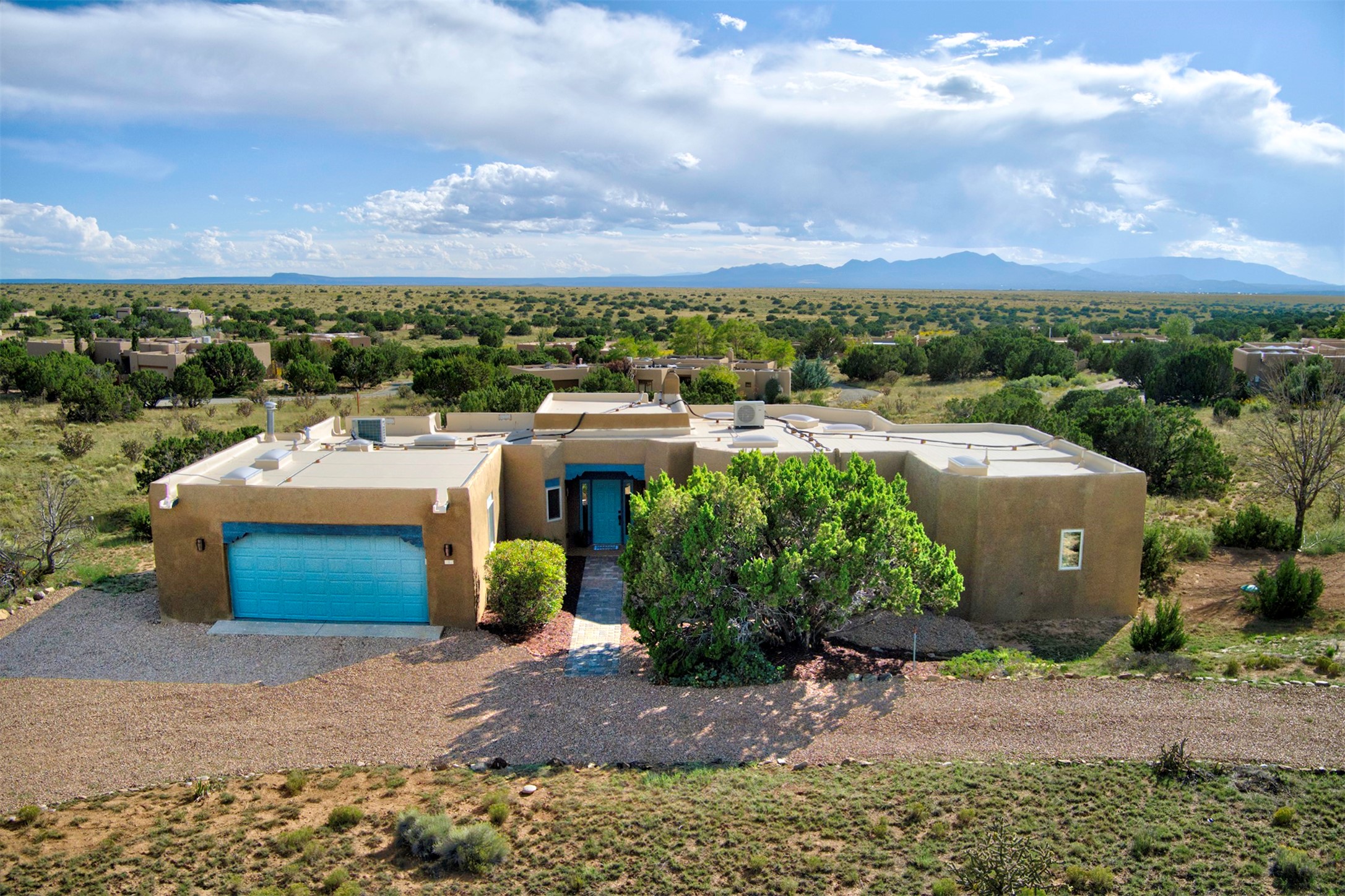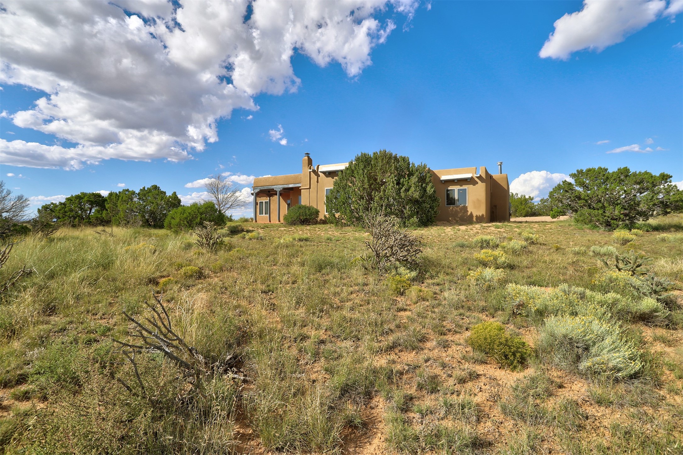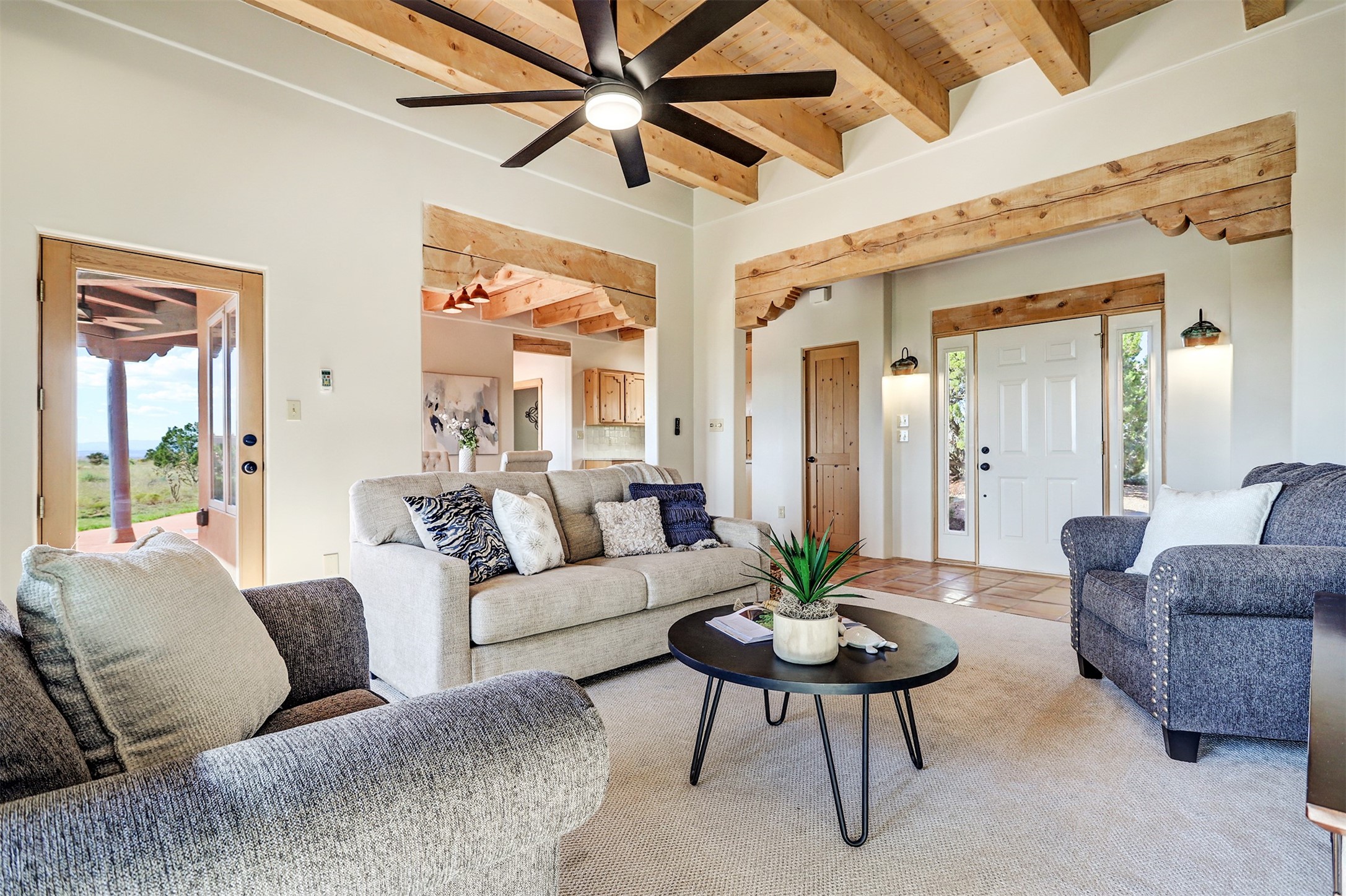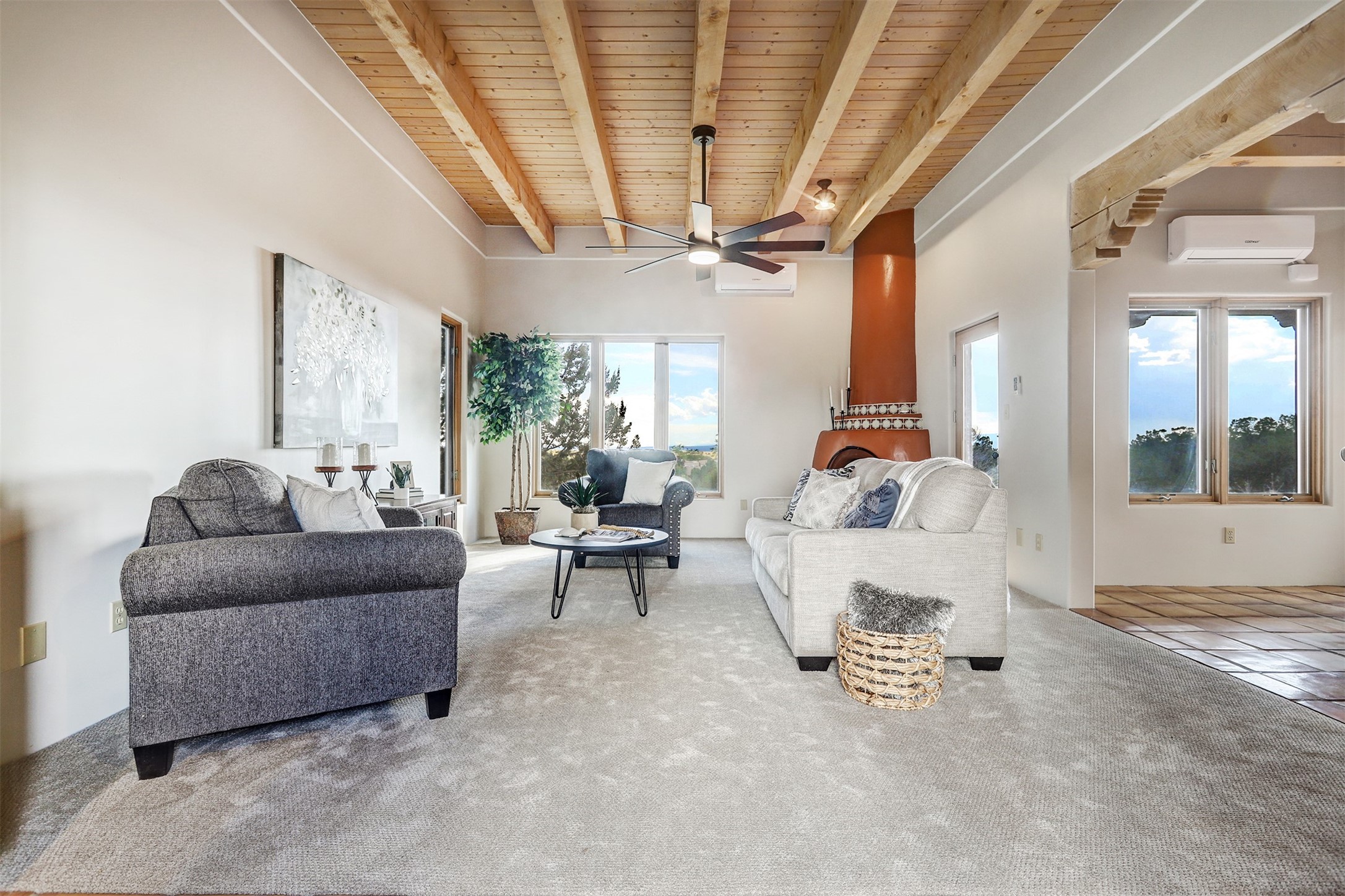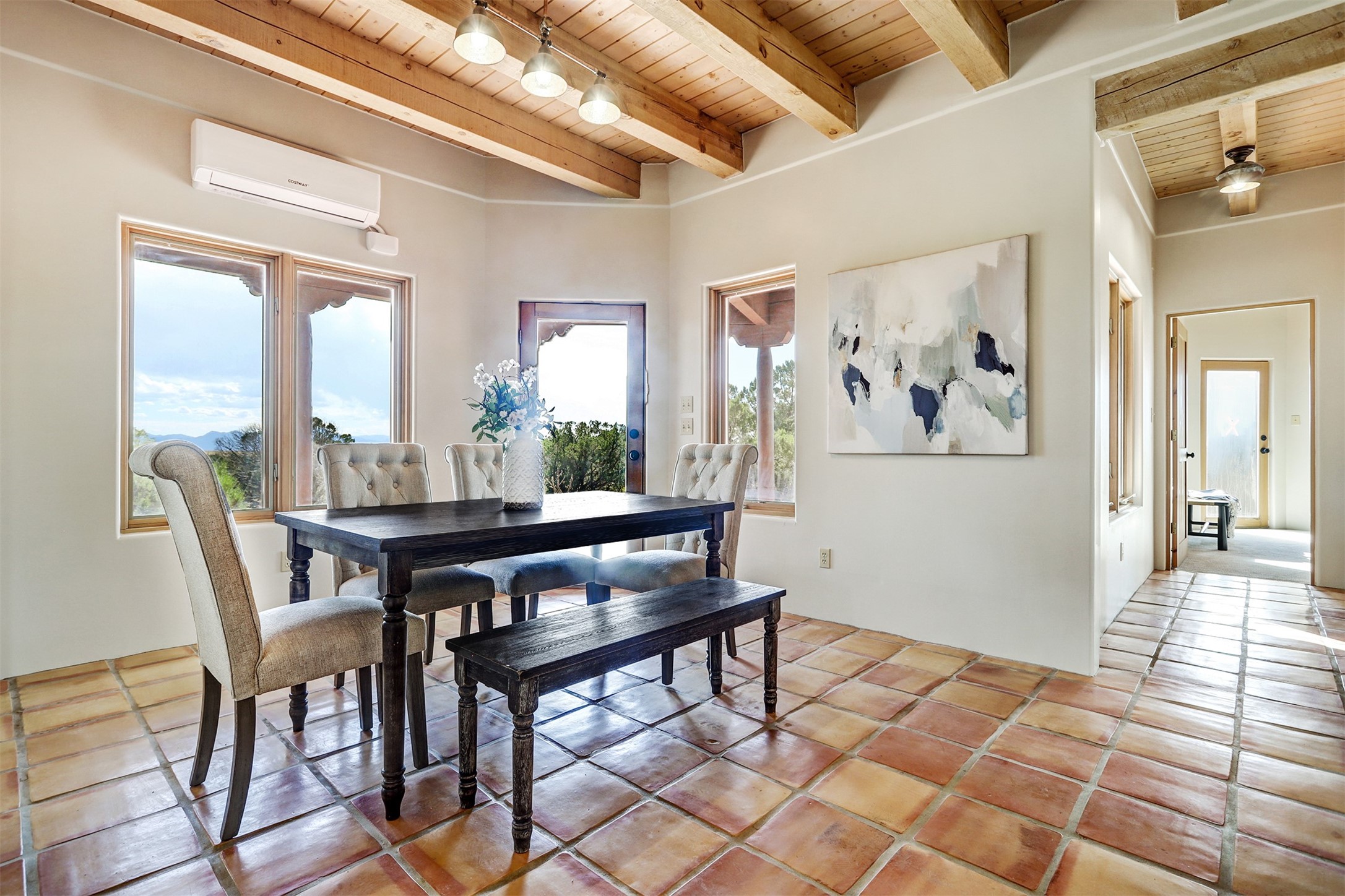 Step into this enchanting single-story home in Eldorado, where timeless Santa Fe character meets thoughtful modern upgrades. From the moment you enter, rich Saltillo tile and a stunning kiva fireplace set the tone, creating warmth and authenticity throughout. Vibrant colors, beautiful light fixtures, wood ceilings, beams, and corbels fill the home with unmistakable Santa Fe charm. The kitchen is truly the heart of the home -- beautifully refreshed with new countertops, a handmade backsplash, and new stainless steel appliances that make cooking a joy. The space itself glows with natural light and character. Additional upgrades include a new TPO roof, fresh stucco, new hot water heater, mini-split system, fresh interior and exterior paint, and plush carpeting in the bedrooms. Every update was made with care, ensuring you can move right in and enjoy. Beyond the home, Eldorado offers a vibrant lifestyle with a wealth of amenities. The Community Center features a swimming pool, tennis and pickleball courts, basketball courts, a playground, and a dog park. Residents enjoy access to hiking and biking paths, a disc golf course, and the Community Preserve. The area hosts a variety of events, including yoga, Tai Chi, and hiking groups, fostering a strong sense of community. Santa Fe's world-class dining, galleries, and festivals are just a short drive away. Beautifully updated and thoughtfully designed, this Eldorado gem is ready to welcome you home.