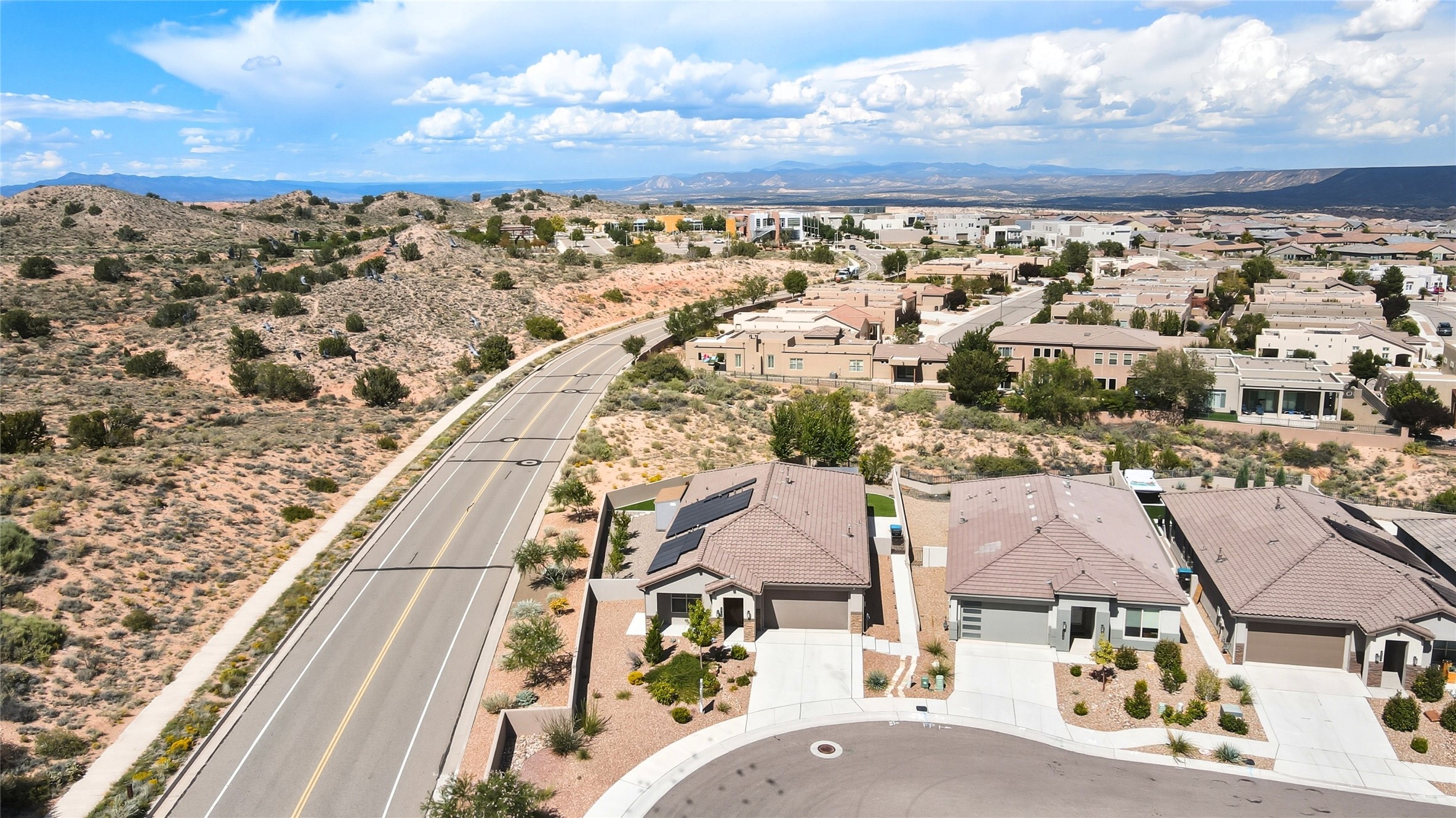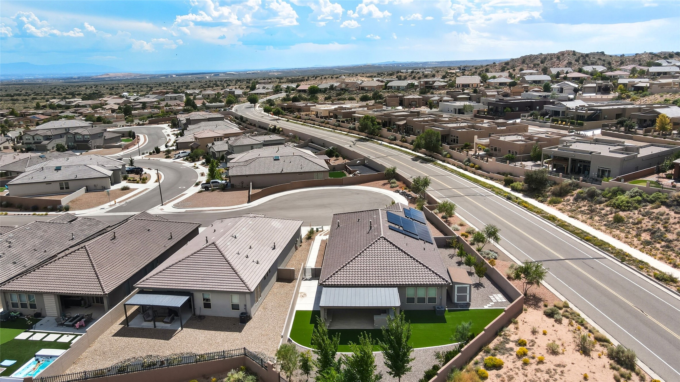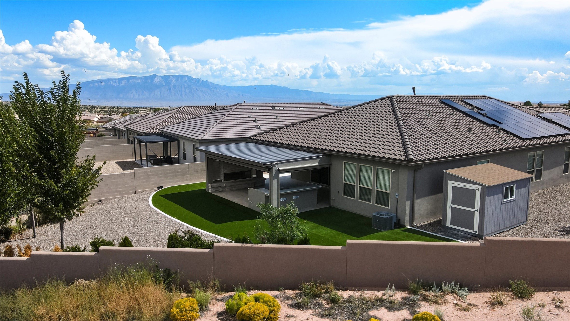 Discover luxury and comfort in this stunning single-story Hakes Brothers home tucked away at the end of a cul-de-sac. Just 3 minutes to Unser and under 20 minutes to I-25, this 4-bedroom, 2-bathroom home offers both convenience and elegance. The community features a park, pool, and outdoor water feature, with the fire department only 2 minutes away. The exterior showcases stacked stone accents and a custom metal entry gate. Inside, soaring 7-foot doors and an open floor plan set the tone. The gourmet kitchen includes a walk-in pantry, gas cook top, large island, and flows seamlessly into the living area, while the split primary suite ensures privacy. Step outside to your backyard retreat on a nearly -acre lot with no rear neighbors. Enjoy a large covered patio designed for entertaining with a built-in griddle, 5' gas fireplace, oversized 80'' fan, and a fully automated commercial-grade screen system that blocks sun and wind for year-round comfort and privacy. Additional features include a 220-volt EV outlet in the garage, a fully paid-off solar system, and over $160,000 in custom upgrades that make this home stand out. At only 3 years old, this home truly has it all! Schedule your walk through today!!!