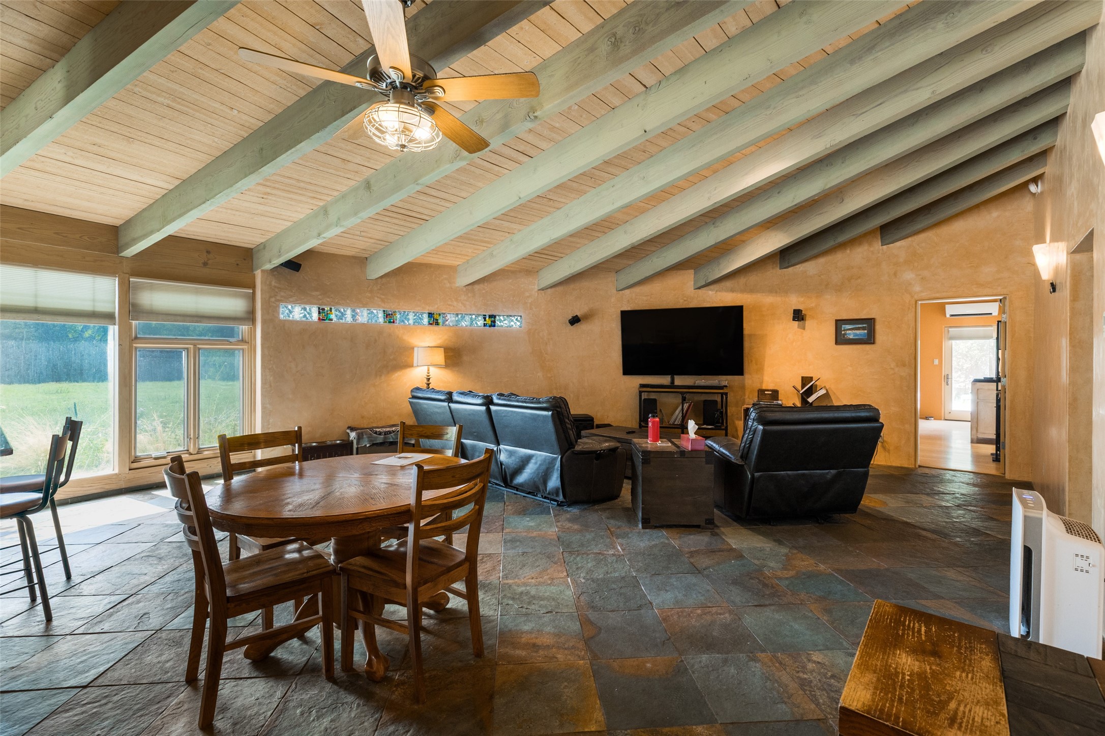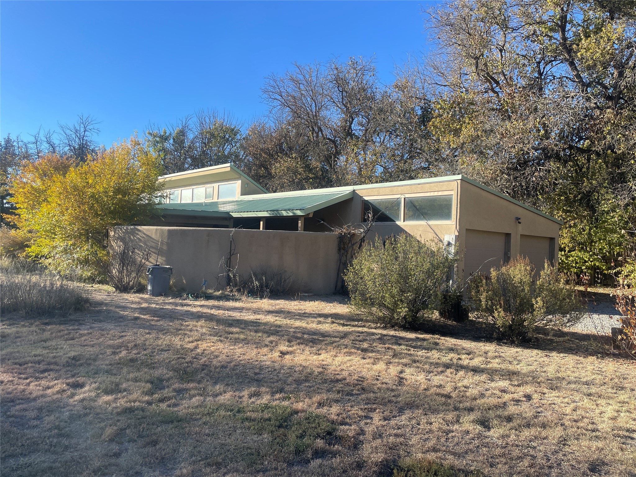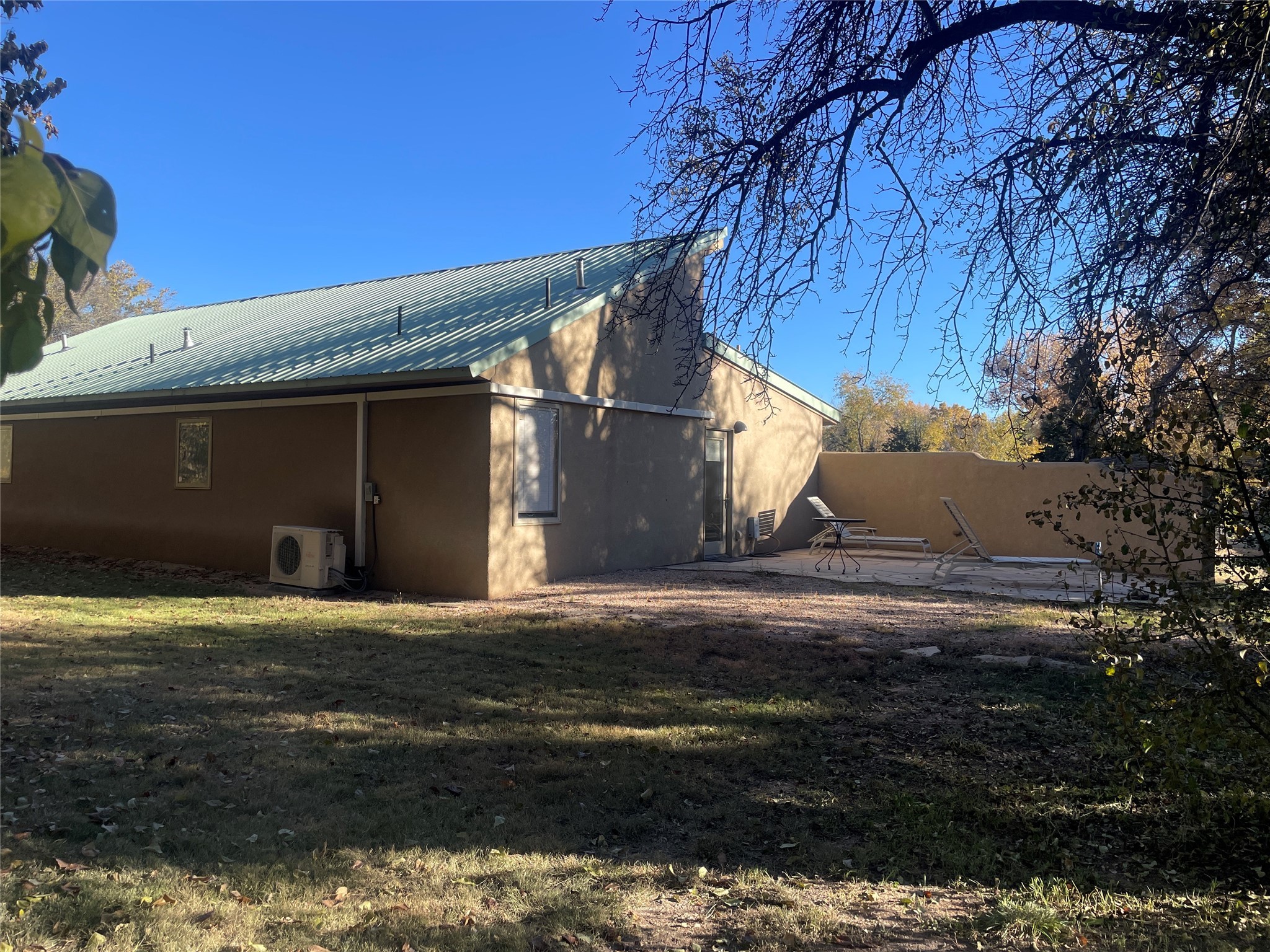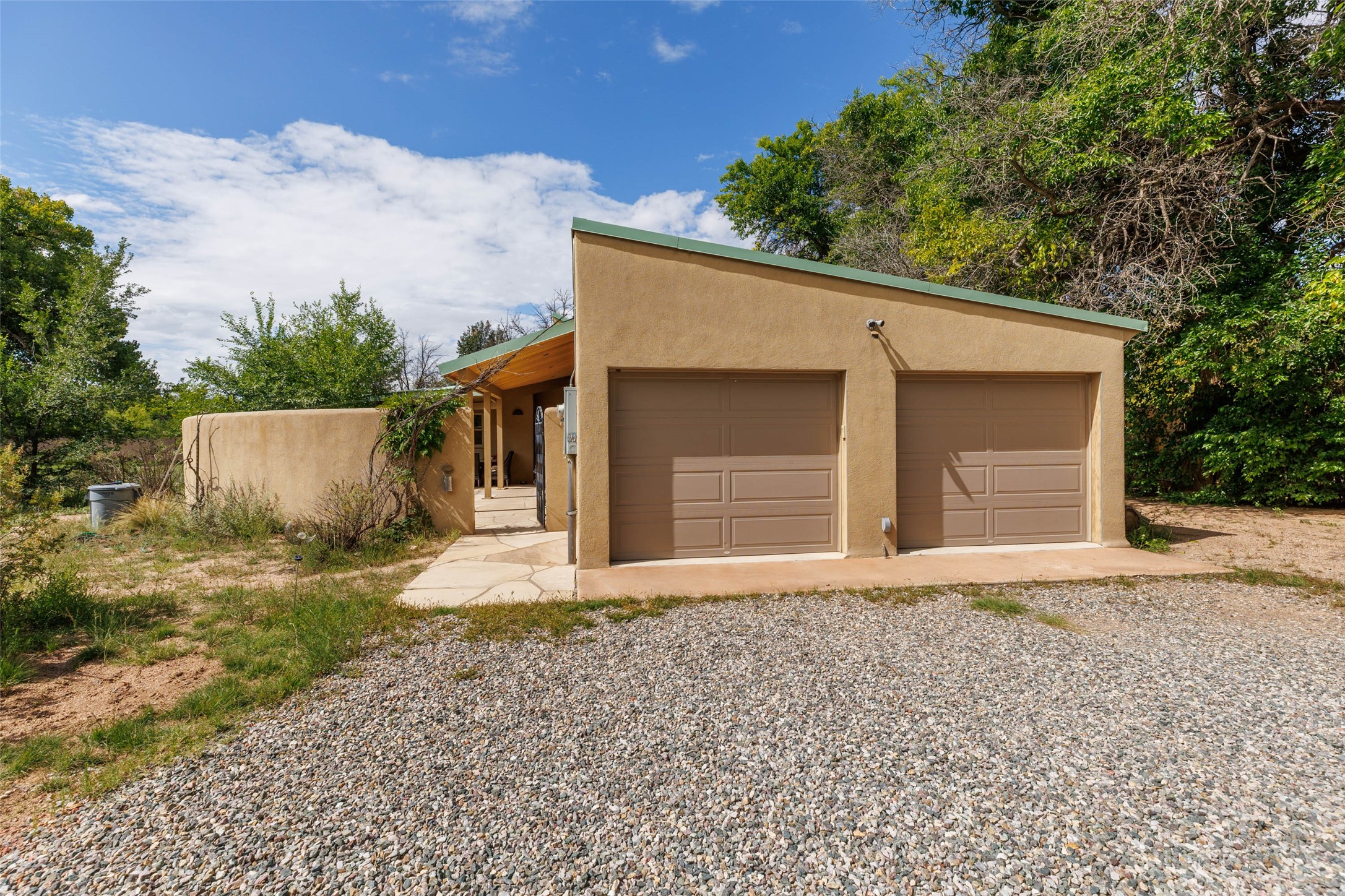 Located within the Nambe/Pojoaque greenbelt, this unique property sits on over an acre of land w/ WATER RIGHTS & a valve for flood irrigation. Enjoy mature cottonwoods, Osage orange, apple, apricot, & pear trees in a lush, meadow-like setting. The Trombe wall in the living area & bedroom utilizes passive solar principles! Other features include radiant floor heat, mini splits, a durable metal roof, bamboo & slate tile flooring, granite countertops, & wood-beamed ceilings. The open kitchen flows seamlessly into the great room, while the primary suite includes a huge walk-in closet & private patio. Use the 840 sq ft (80 ft X 21ft) heated garage space to park up to four cars or to create a unique studio or flex area. Don't miss this opportunity!