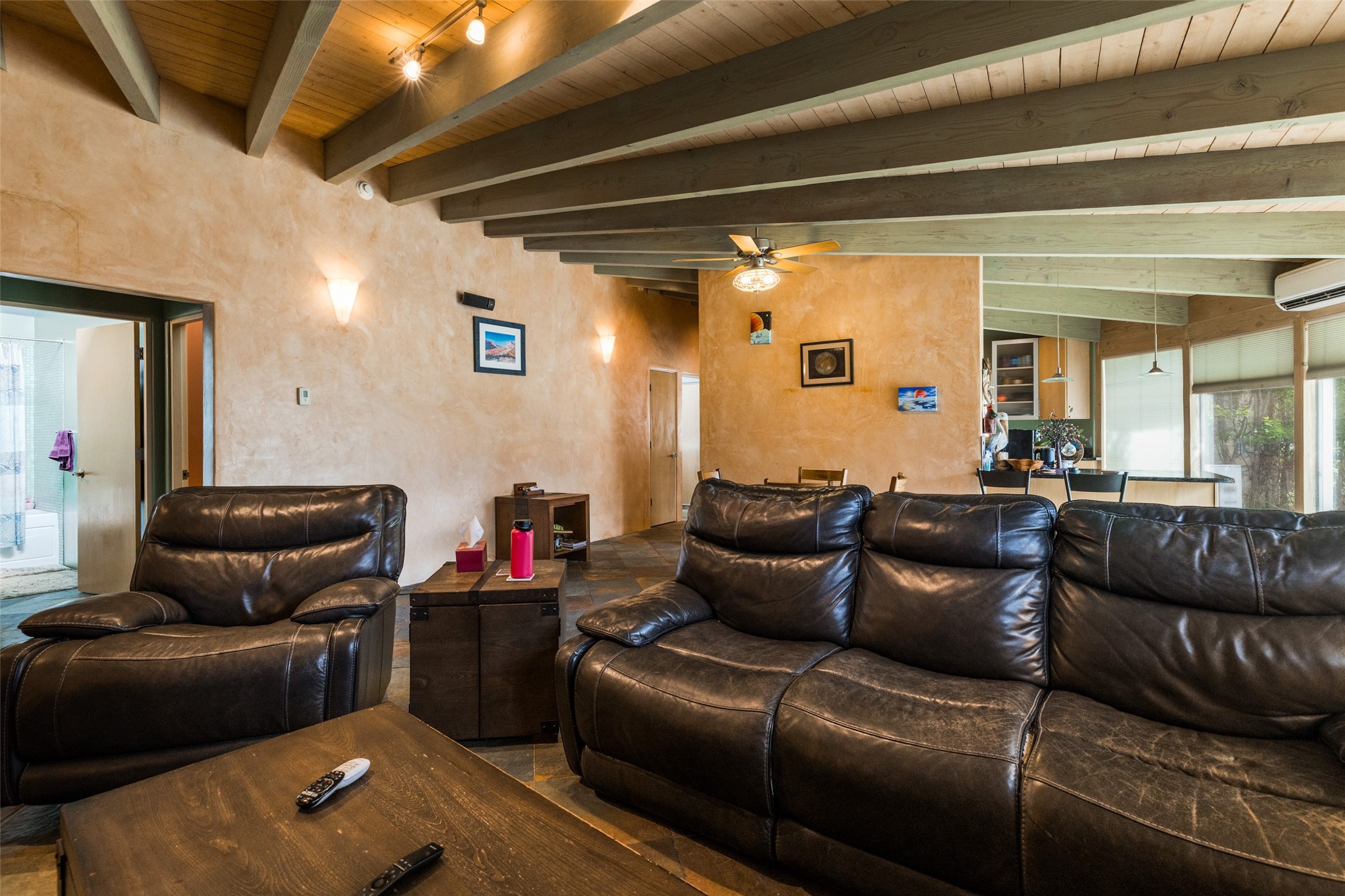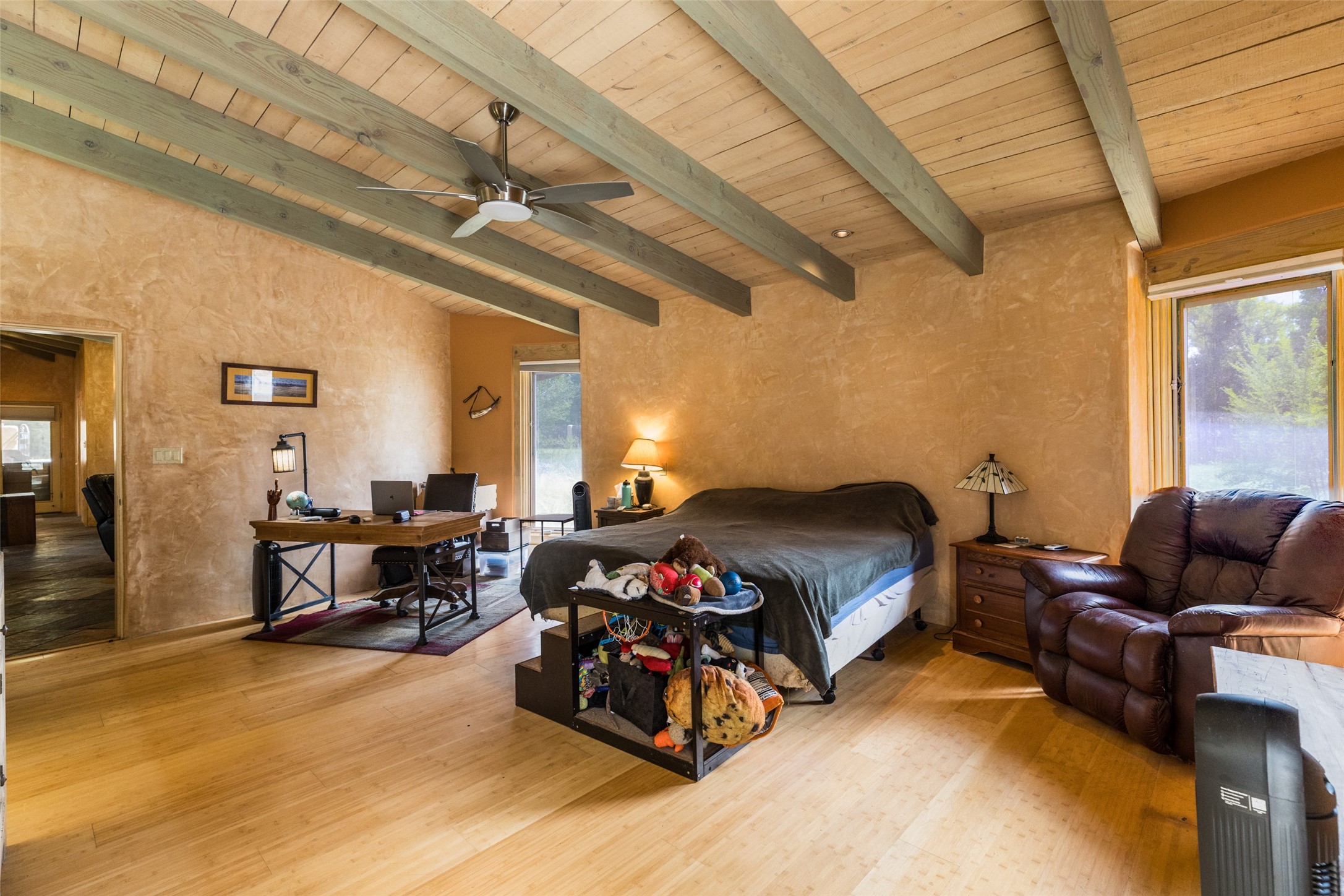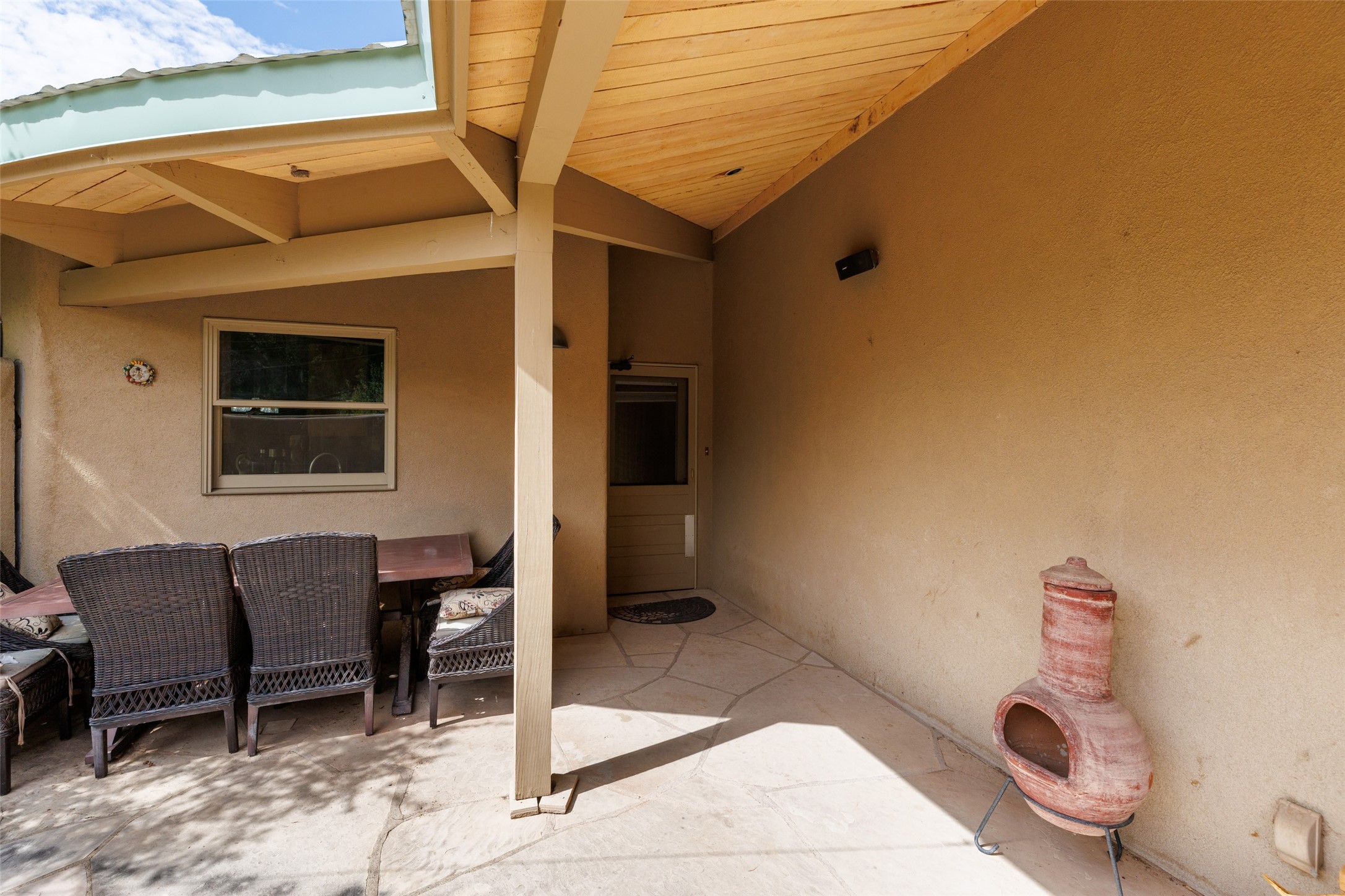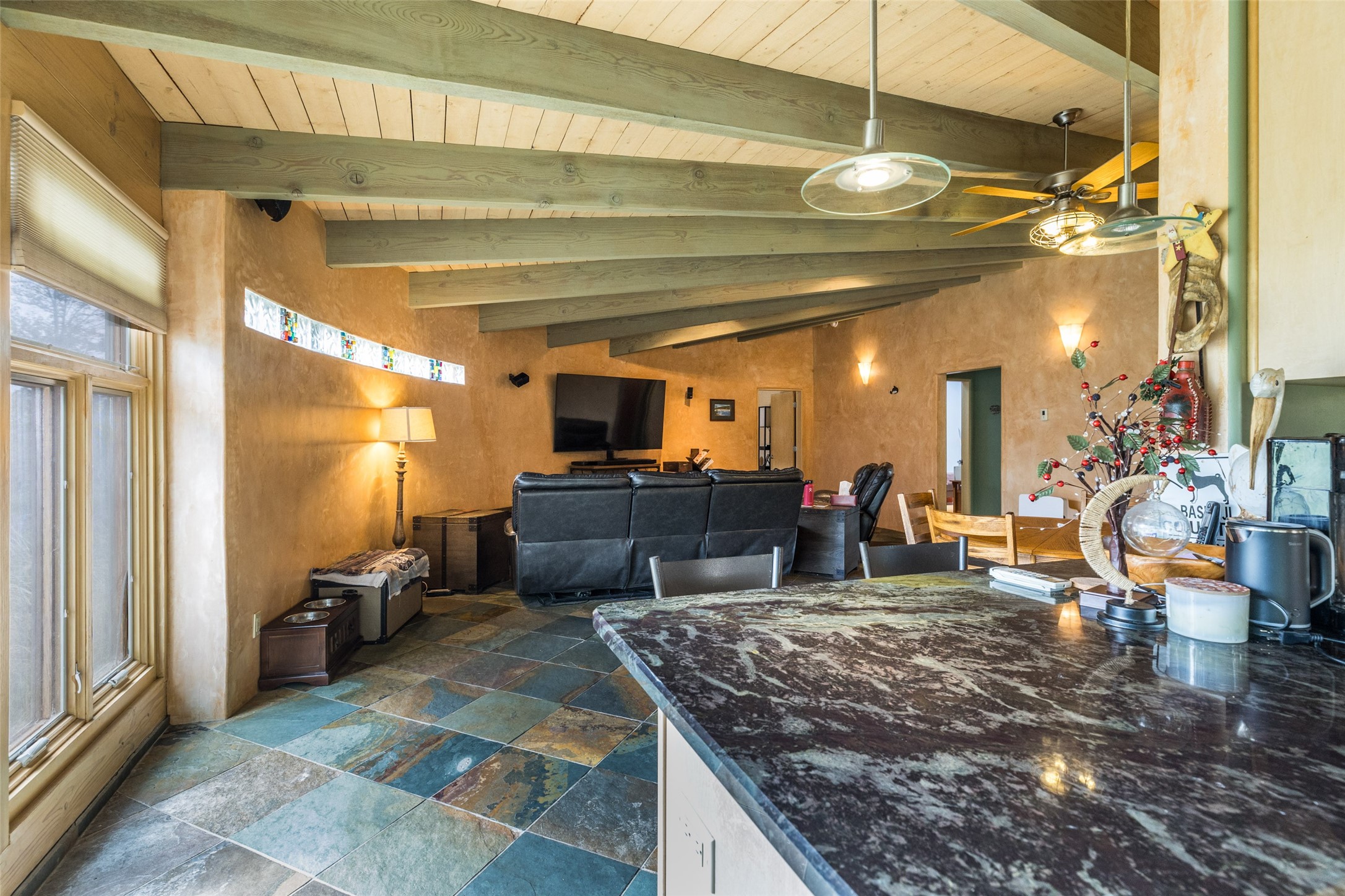 Located within the Nambe/Pojoaque greenbelt, this unique property sits on over an acre of land w/ WATER RIGHTS & a valve for flood irrigation. Enjoy mature cottonwoods, Osage orange, apple, apricot, & pear trees in a lush, meadow-like setting. The Trombe wall in the living area & bedroom utilizes passive solar principles! Other features include radiant floor heat, mini splits, a durable metal roof, bamboo & slate tile flooring, granite countertops, & wood-beamed ceilings. The open kitchen flows seamlessly into the great room, while the primary suite includes a huge walk-in closet & private patio. Use the 840 sq ft (80 ft X 21ft) heated garage space to park up to four cars or to create a unique studio or flex area. Don't miss this opportunity!