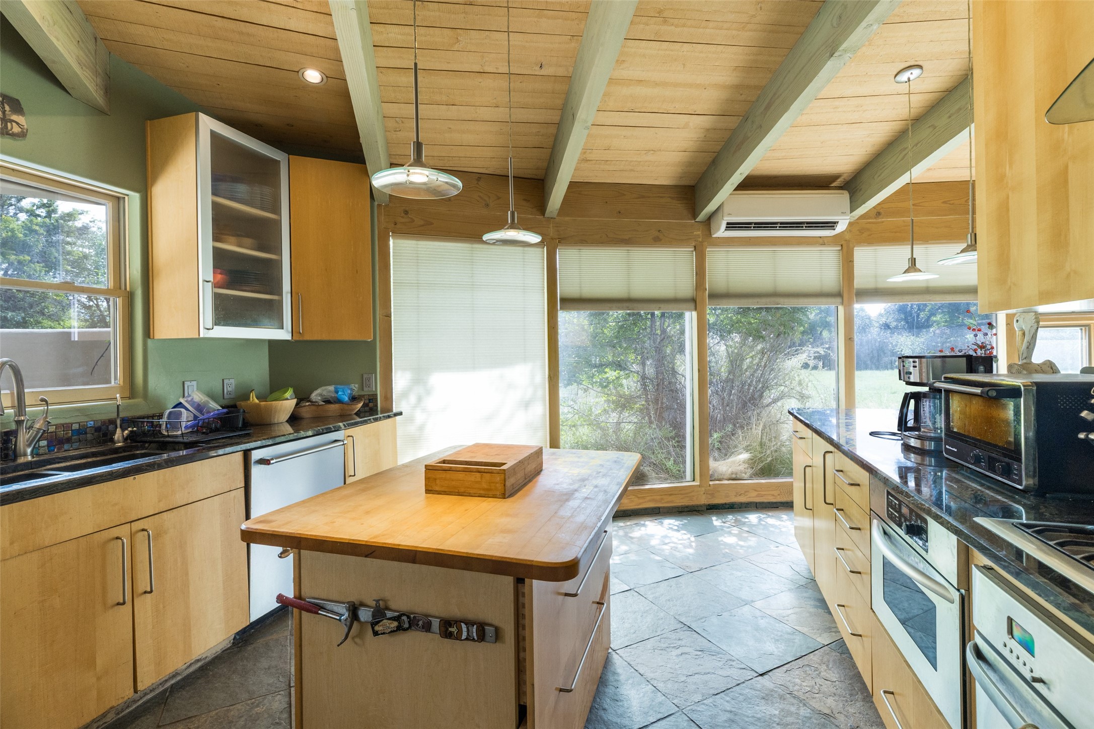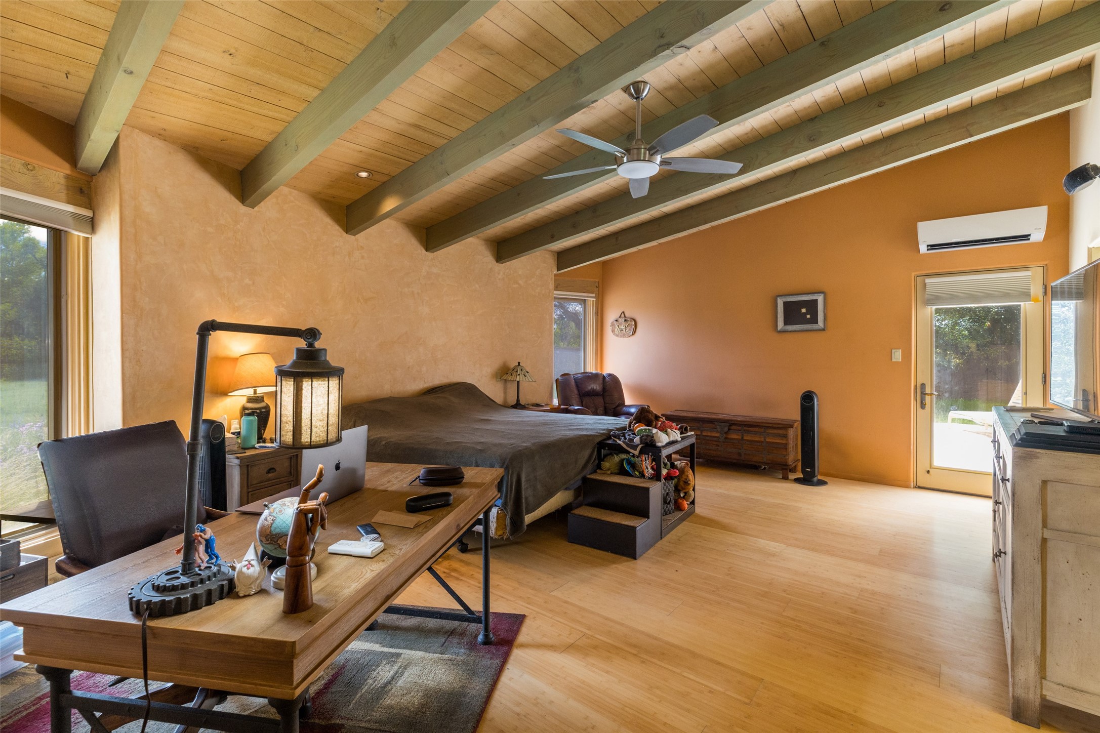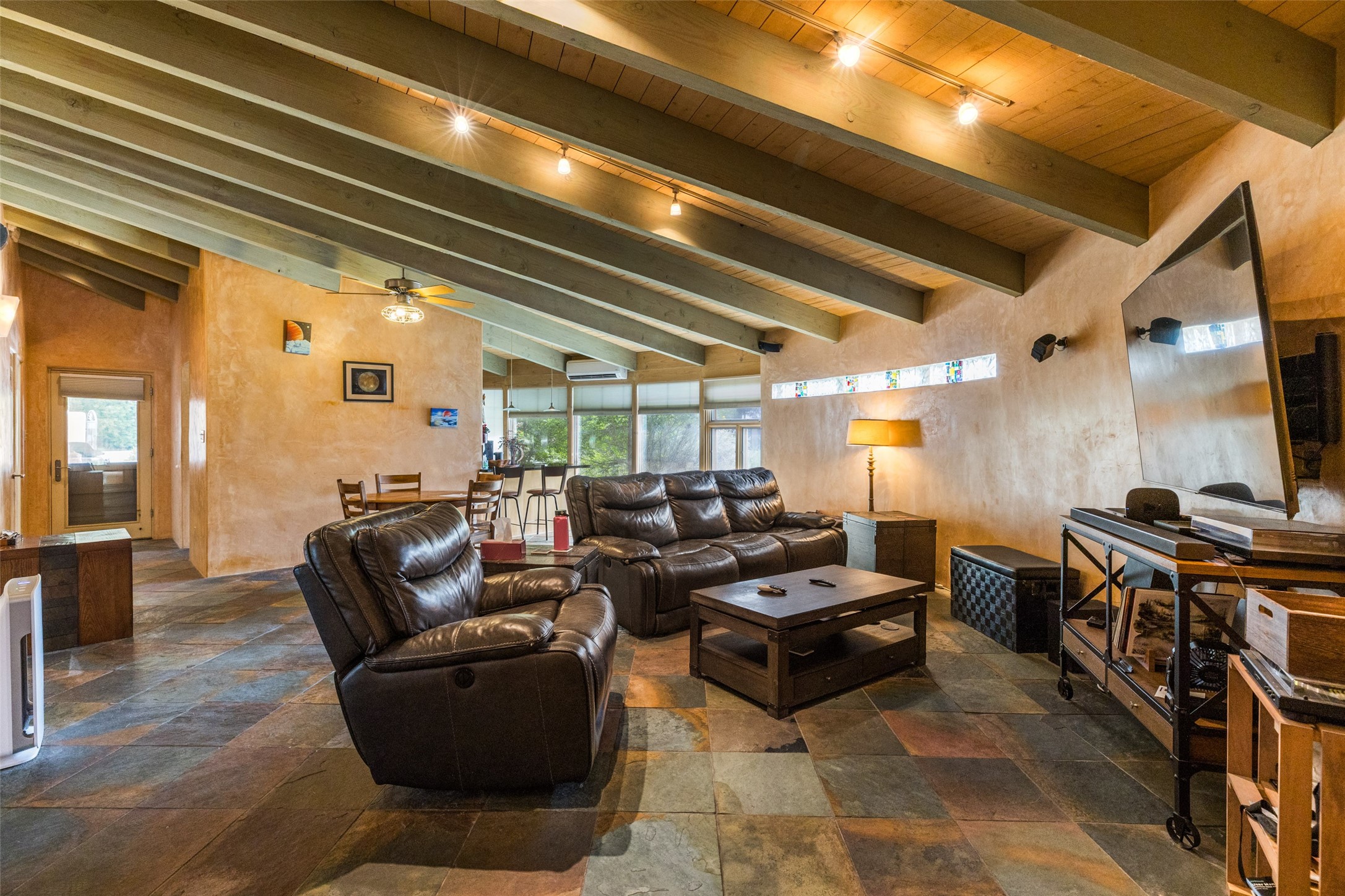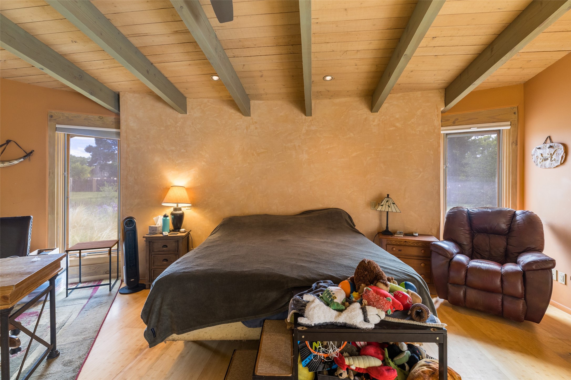 Located within the Nambe/Pojoaque greenbelt, this unique property sits on over an acre of land w/ WATER RIGHTS & a valve for flood irrigation. Enjoy mature cottonwoods, Osage orange, apple, apricot, & pear trees in a lush, meadow-like setting. The Trombe wall in the living area & bedroom utilizes passive solar principles! Other features include radiant floor heat, mini splits, a durable metal roof, bamboo & slate tile flooring, granite countertops, & wood-beamed ceilings. The open kitchen flows seamlessly into the great room, while the primary suite includes a huge walk-in closet & private patio. Use the 840 sq ft (80 ft X 21ft) heated garage space to park up to four cars or to create a unique studio or flex area. Don't miss this opportunity!