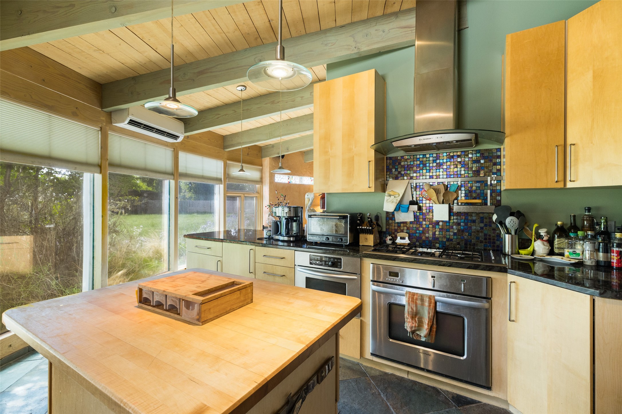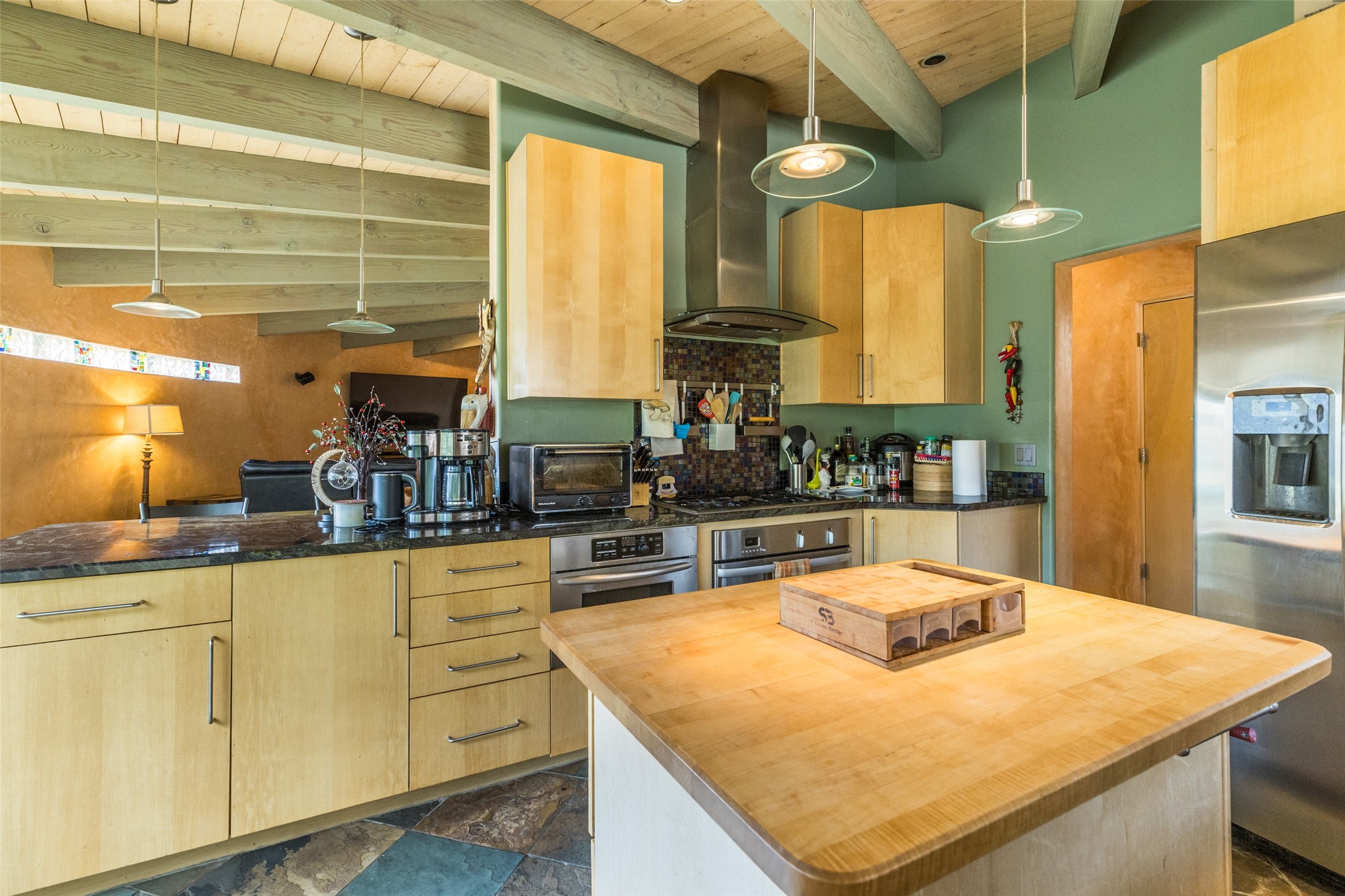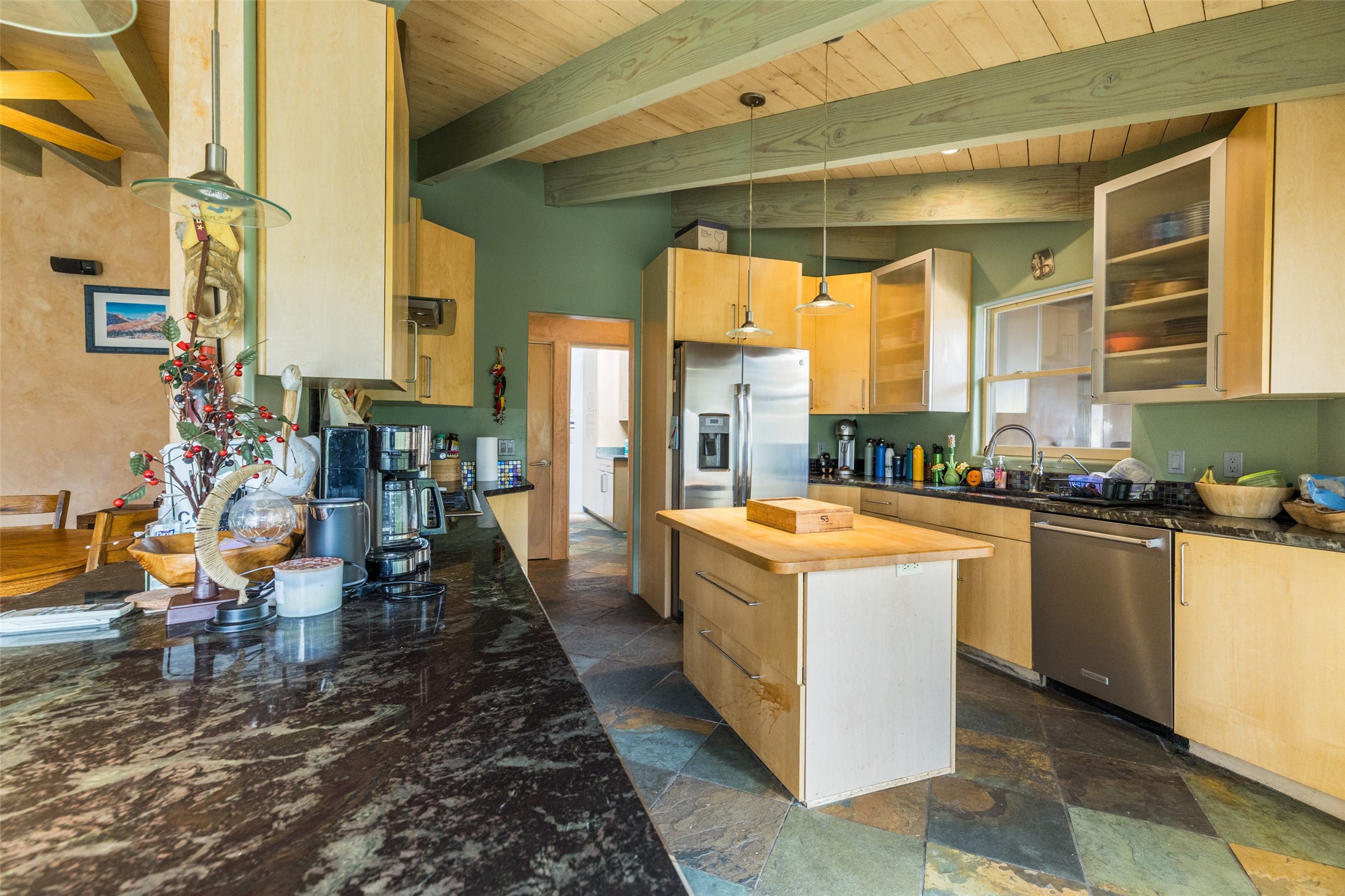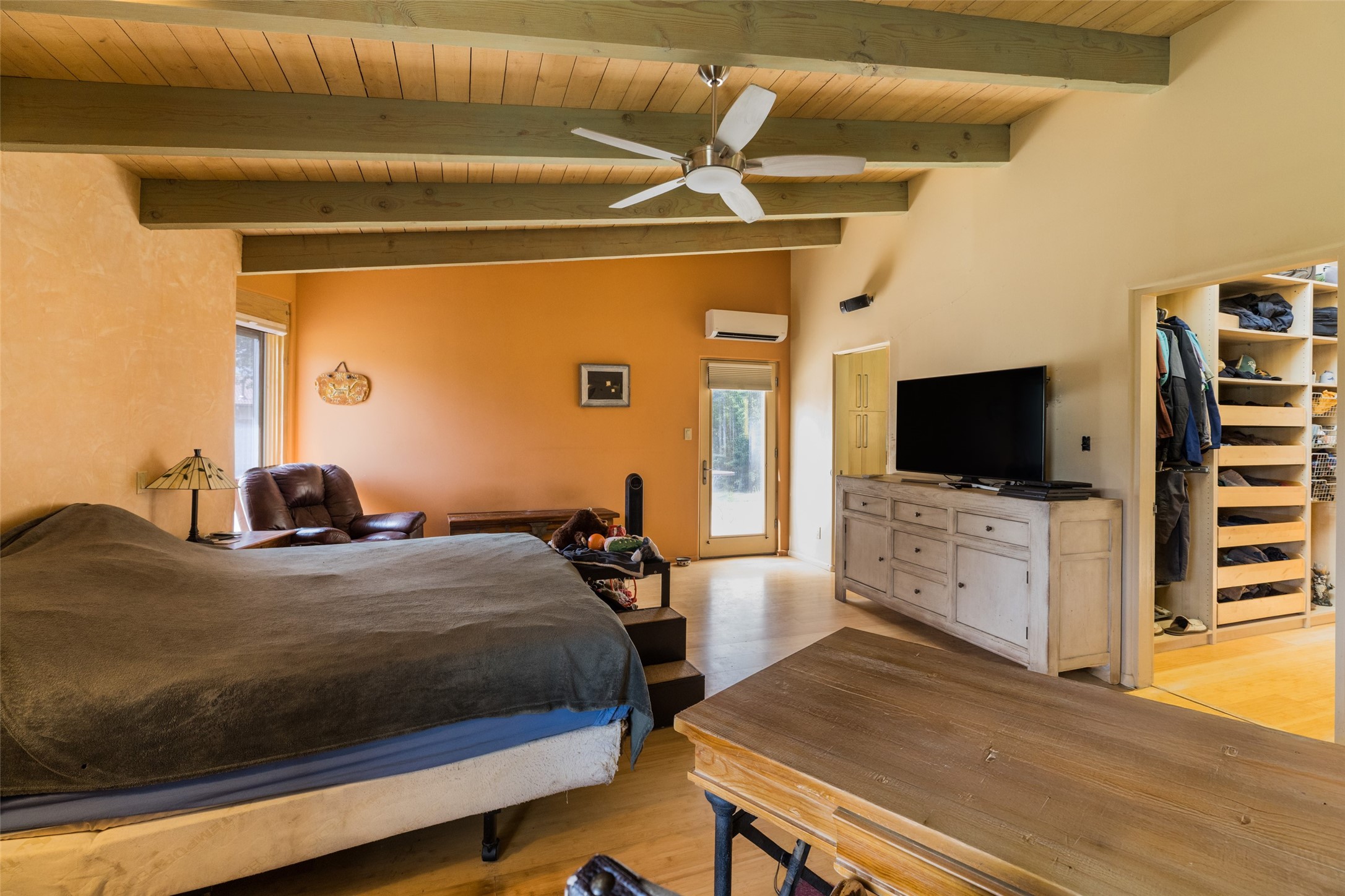 Located within the Nambe/Pojoaque greenbelt, this unique property sits on over an acre of land w/ WATER RIGHTS & a valve for flood irrigation. Enjoy mature cottonwoods, Osage orange, apple, apricot, & pear trees in a lush, meadow-like setting. The Trombe wall in the living area & bedroom utilizes passive solar principles! Other features include radiant floor heat, mini splits, a durable metal roof, bamboo & slate tile flooring, granite countertops, & wood-beamed ceilings. The open kitchen flows seamlessly into the great room, while the primary suite includes a huge walk-in closet & private patio. Use the 840 sq ft (80 ft X 21ft) heated garage space to park up to four cars or to create a unique studio or flex area. Don't miss this opportunity!