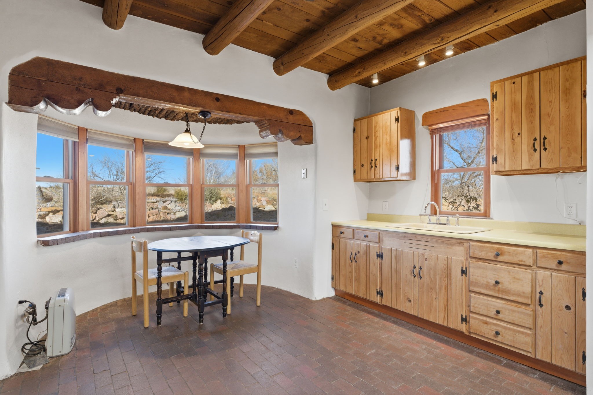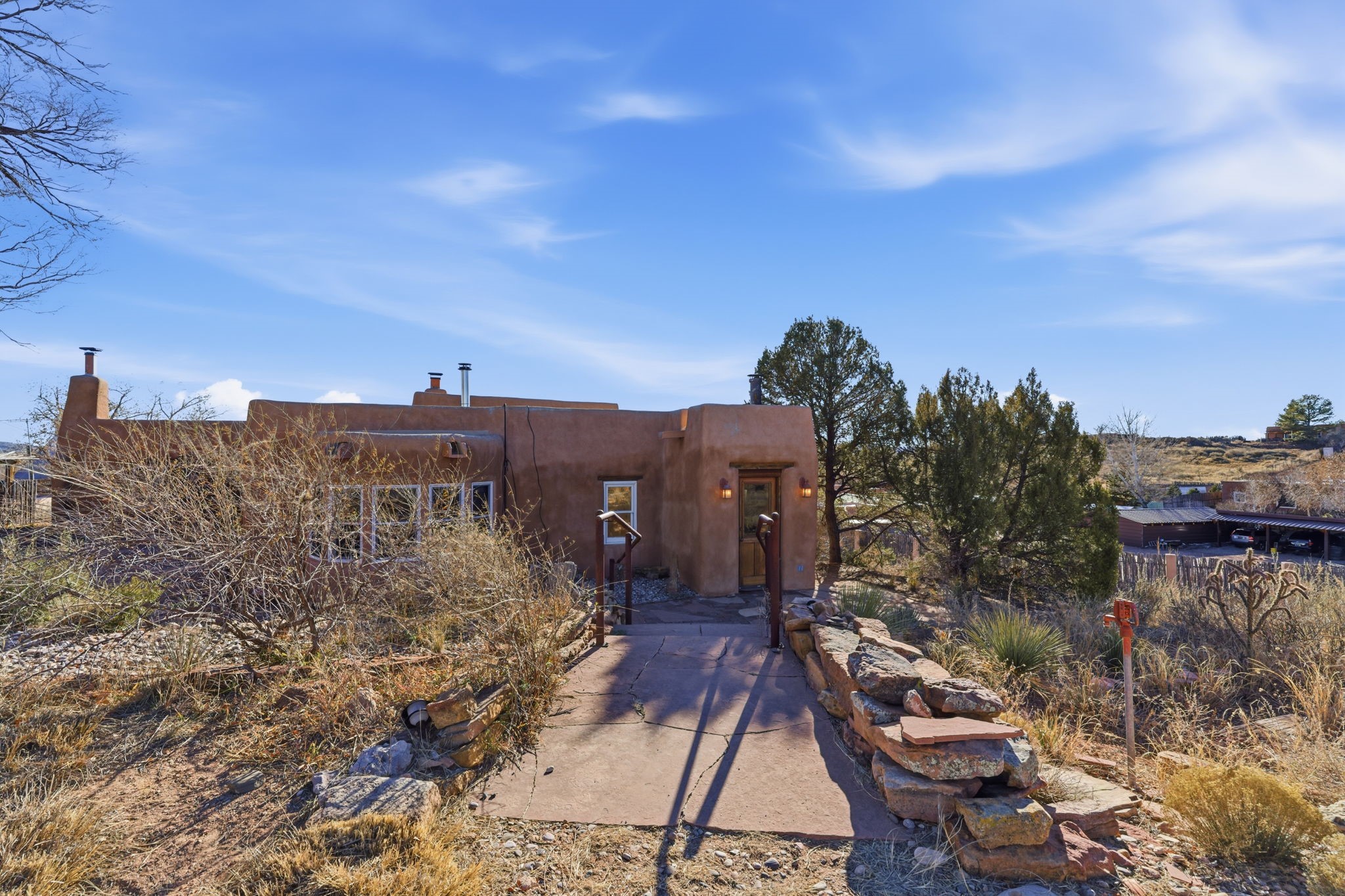 Experience life in the historic village of Galisteo! This authentic adobe construction 2-bedroom, 2-bathroom home has a classic Santa Fe feel, with kiva fireplaces, vigas, and all of the "old school" charm. This property also offers a 448 sq. ft, detached studio with electricity - perfect for artists or hobbyists. Overlooking the village church originally built in 1884, this home is perched just above the town of Galisteo, perfectly situated to take advantage of proximity to the village, but also beautiful pastoral views. As soon as you step into the front door, you are greeted by brick floors, thick vigas, and beautiful organic curves. The living room and dining room have high ceilings and views that look out onto the village. The eat-in kitchen will have you relaxing in soft morning light with a wood stove and a cozy nook. A sensible split floorplan showcases two bedrooms on opposite sides of the home. Each bedroom has its own bathroom. The second bedroom even has its own exterior entrance, ideal for guests or family members that might come to visit. Recent upgrades include a new bathroom vanity and toilet, a roof maintenance, and stucco and canale maintenance. Santa Fe is less than 30 minutes away, and shopping and dining are 15 minutes away in Eldorado. Enjoy studio tours and concerts in the creative hub of Galisteo, and hike, bike or ride your horse on over 48 miles of trails in the nearby Galisteo Basin Preserve. This home offers a tranquil lifestyle with lots of character and southwestern charm. Don't miss out on this charmer! Schedule a showing today!