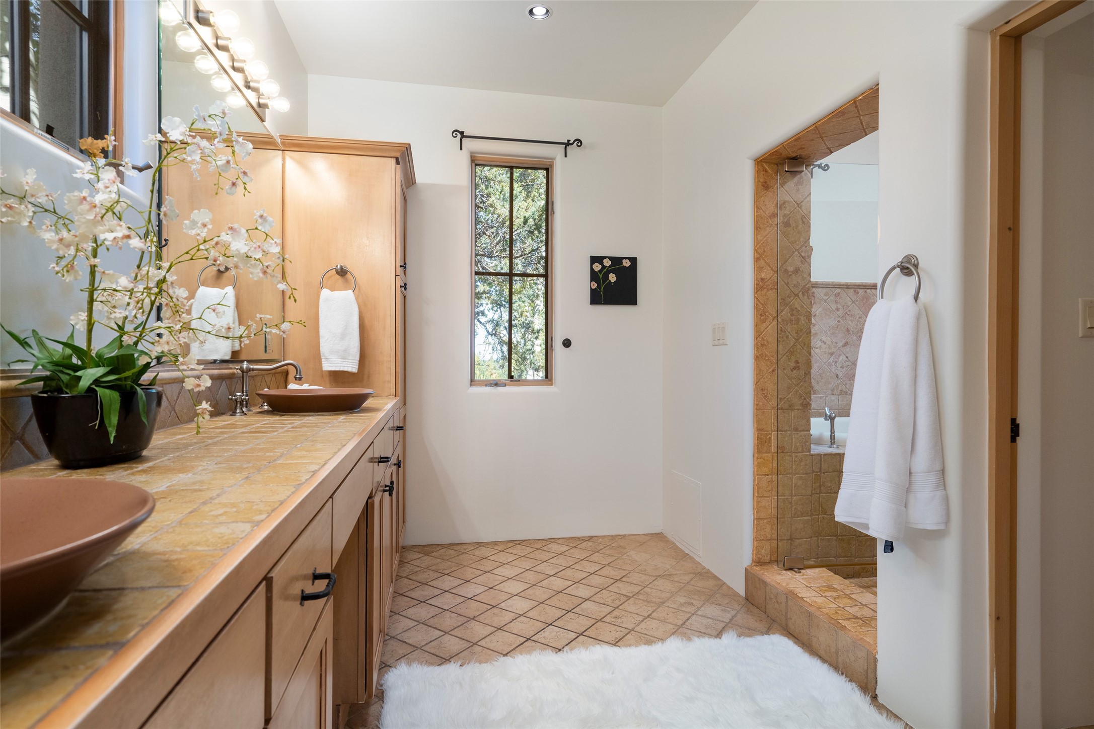 SERENE & PRIVATE SANTA FE ESTATE. Nestled on over 2 acres in one of Santa Fe's premier communities, this 4 bedroom, 4.5 bath home offers an elegant blend of scale and comfort. Thoughtfully designed for both grand entertaining and easy day-to-day living. A light filled great room with a fireplace anchors the home, while patios off nearly every room invite seamless indoor/outdoor living. The recently remodeled kitchen will delight culinary enthusiasts, and a finished office space - converted from one of the 3 garage bays - adds flexibility for today's lifestyle. The private guest addition features its own living room and en-suite, complemented by two additional guest suites each with private baths. Outdoors, a long driveway leads to two lush courtyards filled with grass flowers, trees, and shrubs, Multiple apple trees and two tranquil water features enhance the serene setting. Despite its generous footprint, the home maintains a warm, welcoming feel, filled with natural light and surrounded by native landscaping for privacy. Just minutes from downtown Santa Fe and with easy highway access, this property offers the best of Southwestern living - spacious, secluded, and perfectly situated. *This home is being sold as-is, where is*