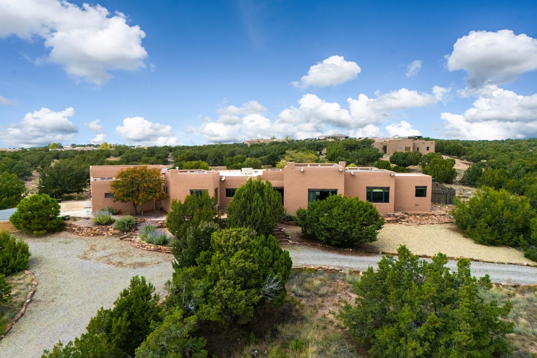 Experience classic Santa Fe style and modern livability in this 3,486 sq ft single-level (no steps!) Pueblo Revival home on 2.86 acres, built in 2005, and just 13 minutes from the Plaza. Designed for comfort and entertaining, the residence offers high ceilings and diamond plaster walls throughout, 3 spacious en-suite bedrooms and 5 bathrooms, including a luxurious primary suite with a generous flex space ideal for an office/gym, a large walk-in closet, and French doors leading to a portal. The ADA-compliant front entry to the house and primary bathroom shower provide accessibility without compromising style. The great room features soaring coved viga ceilings and opens through French doors to a covered rear portal with kiva fireplace, sunshade, and landscaped privacy wall -- a perfect space for outdoor entertaining. The kitchen offers abundant wood cabinetry, extensive granite countertops, a large island with a second sink, and a built-in desk area. The kitchen extends to a bonus space with a kiva fireplace for dining and gathering. A spacious laundry room with sink and cabinetry opens to a side yard with an established herb garden. Throughout the home, authentic Southwestern details such as nichos, banco seating, travertine tile floors, skylights, corbels, and four wood-burning kiva fireplaces (including one outdoors) create timeless character. In-floor radiant heating, and evaporative cooling enhance everyday comfort. Additional highlights include a large 3-car heated garage with an RV bay and a versatile workshop or studio space, ample parking, central vacuum, and a rock fountain surrounded by a native plant garden and flagstone walkways. Full re-stucco on house and rear privacy wall in 2023. Partial (approx. ) TPO roof replacement in 2023. With panoramic Sangre de Cristo mtn views, La Tierra's extensive trail system just a short walk away, and no HOA, this property offers the perfect blend of privacy, natural beauty, and proximity to Santa Fe's vibrant heart.