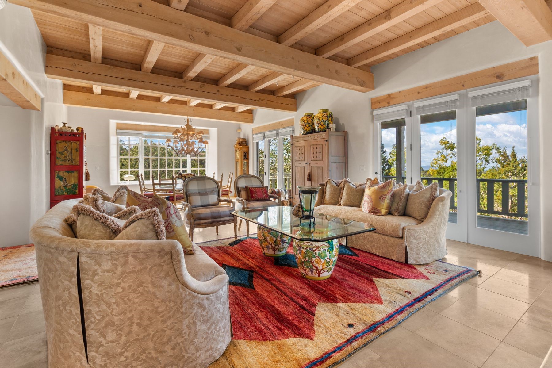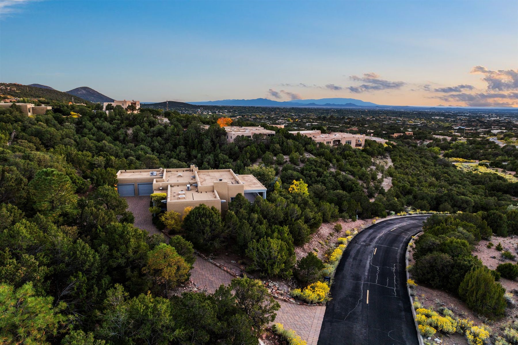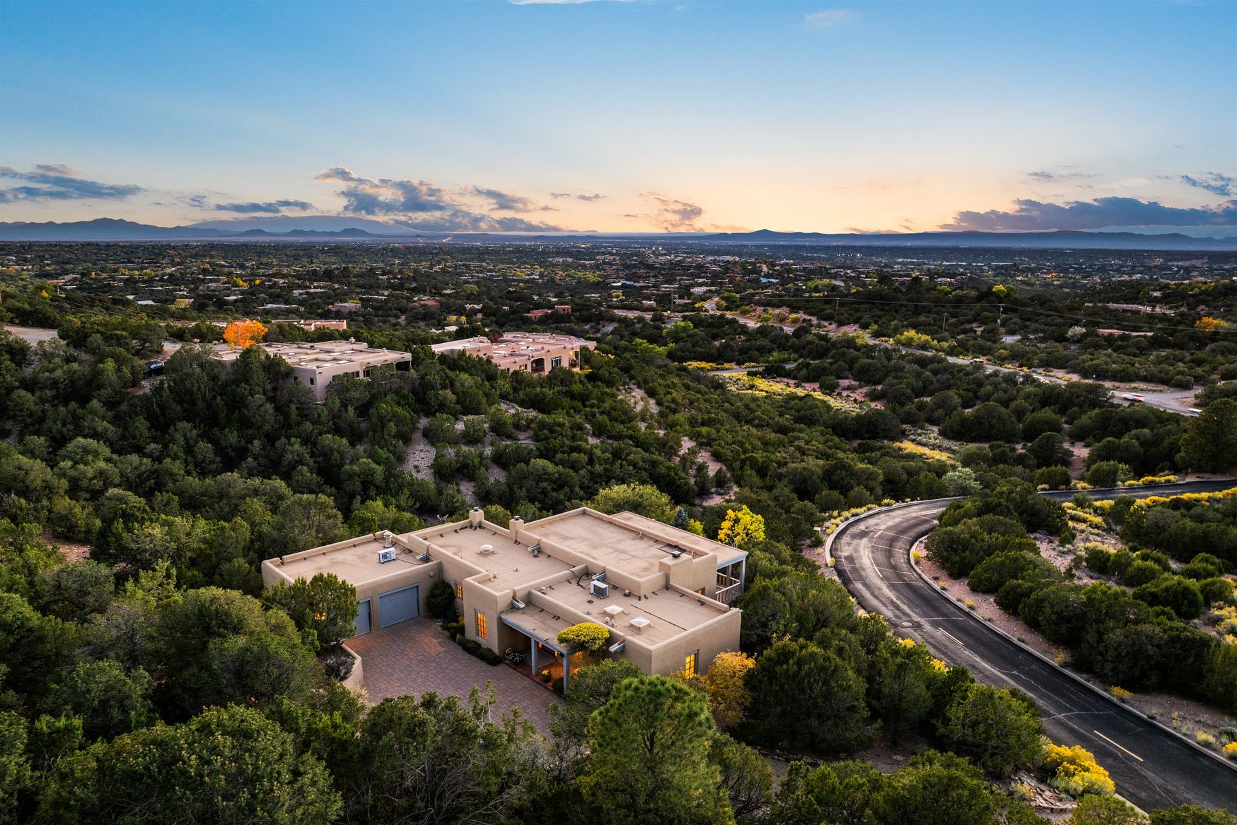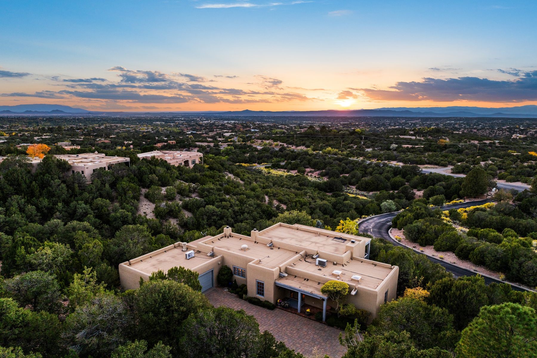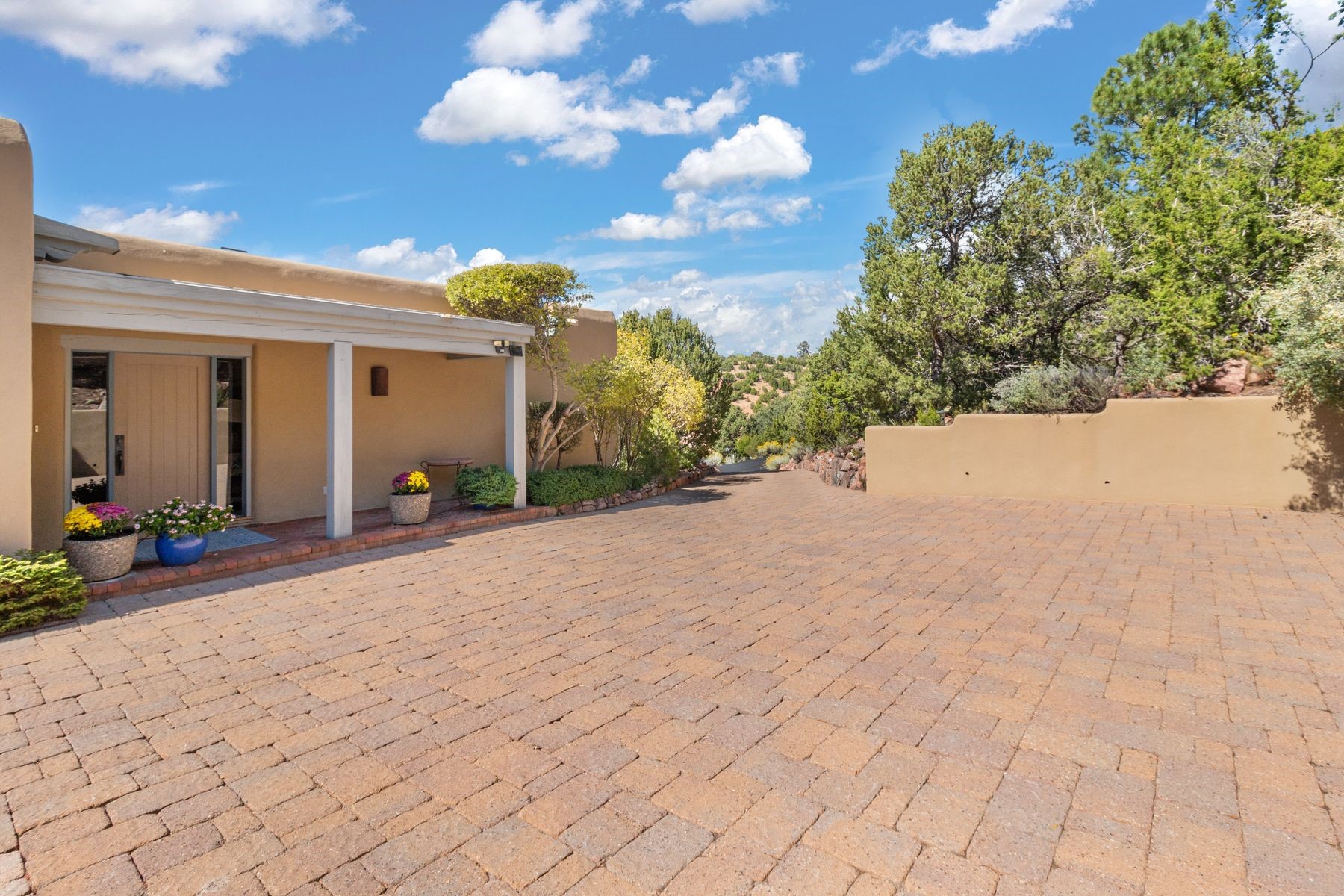 Nestled in a private gated neighborhood just five minutes from Canyon Road, this stunning 3-bedroom, 3-bath residence captures the essence of Santa Fe living with breathtaking views and refined details throughout.Arrive via a paver-lined driveway leading to a spacious two-car garage and be welcomed into a home built for both comfort and sophistication. Inside, French limestone imported from Forte dei Marmi flows seamlessly throughout, complemented by exquisite diamond finished plaster walls that add depth, texture, and timeless elegance. The expansive floor plan opens to over 800 square feet of covered portals, perfect for entertaining or savoring quiet evenings while soaking in the dramatic vistas.The gourmet kitchen is appointed with high-end finishes and appliances, designed to satisfy both everyday living and special occasions. Each bedroom offers privacy and comfort, complemented by spa-like baths.With its combination of architectural elegance, premium materials, and proximity to Santa Fe's vibrant art and dining scene, this home offers a rare opportunity to enjoy luxury and convenience in one of the city's most sought-after locations.