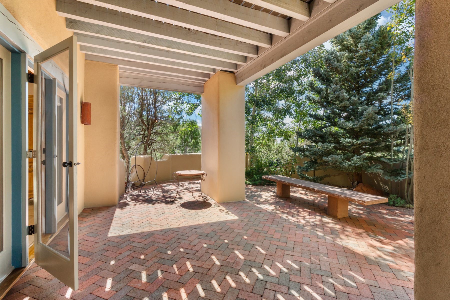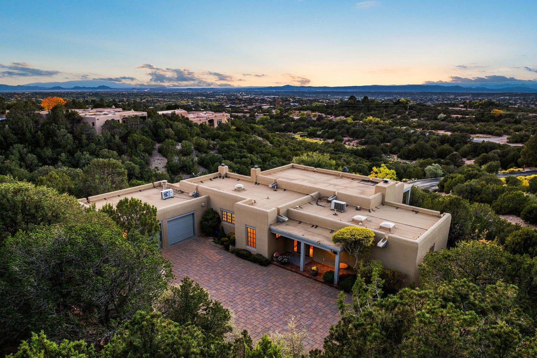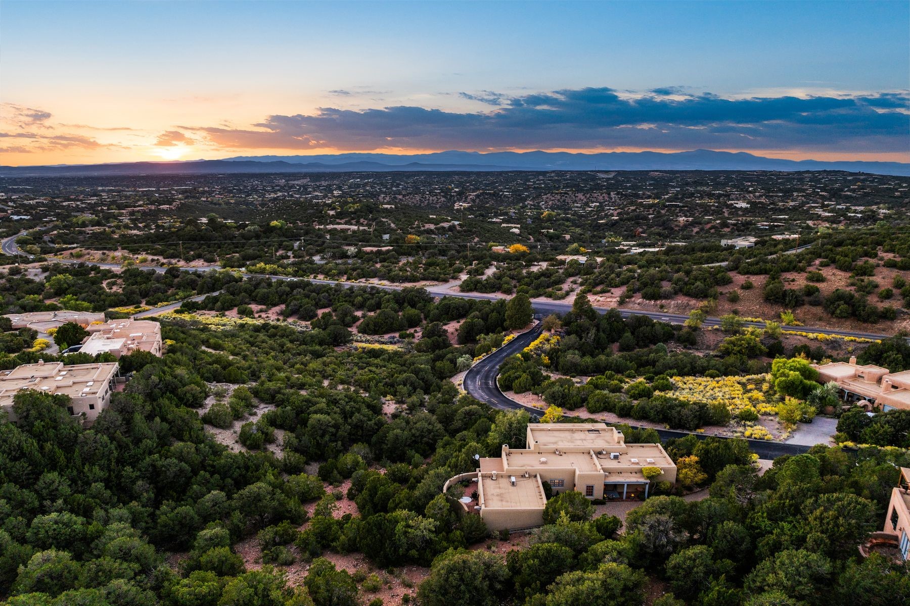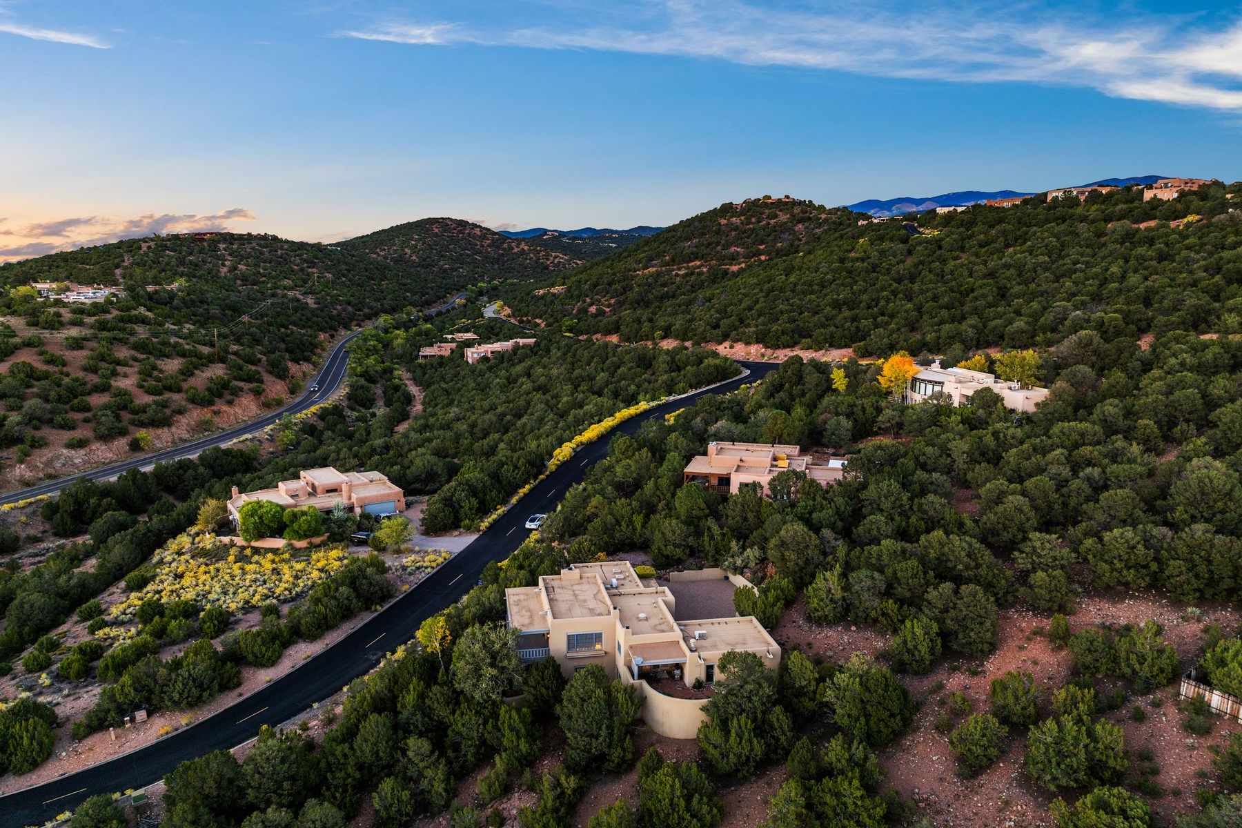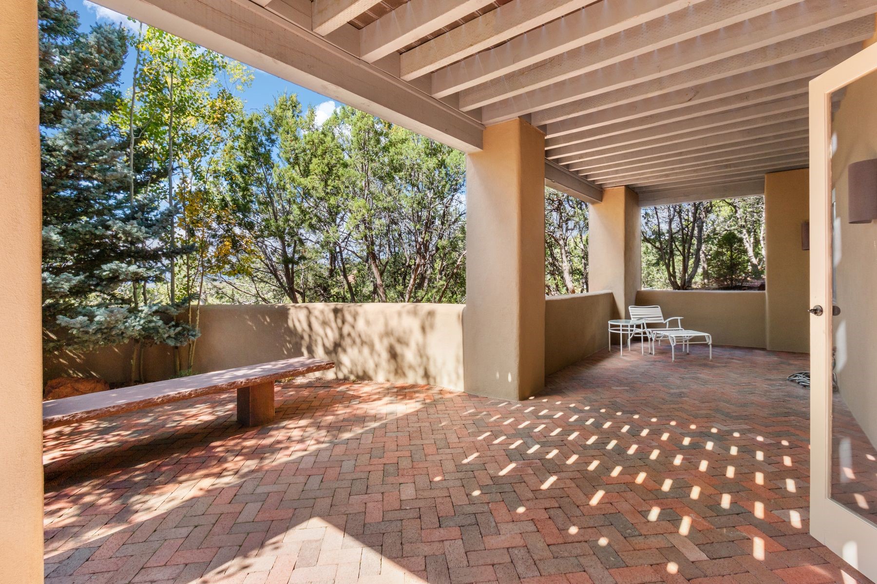 Nestled in a private gated neighborhood just five minutes from Canyon Road, this stunning 3-bedroom, 3-bath residence captures the essence of Santa Fe living with breathtaking views and refined details throughout.Arrive via a paver-lined driveway leading to a spacious two-car garage and be welcomed into a home built for both comfort and sophistication. Inside, French limestone imported from Forte dei Marmi flows seamlessly throughout, complemented by exquisite diamond finished plaster walls that add depth, texture, and timeless elegance. The expansive floor plan opens to over 800 square feet of covered portals, perfect for entertaining or savoring quiet evenings while soaking in the dramatic vistas.The gourmet kitchen is appointed with high-end finishes and appliances, designed to satisfy both everyday living and special occasions. Each bedroom offers privacy and comfort, complemented by spa-like baths.With its combination of architectural elegance, premium materials, and proximity to Santa Fe's vibrant art and dining scene, this home offers a rare opportunity to enjoy luxury and convenience in one of the city's most sought-after locations.