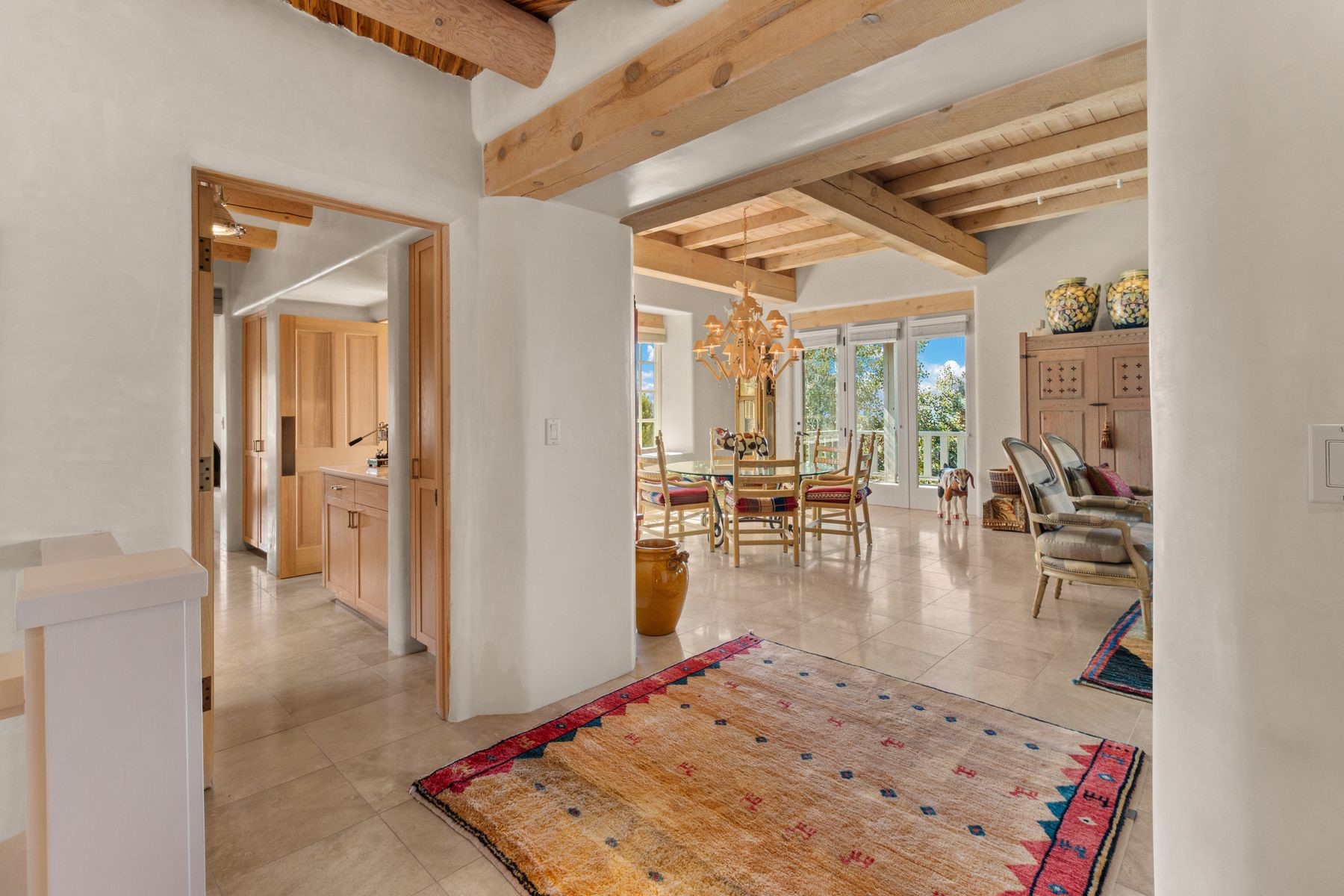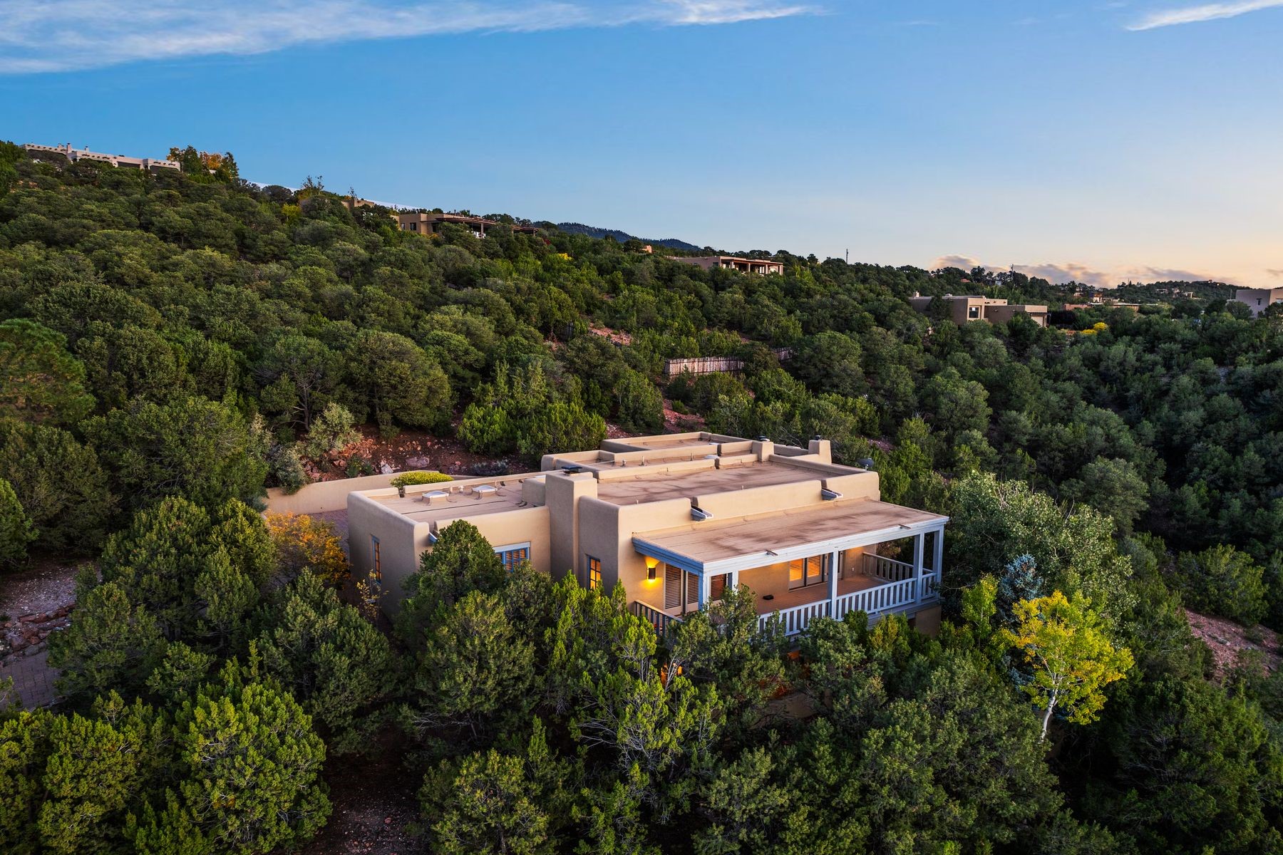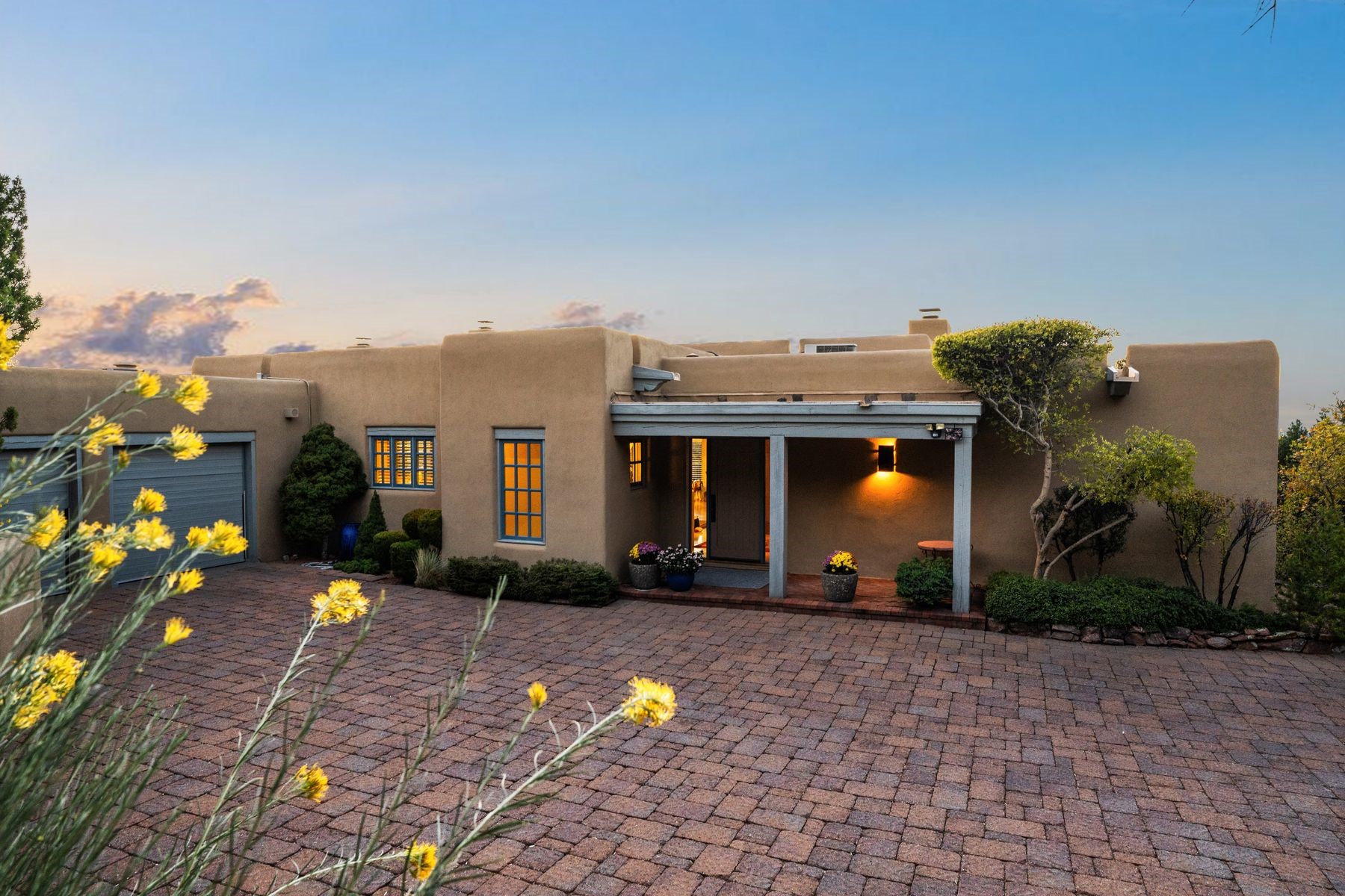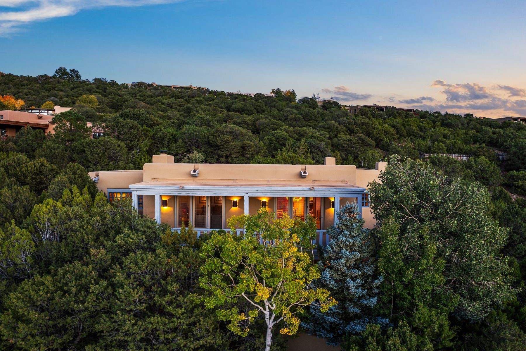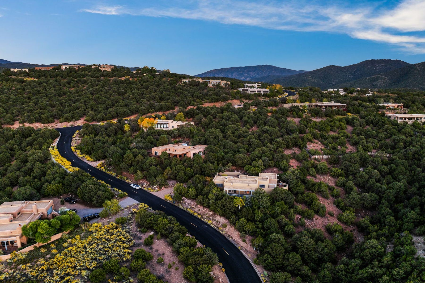 Nestled in a private gated neighborhood just five minutes from Canyon Road, this stunning 3-bedroom, 3-bath residence captures the essence of Santa Fe living with breathtaking views and refined details throughout.Arrive via a paver-lined driveway leading to a spacious two-car garage and be welcomed into a home built for both comfort and sophistication. Inside, French limestone imported from Forte dei Marmi flows seamlessly throughout, complemented by exquisite diamond finished plaster walls that add depth, texture, and timeless elegance. The expansive floor plan opens to over 800 square feet of covered portals, perfect for entertaining or savoring quiet evenings while soaking in the dramatic vistas.The gourmet kitchen is appointed with high-end finishes and appliances, designed to satisfy both everyday living and special occasions. Each bedroom offers privacy and comfort, complemented by spa-like baths.With its combination of architectural elegance, premium materials, and proximity to Santa Fe's vibrant art and dining scene, this home offers a rare opportunity to enjoy luxury and convenience in one of the city's most sought-after locations.