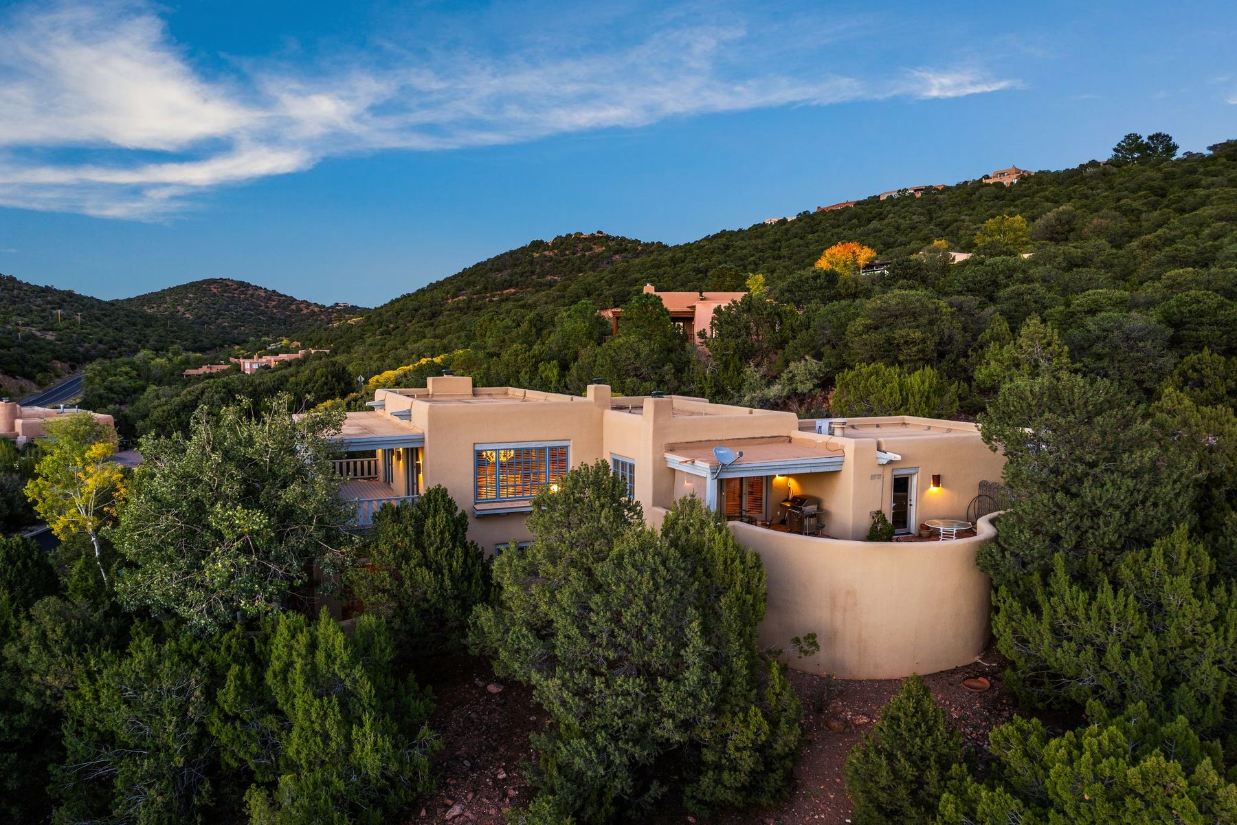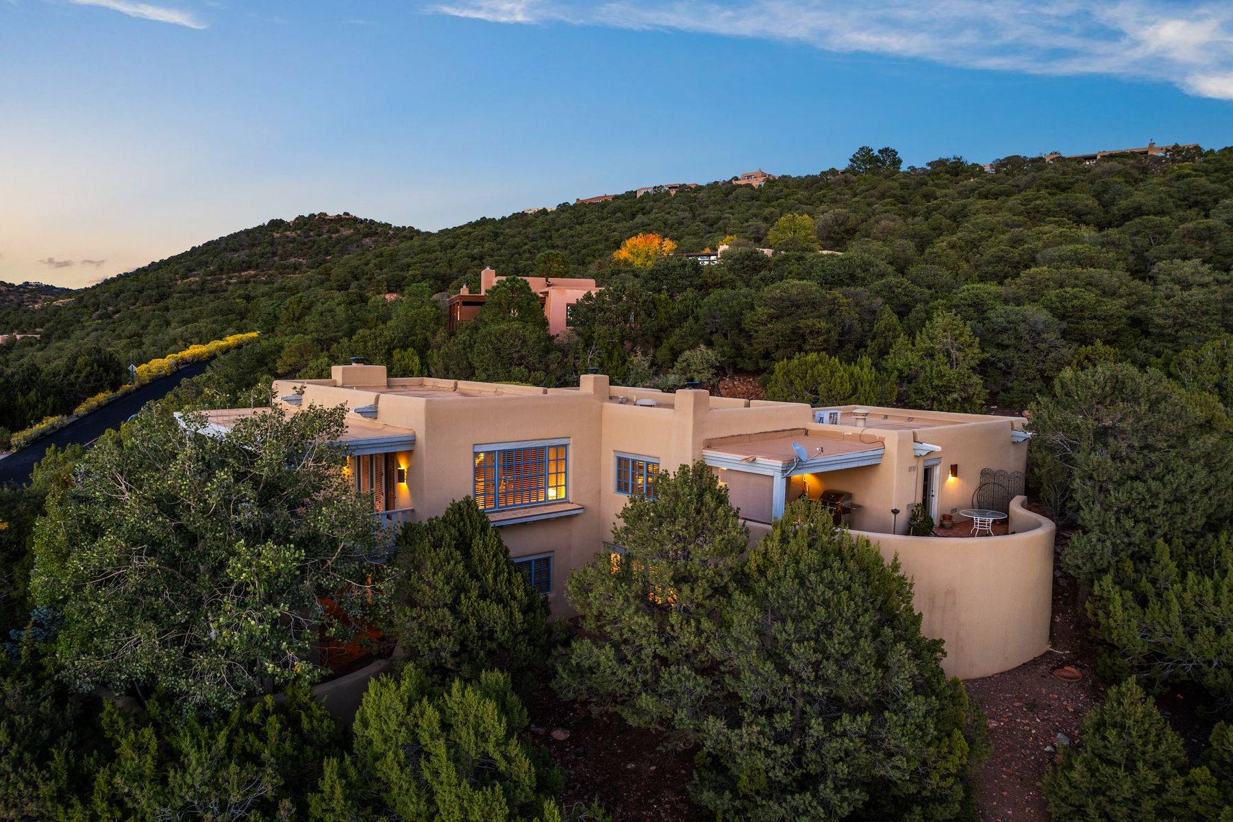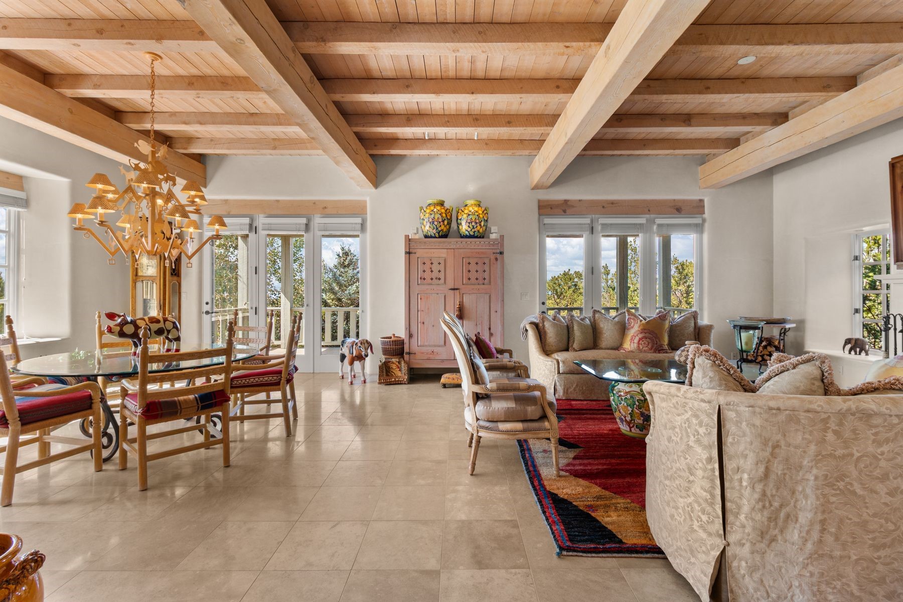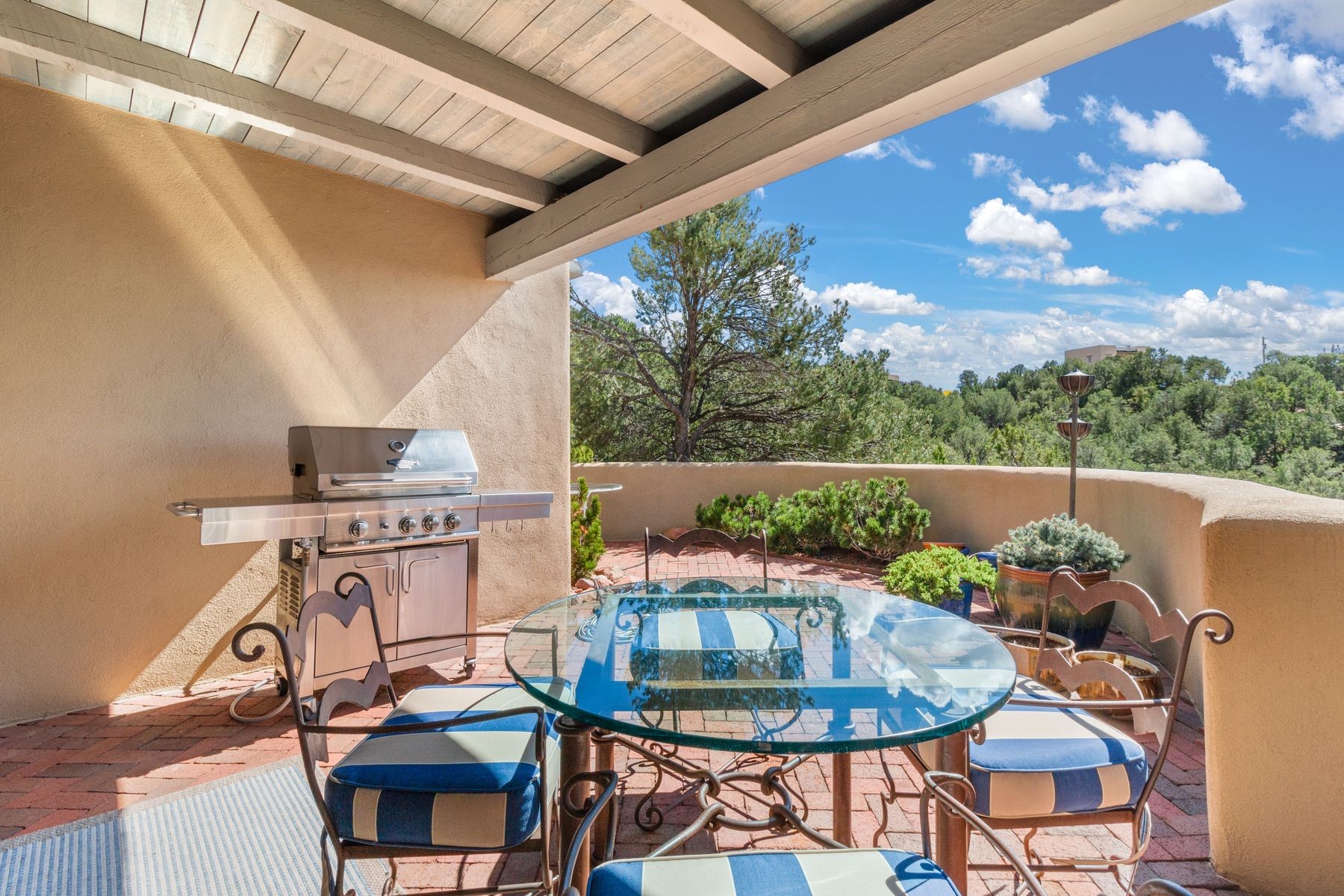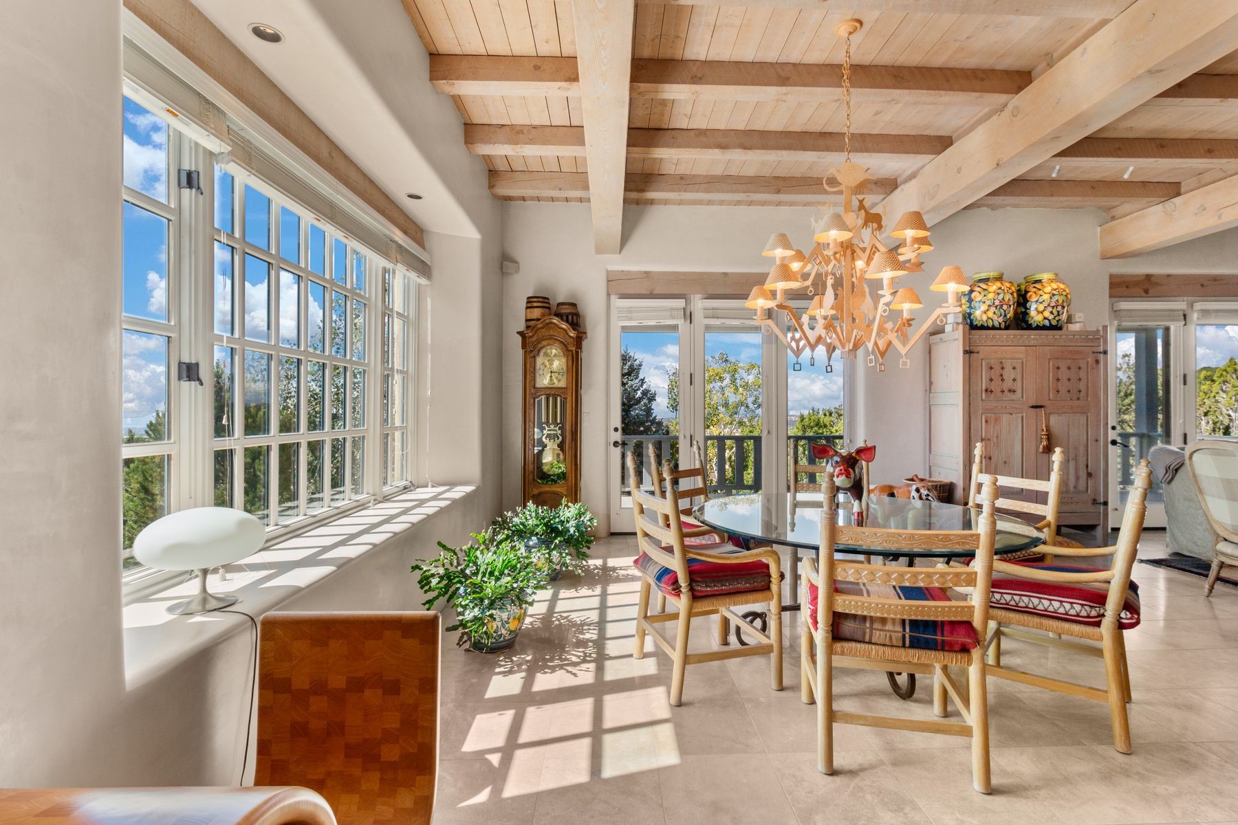 Nestled in a private gated neighborhood just five minutes from Canyon Road, this stunning 3-bedroom, 3-bath residence captures the essence of Santa Fe living with breathtaking views and refined details throughout.Arrive via a paver-lined driveway leading to a spacious two-car garage and be welcomed into a home built for both comfort and sophistication. Inside, French limestone imported from Forte dei Marmi flows seamlessly throughout, complemented by exquisite diamond finished plaster walls that add depth, texture, and timeless elegance. The expansive floor plan opens to over 800 square feet of covered portals, perfect for entertaining or savoring quiet evenings while soaking in the dramatic vistas.The gourmet kitchen is appointed with high-end finishes and appliances, designed to satisfy both everyday living and special occasions. Each bedroom offers privacy and comfort, complemented by spa-like baths.With its combination of architectural elegance, premium materials, and proximity to Santa Fe's vibrant art and dining scene, this home offers a rare opportunity to enjoy luxury and convenience in one of the city's most sought-after locations.