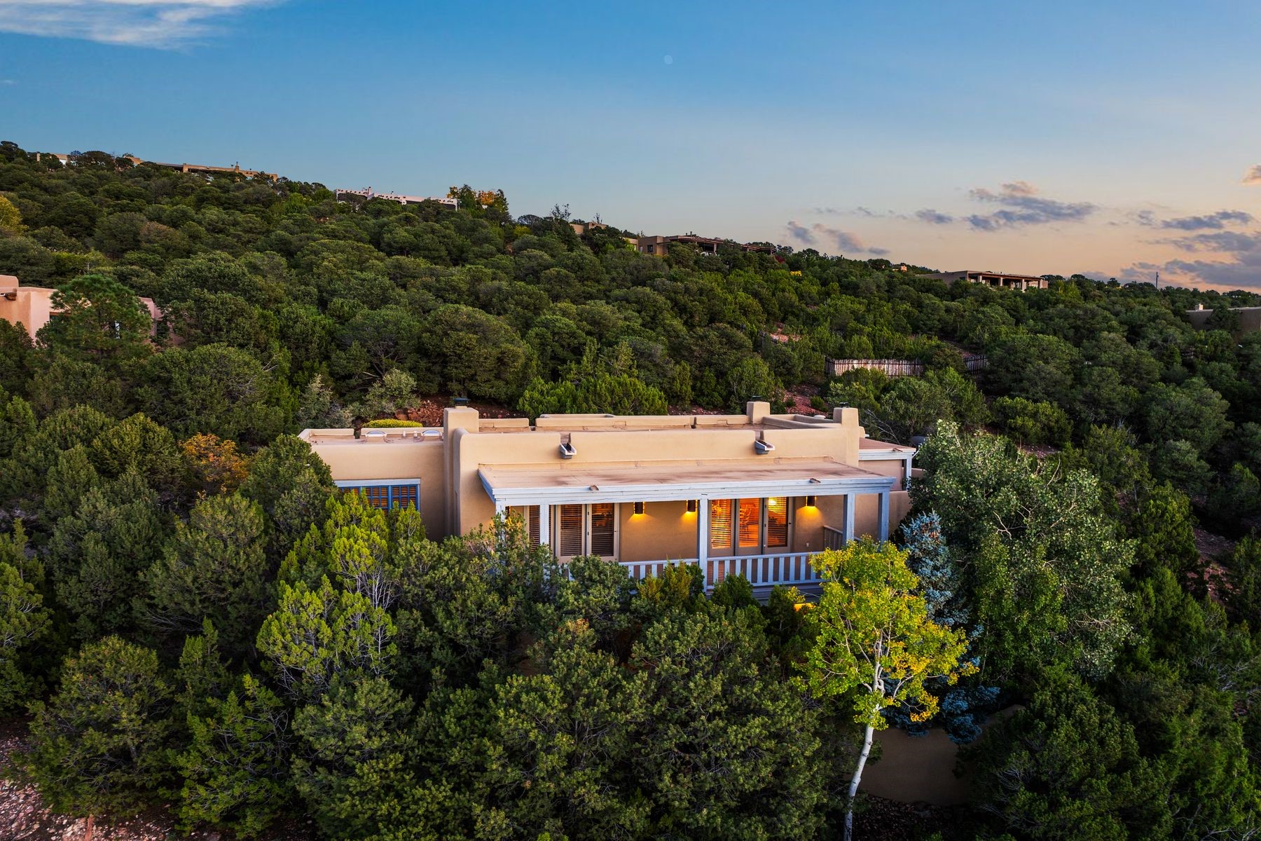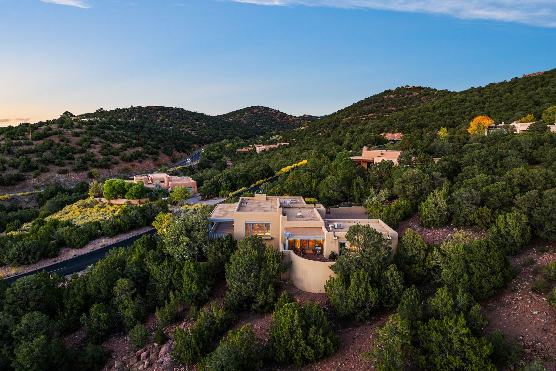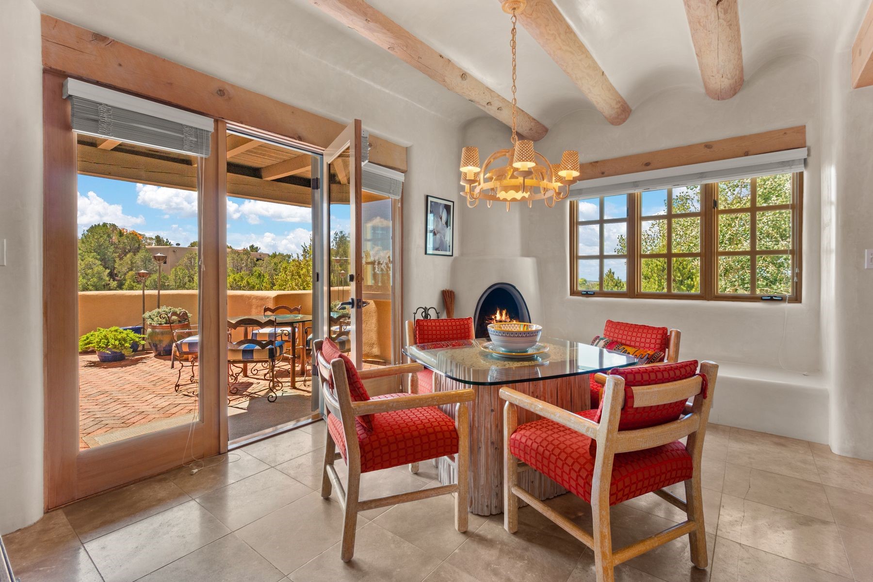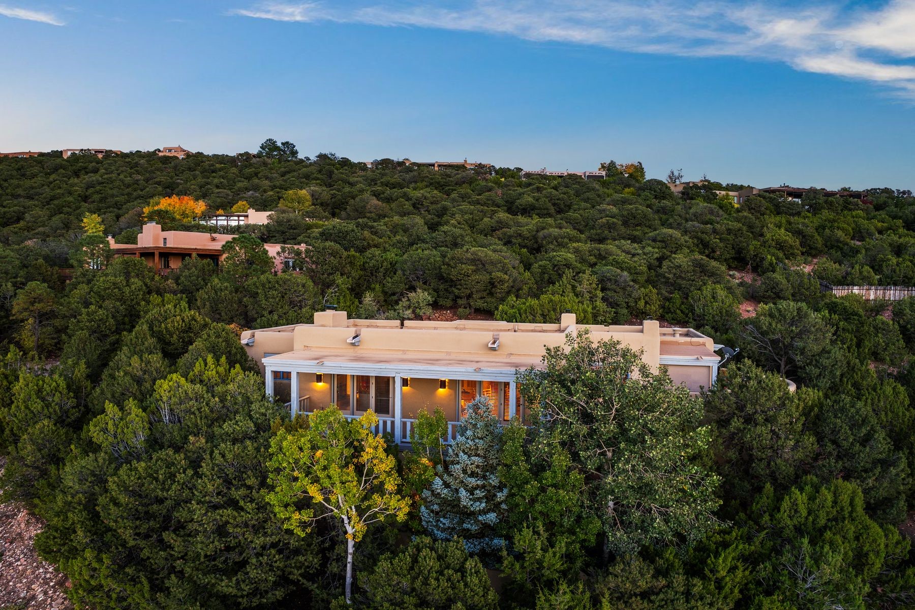 Nestled in a private gated neighborhood just five minutes from Canyon Road, this stunning 3-bedroom, 3-bath residence captures the essence of Santa Fe living with breathtaking views and refined details throughout.Arrive via a paver-lined driveway leading to a spacious two-car garage and be welcomed into a home built for both comfort and sophistication. Inside, French limestone imported from Forte dei Marmi flows seamlessly throughout, complemented by exquisite diamond finished plaster walls that add depth, texture, and timeless elegance. The expansive floor plan opens to over 800 square feet of covered portals, perfect for entertaining or savoring quiet evenings while soaking in the dramatic vistas.The gourmet kitchen is appointed with high-end finishes and appliances, designed to satisfy both everyday living and special occasions. Each bedroom offers privacy and comfort, complemented by spa-like baths.With its combination of architectural elegance, premium materials, and proximity to Santa Fe's vibrant art and dining scene, this home offers a rare opportunity to enjoy luxury and convenience in one of the city's most sought-after locations.