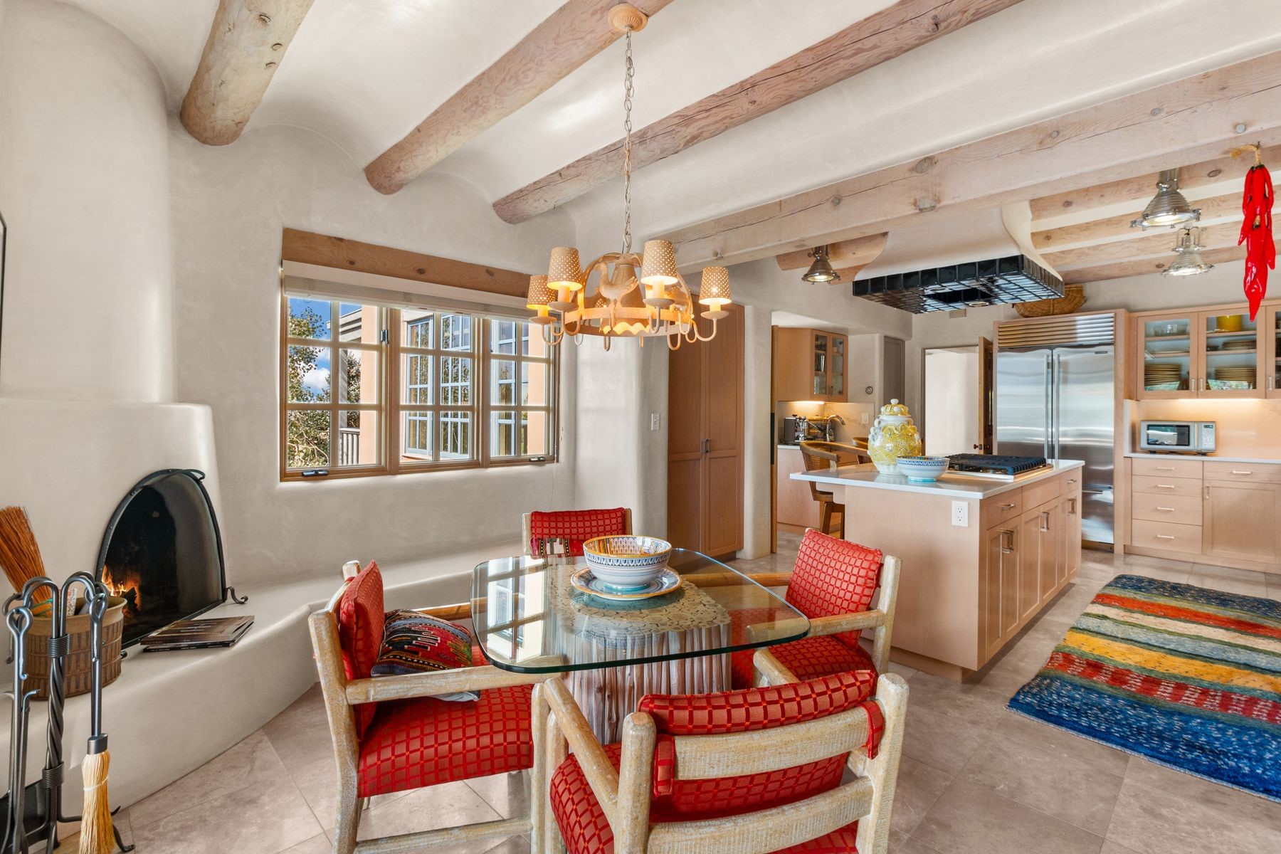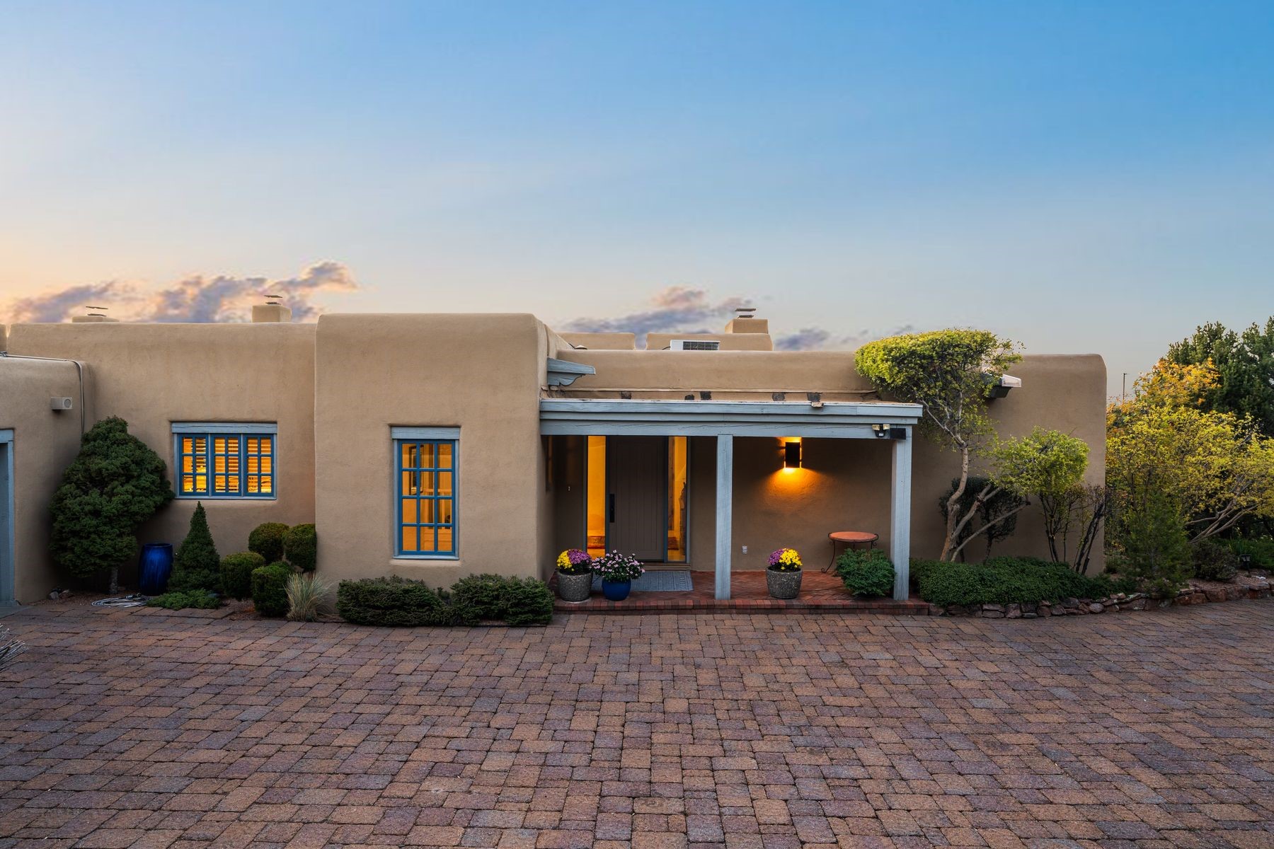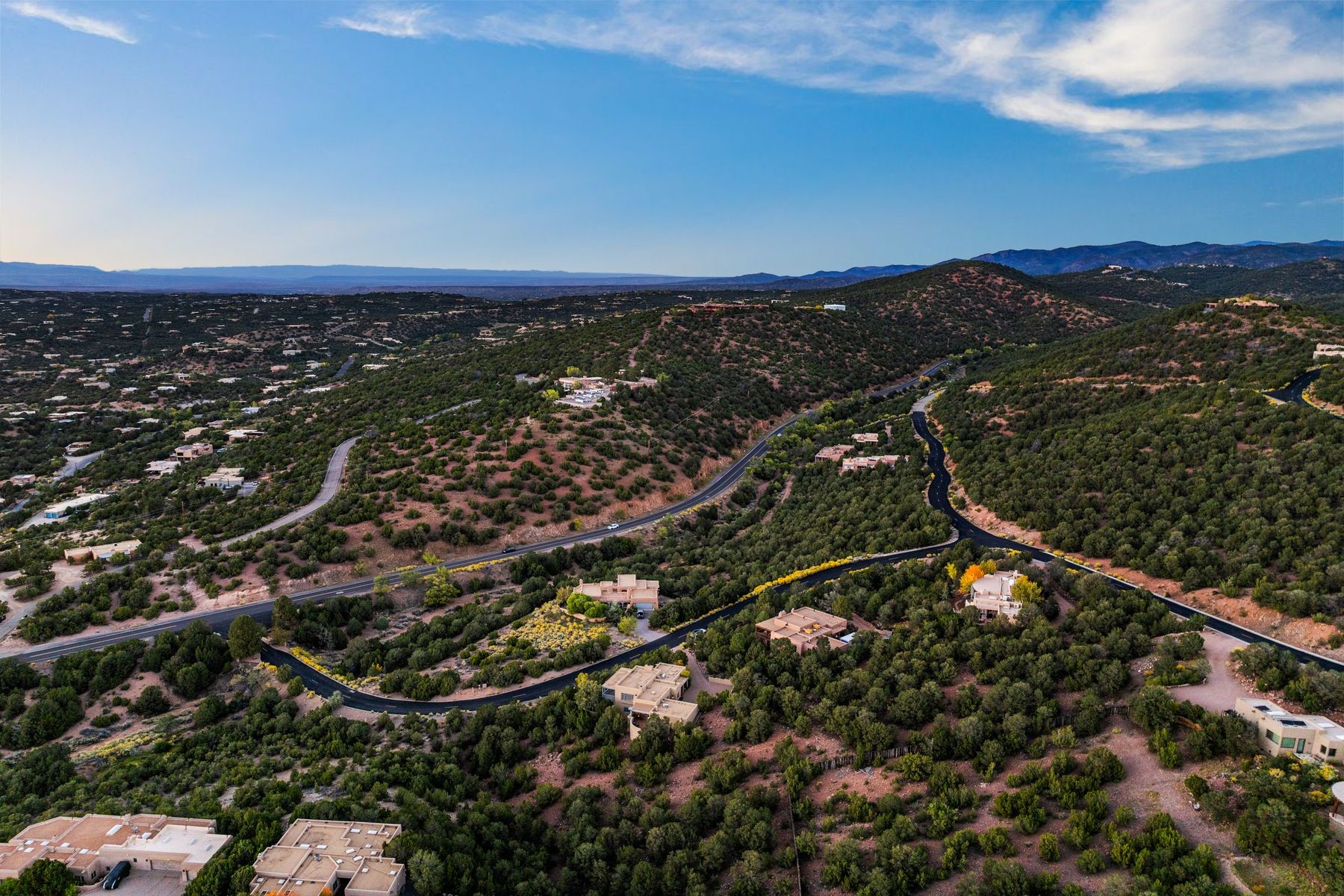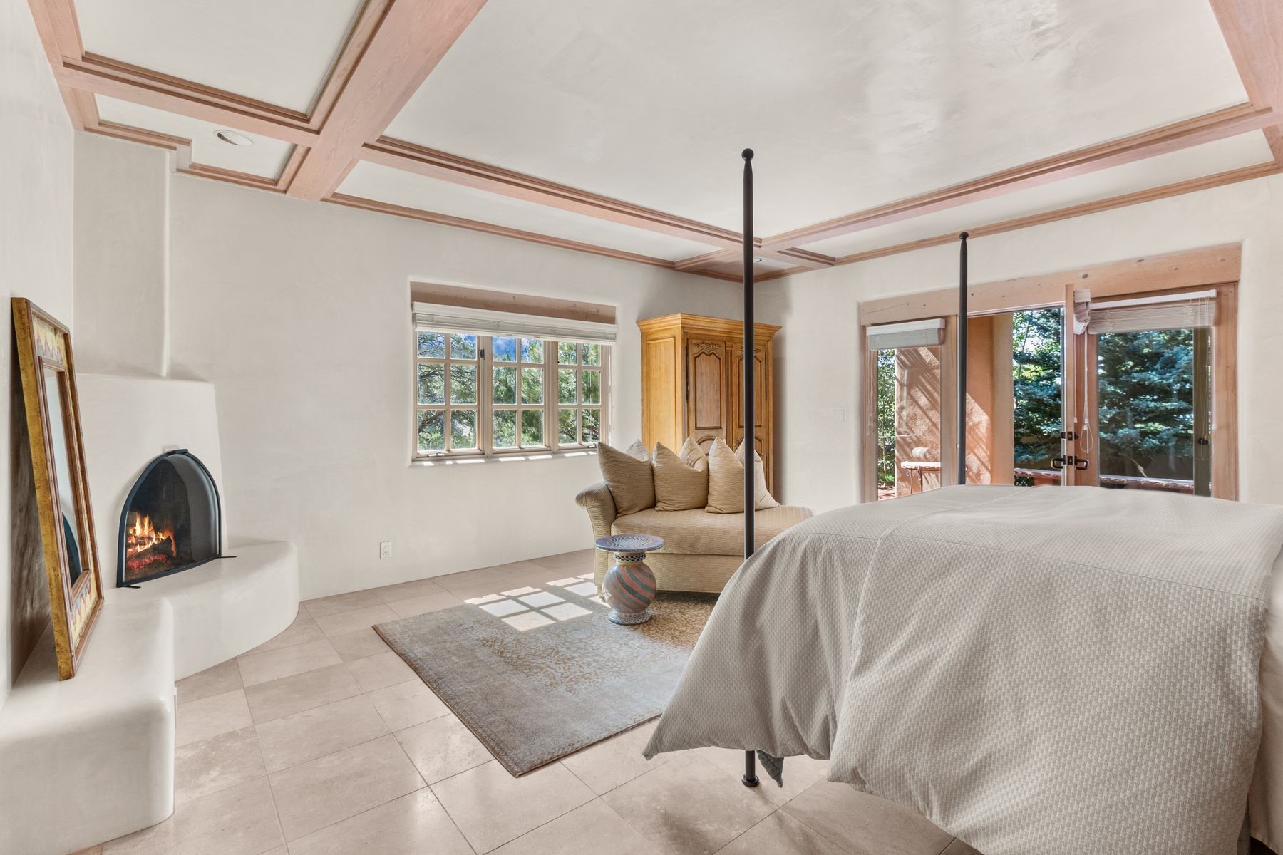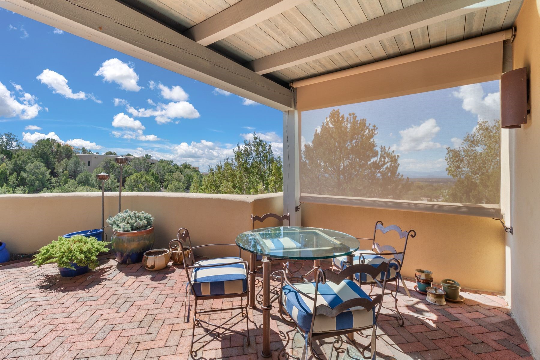 Nestled in a private gated neighborhood just five minutes from Canyon Road, this stunning 3-bedroom, 3-bath residence captures the essence of Santa Fe living with breathtaking views and refined details throughout.Arrive via a paver-lined driveway leading to a spacious two-car garage and be welcomed into a home built for both comfort and sophistication. Inside, French limestone imported from Forte dei Marmi flows seamlessly throughout, complemented by exquisite diamond finished plaster walls that add depth, texture, and timeless elegance. The expansive floor plan opens to over 800 square feet of covered portals, perfect for entertaining or savoring quiet evenings while soaking in the dramatic vistas.The gourmet kitchen is appointed with high-end finishes and appliances, designed to satisfy both everyday living and special occasions. Each bedroom offers privacy and comfort, complemented by spa-like baths.With its combination of architectural elegance, premium materials, and proximity to Santa Fe's vibrant art and dining scene, this home offers a rare opportunity to enjoy luxury and convenience in one of the city's most sought-after locations.