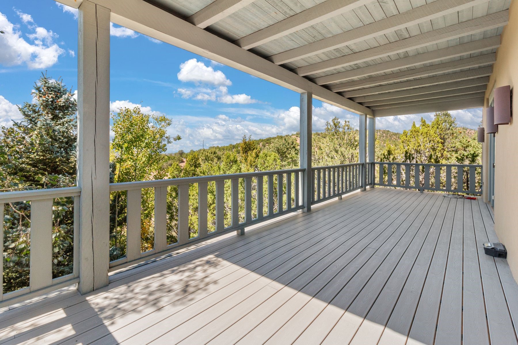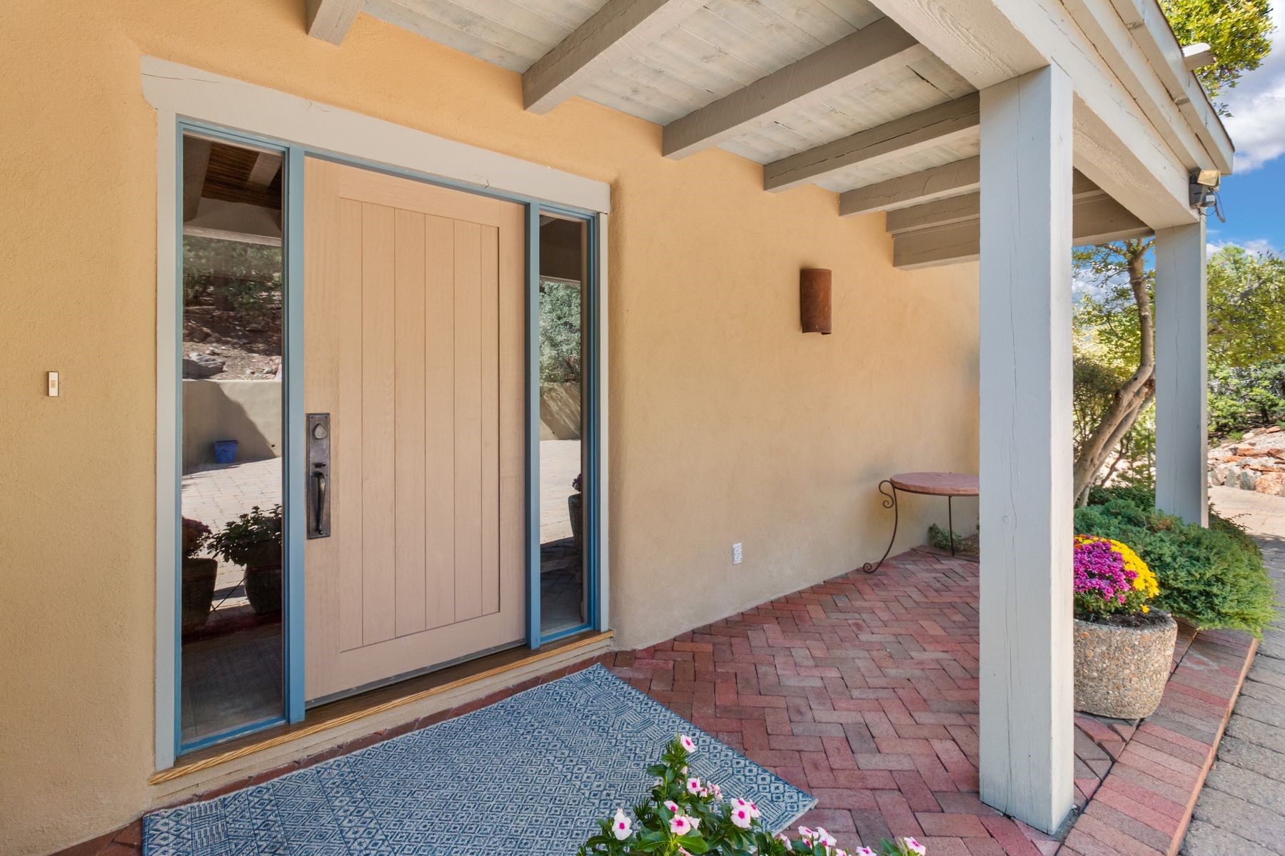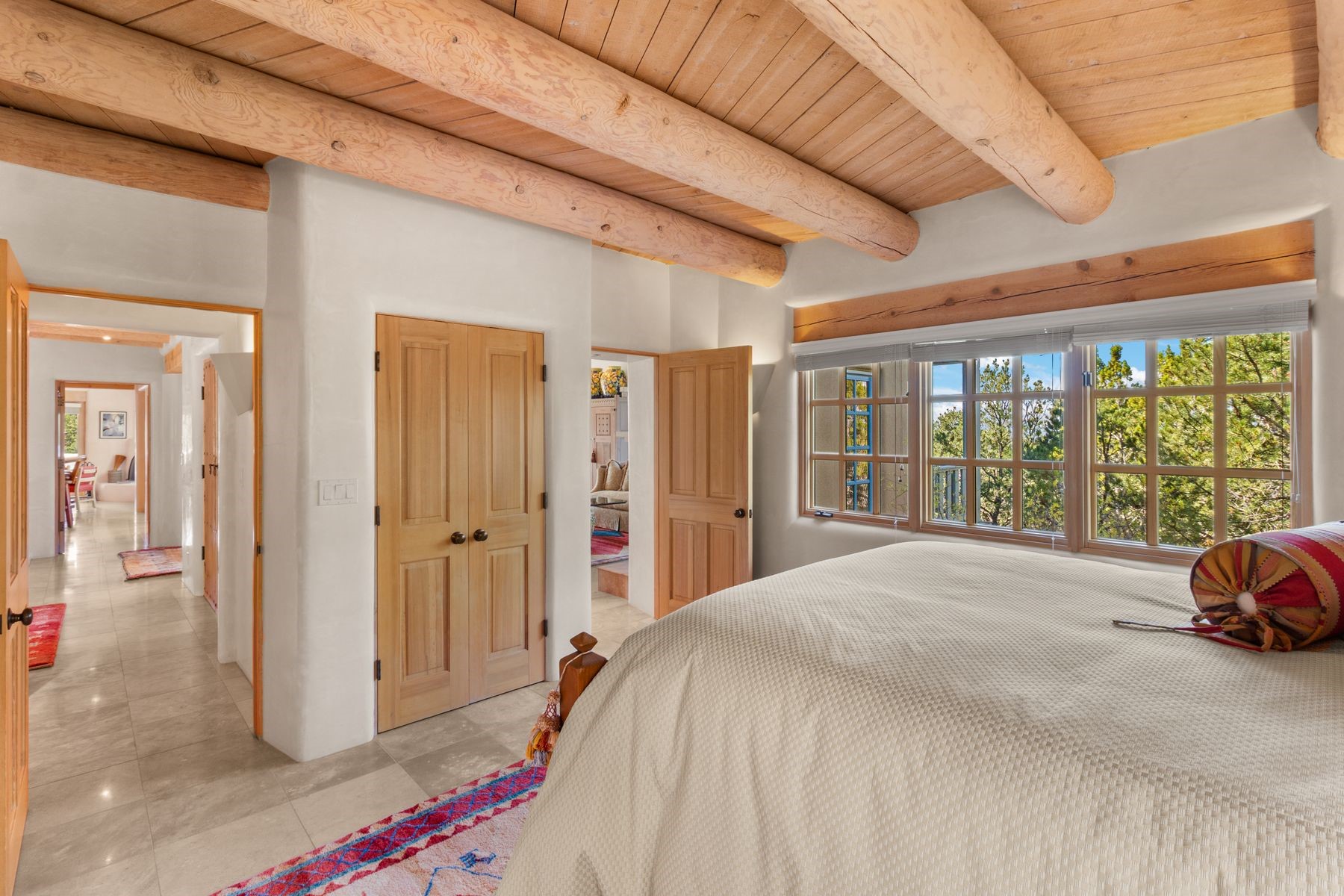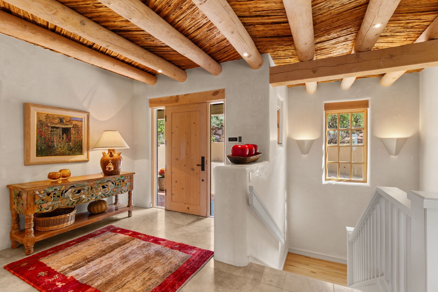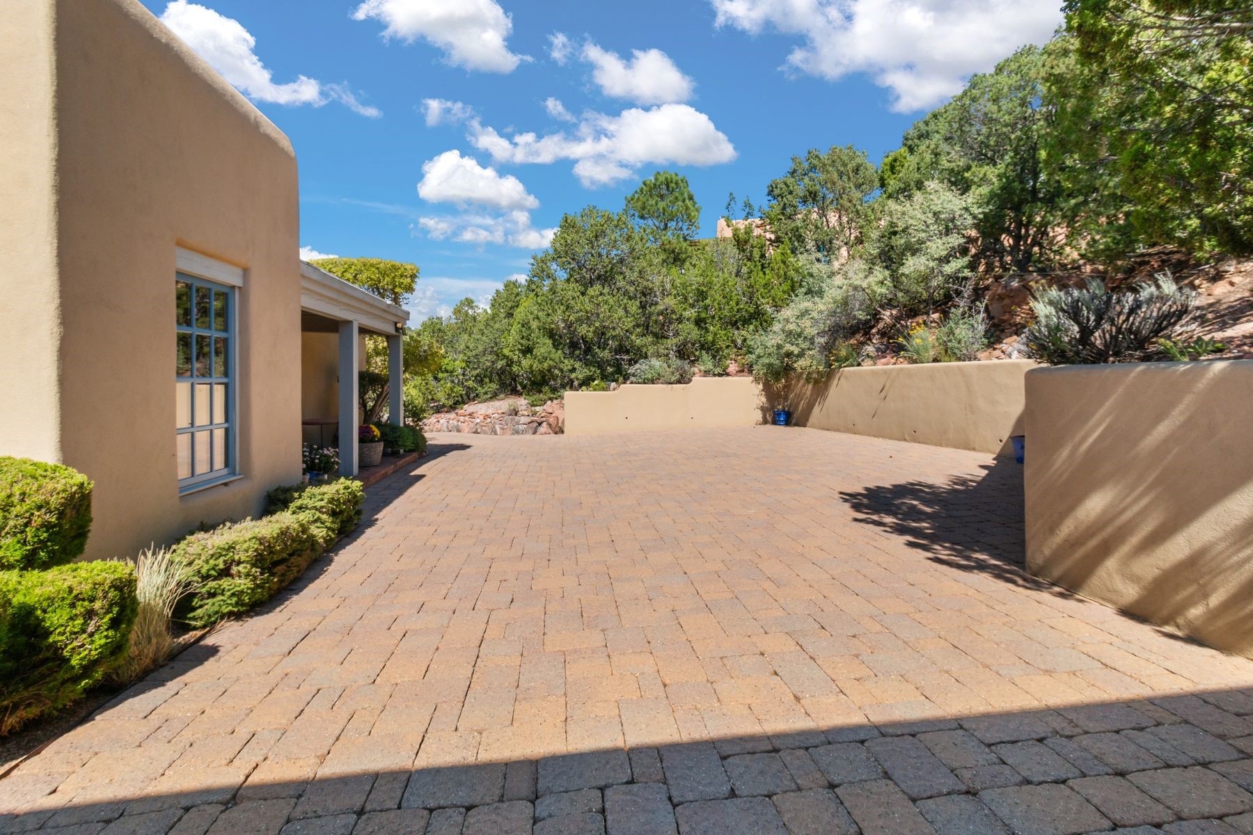 Nestled in a private gated neighborhood just five minutes from Canyon Road, this stunning 3-bedroom, 3-bath residence captures the essence of Santa Fe living with breathtaking views and refined details throughout.Arrive via a paver-lined driveway leading to a spacious two-car garage and be welcomed into a home built for both comfort and sophistication. Inside, French limestone imported from Forte dei Marmi flows seamlessly throughout, complemented by exquisite diamond finished plaster walls that add depth, texture, and timeless elegance. The expansive floor plan opens to over 800 square feet of covered portals, perfect for entertaining or savoring quiet evenings while soaking in the dramatic vistas.The gourmet kitchen is appointed with high-end finishes and appliances, designed to satisfy both everyday living and special occasions. Each bedroom offers privacy and comfort, complemented by spa-like baths.With its combination of architectural elegance, premium materials, and proximity to Santa Fe's vibrant art and dining scene, this home offers a rare opportunity to enjoy luxury and convenience in one of the city's most sought-after locations.