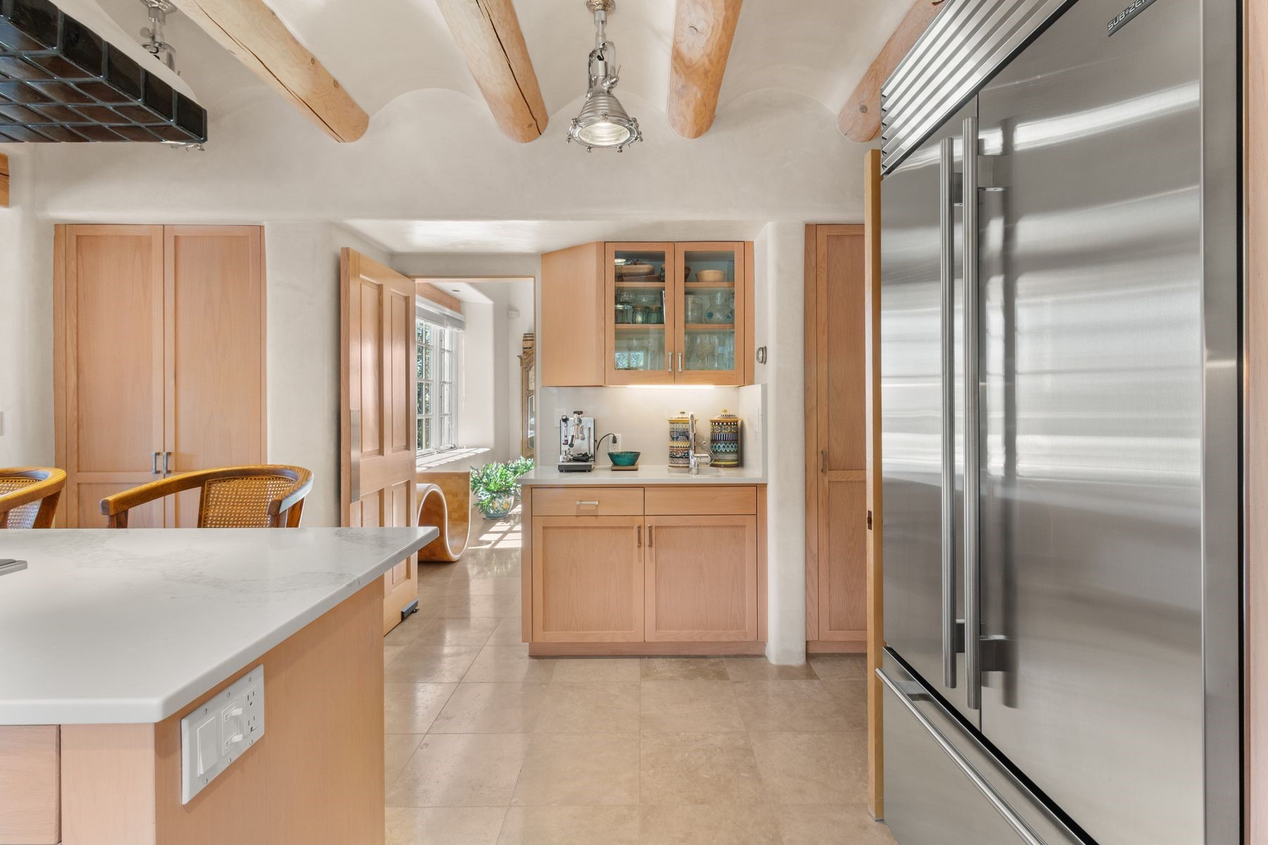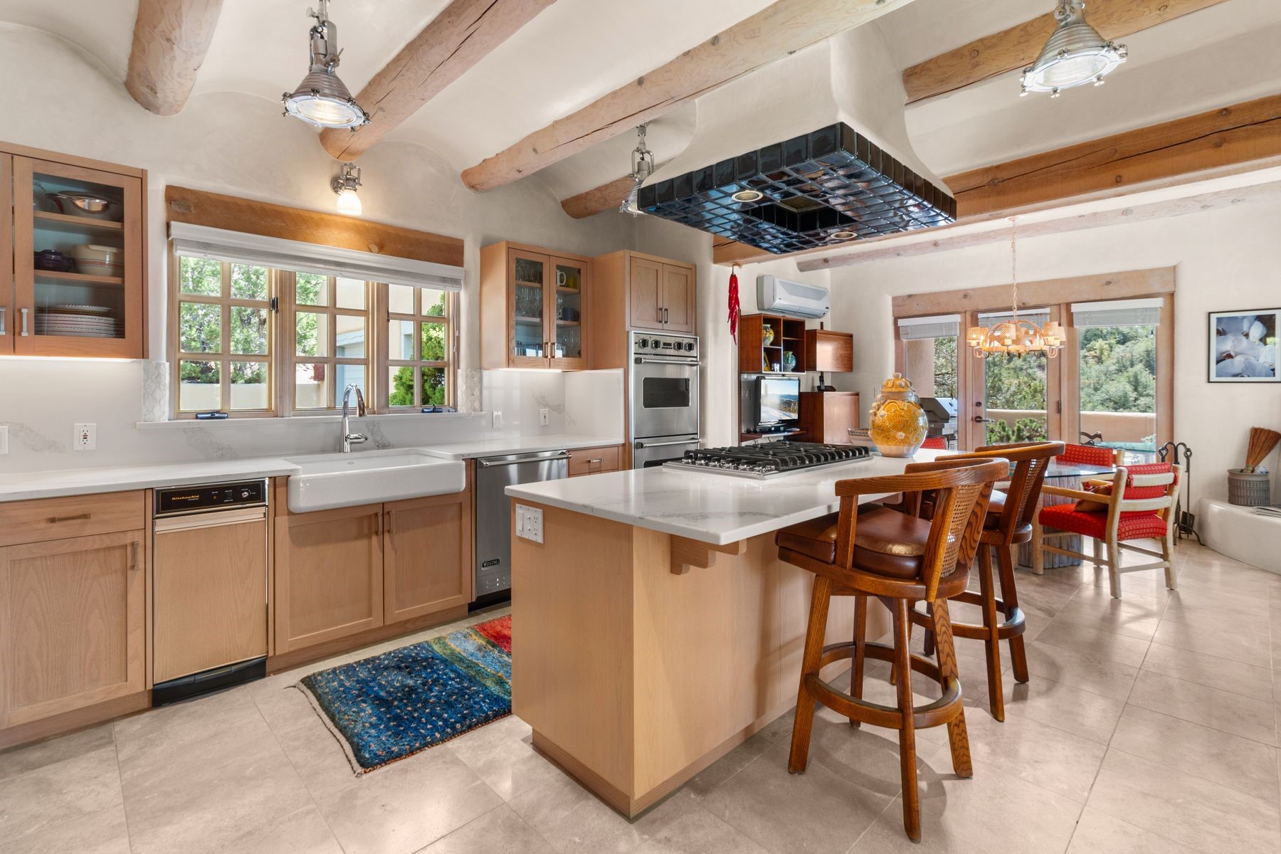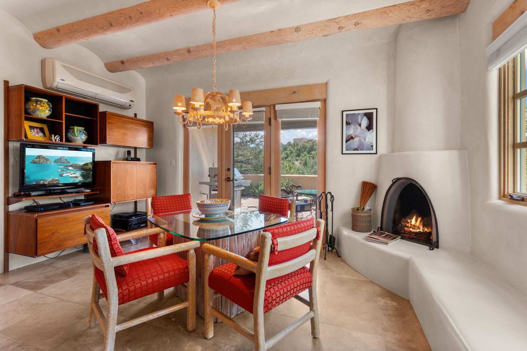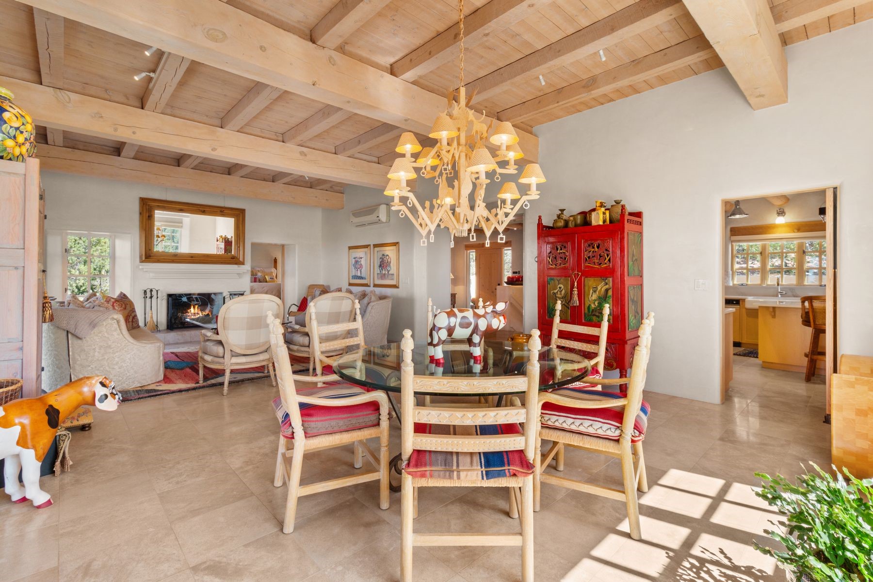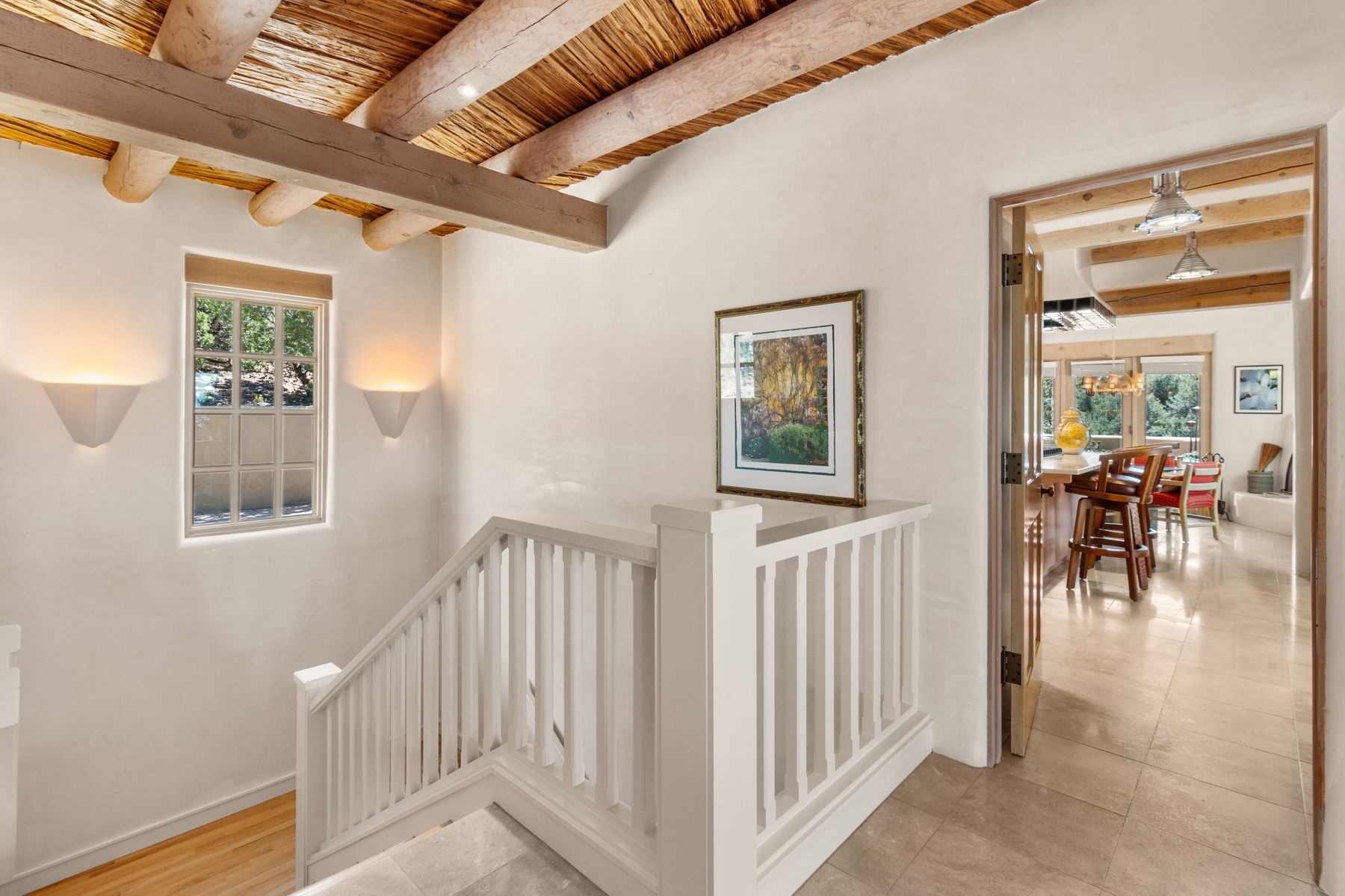 Nestled in a private gated neighborhood just five minutes from Canyon Road, this stunning 3-bedroom, 3-bath residence captures the essence of Santa Fe living with breathtaking views and refined details throughout.Arrive via a paver-lined driveway leading to a spacious two-car garage and be welcomed into a home built for both comfort and sophistication. Inside, French limestone imported from Forte dei Marmi flows seamlessly throughout, complemented by exquisite diamond finished plaster walls that add depth, texture, and timeless elegance. The expansive floor plan opens to over 800 square feet of covered portals, perfect for entertaining or savoring quiet evenings while soaking in the dramatic vistas.The gourmet kitchen is appointed with high-end finishes and appliances, designed to satisfy both everyday living and special occasions. Each bedroom offers privacy and comfort, complemented by spa-like baths.With its combination of architectural elegance, premium materials, and proximity to Santa Fe's vibrant art and dining scene, this home offers a rare opportunity to enjoy luxury and convenience in one of the city's most sought-after locations.
