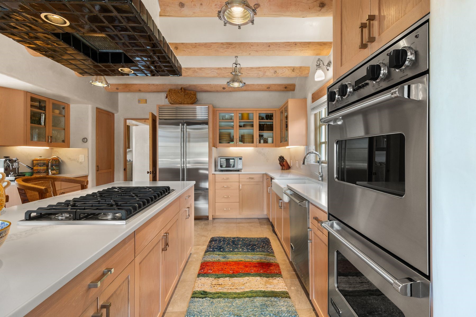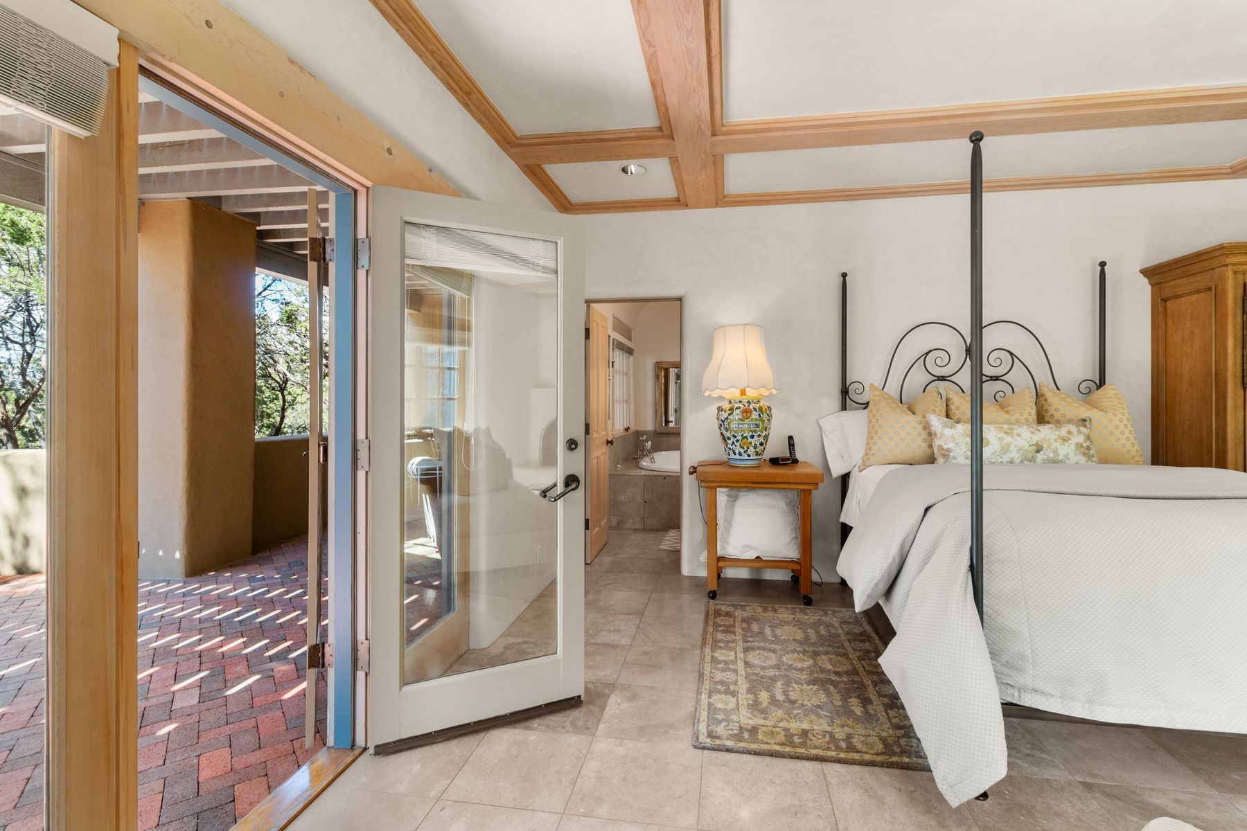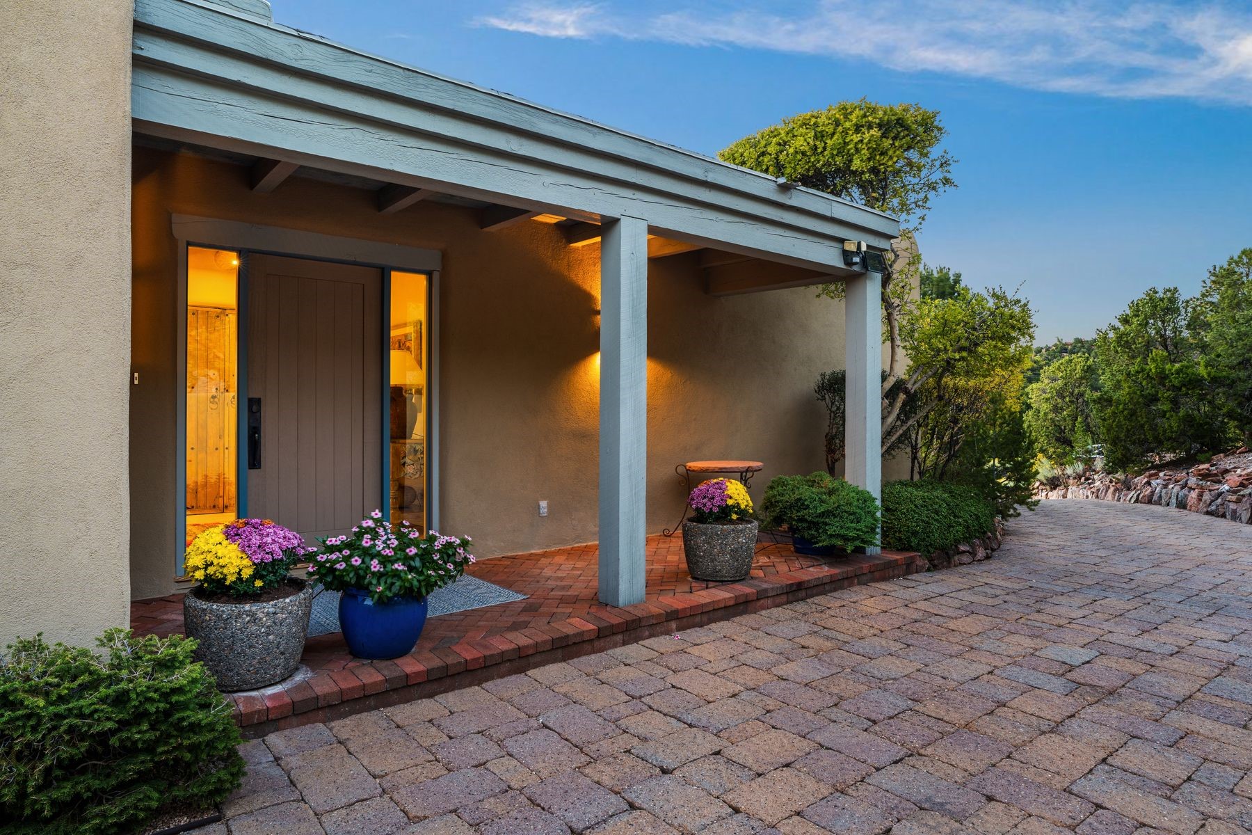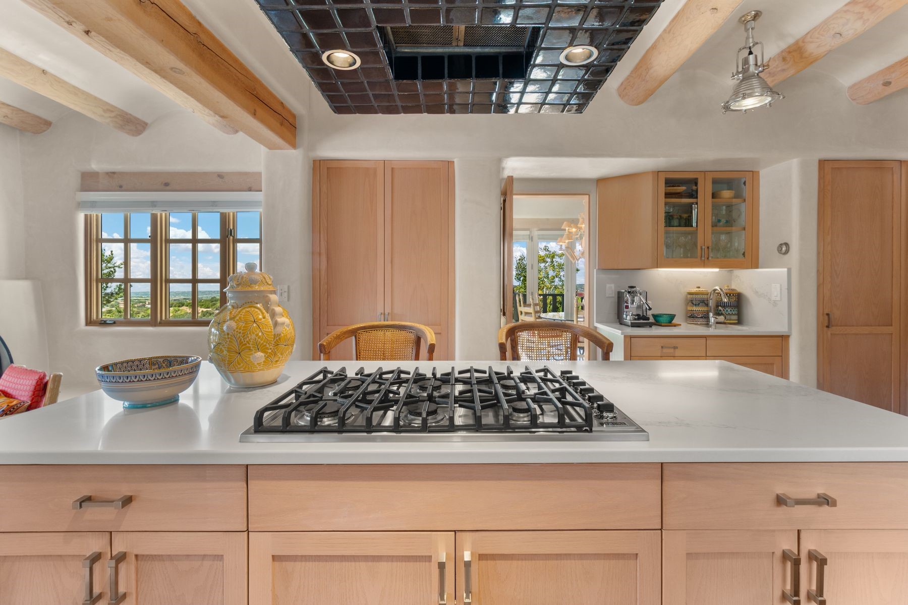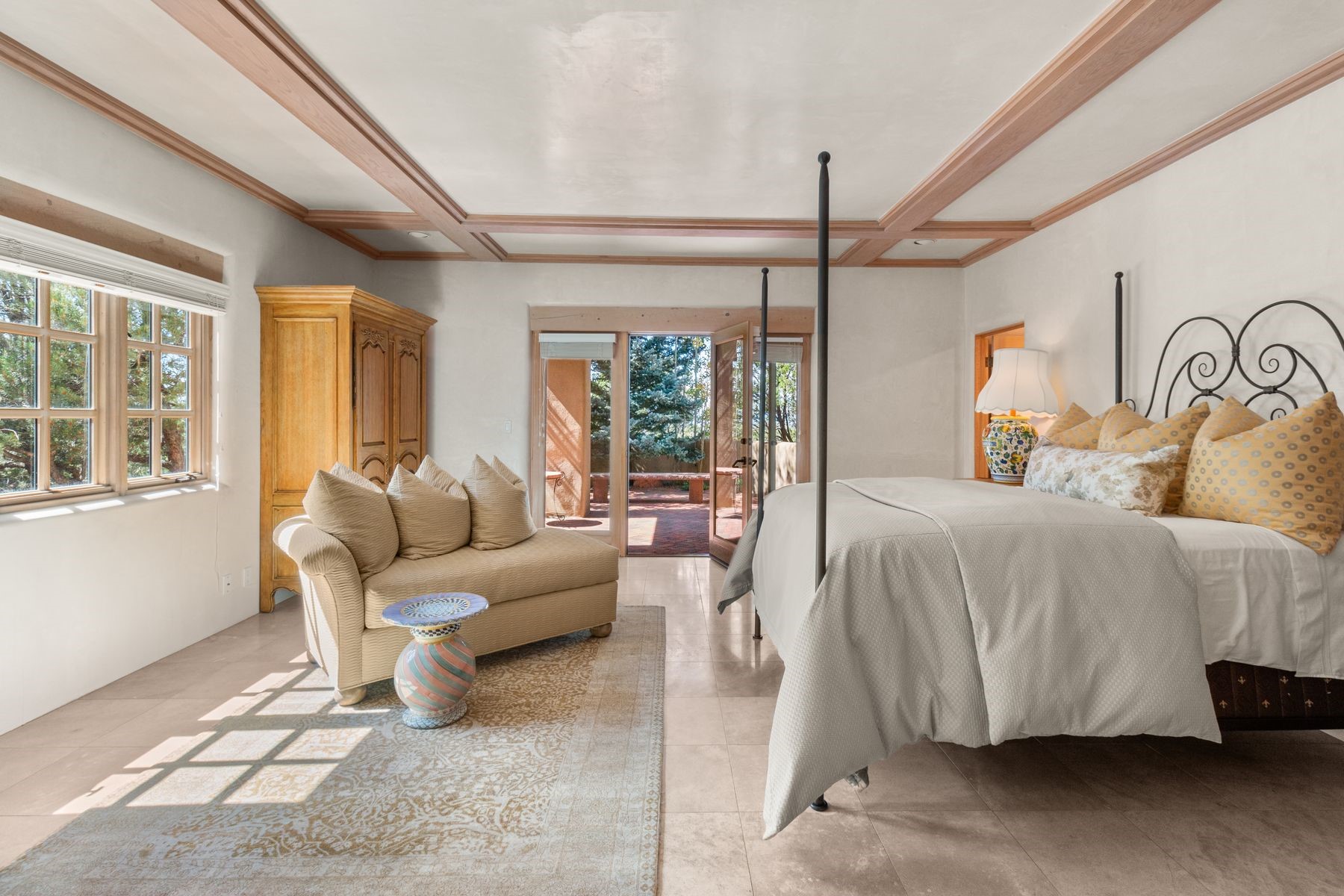 Nestled in a private gated neighborhood just five minutes from Canyon Road, this stunning 3-bedroom, 3-bath residence captures the essence of Santa Fe living with breathtaking views and refined details throughout.Arrive via a paver-lined driveway leading to a spacious two-car garage and be welcomed into a home built for both comfort and sophistication. Inside, French limestone imported from Forte dei Marmi flows seamlessly throughout, complemented by exquisite diamond finished plaster walls that add depth, texture, and timeless elegance. The expansive floor plan opens to over 800 square feet of covered portals, perfect for entertaining or savoring quiet evenings while soaking in the dramatic vistas.The gourmet kitchen is appointed with high-end finishes and appliances, designed to satisfy both everyday living and special occasions. Each bedroom offers privacy and comfort, complemented by spa-like baths.With its combination of architectural elegance, premium materials, and proximity to Santa Fe's vibrant art and dining scene, this home offers a rare opportunity to enjoy luxury and convenience in one of the city's most sought-after locations.