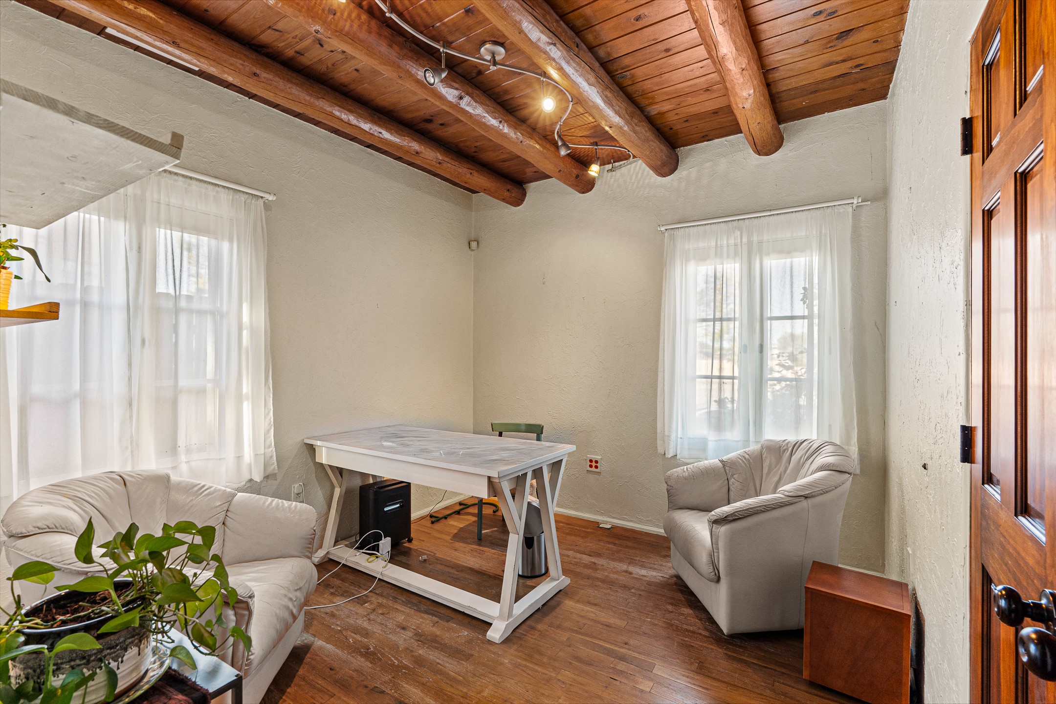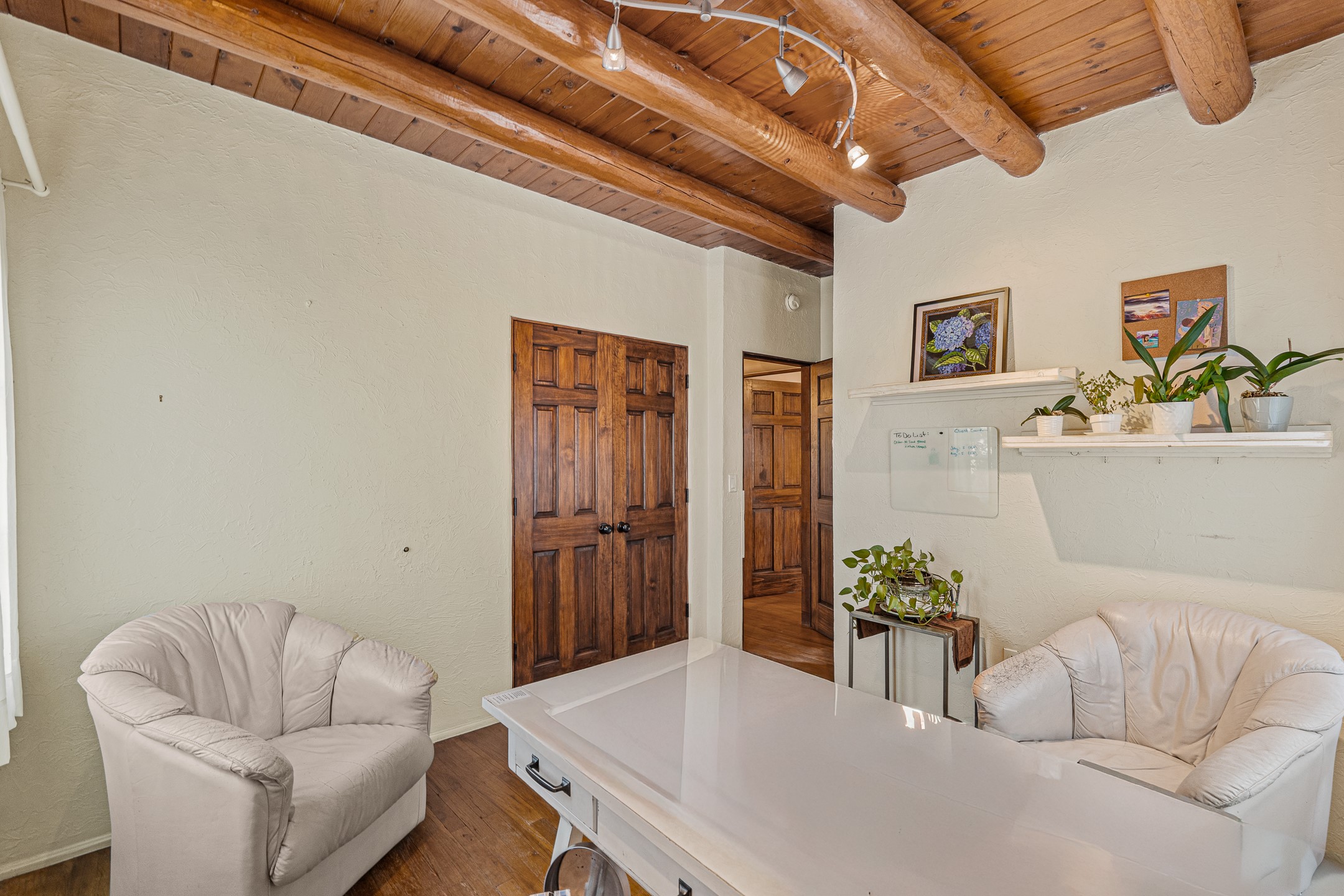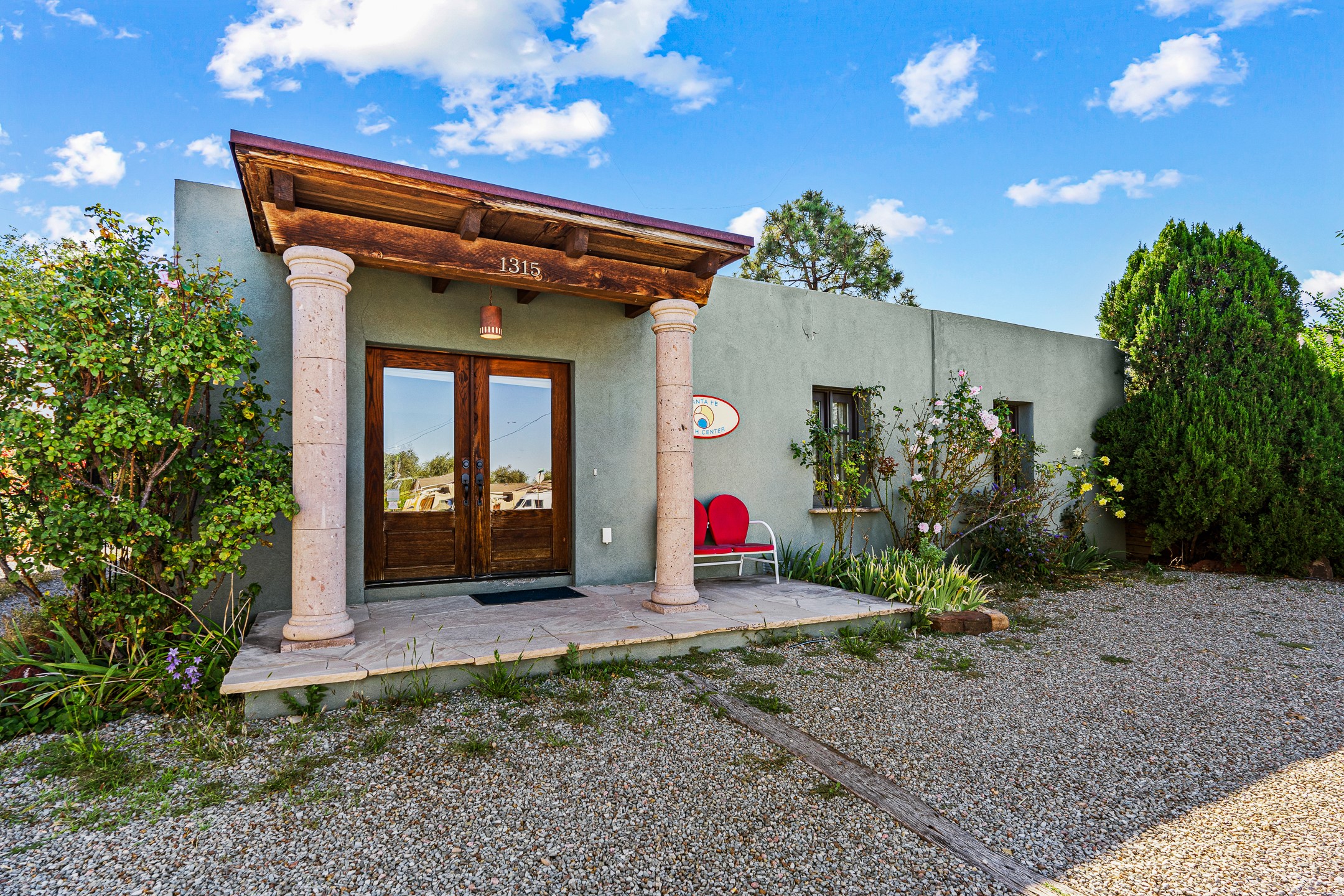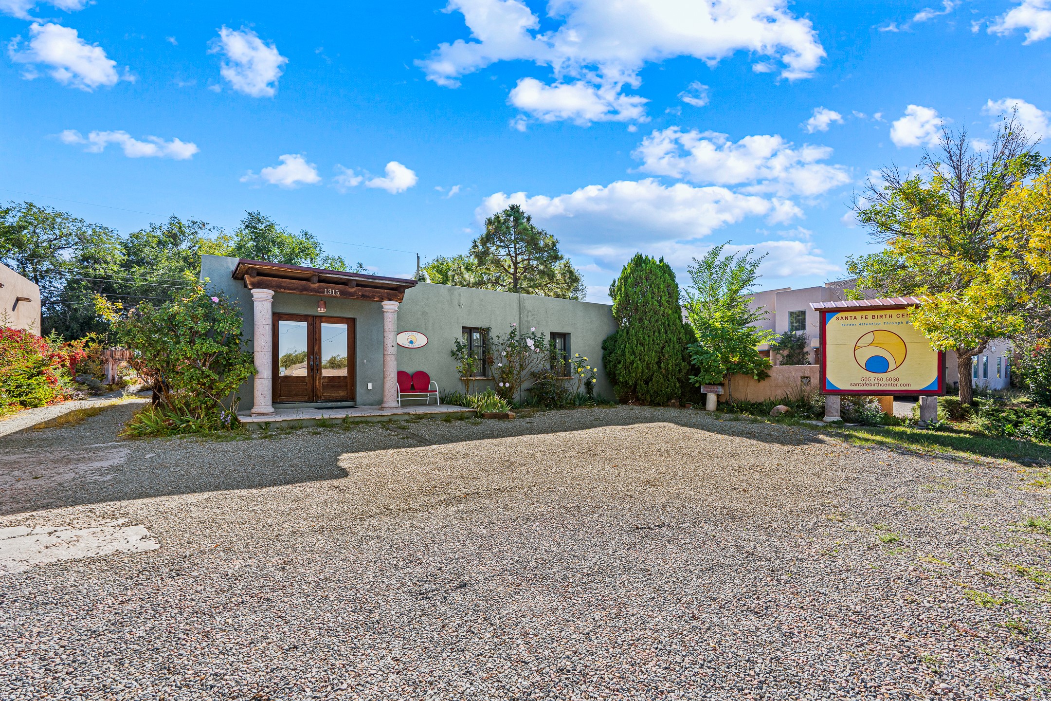 Beautifully renovated commercial property featuring sustainable, green design elements in the bustling S. St. Francis corridor, designed by Scott Irving. Step into a welcoming reception and waiting area with hardwood floors and viga ceilings throughout. The front of the building includes three windowed offices and two restrooms, one of which is ADA accessible. The updated kitchen/breakroom features track lighting and modern appliances.Toward the back of the building, you'll find a private office with an en suite restroom and hardwood floors, along with a large office or conference room that opens to a private, fenced, landscaped courtyard shaded by mature trees. Additional features include washer/dryer connections, abundant storage, and on-site parking. This property is ideal for office users, medical professionals, and many other business types. Don't miss this opportunity!