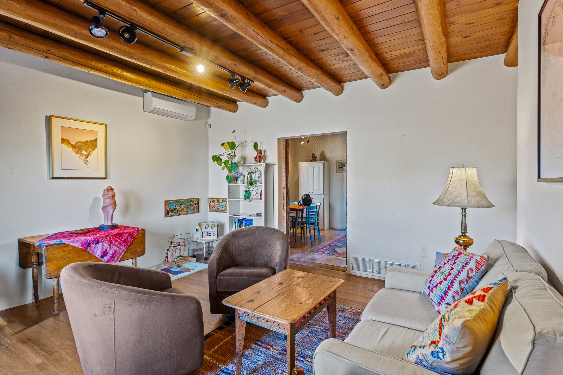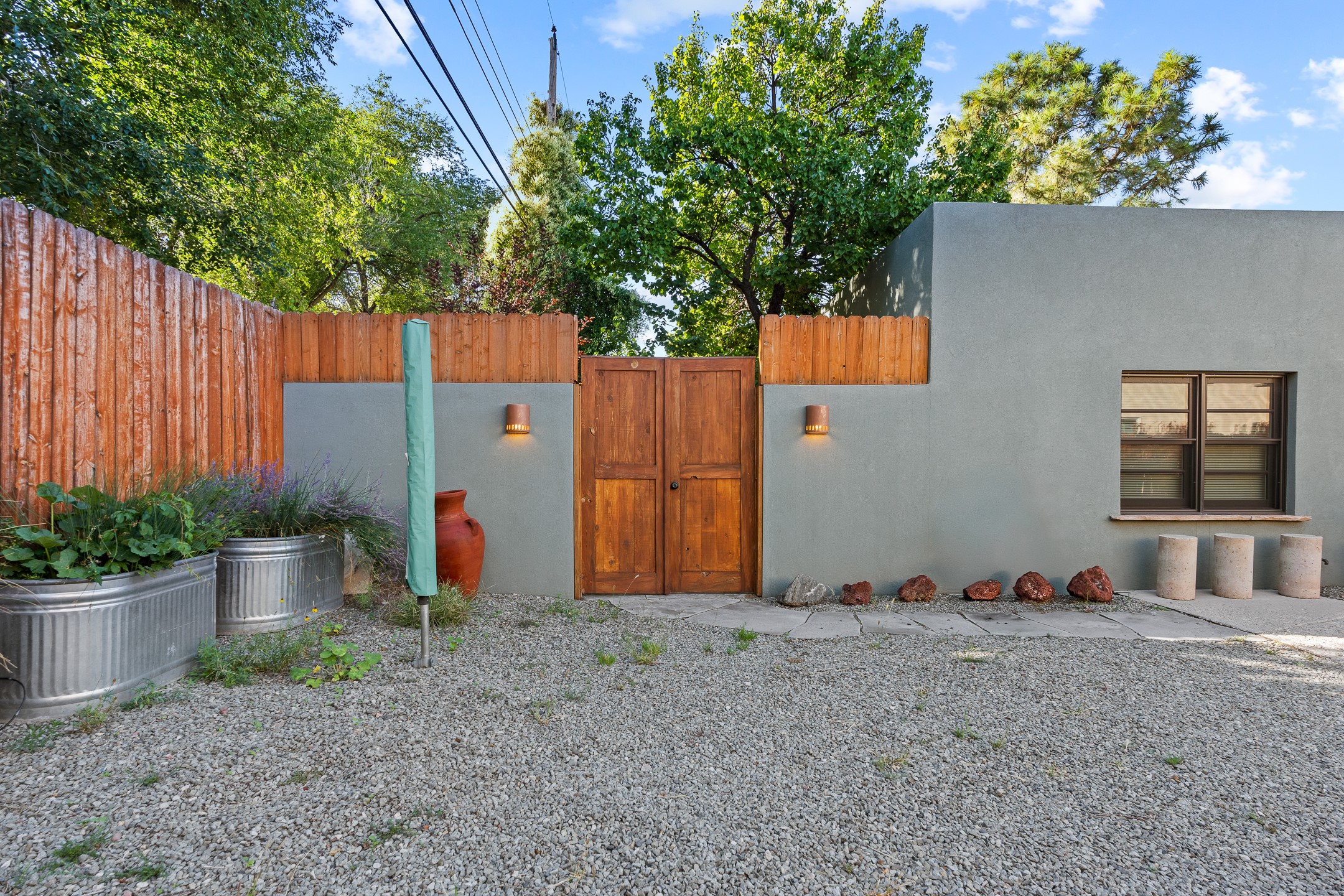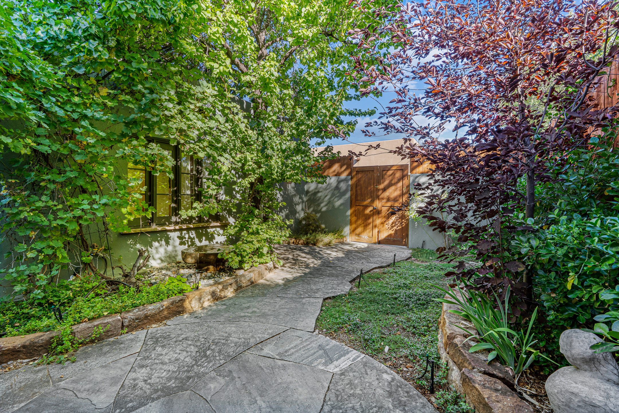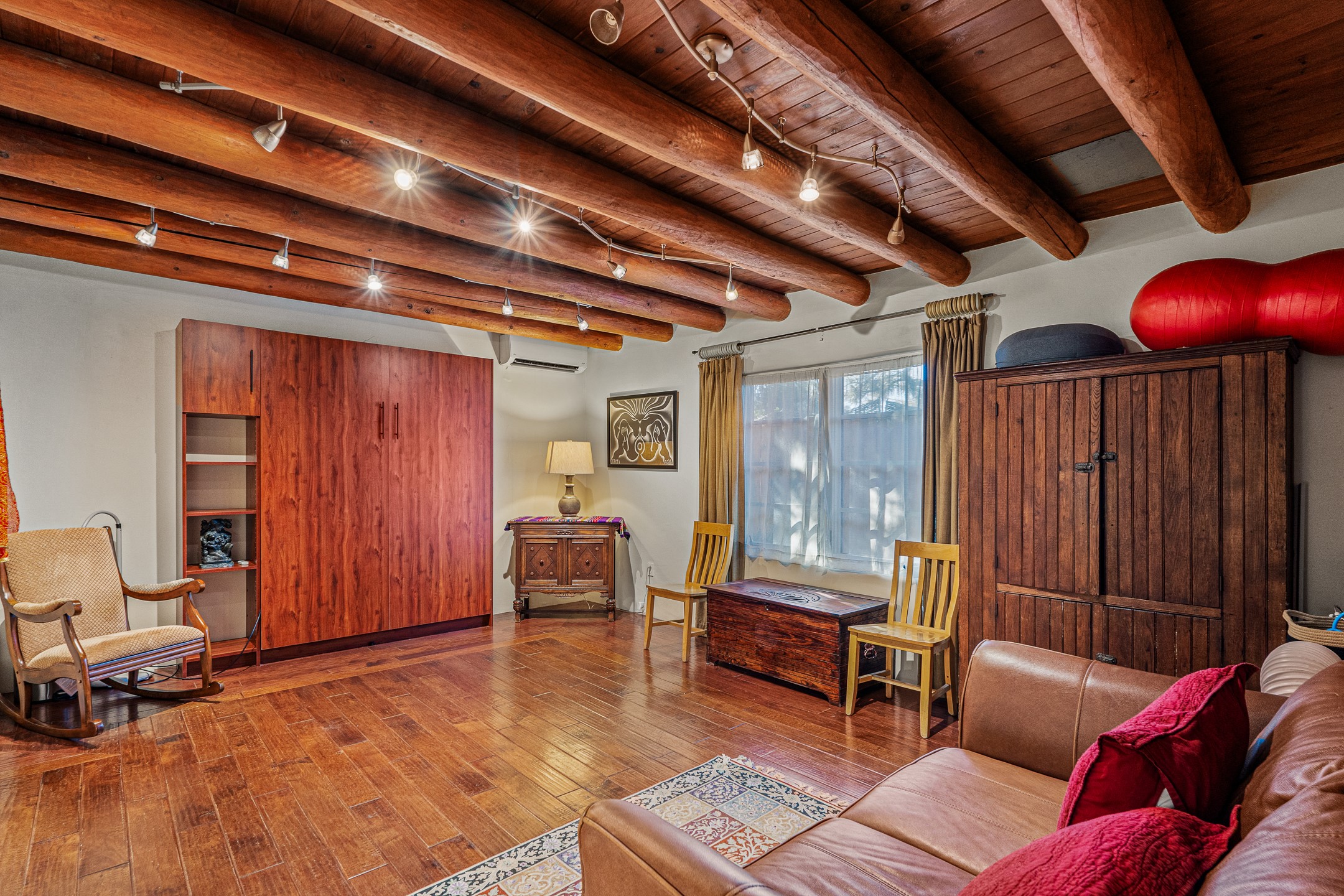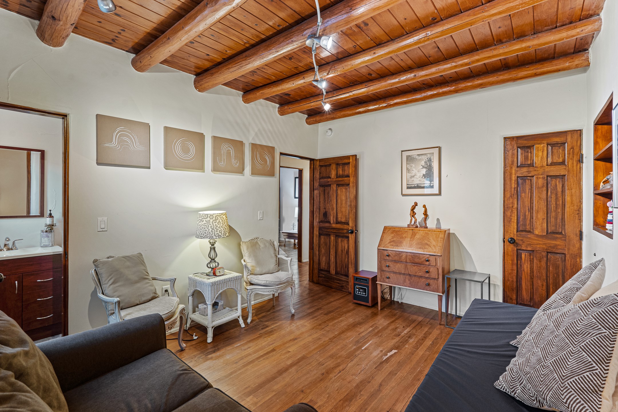 Beautifully renovated commercial property featuring sustainable, green design elements in the bustling S. St. Francis corridor, designed by Scott Irving. Step into a welcoming reception and waiting area with hardwood floors and viga ceilings throughout. The front of the building includes three windowed offices and two restrooms, one of which is ADA accessible. The updated kitchen/breakroom features track lighting and modern appliances.Toward the back of the building, you'll find a private office with an en suite restroom and hardwood floors, along with a large office or conference room that opens to a private, fenced, landscaped courtyard shaded by mature trees. Additional features include washer/dryer connections, abundant storage, and on-site parking. This property is ideal for office users, medical professionals, and many other business types. Don't miss this opportunity!