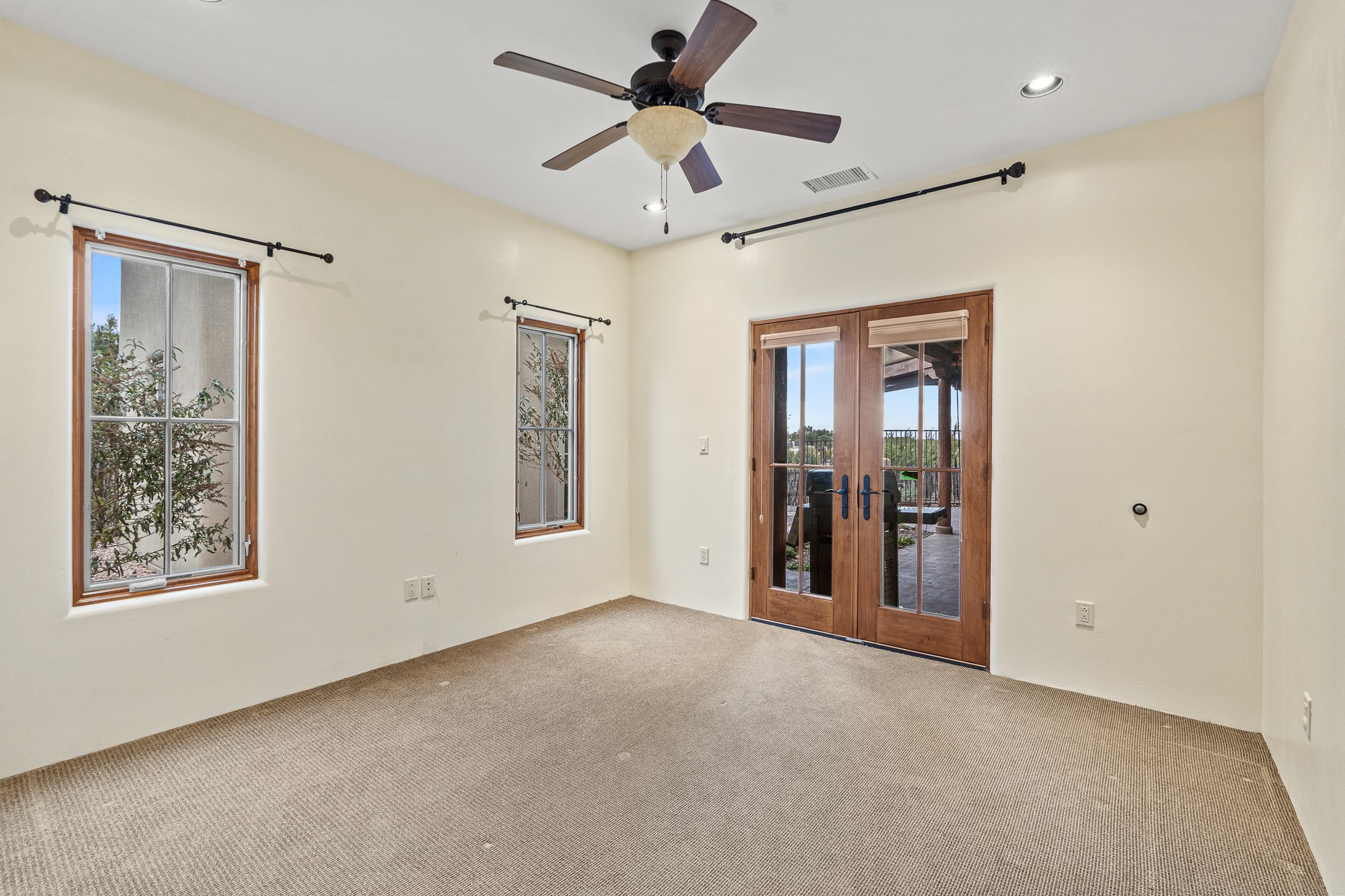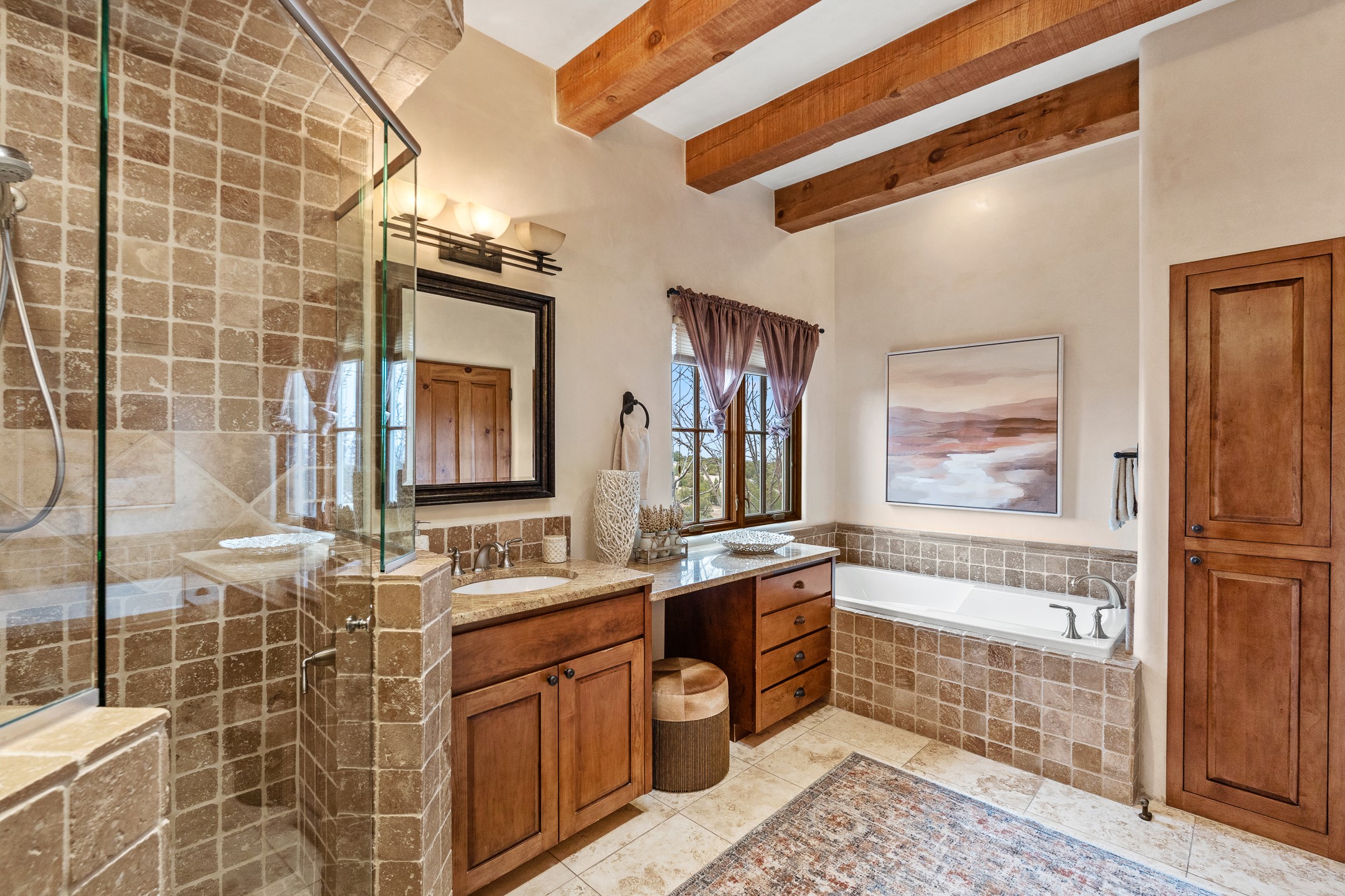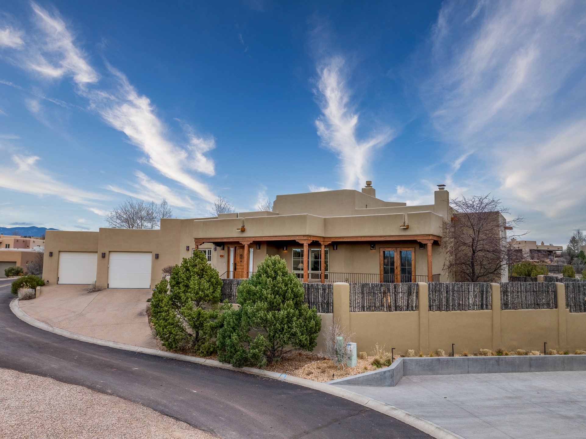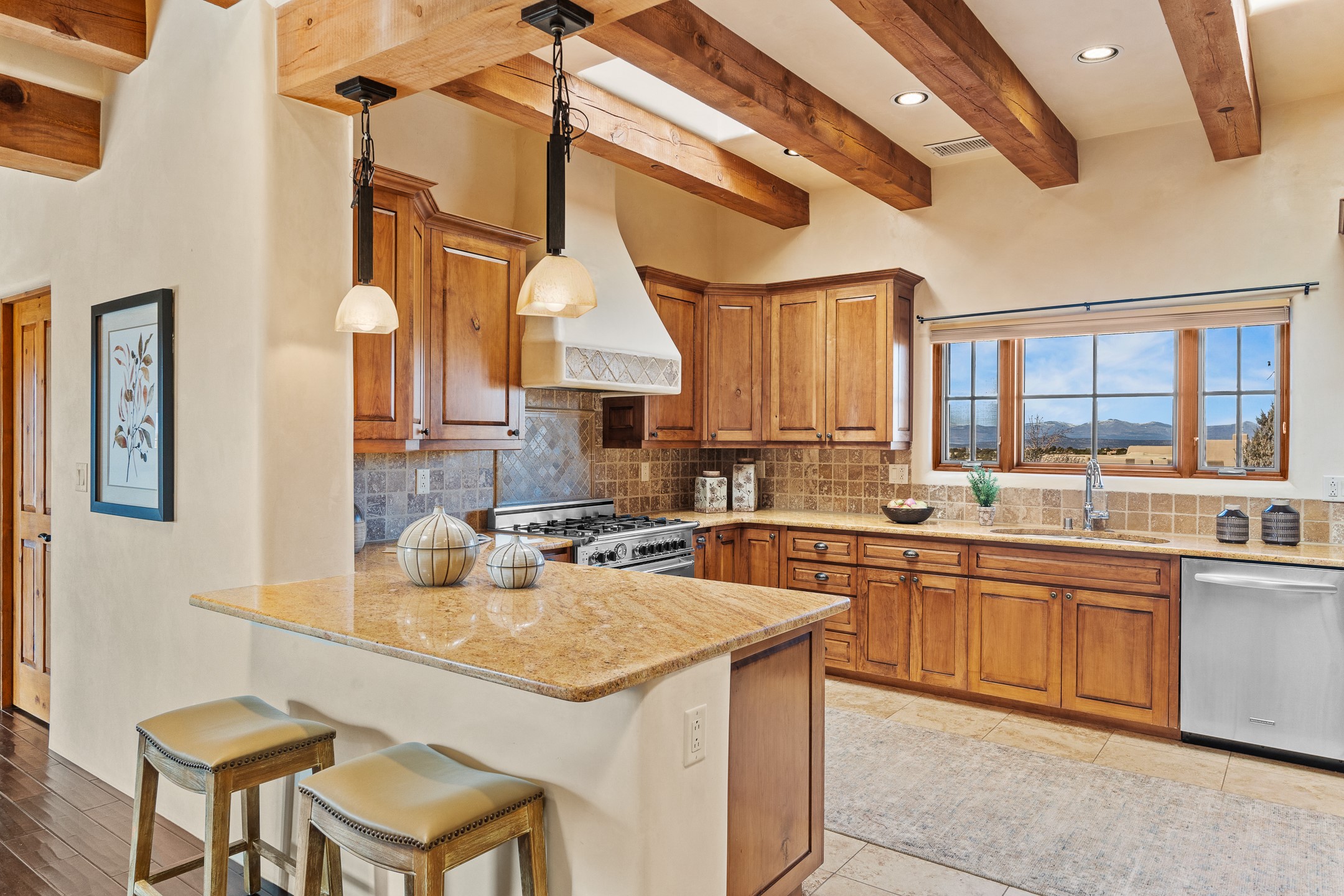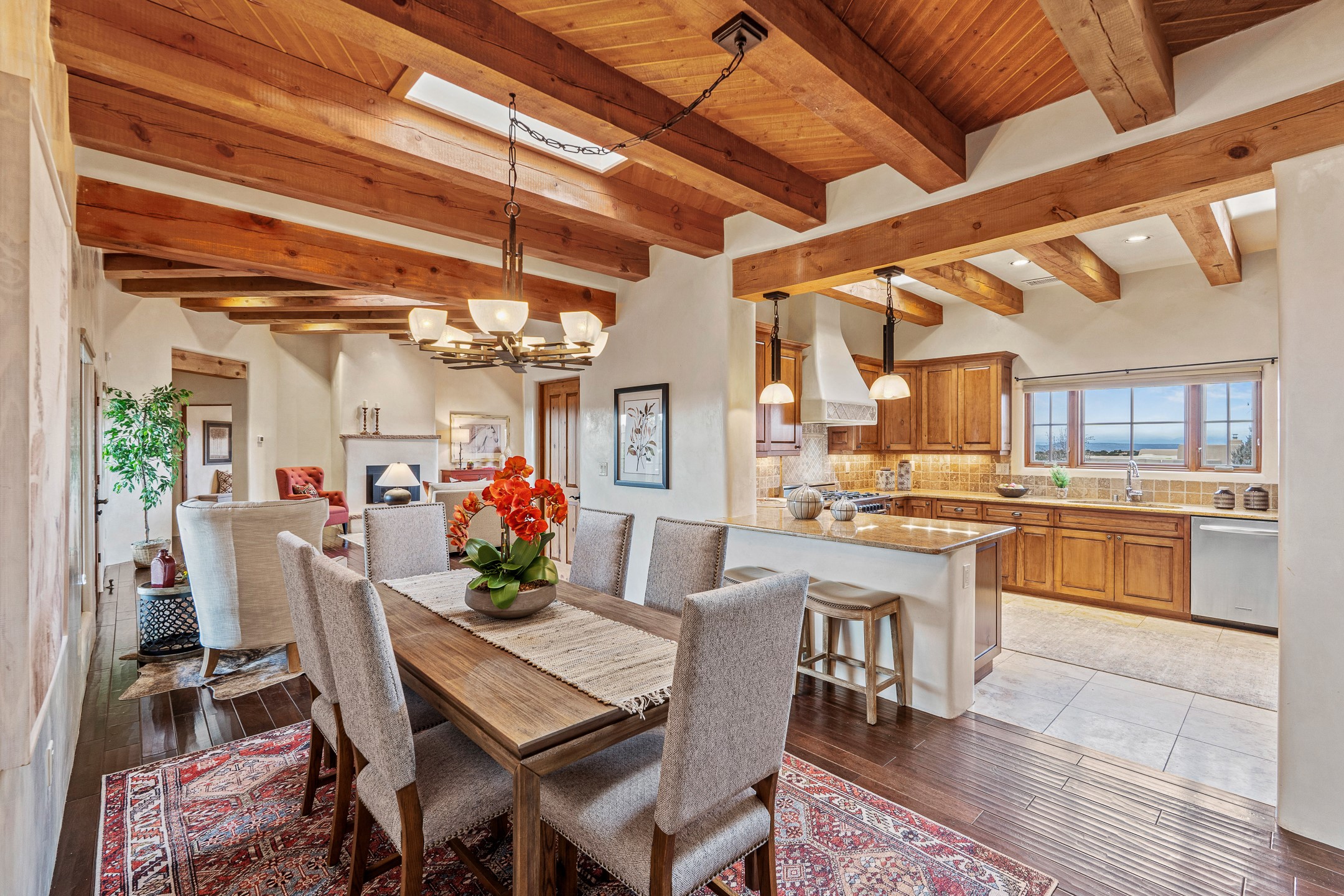 You will fall in love with this stunning Santa Fe-style home, perfectly positioned in the highly sought-after Aldea de Santa Fe community. Set on a quiet cul-de-sac and backing to open space, this property offers exceptional peace, privacy, and breathtaking views in every direction.The 2,635-square-foot residence features 4 bedrooms and 3.5 bathrooms, with three bedrooms located in the main house and a beautifully appointed detached guest casita. Ideal for visitors or extended stays, the casita includes an en-suite bathroom and a convenient coffee bar, and is comfortably heated and cooled by a mini-split system.Enjoy unforgettable sunsets over the Jemez Mountains from the welcoming front portals, while the backyard captures sweeping views of the Sandia Mountains. Indoor and outdoor living blend seamlessly, creating the perfect setting for both quiet mornings and evening gatherings.Inside, the home showcases gorgeous Santa Fe finishes throughout, including hand-troweled plaster walls, wood beam ceilings, and a combination of wood and travertine flooring. The spacious cook's kitchen is designed to impress, featuring rich alder cabinetry, granite countertops, stainless steel appliances, and an Italian gas range. A large walk-in pantry provides ample storage for all your culinary needs.Comfort and warmth are found throughout the home with radiant in-floor heating and air conditioning in the main house. Two gas-burning fireplaces--one in the living room and one in the primary bedroom--add ambiance and coziness on cool winter nights.The oversized garage offers exceptional flexibility, with a tandem garage on one side and a single-car garage on the other--perfect for vehicles, storage, or hobbies.This exceptional home combines timeless Santa Fe style, modern comfort, and unparalleled views, all in one of Santa Fe's most desirable neighborhoods. Community center, pickle ball, tennis and basket ball courts, 13 miles of walking trails, community events.