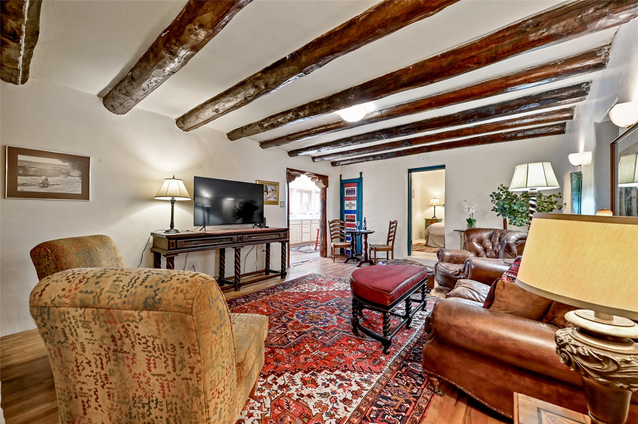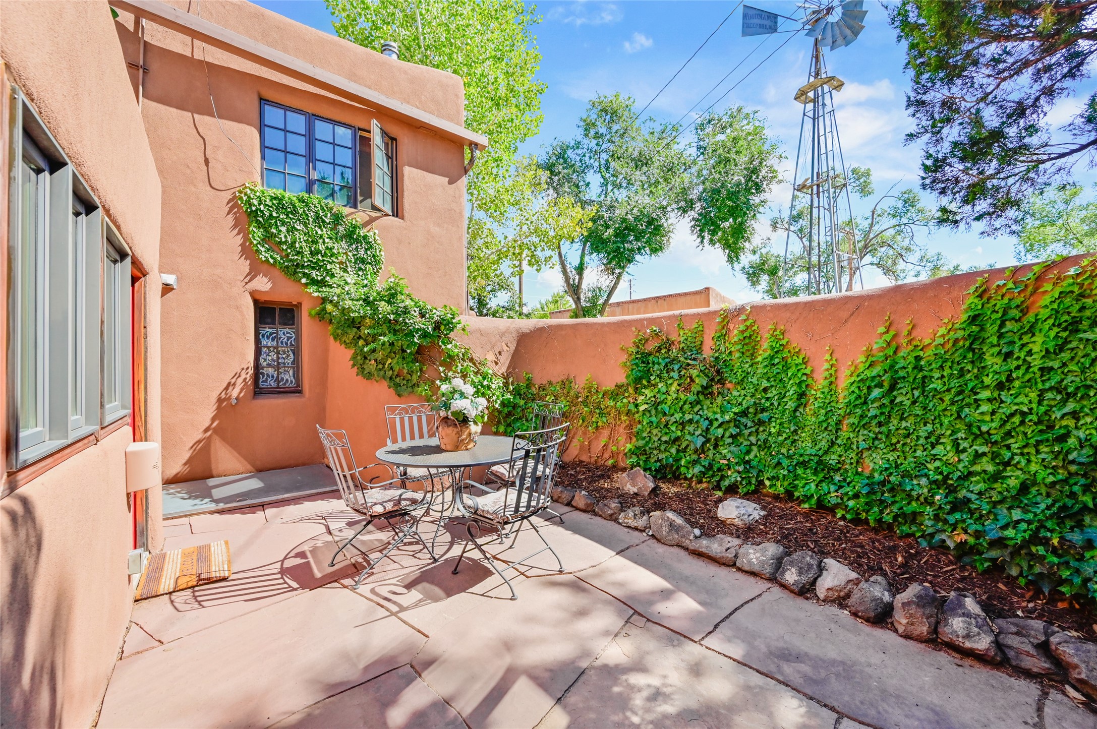 Step into Old World charm with this one-bedroom condo, part of a Pueblo-style adobe dating back to 1921. Outdoor private patio entrance greets you with south facing light. The four large windows bring warm sunlight to the tiled countertop and red bricked floor kitchen. Large dining and living room area offers beautiful old vigas and wood flooring. The pull-out Murphy bed, hidden in the living room, is perfect for those out of town guests or late night sleep-overs. Whimsical hand painted doors throughout pairs beautifully with the colorful mosaic fireplace in the bedroom. Just minutes from Kaune's and the historic Santa Fe Plaza, make this an ideal location for living the Santa Fe dream.