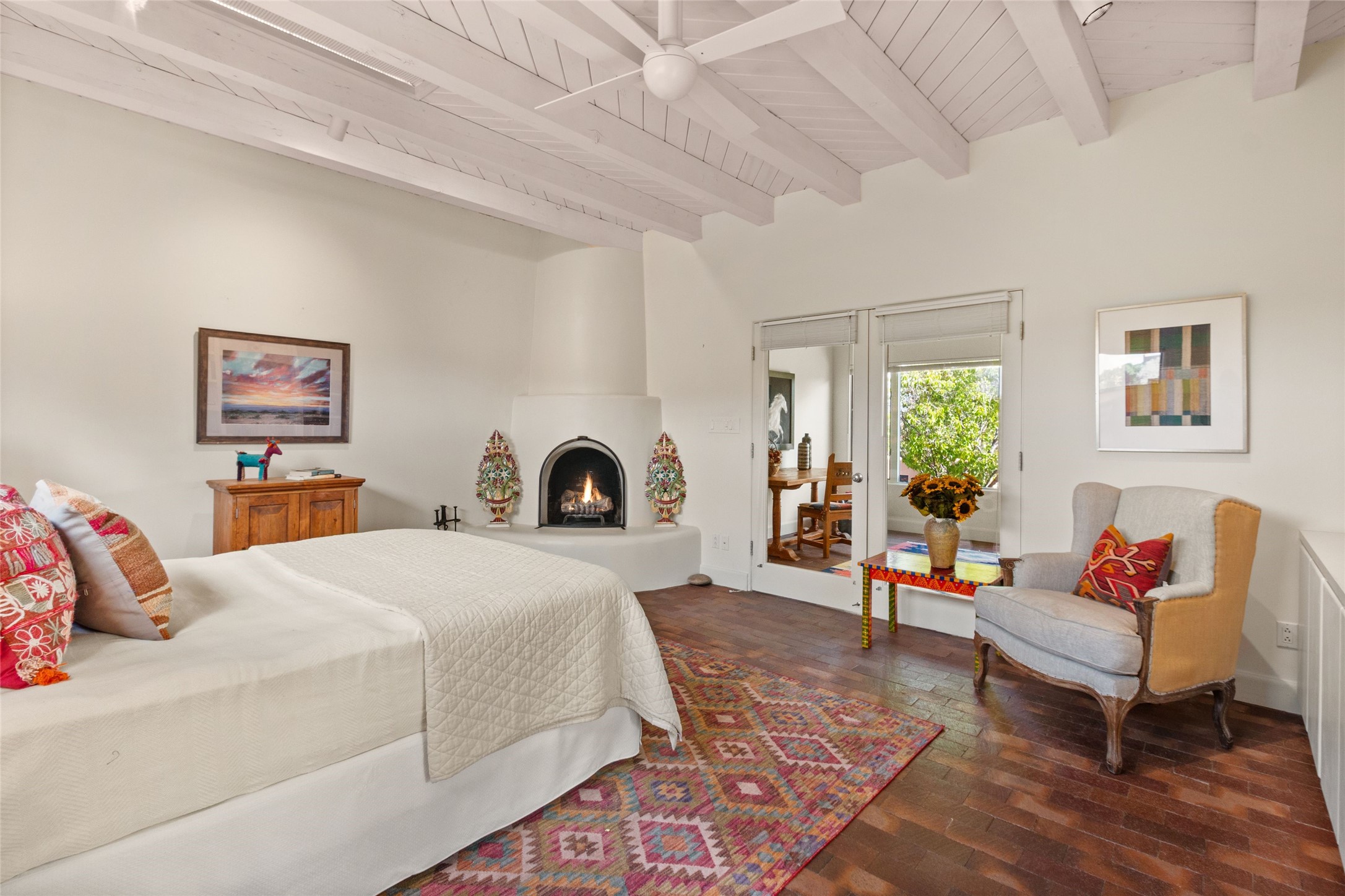 The story goes that when John Crosby (the original developer and founder of the Santa Fe Opera) chose a lot for their model, he chose this interior Casas de San Juan lot due to it's seclusion, privacy, and spectacular views. The main house, separate guest house, and heated swimming pool are singular in the condominium configuration in the subdivision. The living room features a high ceiling and glass window wall the inspire "Wow" when one walks in the home...it also features a wet bar, corner kiva fireplace, and a wall for media. The newly installed/renovated kitchen (by renowned kitchen designer Jeanne') features stone counter tops, Sub-Zero and Kitchen Aid appliances with a range/oven and a 2nd oven for big togethers. The kitchen space features high ceilings and lots of light. The over-sized Primary suite again features the views, a corner kiva fireplace, and a beautifully renovated full bath with separate tub and shower. The second large bedroom suite is on the other end of the home for privacy, and the home is rounded out by a 3rd bedroom and hallway full bath. The separate guest house sits atop the garage and is a welcome retreat from the main house with lots of space, privacy and comfort. To the east of the main part of the home is a large courtyard/garden area that provides plenty of options for outdoor living. And the large lap pool (41 x 12) sits to the north and is fenced in with a cabana, kiva fireplace and a barbecue area. The home has forced air heat and refrigerated air conditioning, w/ supplemental heat & AC via mini-split in the north bedroom suite and in the guest house. The home has a wired sound system, and utilizes a shared well and septic via the HOA. Casas de San Juan is a gated subdivision accessed by the Main Entrance front gate staffed during the day for added Security.