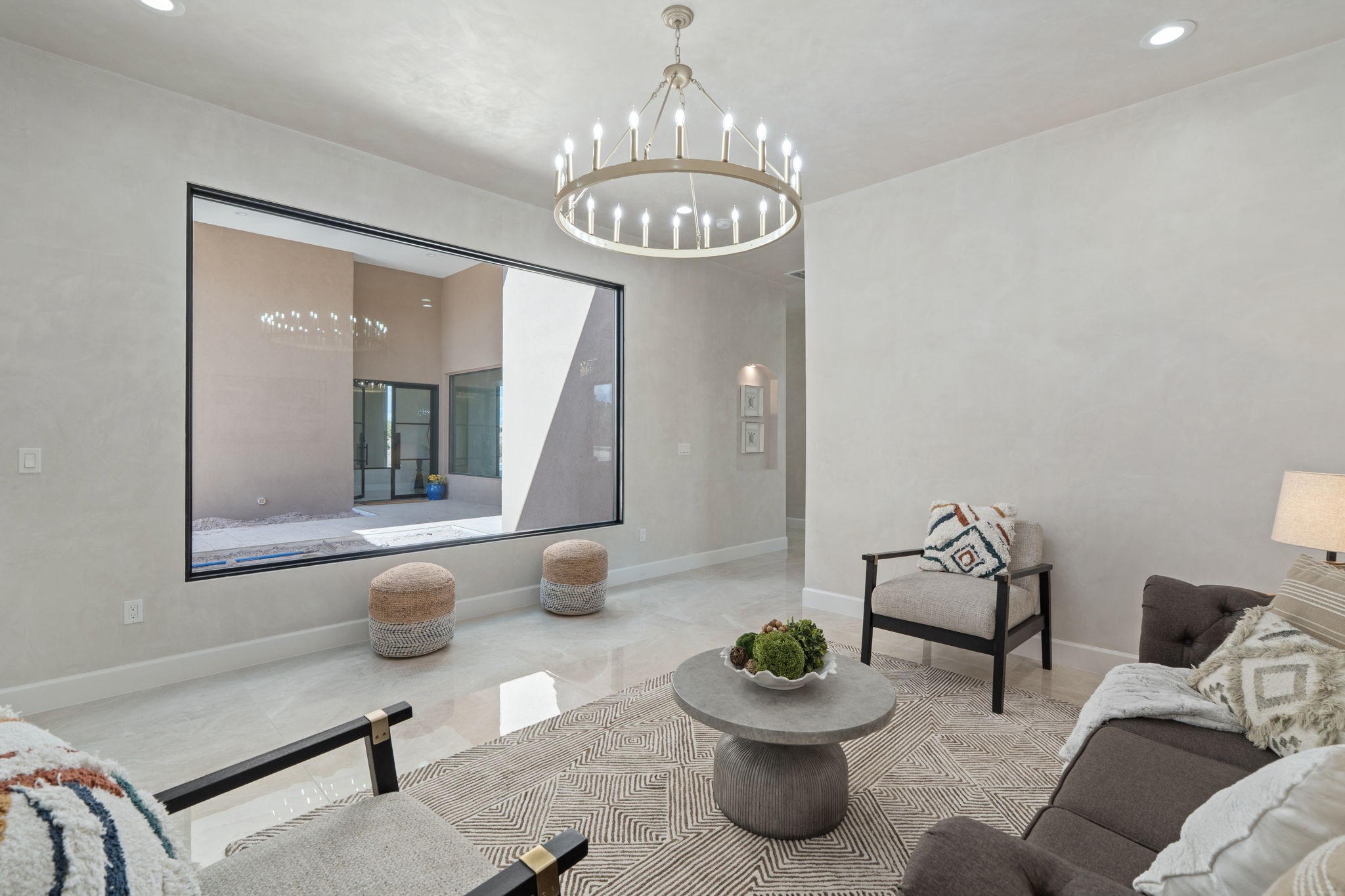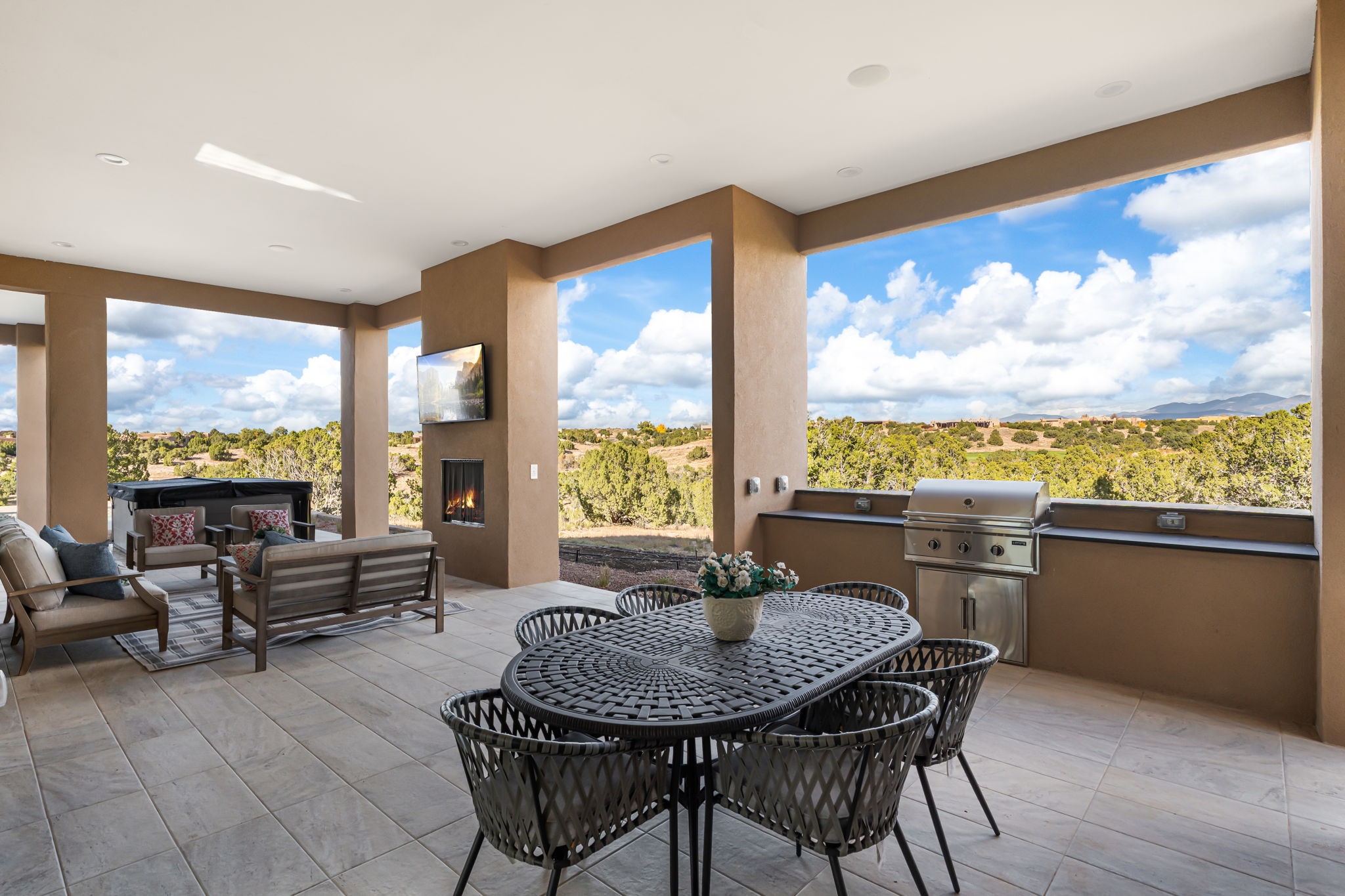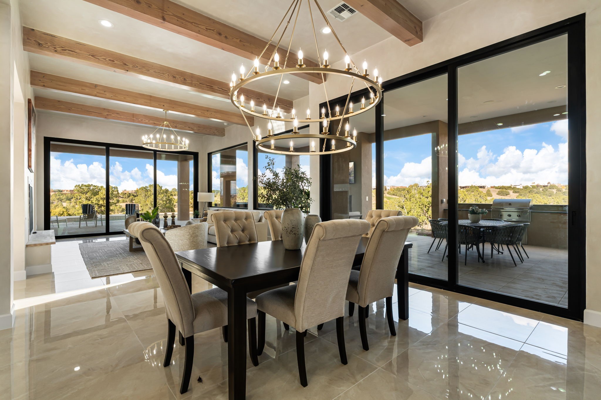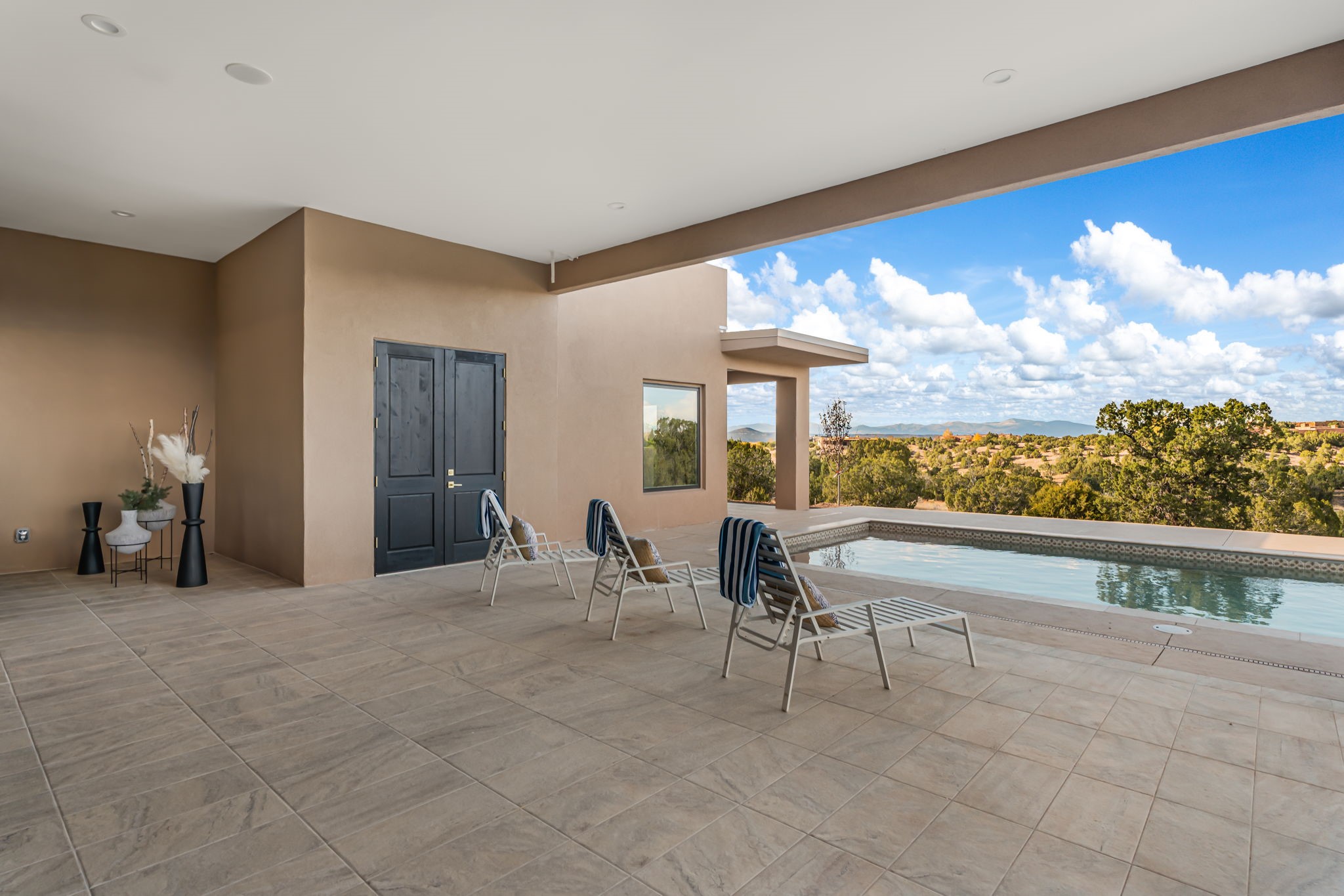 Nestled in the prestigious Las Campanas community of Santa Fe, this newly built custom single story estate blends modern elegance with timeless Southwestern charm. Perched to overlook the lush fairways of the world-class golf course and endless views of the Sangre De Cristo Mountains , the home offers an unmatched lifestyle of sophistication and serenity. As one of the few residences approved for a private pool, it also features a soothing hot tub for year-round enjoyment. Expansive outdoor living spaces are paired with built-in speakers both inside and out, creating the perfect setting for entertaining or relaxing. Inside, enjoy breathtaking views through oversized Pella windows spanning more than 10 feet wide. The chef's kitchen is outfitted with high-end appliances, a spacious island, and refined finishes. The master suite and main living areas are enhanced with radiant in-floor heating for comfort in every season, while each bathroom has been individually designed with custom touches, including built-in mood lighting in the showers. Practicality meets luxury with a fully outfitted laundry room, mudroom entry from the garage, and an oversized epoxy-coated garage ideal for vehicles and recreational toys. Additional details such as Venetian plaster walls and thoughtful design elements throughout make this home truly one of a kind. Built by Candelaria Homes, you 'll know you made the right choice. Golf course views are of the 12th and 13th holes. Don't miss this rare opportunity in Santa Fe's most sought-after enclave offers a retreat of elegance, comfort, and distinction.