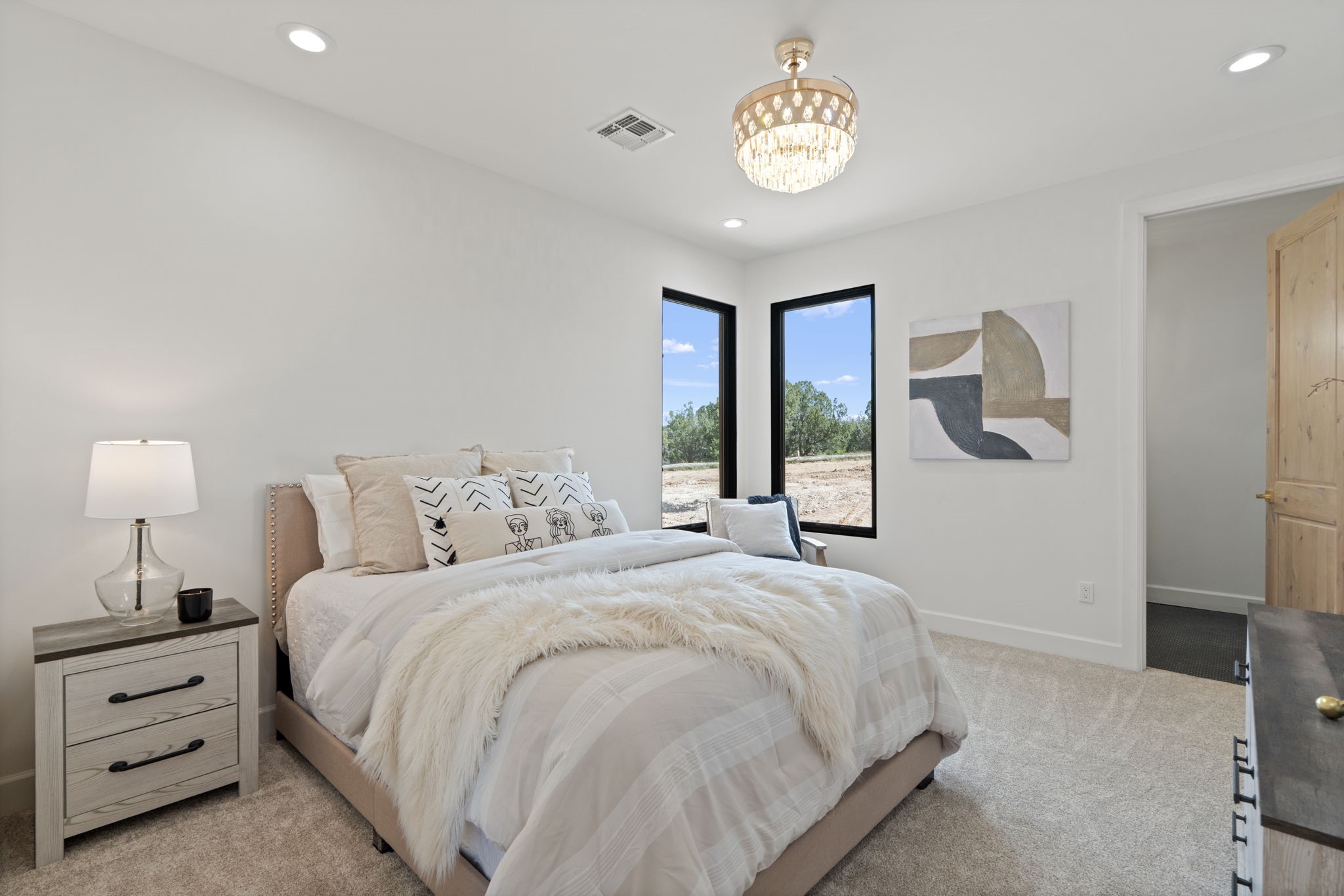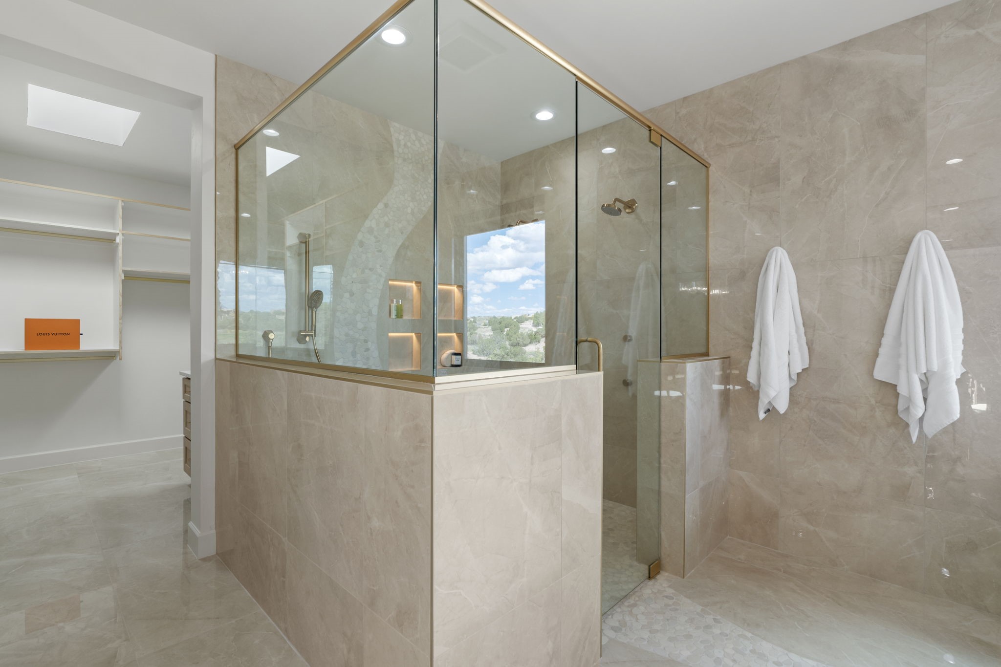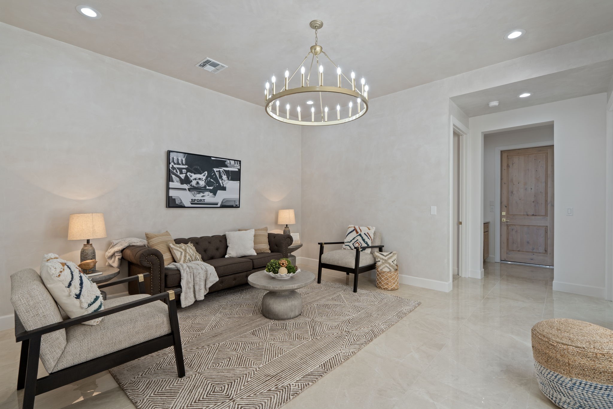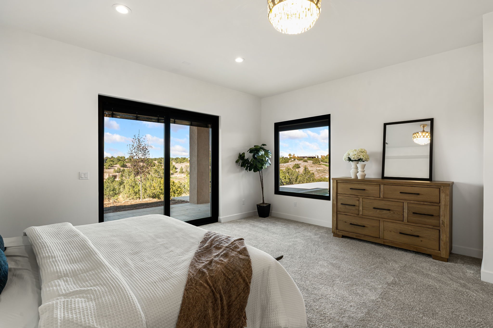 Nestled in the prestigious Las Campanas community of Santa Fe, this newly built custom single story estate blends modern elegance with timeless Southwestern charm. Perched to overlook the lush fairways of the world-class golf course and endless views of the Sangre De Cristo Mountains , the home offers an unmatched lifestyle of sophistication and serenity. As one of the few residences approved for a private pool, it also features a soothing hot tub for year-round enjoyment. Expansive outdoor living spaces are paired with built-in speakers both inside and out, creating the perfect setting for entertaining or relaxing. Inside, enjoy breathtaking views through oversized Pella windows spanning more than 10 feet wide. The chef's kitchen is outfitted with high-end appliances, a spacious island, and refined finishes. The master suite and main living areas are enhanced with radiant in-floor heating for comfort in every season, while each bathroom has been individually designed with custom touches, including built-in mood lighting in the showers. Practicality meets luxury with a fully outfitted laundry room, mudroom entry from the garage, and an oversized epoxy-coated garage ideal for vehicles and recreational toys. Additional details such as Venetian plaster walls and thoughtful design elements throughout make this home truly one of a kind. Built by Candelaria Homes, you 'll know you made the right choice. Golf course views are of the 12th and 13th holes. Don't miss this rare opportunity in Santa Fe's most sought-after enclave offers a retreat of elegance, comfort, and distinction.