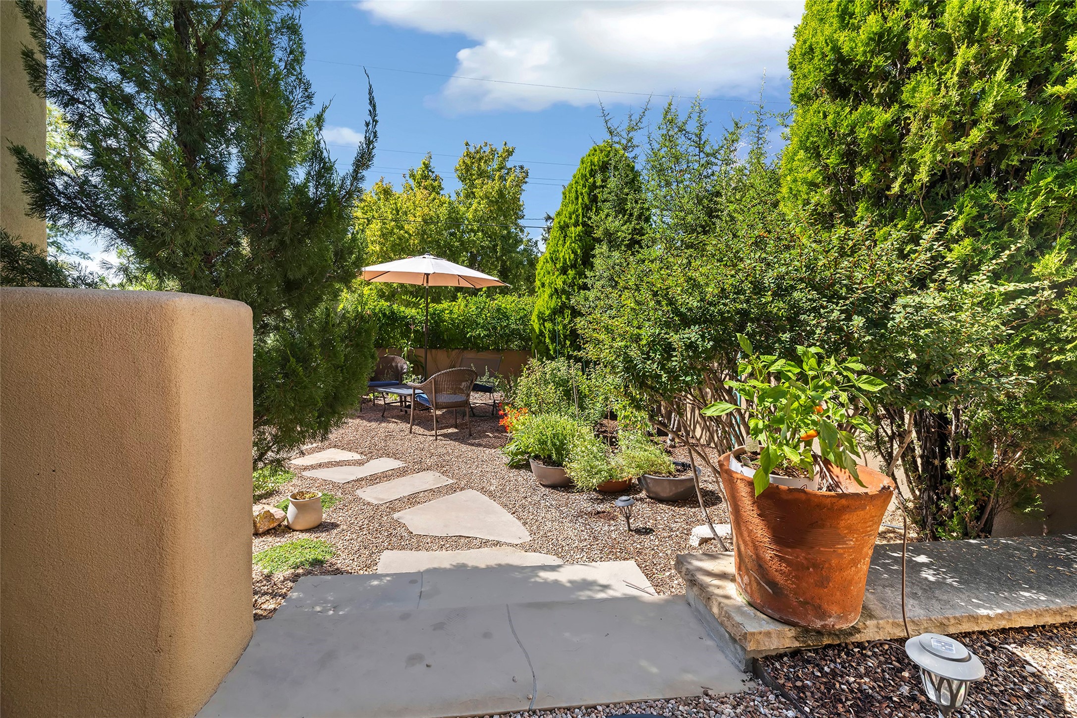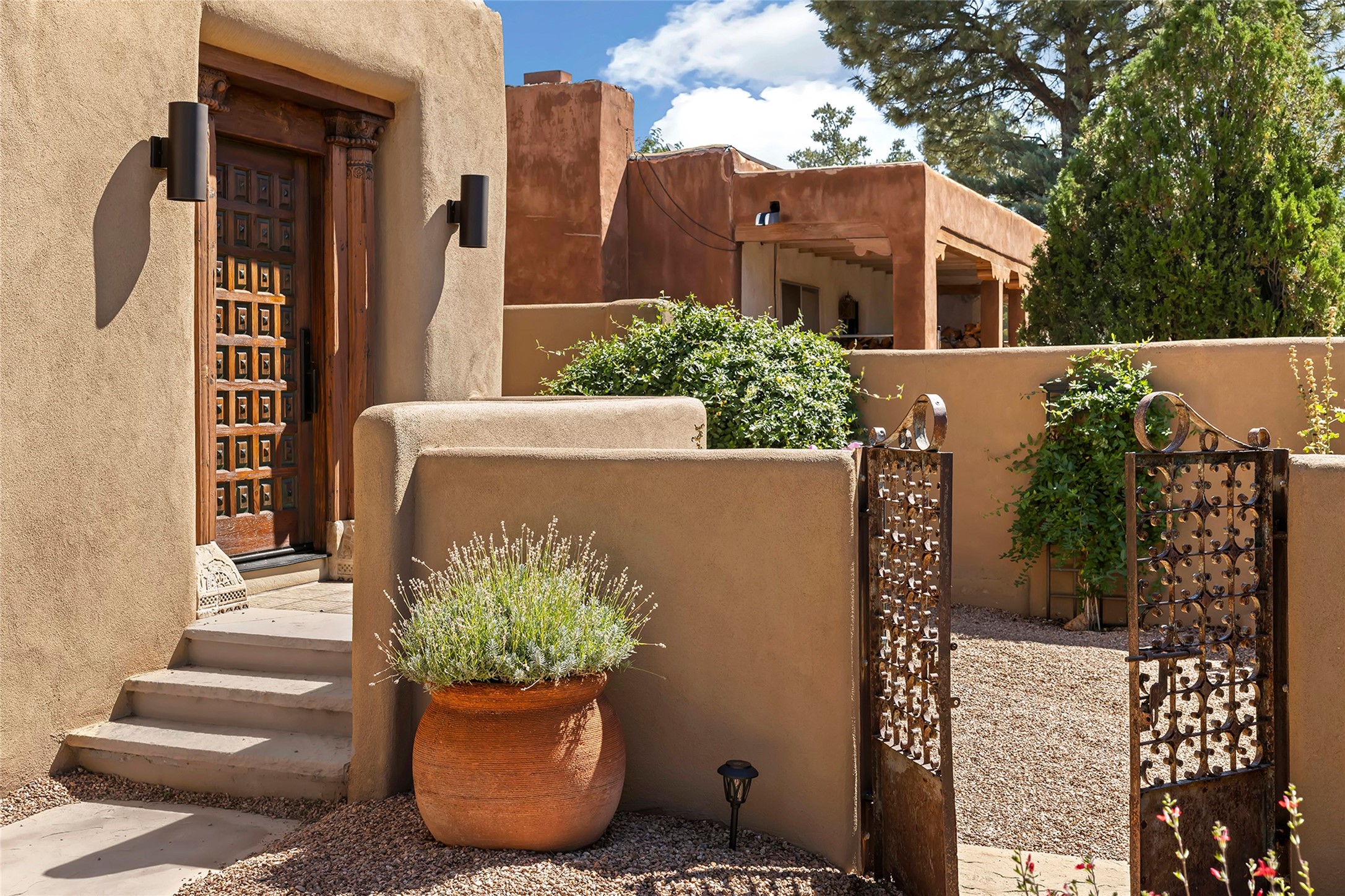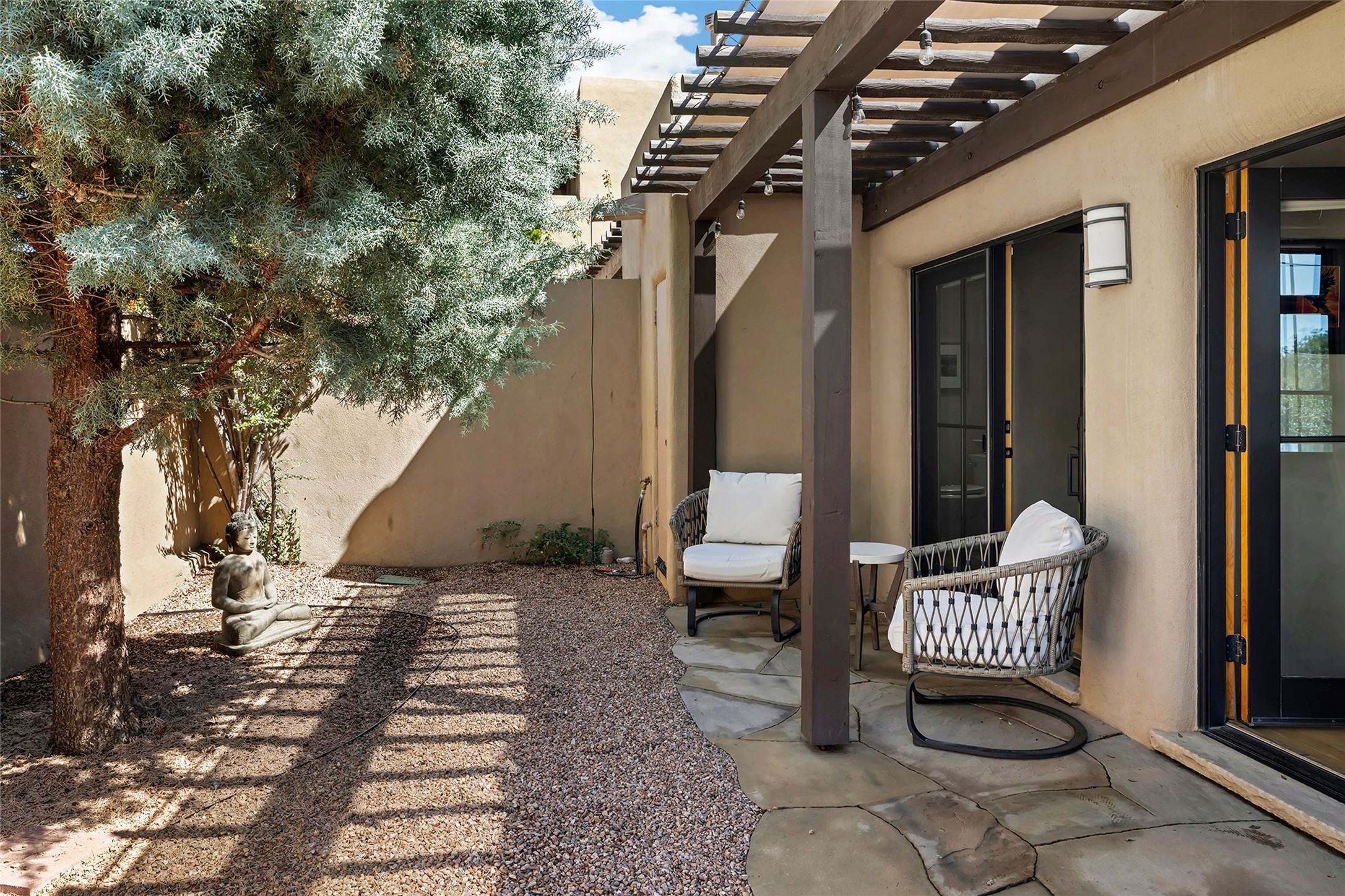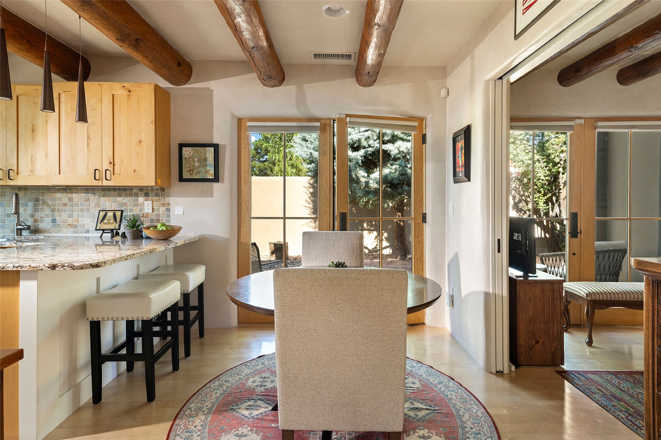 Just steps from the historic Santa Fe Plaza, this exquisite and beautifully updated Juniper Terrace condominium captures the essence of timeless Santa Fe architecture enhanced by sophisticated modern updates. Set within one of the city's most desirable locations, this rare single-level, two-bedroom, two-bath residence offers a seamless blend of style, comfort, and authenticity. The home's inviting living room, anchored by rich vigas and a grand central fireplace, creates a warm and elegant gathering space. The modern chef's kitchen, designed for both beauty and functionality, features granite countertops, high-end appliances, and a breakfast bar that opens gracefully to the dining area and expansive outdoor entertaining spaces. The private owner's suite is a serene retreat, featuring a spa-inspired bath with a jetted tub/shower, and direct access to a secluded patio. The guest suite, complete with its own ensuite bath and private patio access, provides versatility for hosting guests or creating a personal workspace. Multiple enclosed courtyards and lushly landscaped patios invite year-round outdoor living, enhanced by vibrant plantings and a tranquil water feature. Additional highlights include hardwood flooring, creamy plaster walls, rich vigas throughout, and convenient off-street parking. Offering both intimacy and sophistication, this remarkable property exemplifies the ultimate Santa Fe experience--just a short stroll from world-class dining, galleries, and the cultural heart of the city, this incredible home is not to be missed!