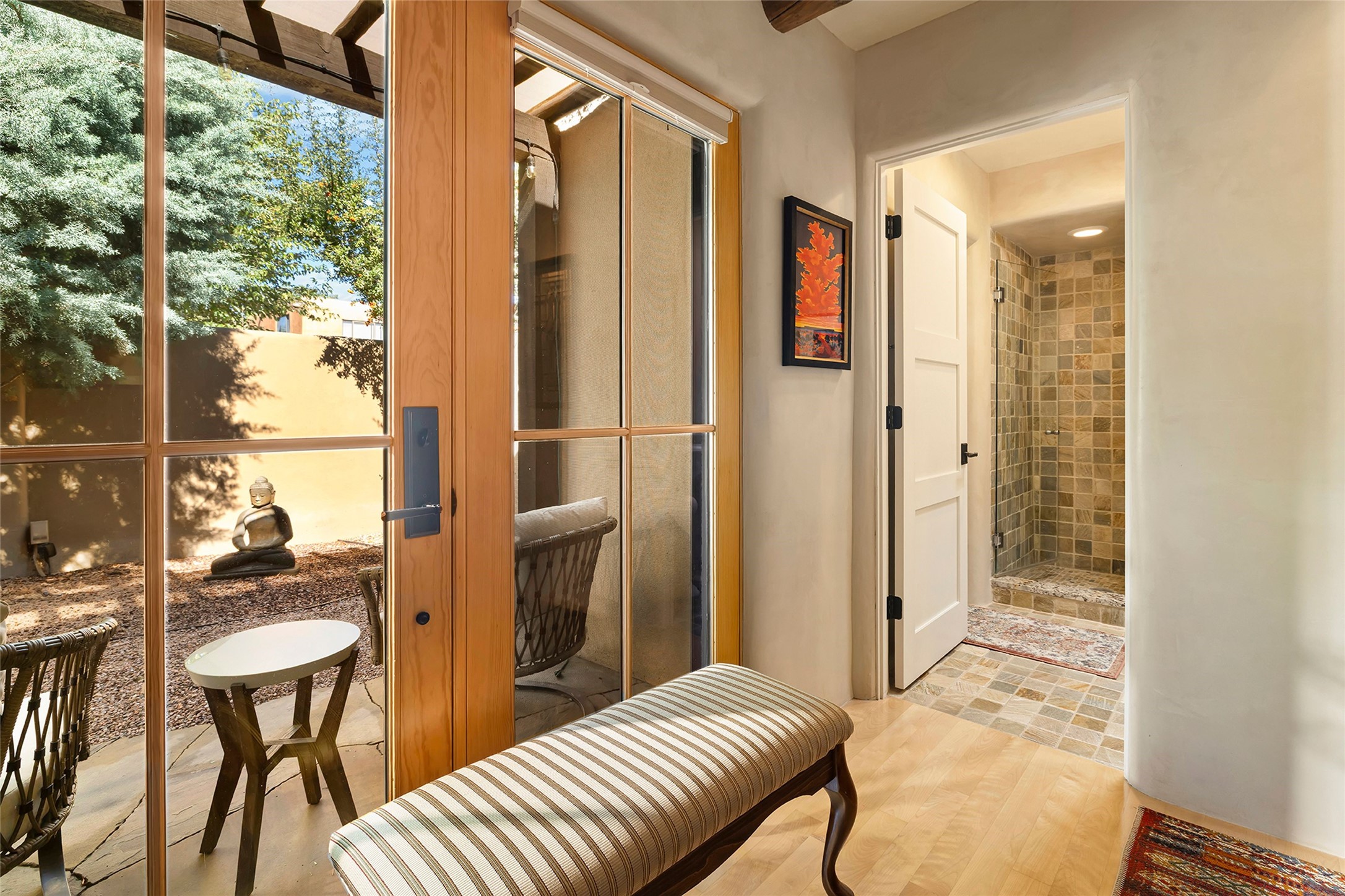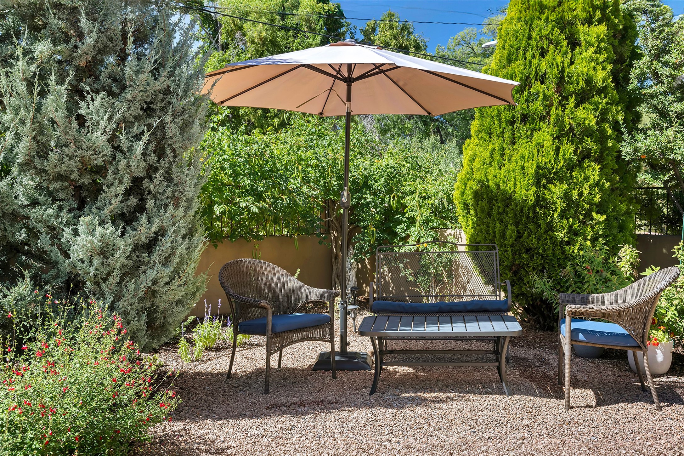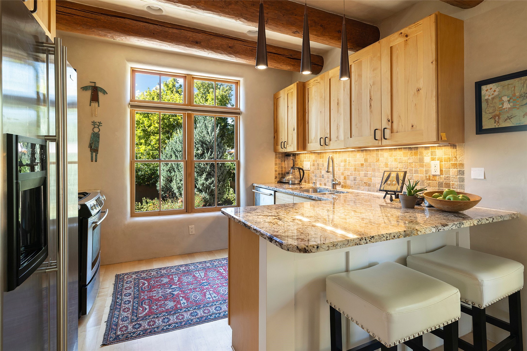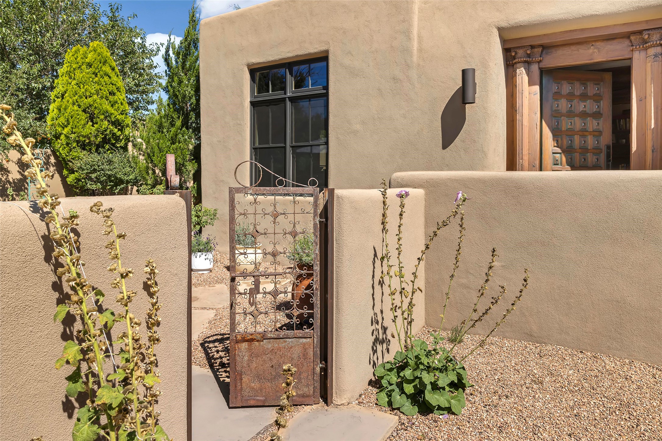 Just steps from the historic Santa Fe Plaza, this exquisite and beautifully updated Juniper Terrace condominium captures the essence of timeless Santa Fe architecture enhanced by sophisticated modern updates. Set within one of the city's most desirable locations, this rare single-level, two-bedroom, two-bath residence offers a seamless blend of style, comfort, and authenticity. The home's inviting living room, anchored by rich vigas and a grand central fireplace, creates a warm and elegant gathering space. The modern chef's kitchen, designed for both beauty and functionality, features granite countertops, high-end appliances, and a breakfast bar that opens gracefully to the dining area and expansive outdoor entertaining spaces. The private owner's suite is a serene retreat, featuring a spa-inspired bath with a jetted tub/shower, and direct access to a secluded patio. The guest suite, complete with its own ensuite bath and private patio access, provides versatility for hosting guests or creating a personal workspace. Multiple enclosed courtyards and lushly landscaped patios invite year-round outdoor living, enhanced by vibrant plantings and a tranquil water feature. Additional highlights include hardwood flooring, creamy plaster walls, rich vigas throughout, and convenient off-street parking. Offering both intimacy and sophistication, this remarkable property exemplifies the ultimate Santa Fe experience--just a short stroll from world-class dining, galleries, and the cultural heart of the city, this incredible home is not to be missed!