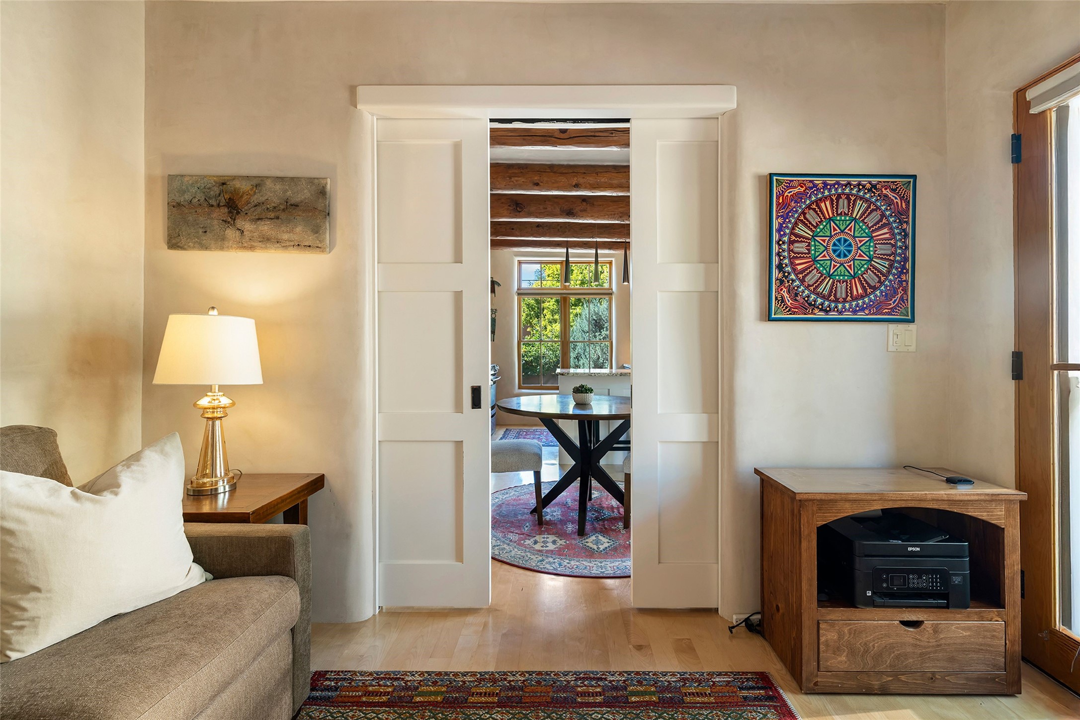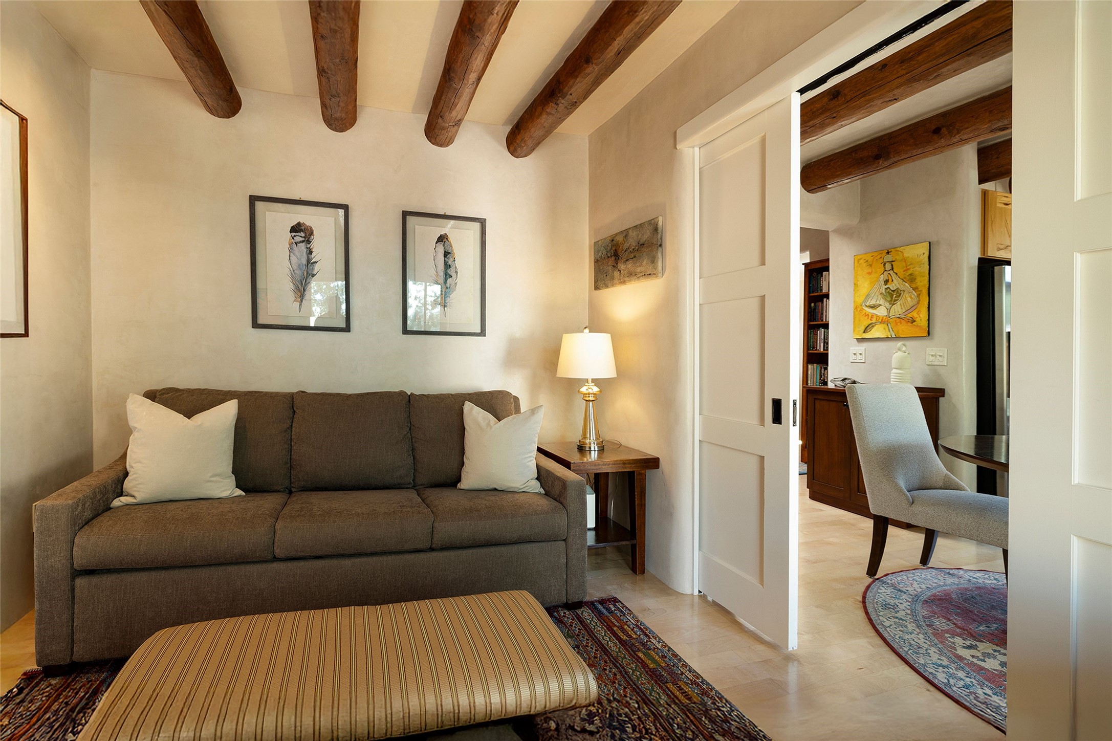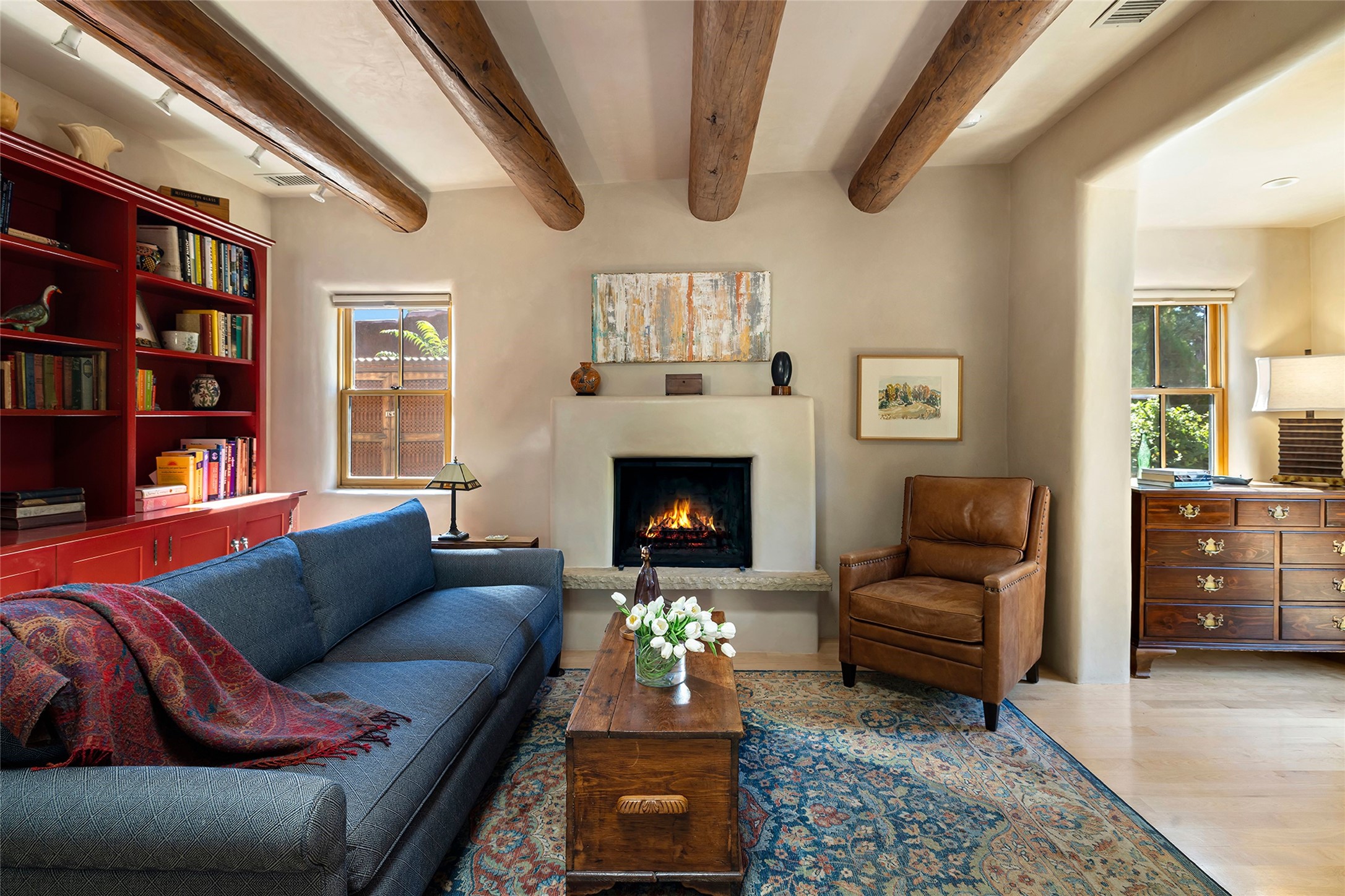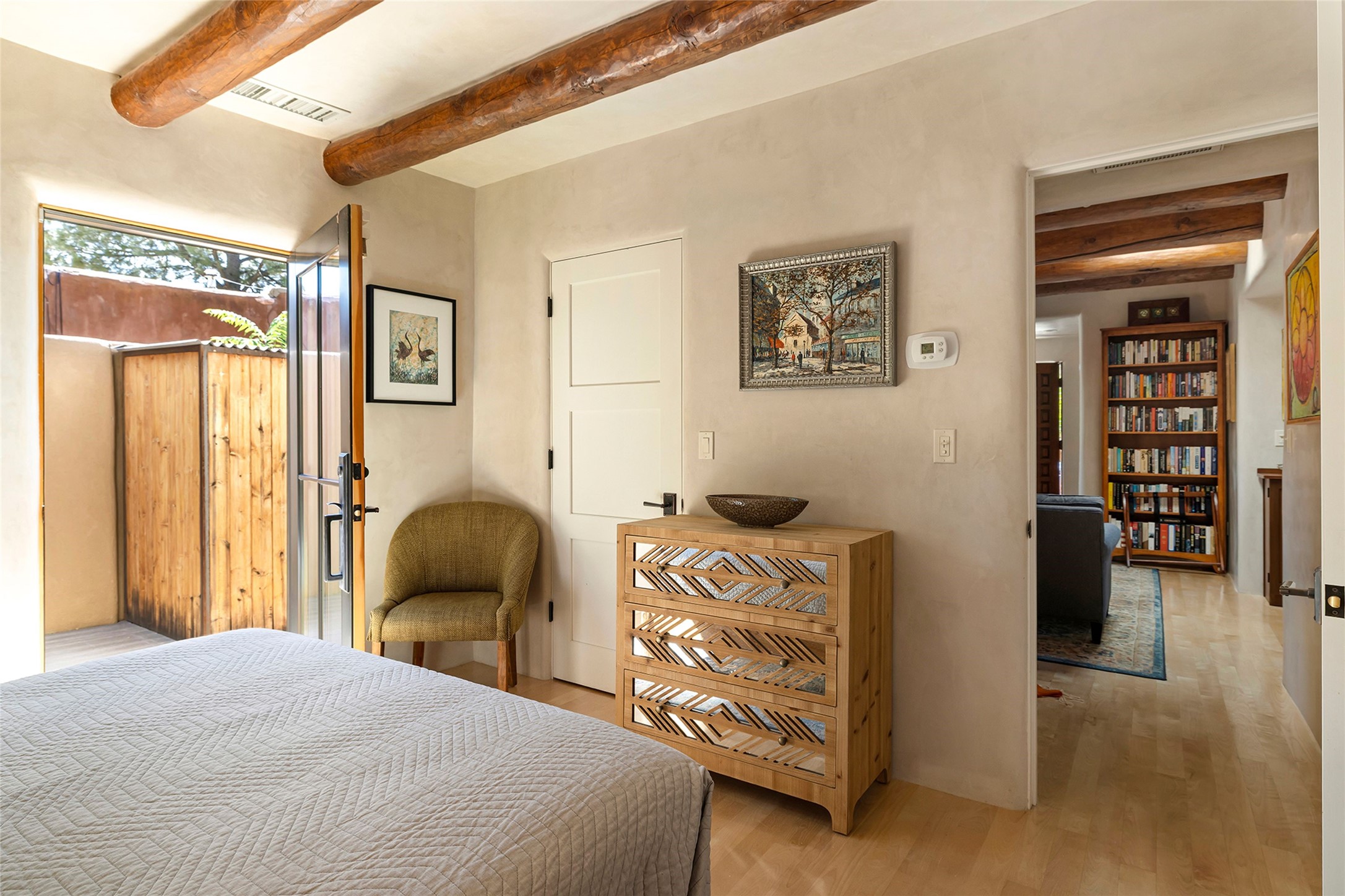Just steps from the historic Santa Fe Plaza, this exquisite and beautifully updated Juniper Terrace condominium captures the essence of timeless Santa Fe architecture enhanced by sophisticated modern updates. Set within one of the city's most desirable locations, this rare single-level, two-bedroom, two-bath residence offers a seamless blend of style, comfort, and authenticity. The home's inviting living room, anchored by rich vigas and a grand central fireplace, creates a warm and elegant gathering space. The modern chef's kitchen, designed for both beauty and functionality, features granite countertops, high-end appliances, and a breakfast bar that opens gracefully to the dining area and expansive outdoor entertaining spaces. The private owner's suite is a serene retreat, featuring a spa-inspired bath with a jetted tub/shower, and direct access to a secluded patio. The guest suite, complete with its own ensuite bath and private patio access, provides versatility for hosting guests or creating a personal workspace. Multiple enclosed courtyards and lushly landscaped patios invite year-round outdoor living, enhanced by vibrant plantings and a tranquil water feature. Additional highlights include hardwood flooring, creamy plaster walls, rich vigas throughout, and convenient off-street parking. Offering both intimacy and sophistication, this remarkable property exemplifies the ultimate Santa Fe experience--just a short stroll from world-class dining, galleries, and the cultural heart of the city, this incredible home is not to be missed!