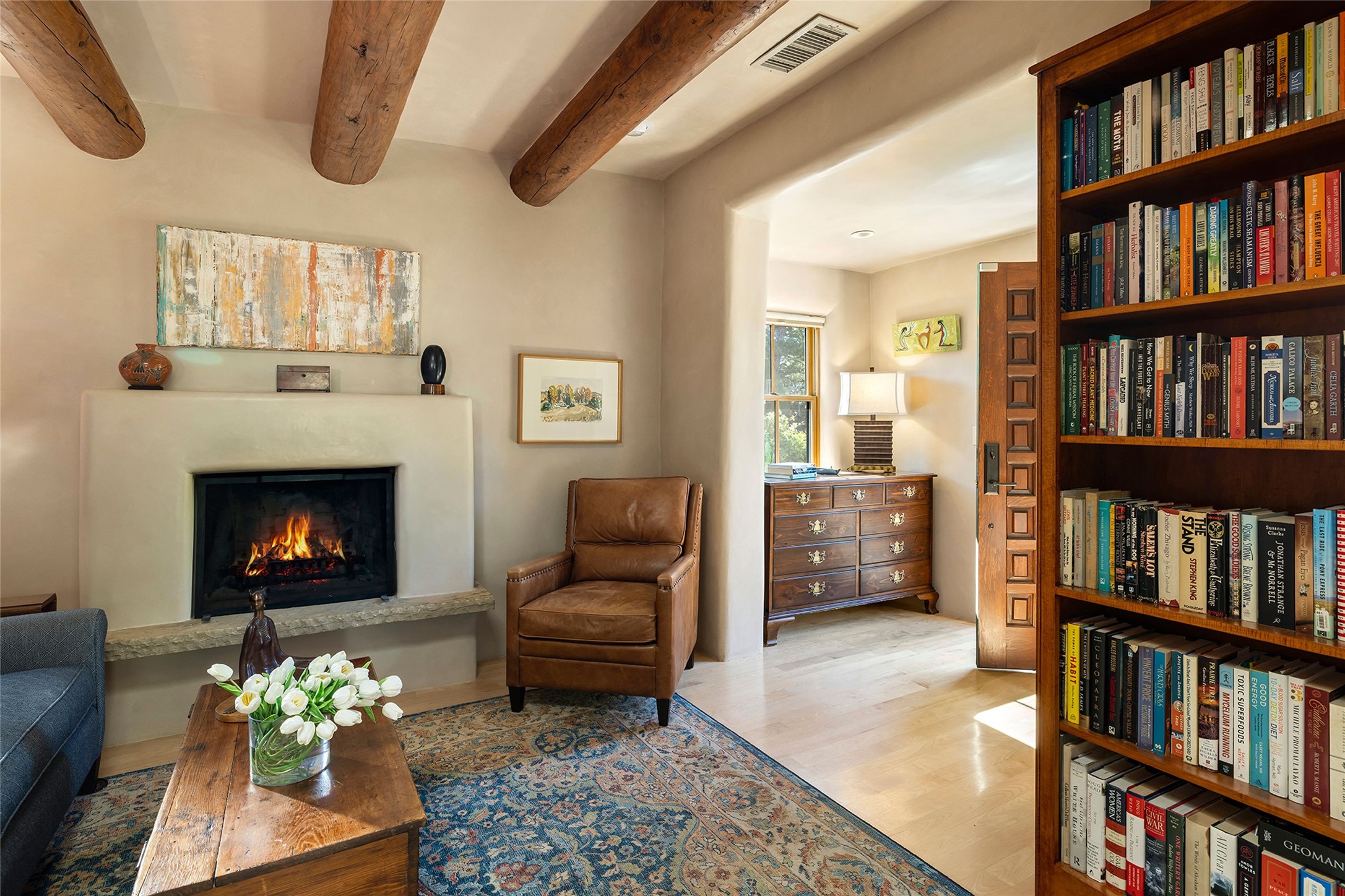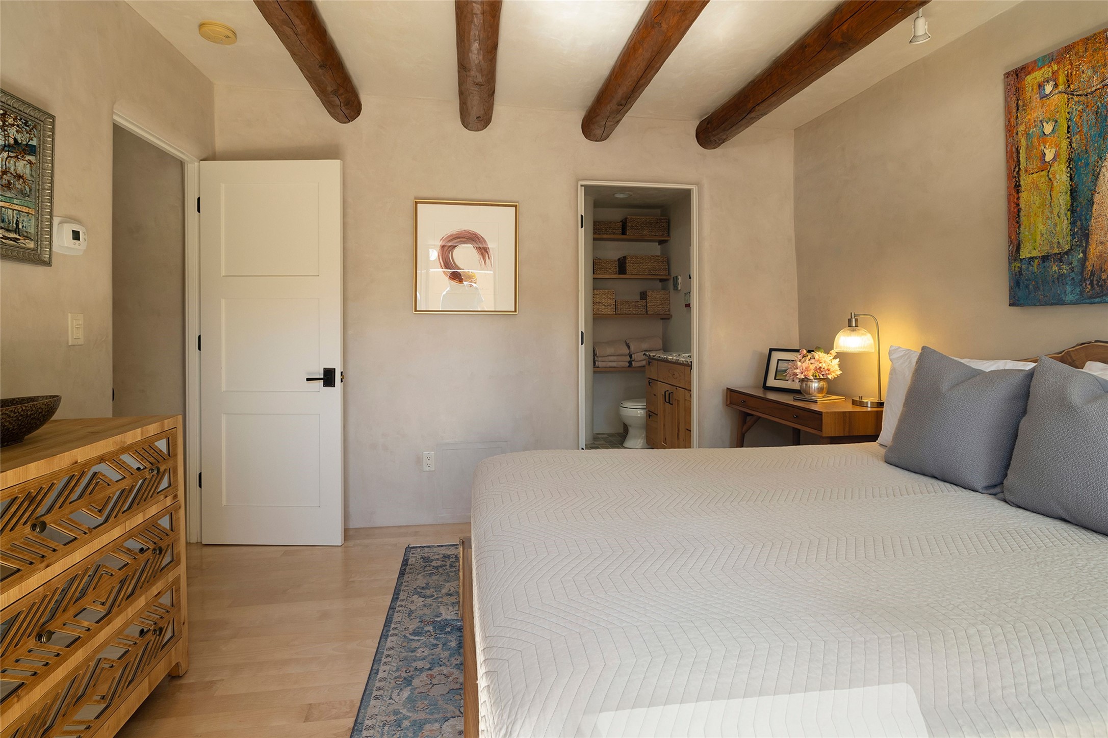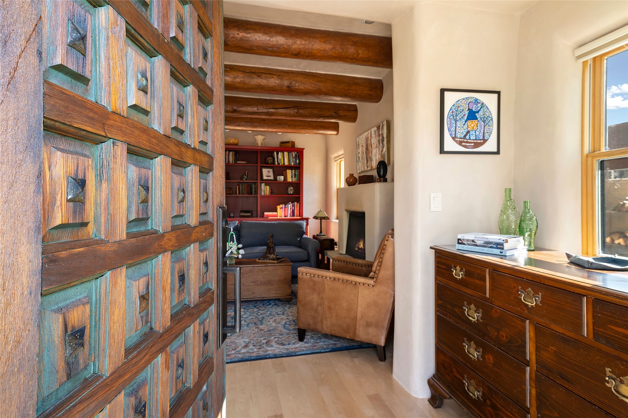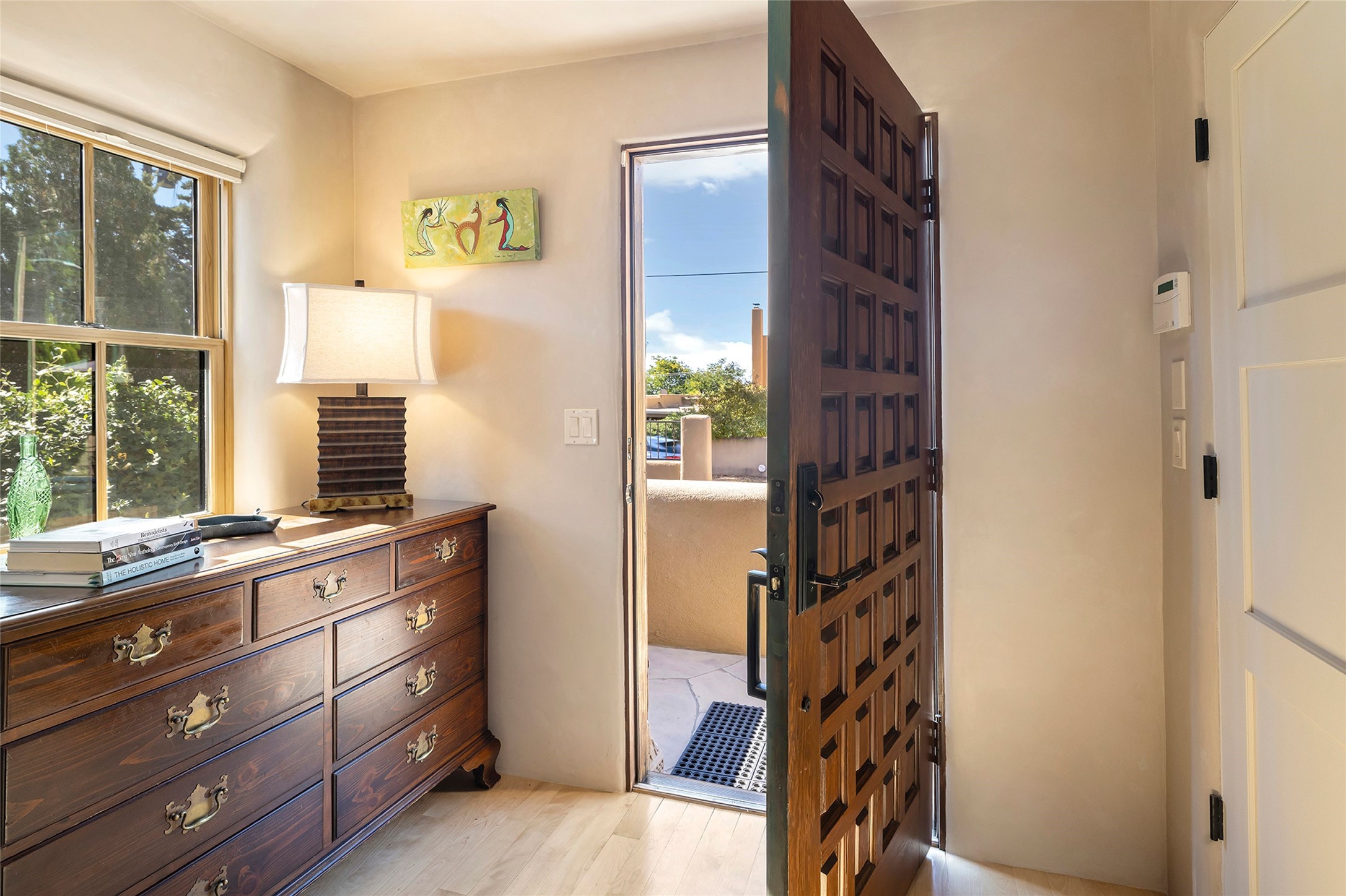 Just steps from the historic Santa Fe Plaza, this exquisite and beautifully updated Juniper Terrace condominium captures the essence of timeless Santa Fe architecture enhanced by sophisticated modern updates. Set within one of the city's most desirable locations, this rare single-level, two-bedroom, two-bath residence offers a seamless blend of style, comfort, and authenticity. The home's inviting living room, anchored by rich vigas and a grand central fireplace, creates a warm and elegant gathering space. The modern chef's kitchen, designed for both beauty and functionality, features granite countertops, high-end appliances, and a breakfast bar that opens gracefully to the dining area and expansive outdoor entertaining spaces. The private owner's suite is a serene retreat, featuring a spa-inspired bath with a jetted tub/shower, and direct access to a secluded patio. The guest suite, complete with its own ensuite bath and private patio access, provides versatility for hosting guests or creating a personal workspace. Multiple enclosed courtyards and lushly landscaped patios invite year-round outdoor living, enhanced by vibrant plantings and a tranquil water feature. Additional highlights include hardwood flooring, creamy plaster walls, rich vigas throughout, and convenient off-street parking. Offering both intimacy and sophistication, this remarkable property exemplifies the ultimate Santa Fe experience--just a short stroll from world-class dining, galleries, and the cultural heart of the city, this incredible home is not to be missed!