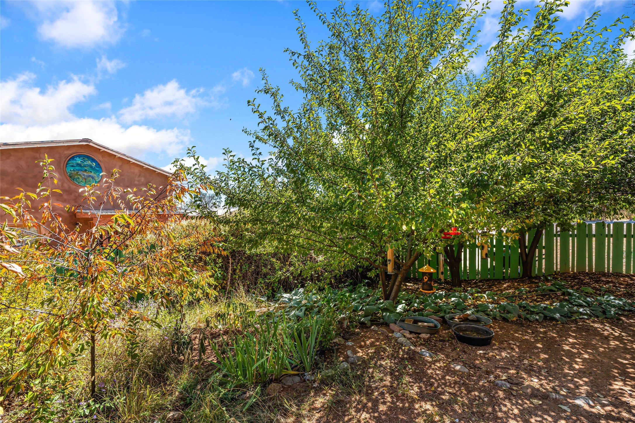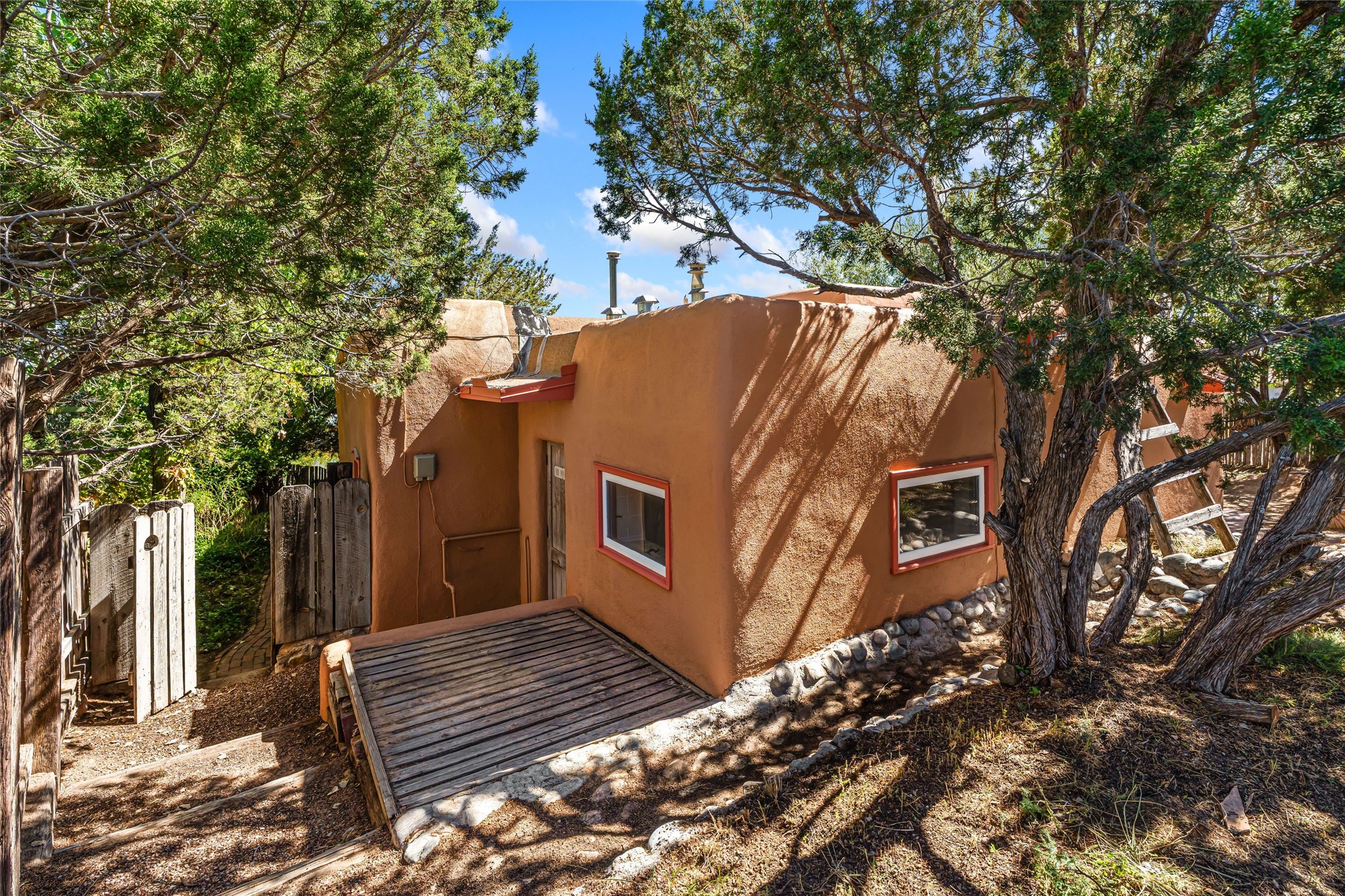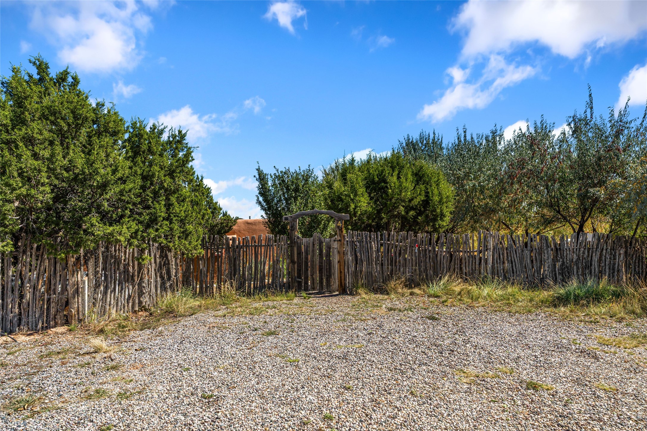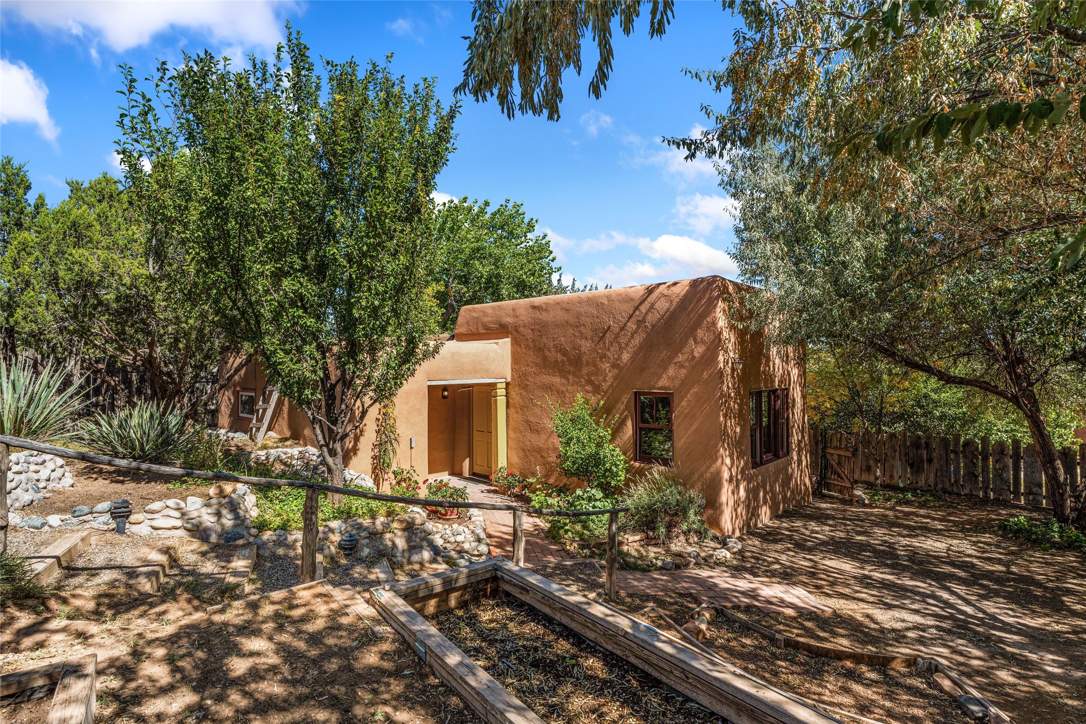 Set on nearly 6 acres of natural beauty, this hand-crafted adobe home by Jerry West offers a lifestyle rooted in nature and creativity. Part of a residential community, the grounds feature an orchard, shade trees, and meandering trails that invite exploration, quiet contemplation, or nature gazing. Two private yards extend your living space outdoors, ideal for gardens or simply enjoying the peace of the desert landscape. Inside, the 1-bedroom, 1-bath home blends artistry and function. The open plan living area connects to a kitchen and dining space with a handcrafted table, bench, and a restored antique tin-and-glass chandelier by Maurice Dixon. The bedroom offers warmth and charm with an adobe fireplace, handcrafted trastero cupboard, blanket chest, and two closets. Practical amenities include two attached storage rooms and private parking for two vehicles. A newer well and well house serve the community, ensuring both sustainability and convenience. Located just off NM State Hwy 14 at the Lone Butte General Store, the property offers easy access to downtown Santa Fe while retaining a retreat-like setting. This is a home where creativity abounds, and nature is just outside your door.