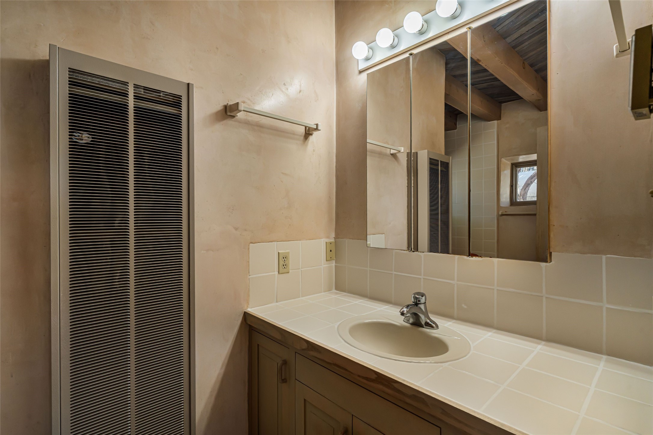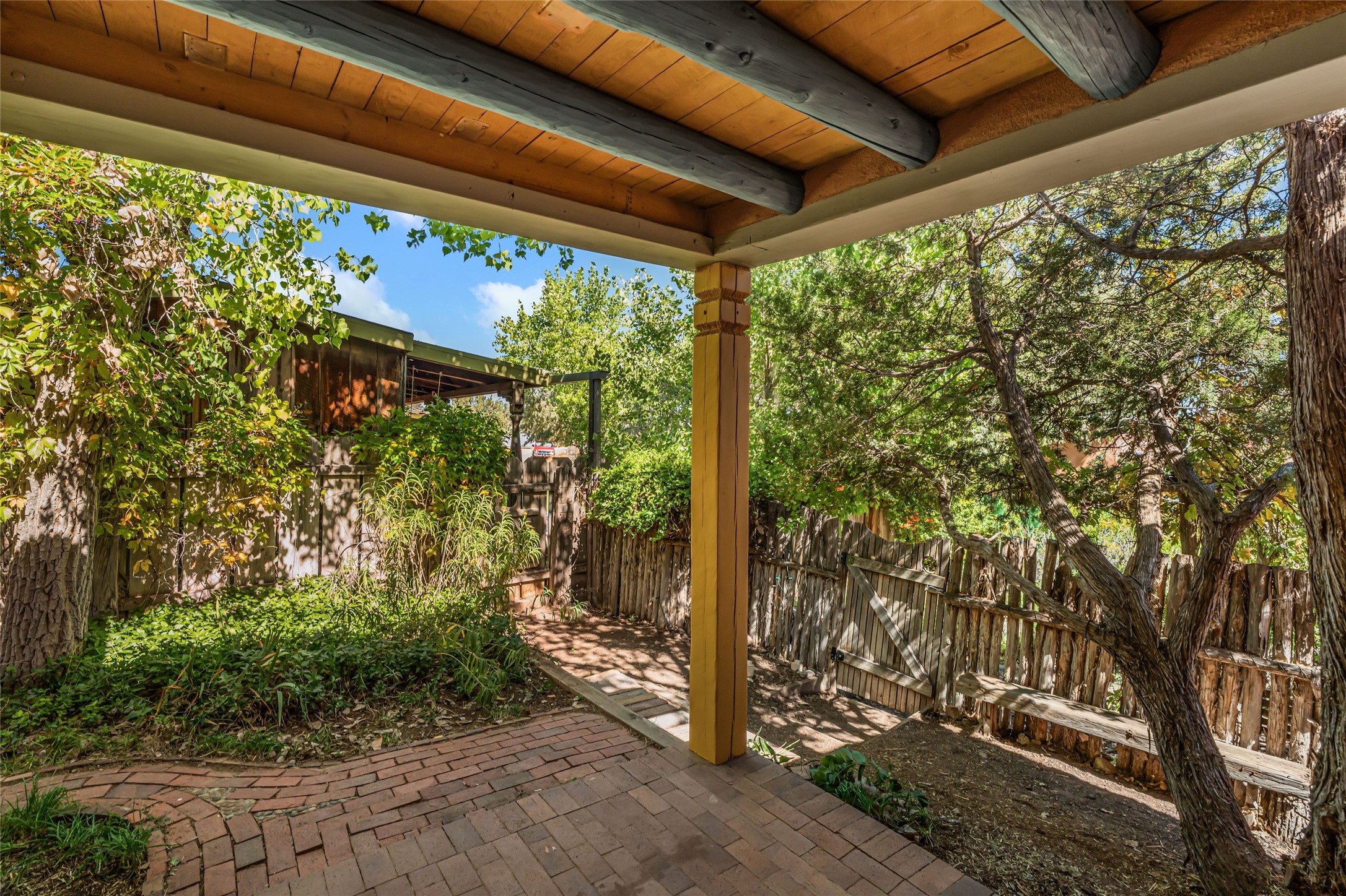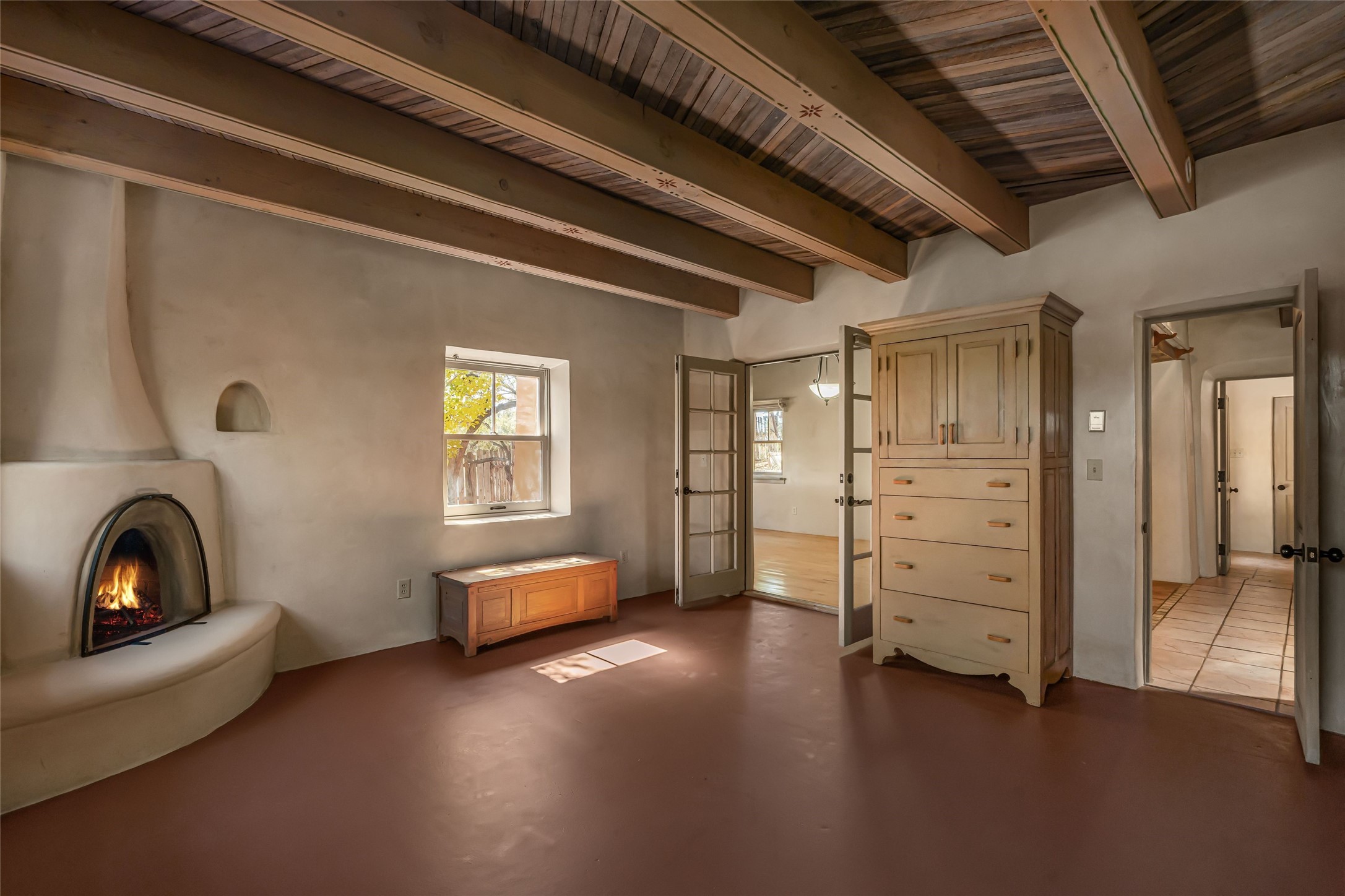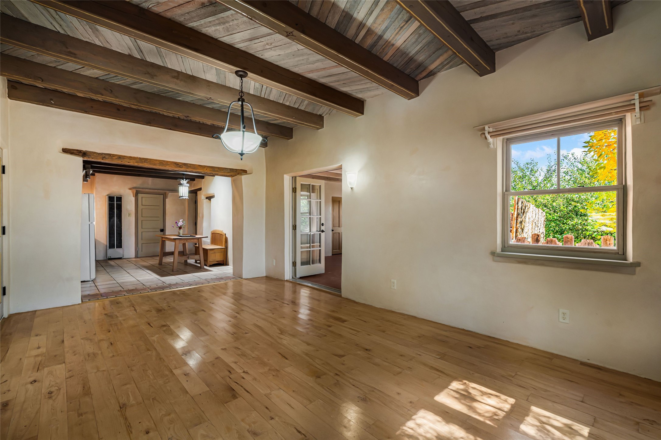 Set on nearly 6 acres of natural beauty, this hand-crafted adobe home by Jerry West offers a lifestyle rooted in nature and creativity. Part of a residential community, the grounds feature an orchard, shade trees, and meandering trails that invite exploration, quiet contemplation, or nature gazing. Two private yards extend your living space outdoors, ideal for gardens or simply enjoying the peace of the desert landscape. Inside, the 1-bedroom, 1-bath home blends artistry and function. The open plan living area connects to a kitchen and dining space with a handcrafted table, bench, and a restored antique tin-and-glass chandelier by Maurice Dixon. The bedroom offers warmth and charm with an adobe fireplace, handcrafted trastero cupboard, blanket chest, and two closets. Practical amenities include two attached storage rooms and private parking for two vehicles. A newer well and well house serve the community, ensuring both sustainability and convenience. Located just off NM State Hwy 14 at the Lone Butte General Store, the property offers easy access to downtown Santa Fe while retaining a retreat-like setting. This is a home where creativity abounds, and nature is just outside your door.
