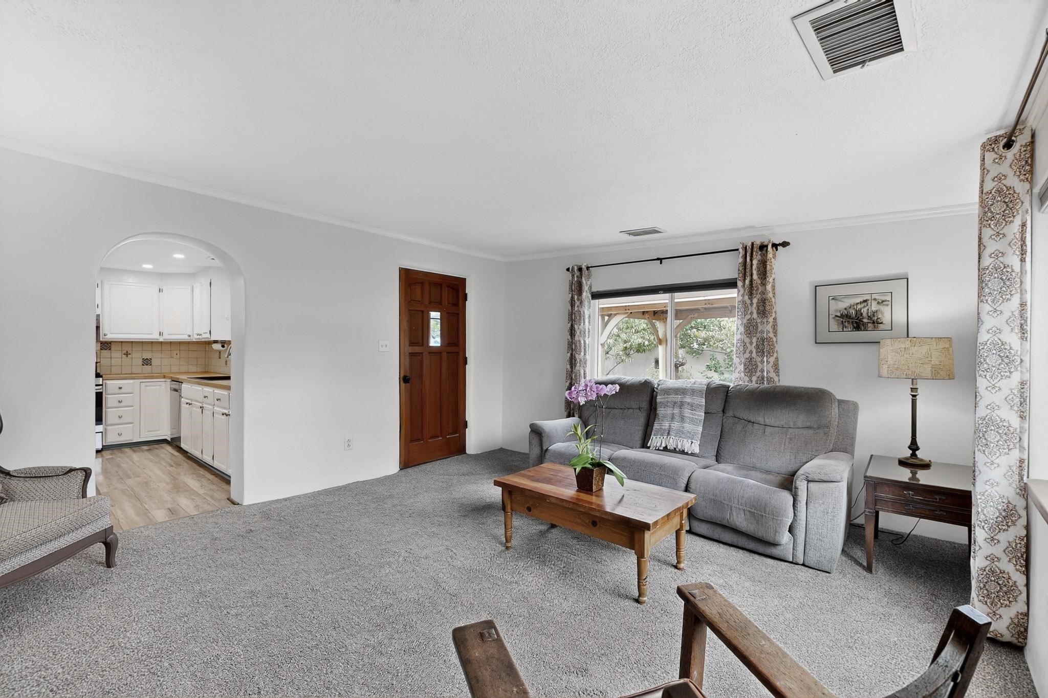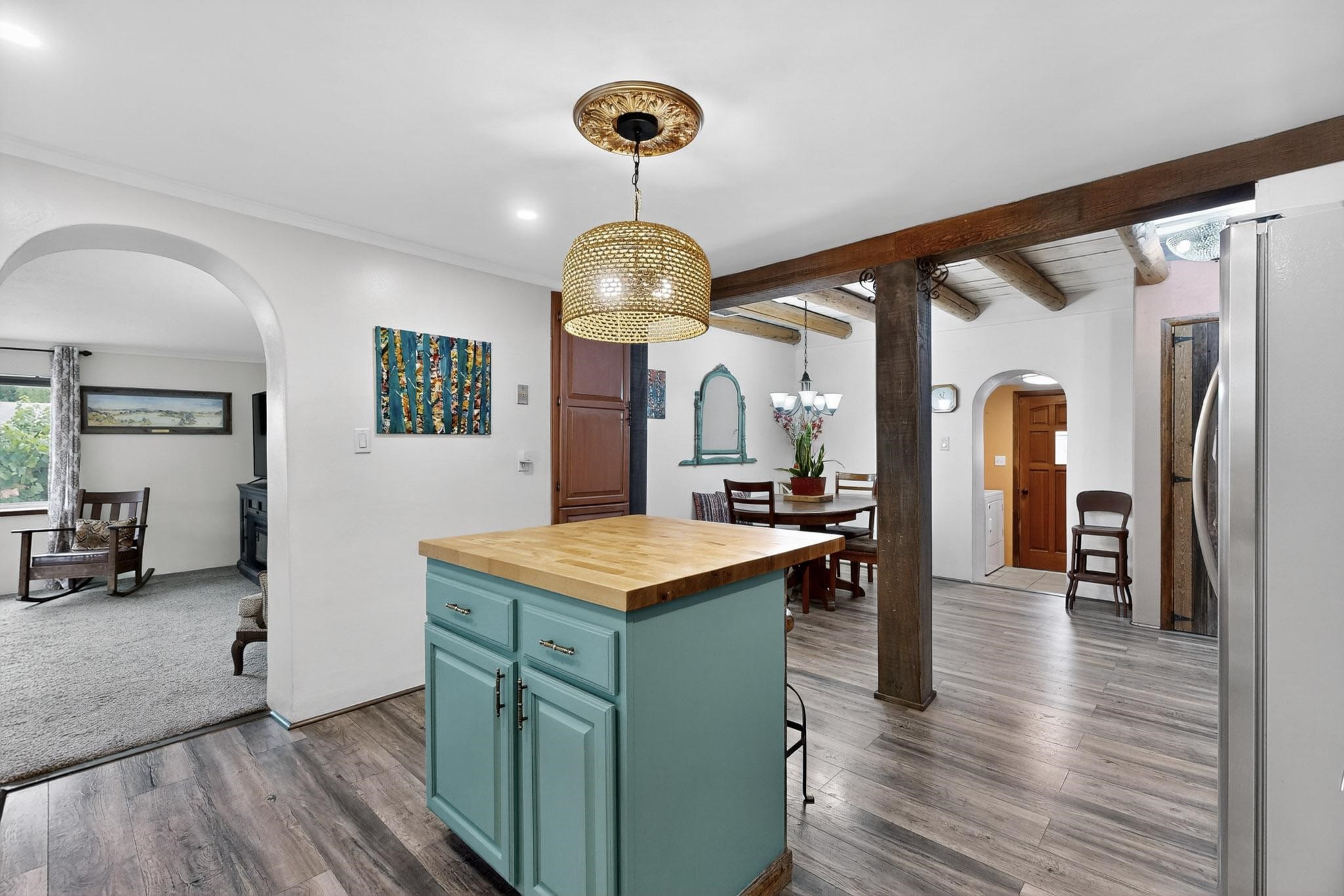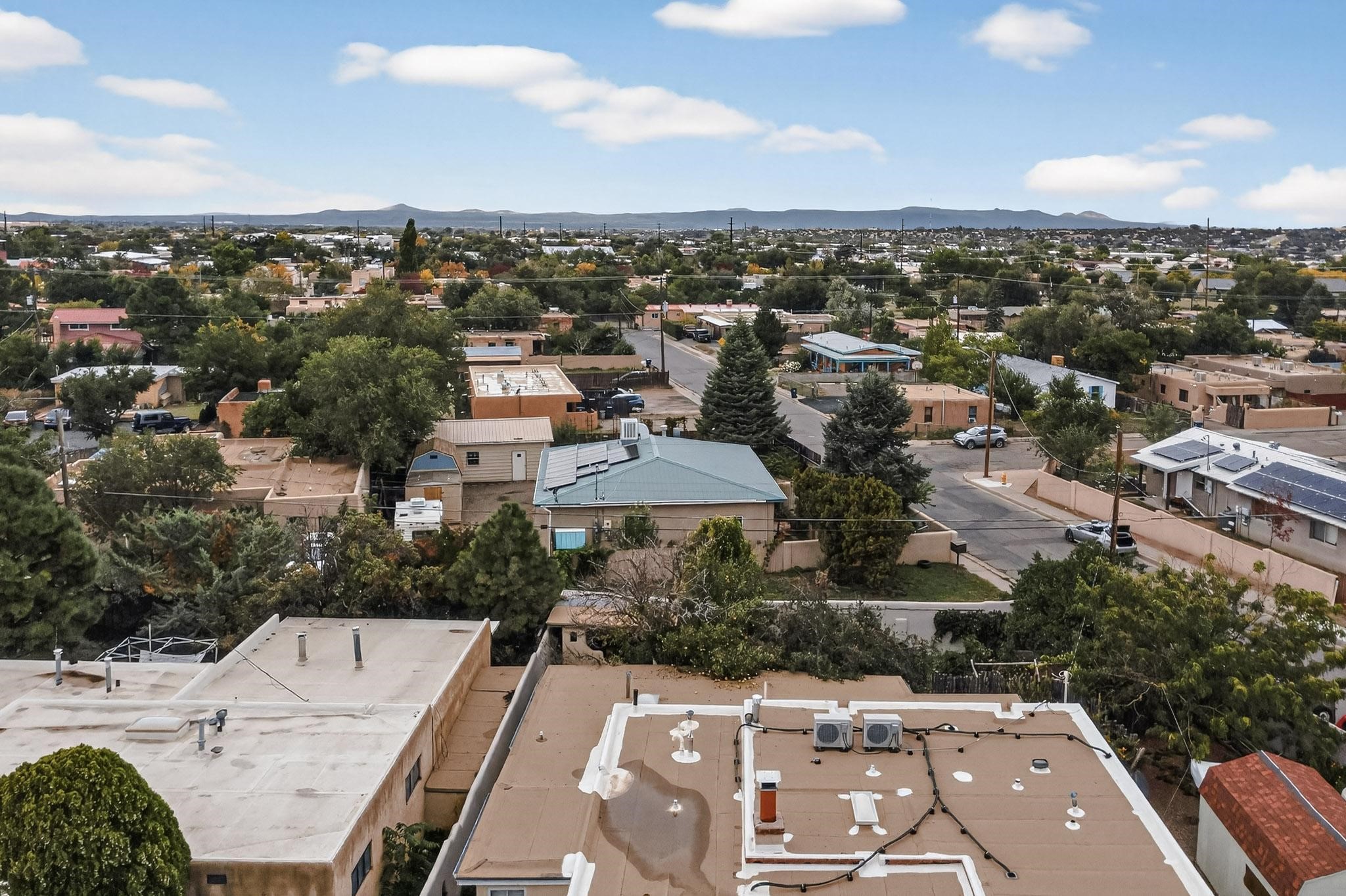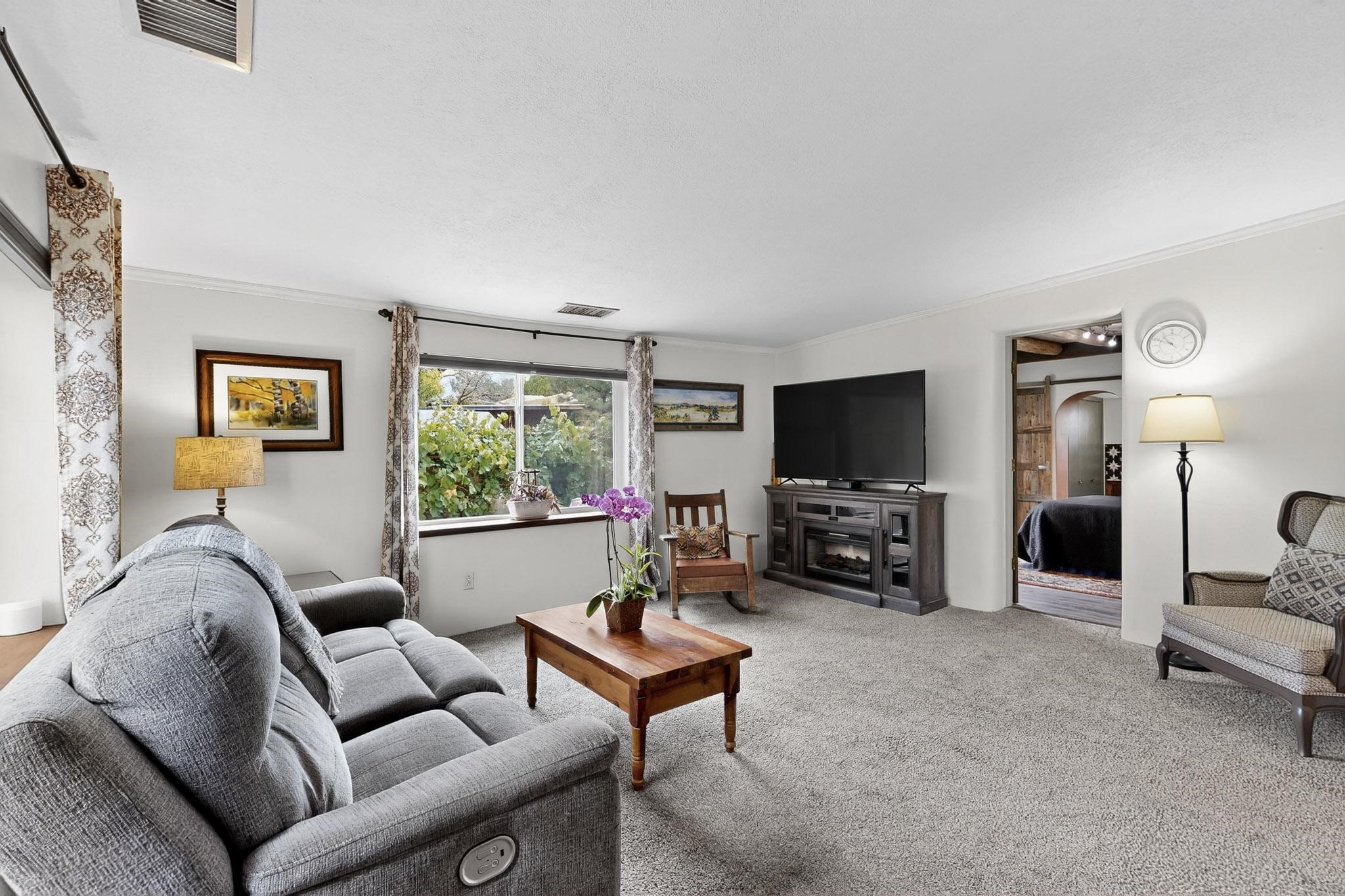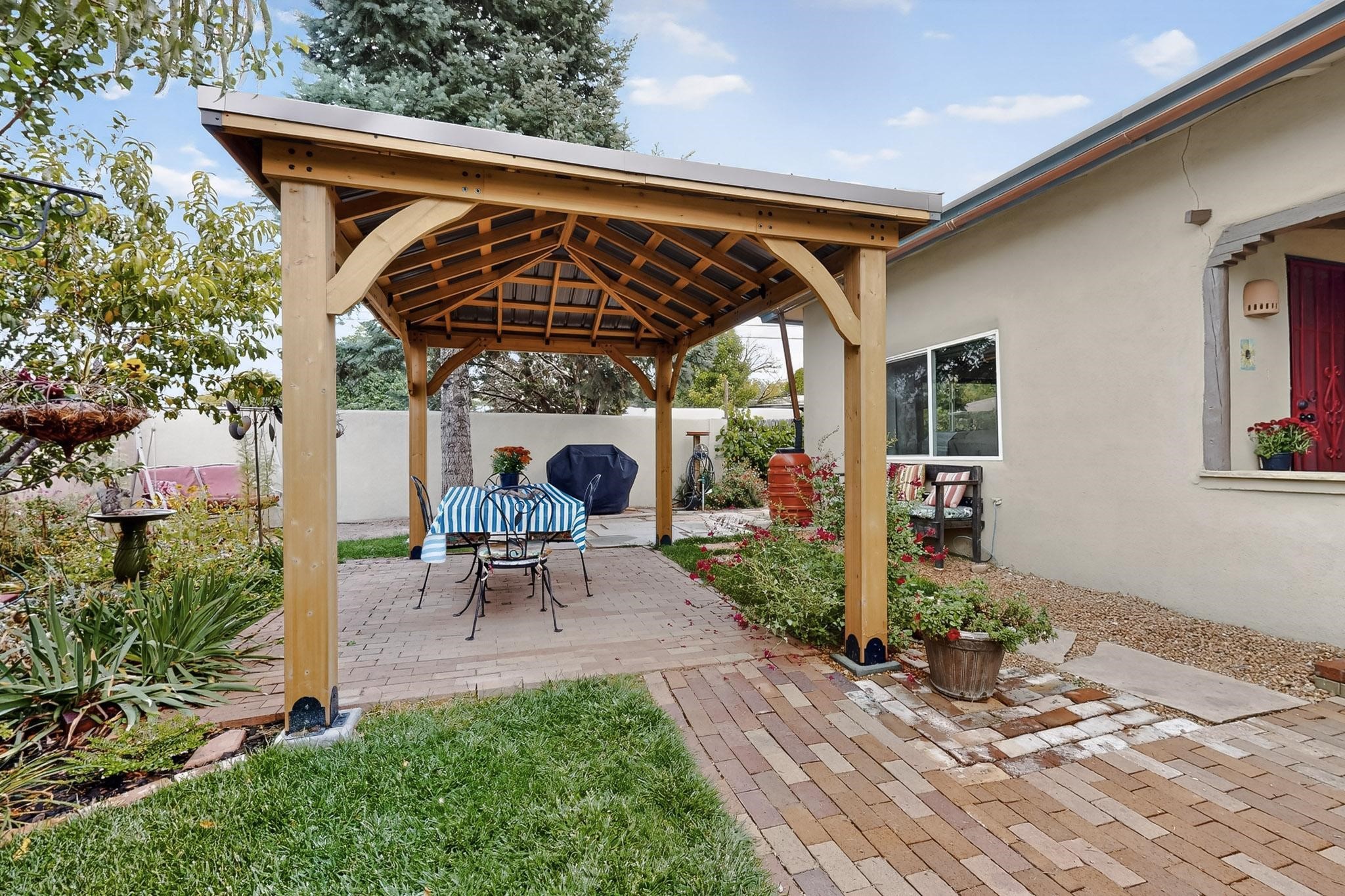 Enjoy country living in this well cared for .21 acre property in the heart of Santa Fe! The home's entry courtyard, with its new ramada, sets the tone for relaxed outdoor living. Inside, the adobe portion of the home, built in 1947, exudeswarmth and includes the spacious updated Kitchen, Living Room, Primary Bedroom; the newer stick-built wing features 2 substantial guest bedrooms, the primary bathroom and a remodeled bathroom. Interior improvements include newwindows, new paint, newer water heater, furnace and appliances. Owners have added a fabulous detached 18' X 30' garage, and will convey several sheds, a camping trailer, a green house and a hot tub, if wanted. Also included is fully paid for solar panels that were added in 2024. Lush and charming gardens with fruits, veggies and herbs plus mature trees on irrigation further enhance the property's appeal. A large basement is accessible from the side of the home for additional storage. Come see this sweet home at your first opportunity!