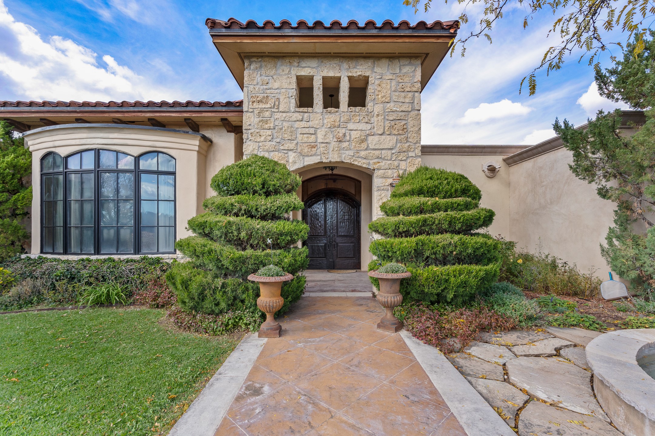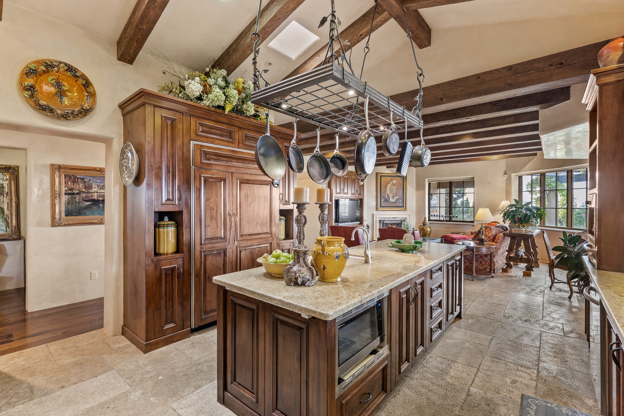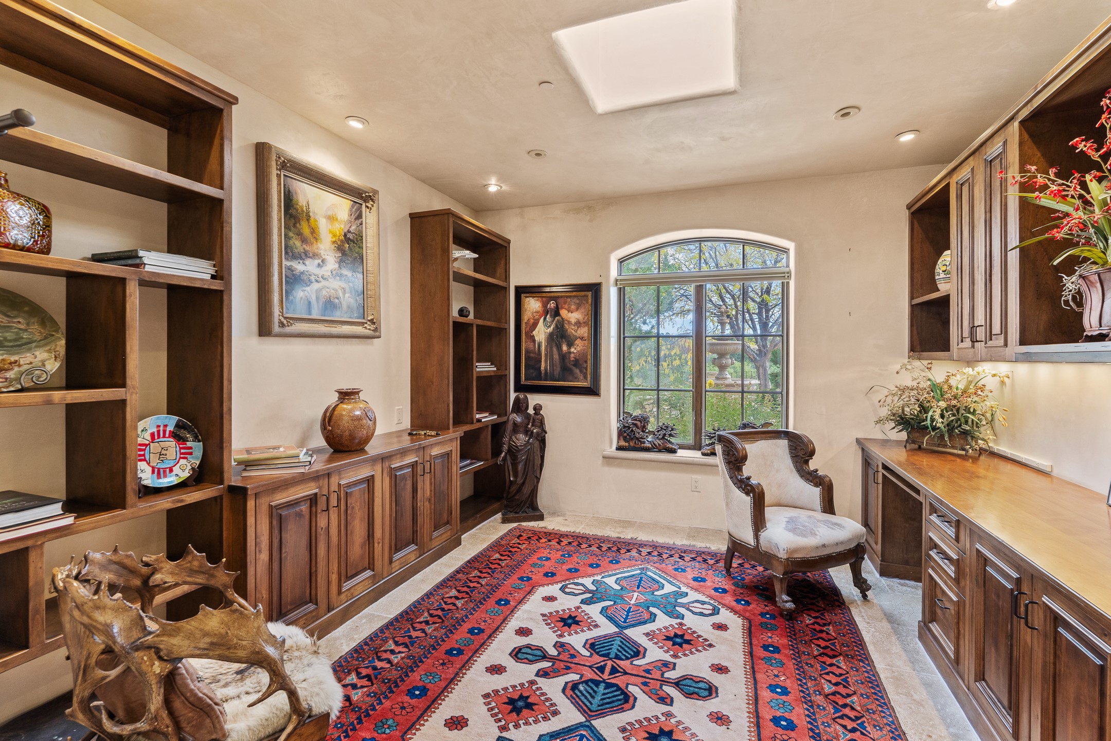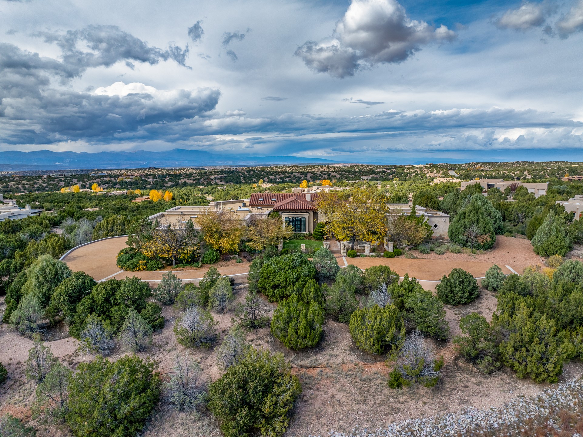 For those drawn to the romance of Italy, this extraordinary residence captures the essence of a Tuscan villa translated beautifully into the high desert landscape of Santa Fe. Nestled on 2.5 acres in the coveted Sundance Estates, this home with 4 bedrooms plus an office, 4.5 baths, and a 3-car garage offers 5,013 square feet of refined living, crafted with exquisite detail and timeless materials. Beyond stately wrought-iron gates, cupid sculptures and a stamped and colored concrete drive lead to a grand arrival with limestone walls, a graceful fountain, and hand-hewn double doors. Inside, rich walnut and travertine floors create a harmonious blend of warmth and sophistication. Diamond plaster walls, coved plaster ceilings, and rustic wood trestle beams evoke the artistry of old-world Europe, while expansive windows and French doors frame breathtaking mountain and sunset vistas. The chef's kitchen is a showpiece--adorned with alder cabinetry, granite countertops, a Wolf range, a Subzero refrigerator, a built-in Miele coffee center, and a wine cooler. Here you'll be romanced by a generous island, casual dining area, and adjoining family room with a fireplace, creating an inviting central gathering space. The kitchen and living room open to a deep covered portal designed for alfresco entertaining, featuring an outdoor kitchen, limestone fireplace, and rose garden.The east wing hosts the elegant primary suite with its own fireplace, private portal, and in-ground spa with a waterfall. The spa-like bath offers dual vanities, a soaking tub, and a large walk-in shower, while the custom closet provides both beauty and functionality. On the west side of the home, you will find 2 guest suites providing separation and privacy. There is also a handsome study with a built-in desk and shelves, and a view to the front garden and fountain. Additionally, there is a private casita with its own entrance, kitchenette, and ensuite bath offers comfort and independence for guests.