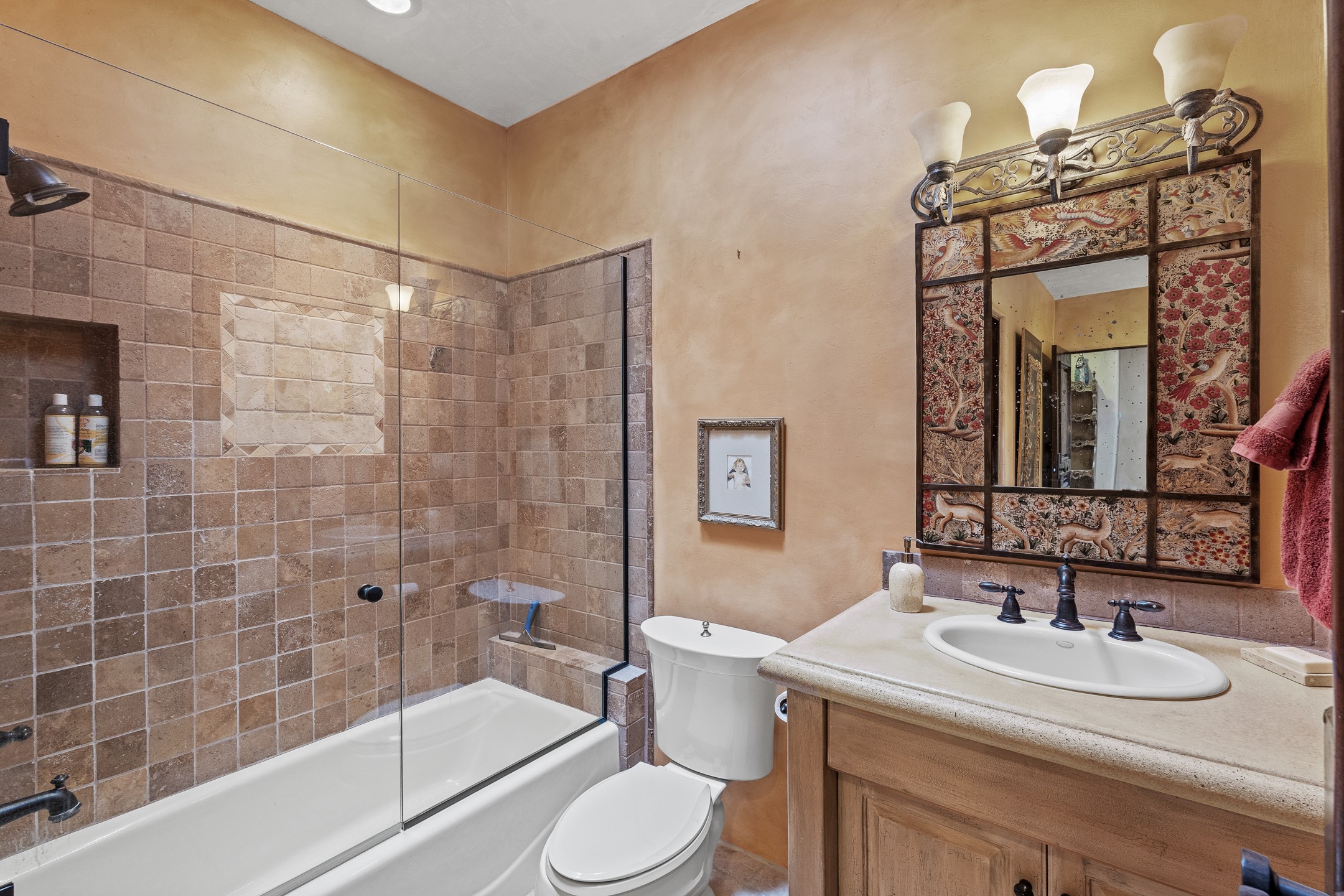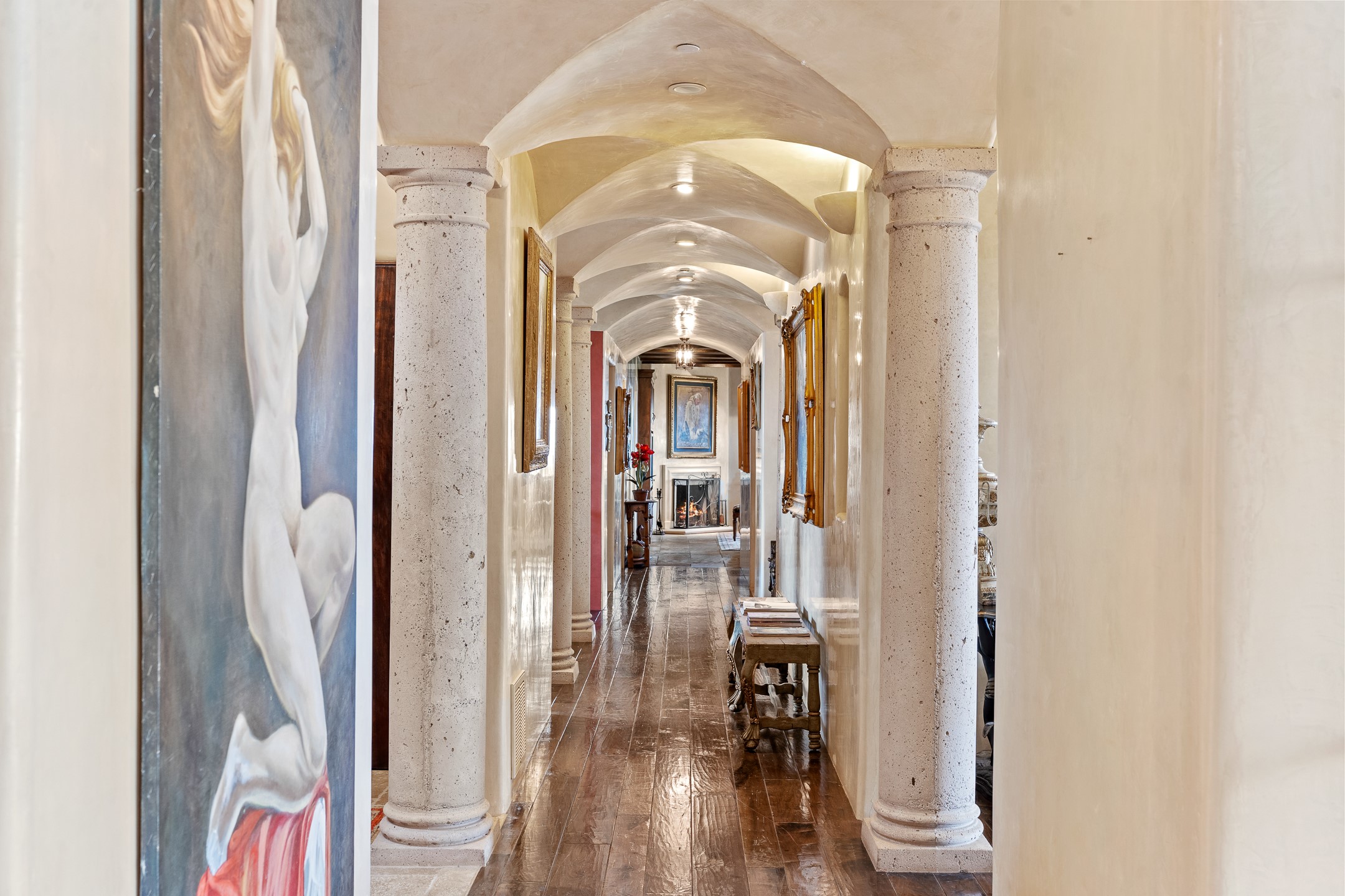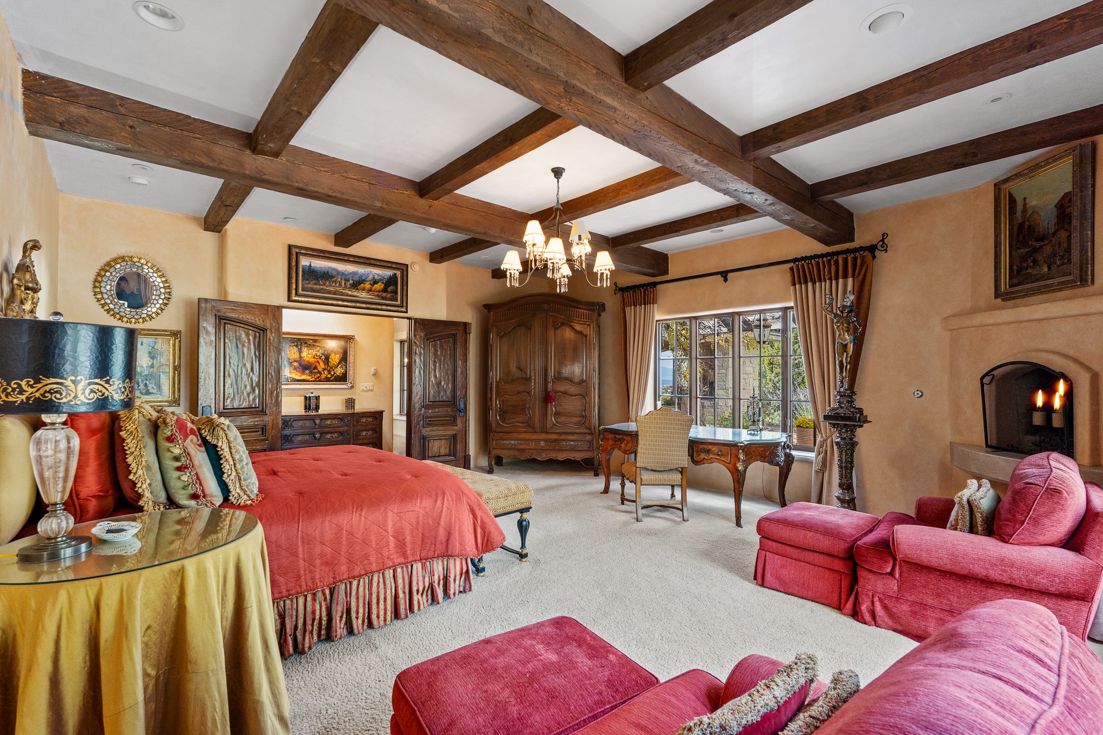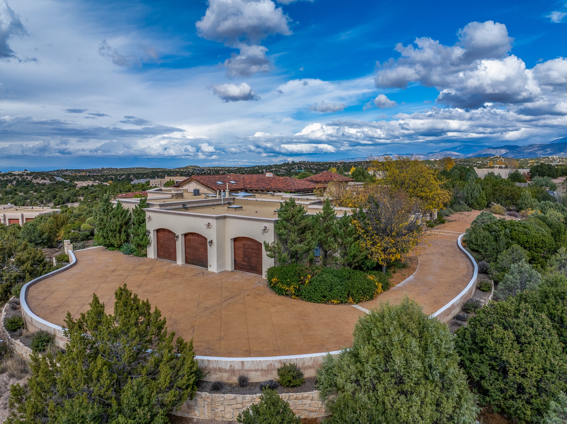 For those drawn to the romance of Italy, this extraordinary residence captures the essence of a Tuscan villa translated beautifully into the high desert landscape of Santa Fe. Nestled on 2.5 acres in the coveted Sundance Estates, this home with 4 bedrooms plus an office, 4.5 baths, and a 3-car garage offers 5,013 square feet of refined living, crafted with exquisite detail and timeless materials. Beyond stately wrought-iron gates, cupid sculptures and a stamped and colored concrete drive lead to a grand arrival with limestone walls, a graceful fountain, and hand-hewn double doors. Inside, rich walnut and travertine floors create a harmonious blend of warmth and sophistication. Diamond plaster walls, coved plaster ceilings, and rustic wood trestle beams evoke the artistry of old-world Europe, while expansive windows and French doors frame breathtaking mountain and sunset vistas. The chef's kitchen is a showpiece--adorned with alder cabinetry, granite countertops, a Wolf range, a Subzero refrigerator, a built-in Miele coffee center, and a wine cooler. Here you'll be romanced by a generous island, casual dining area, and adjoining family room with a fireplace, creating an inviting central gathering space. The kitchen and living room open to a deep covered portal designed for alfresco entertaining, featuring an outdoor kitchen, limestone fireplace, and rose garden.The east wing hosts the elegant primary suite with its own fireplace, private portal, and in-ground spa with a waterfall. The spa-like bath offers dual vanities, a soaking tub, and a large walk-in shower, while the custom closet provides both beauty and functionality. On the west side of the home, you will find 2 guest suites providing separation and privacy. There is also a handsome study with a built-in desk and shelves, and a view to the front garden and fountain. Additionally, there is a private casita with its own entrance, kitchenette, and ensuite bath offers comfort and independence for guests.