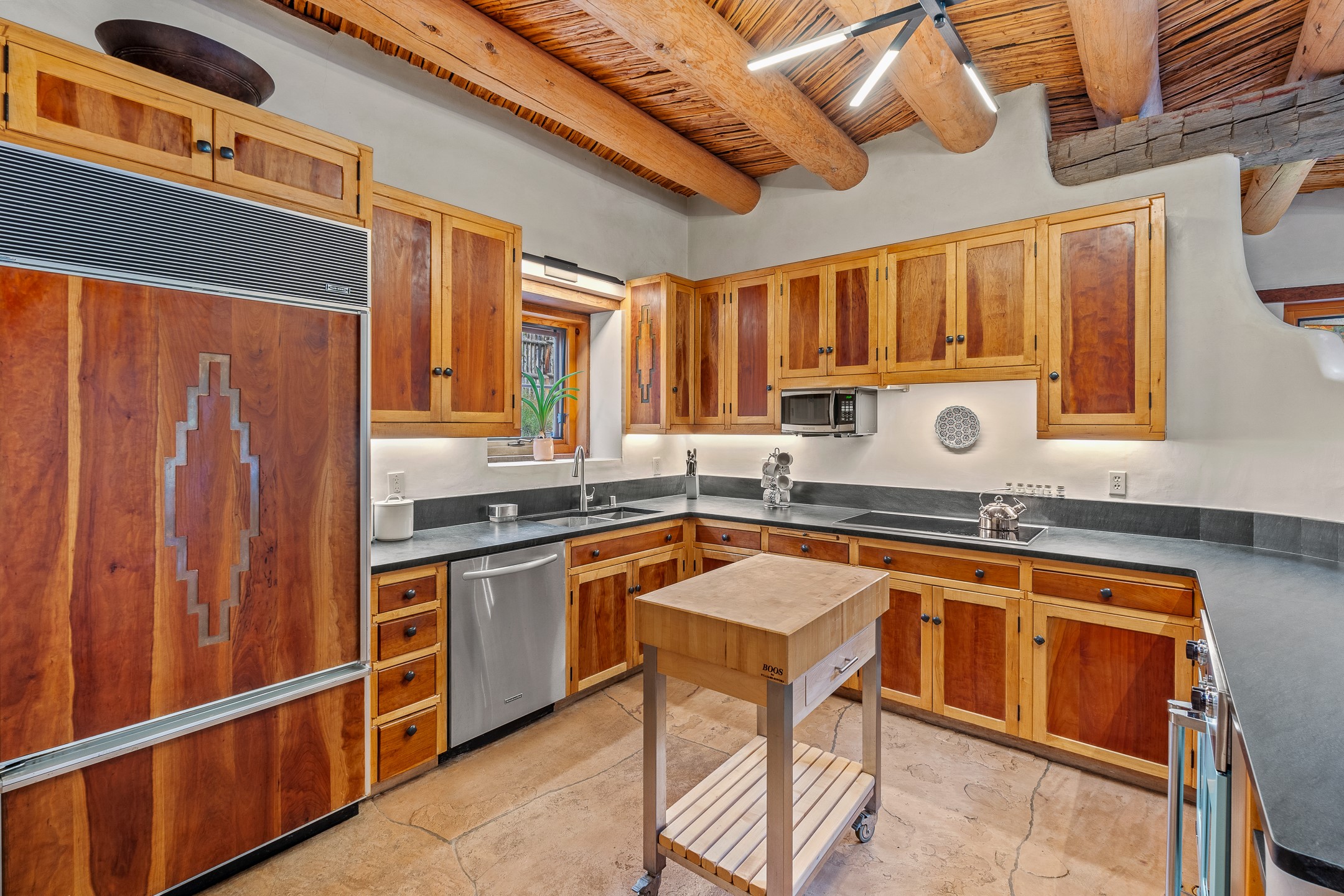 Location, location! A quick 8 minutes to Santa Fe Plaza and 5 minutes from the beloved Tesuque Village Market, this extraordinary 3,366 sq ft adobe sanctuary is nestled on .77 lush, tree-covered acre and adjacent to the seasonal Tesuque Creek. This 3 bdrm/3.5 bath residence blends soulful Santa Fe architecture built by notable local craftsmen, with regenerative land stewardship to support biodiversity. Flagstone floors, vigas, split cedar ceilings, and walls that transition organically from adobe to stone create a uniquely grounded and artistic living experience. The renovated kitchen features natural stone countertops and open dining area perfect for entertaining. Dining area opens to a covered portal with a natural gas firepit ideal for outdoor gatherings beneath the stars, rain or shine. There are two living areas: The original living room was designed for Japanese tea ceremony with glass wall that opens to views of the garden and creek side forest. The North living room features a dramatic fireplace, high ceilings, and connects to a serene ground-level primary suite with cedar lined closet, as well as a fenced garden area abundant with fruit trees and pollinator-friendly plants. The handcrafted staircase is built with no nails and leads to the upper level, where you'll find a guest suite and a second primary suite with a private deck and an infrared sauna - an immersive retreat in the treetops of Tesuque. Both have en suite bathrooms.Additional amenities include an automatic gated entry, labyrinth, private well with pristine water, EV charger, and a handcrafted workshop. There is so much more to say about this poetic property, but if you're seeking a Santa Fe home that honors nature, creativity, and intentional living, this eco-sanctuary in Tesuque is for you. Hiking access via arroyo from back yard and up the road .75 miles to the Lower Windsor Trailhead offer instant connection to the Sangre de Cristomountains and the coveted ecology of the Tesuque Valley.